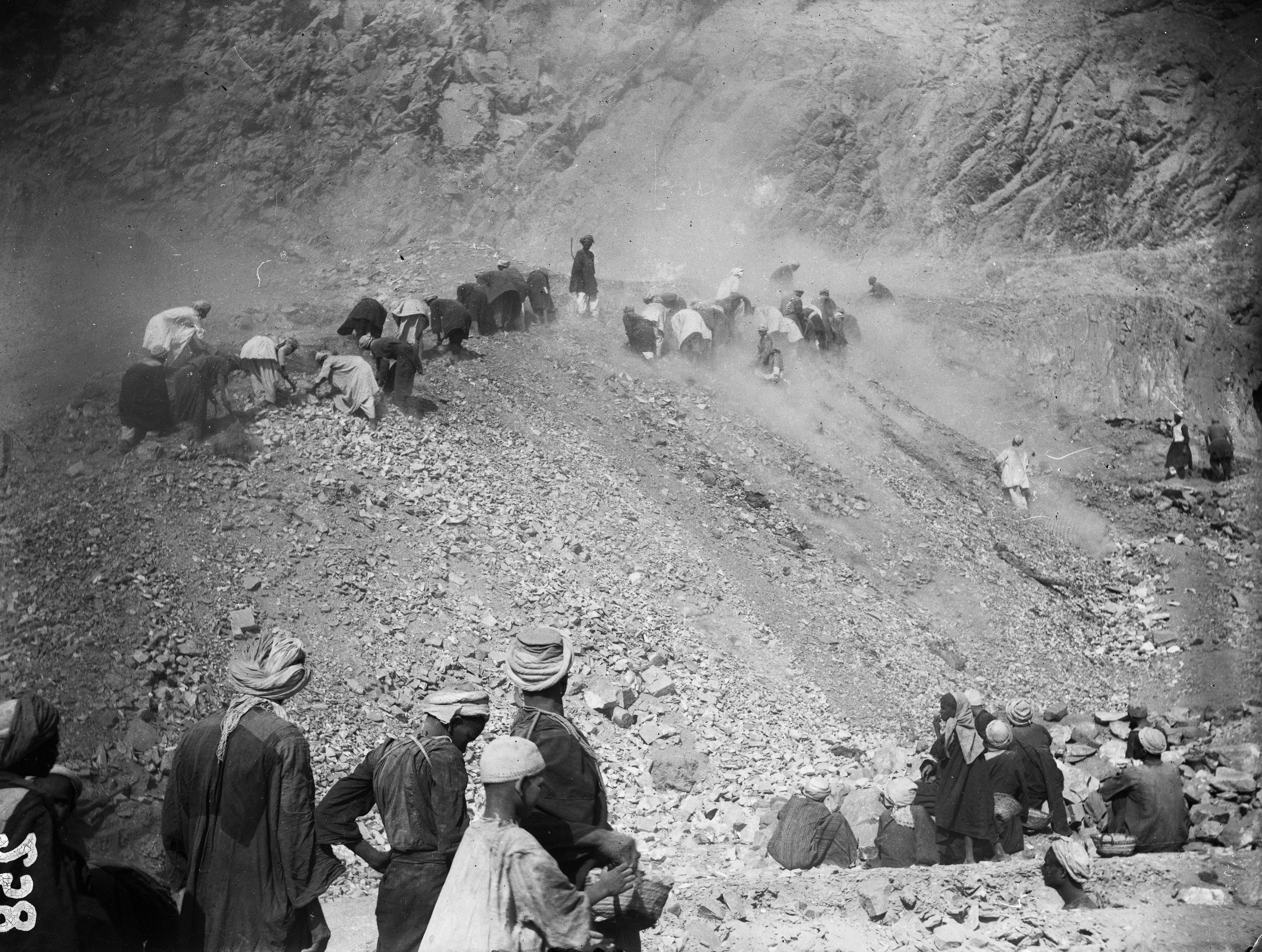Excavations to the right of the temple, up the mountain slope. The employment of a large number of workers was necessary to systematically assess the soil until the ancient stratigraphic layer was reached. In the centre of the picture there is a pole that indicates the next area to be excavated, with special precautions. Visible on the left of the image is Benvenuto Savina. Schiaparelli excavations.