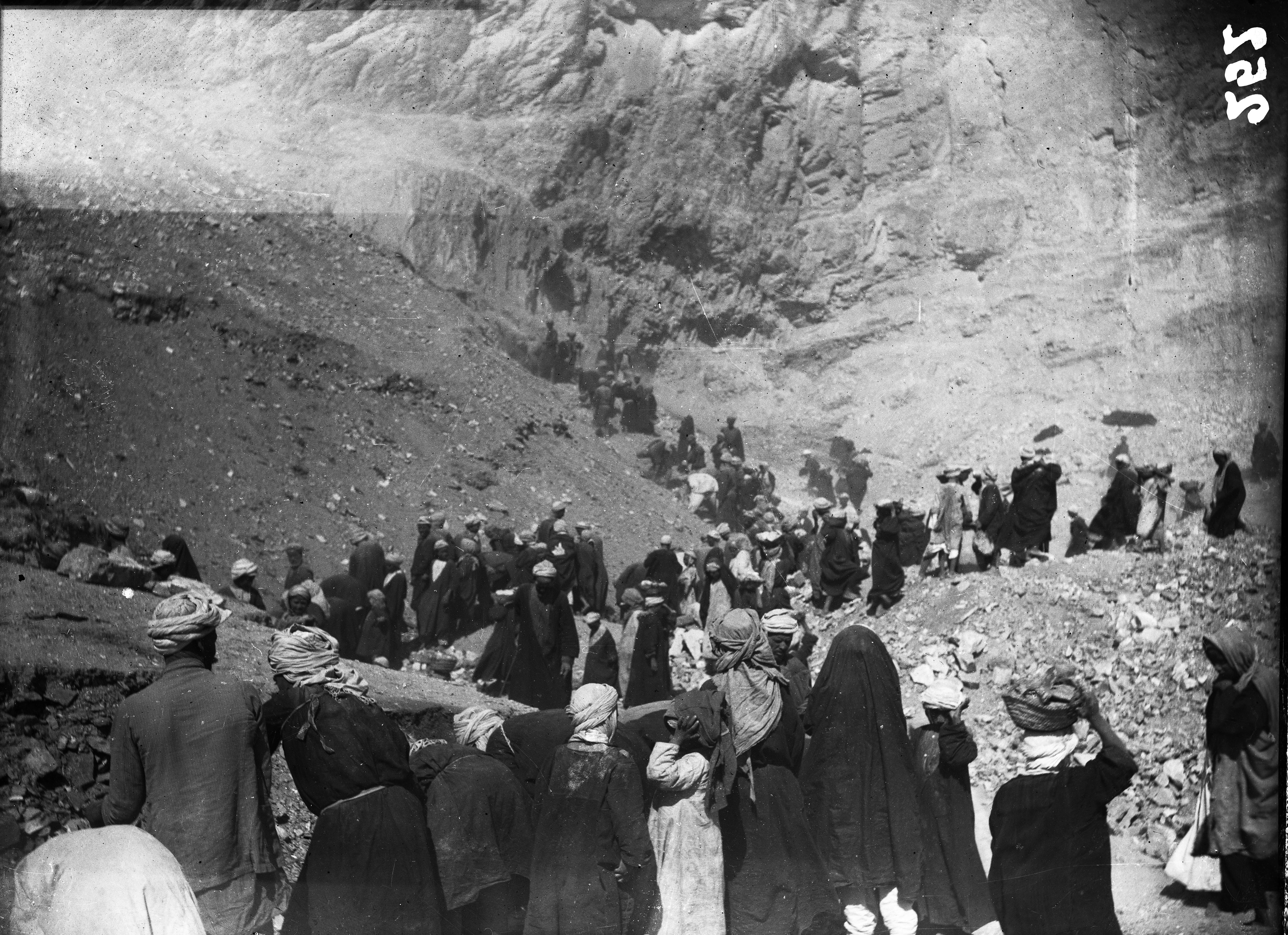 Excavations along the mountain, behind the temple of the goddess Hathor. The workmen have stopped excavating in order to photograph the site without dust-clouds. Above, the figure of the rais (chief of the workmen). Schiaparelli excavations.