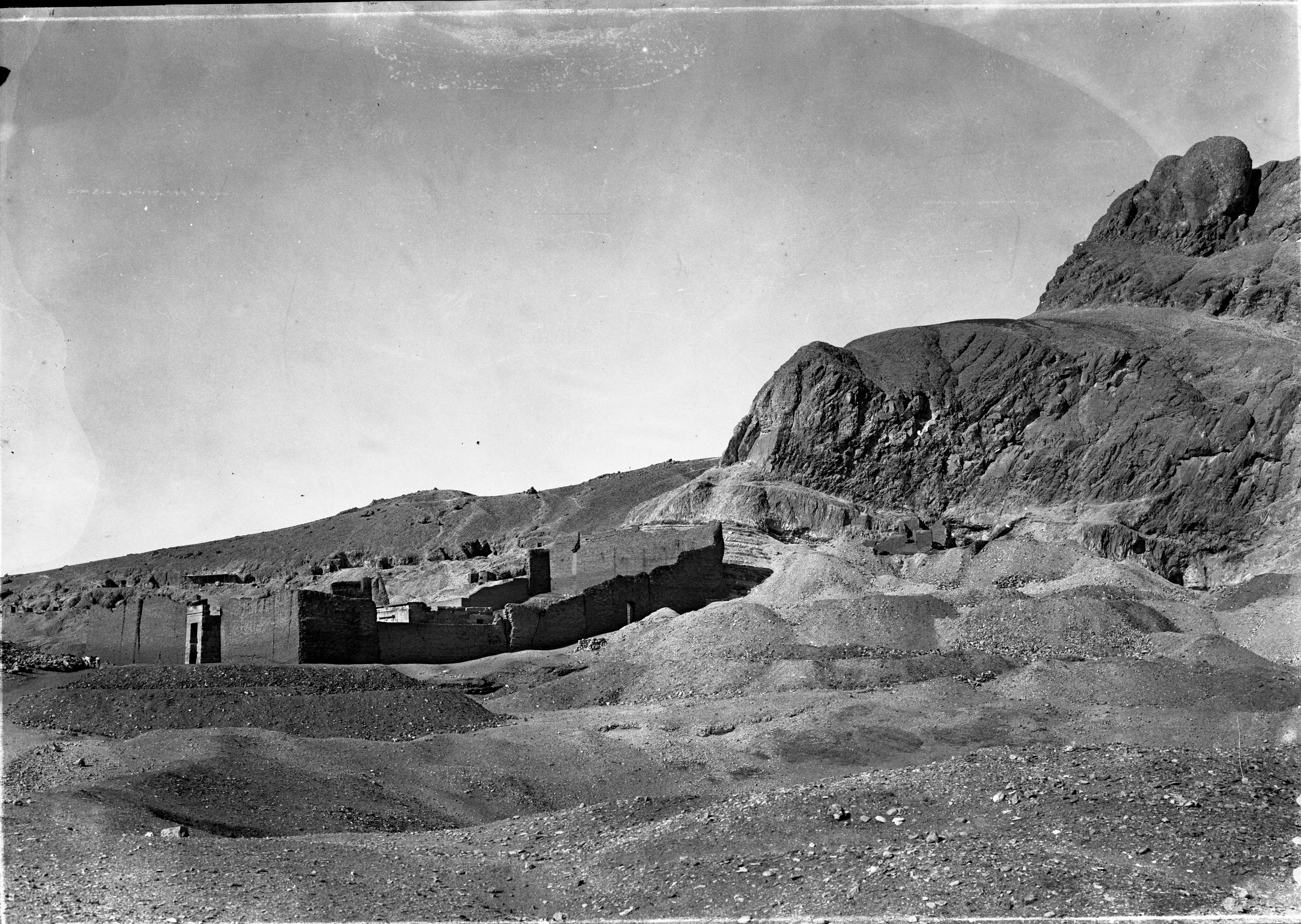 General view of the northern area of the necropolis. Clearly visible is the massive wall that borders the area of the temple. Above, the paths leading to the hill are visible, along with its small settlement. From here it is possible to descend to the Valley of the Kings or the Valley of the Queens, or climb to the top of the mountain. Schiaparelli excavations.