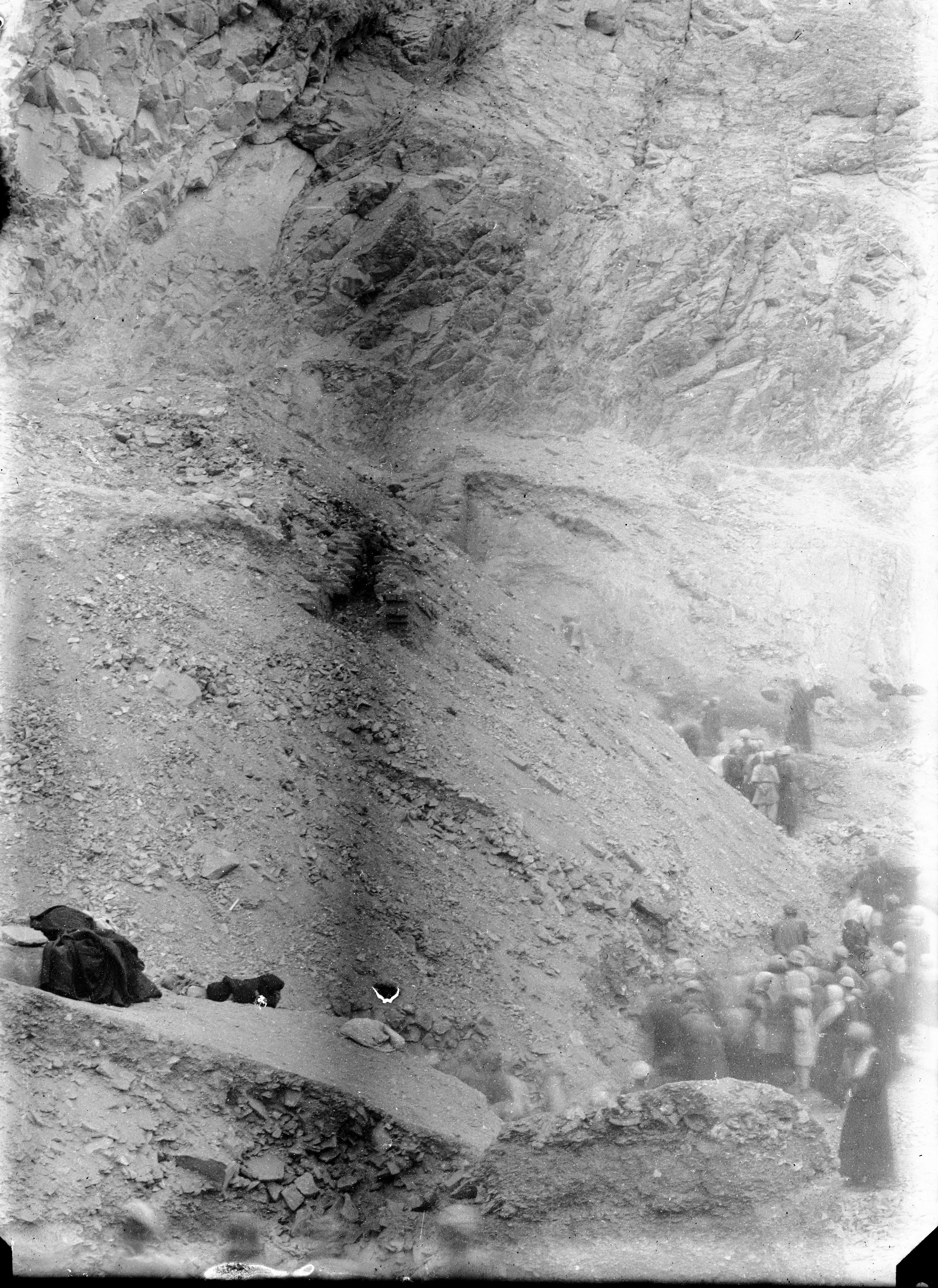 A mountain slope, where there are two unidentifiable figures, but presumably part of the Italian Archaeological Mission. The person dressed in western clothing could be one of the noblemen accompanying Schiaparelli on the 1906 mission. Schiaparelli excavations.