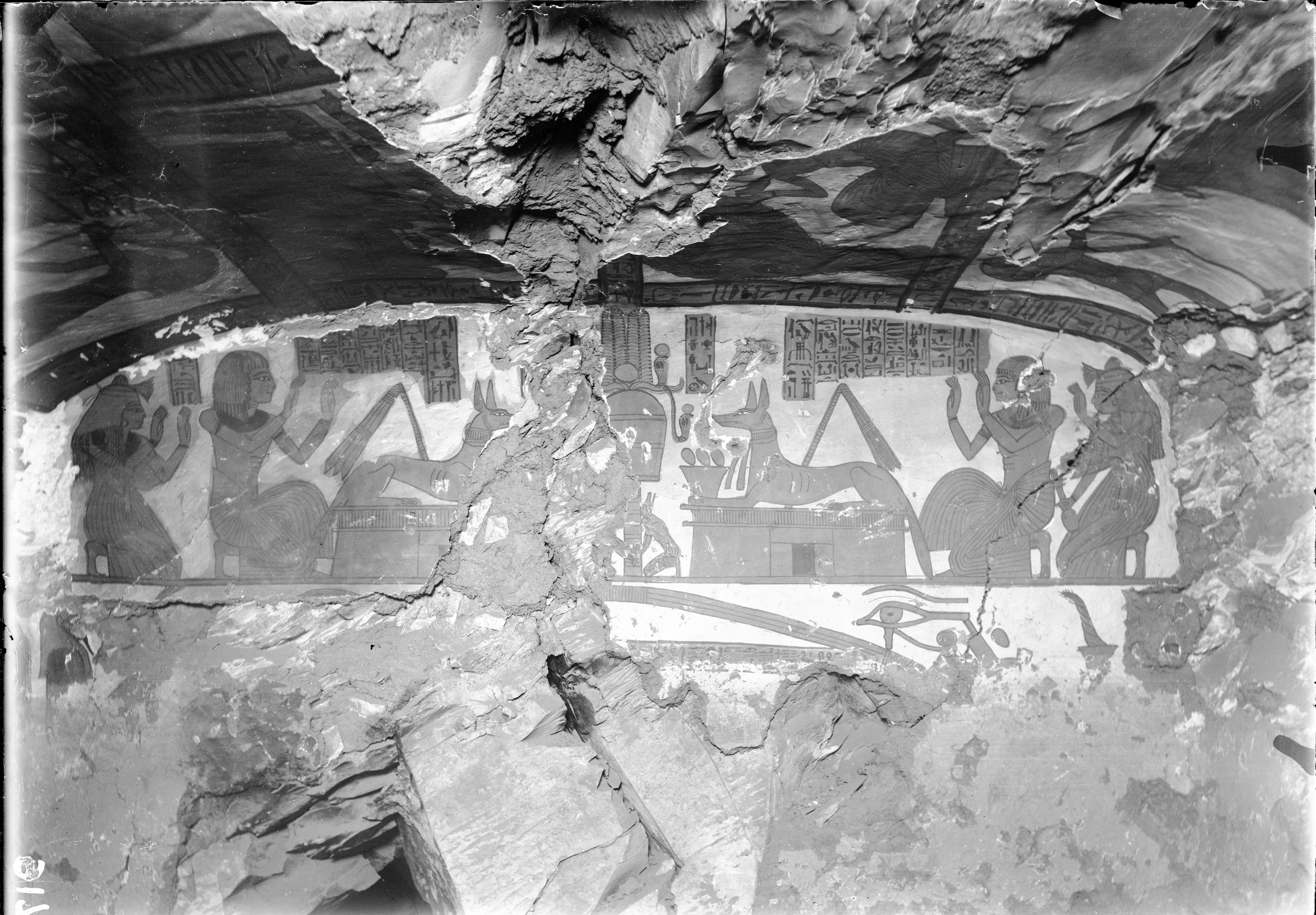 West wall, badly damaged, from the burial chamber of the tomb of Paneb (TT221).