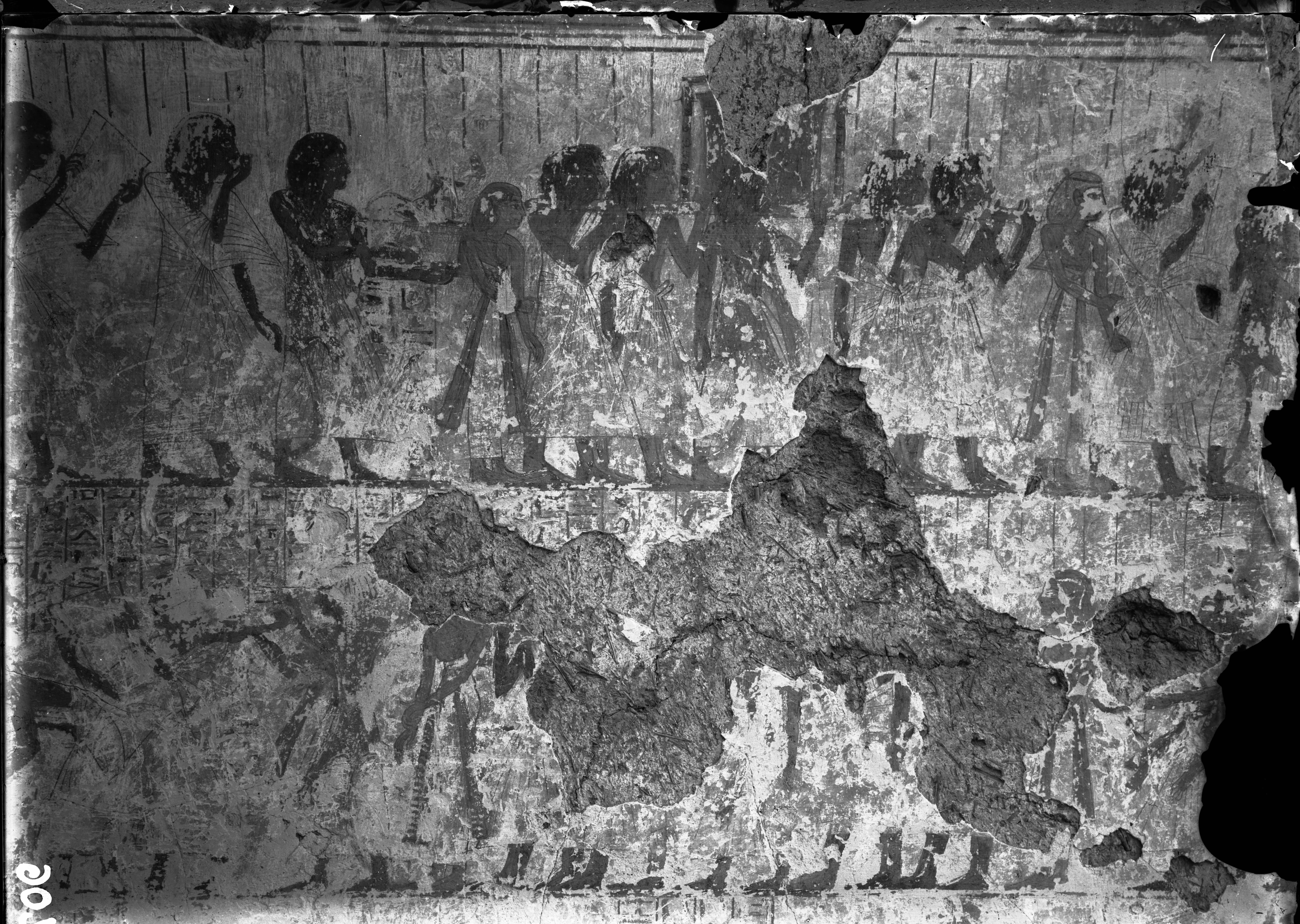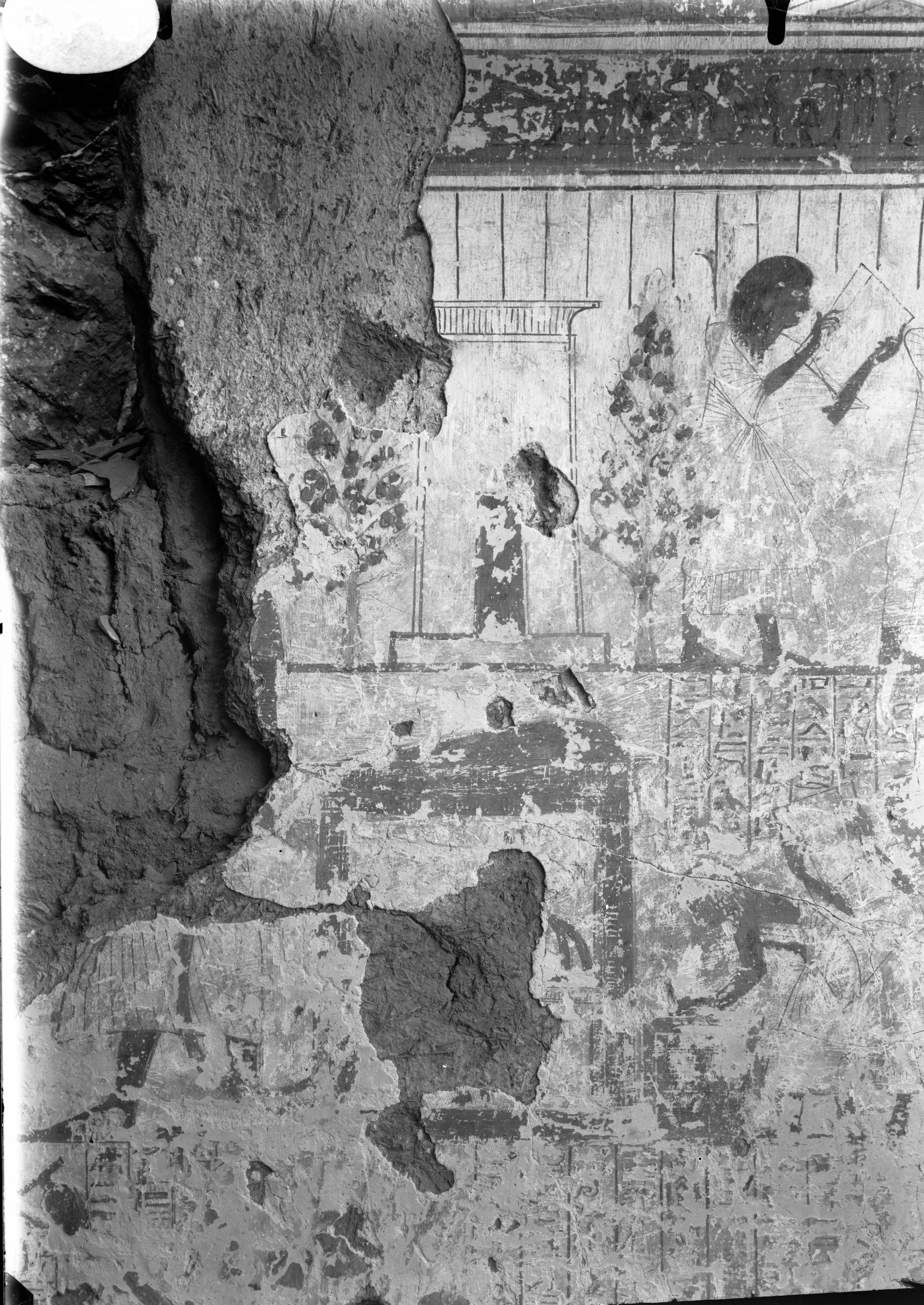 East wall of the chapel from the tomb of Amenemipet (TT215). In the upper register, a funerary procession starts from a shrine between two trees. The register below is less visible but also displays a funeral procession.