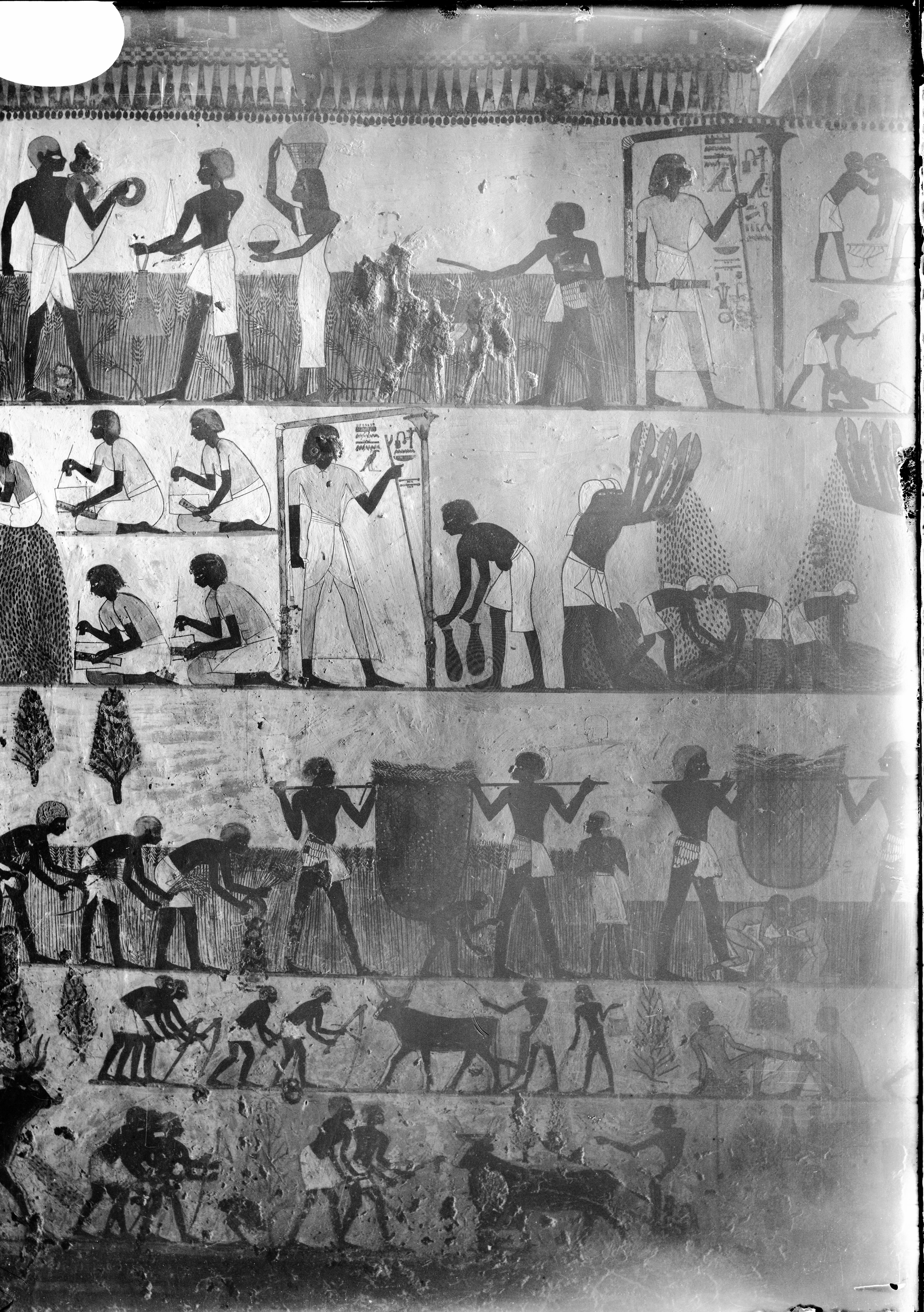 East wall, south side (left of the entrance) of the transverse chamber from the tomb of Menna (TT69). Depicted on several registers are scenes of daily life in the fields.