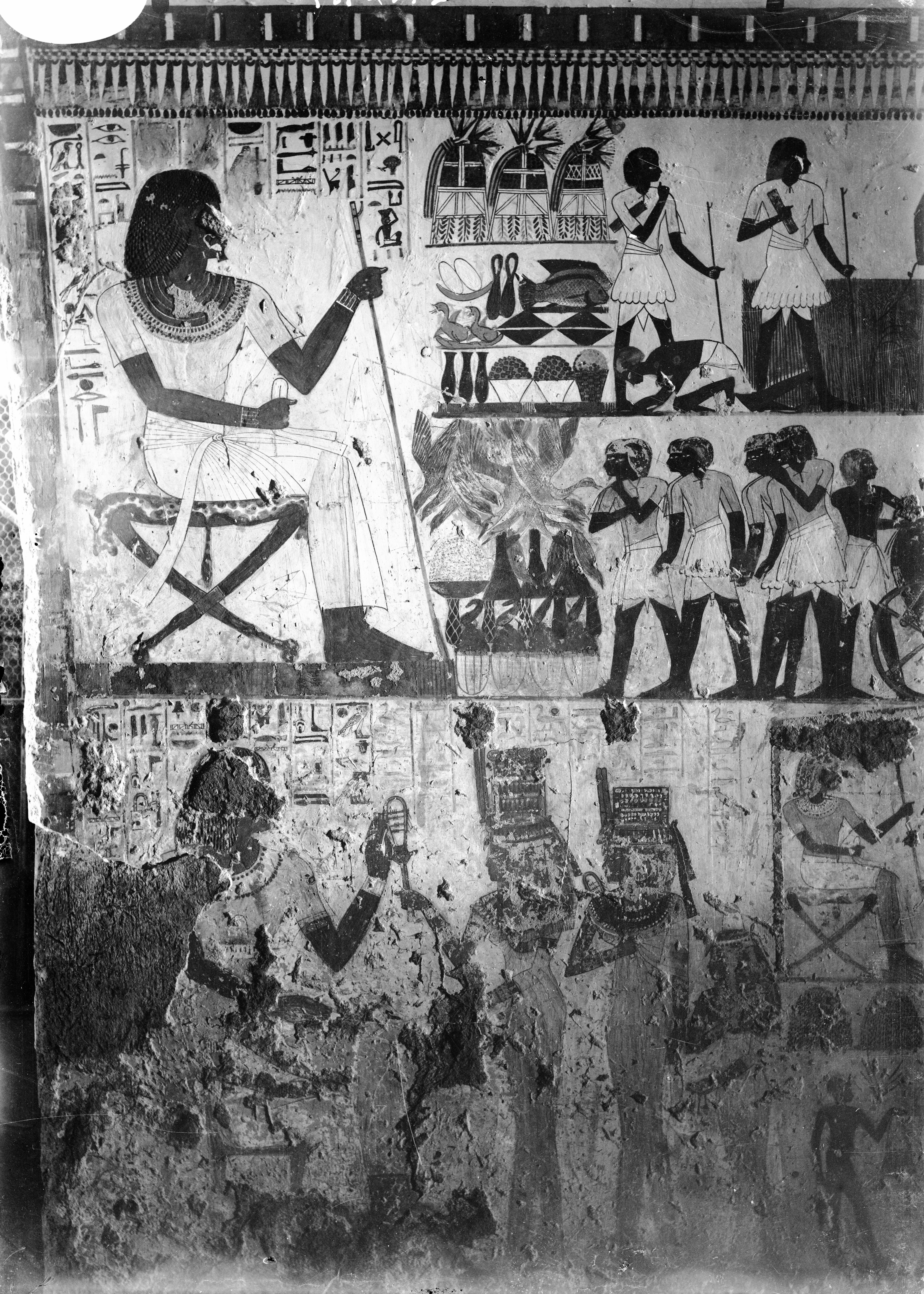 East wall, south side (left of the entrance) of the transverse chamber from the tomb of Menna (TT69). The deceased receives offerings that are piled up in front of him. Below, the deceased receives his three daughters.