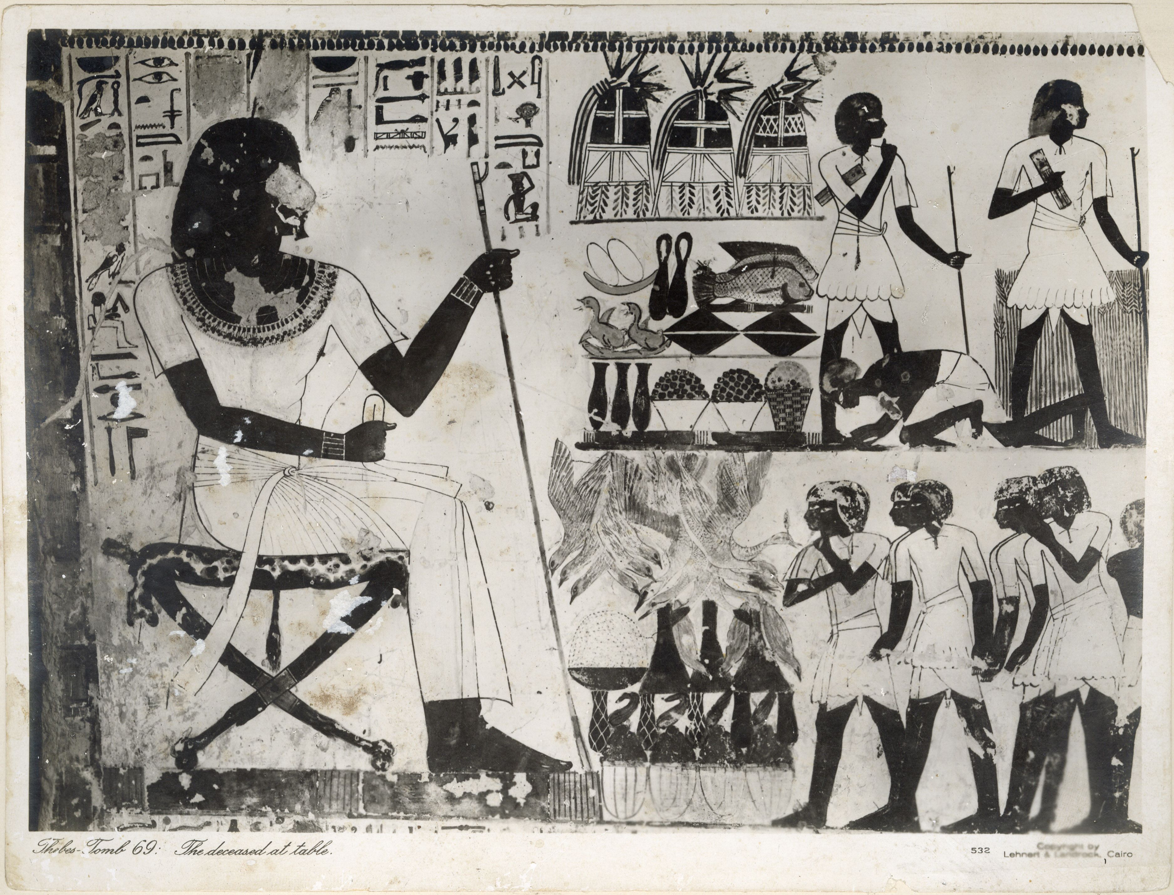 Wall painting scene from the Tomb of Mena (TT69), (south wing, east wall of the cross-chamber) in the Theban necropolis, more precisely Sheikh Abd el-Qurna. Note that the face of the deceased and the first part of his name, has been erased. The company Lehnert and Landrock (Egypt) was founded in the 1920s, therefore the photograph was taken later. Photograph probably taken by Rudolph Lehnert.