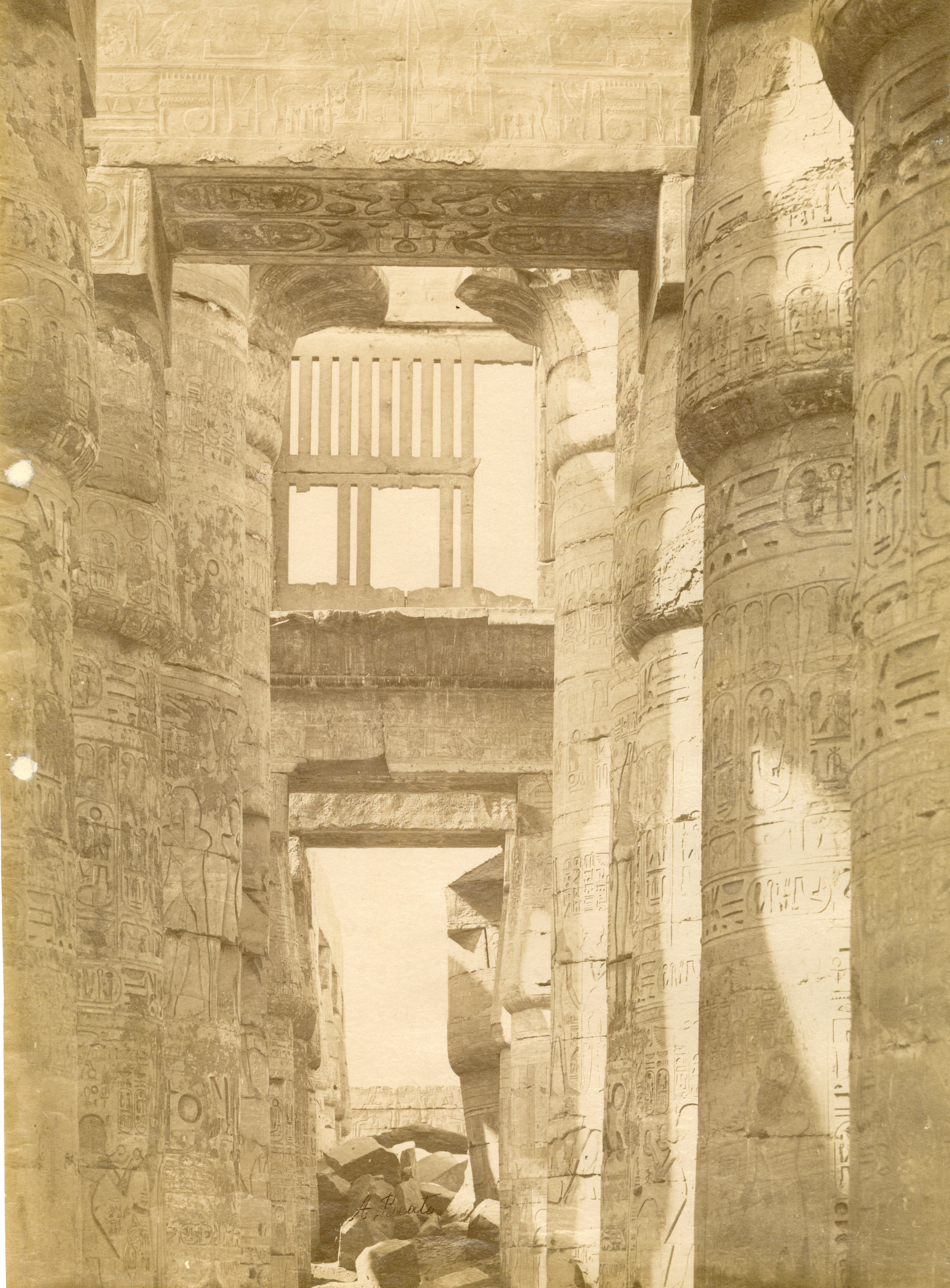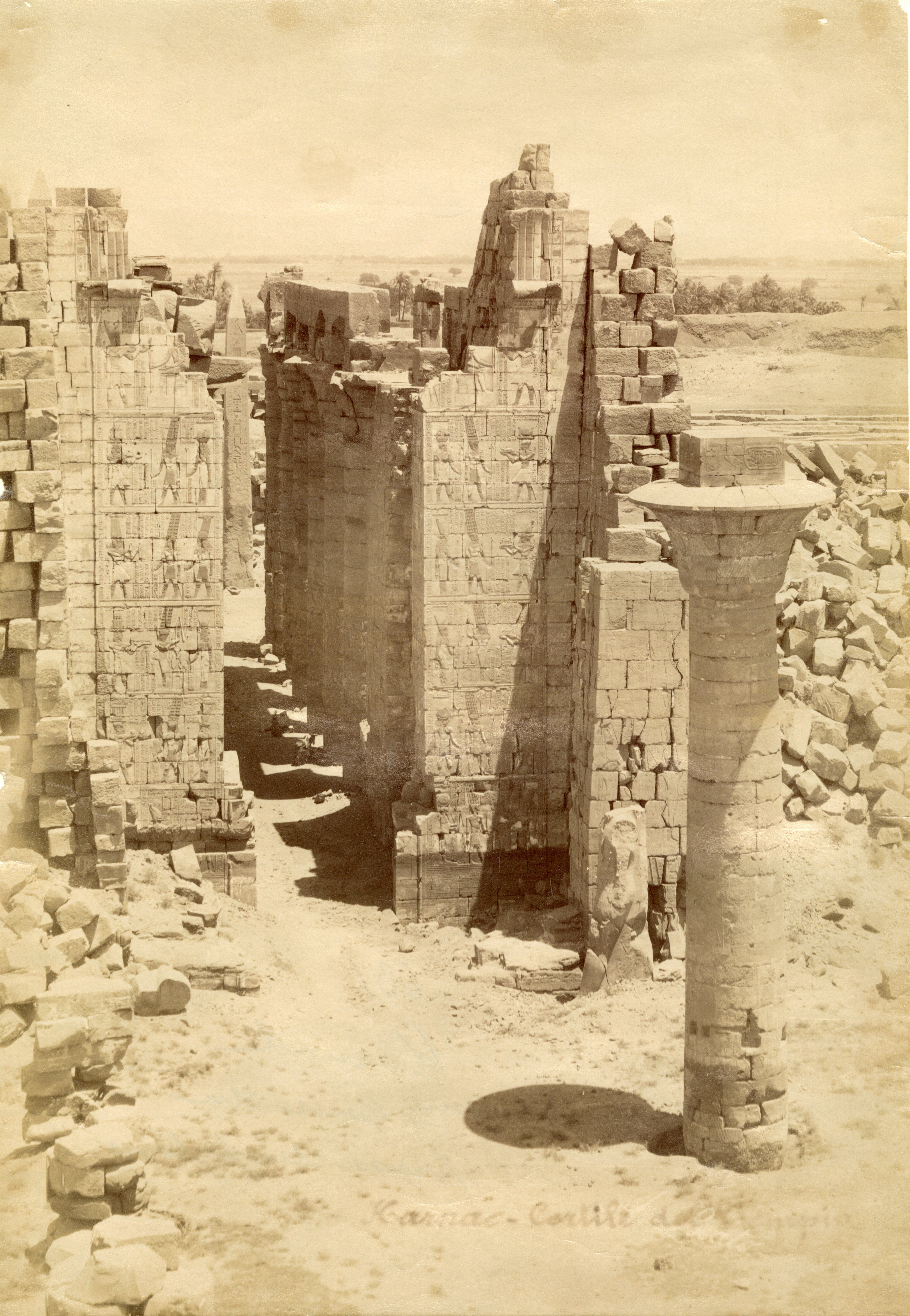 The photograph shows the first courtyard of the Karnak Temple Complex, with the second pylon behind it and the Great Hypostyle Hall, with the remains of the kiosk of the Pharaoh Taharqa on the right (represented by the column still standing). All viewed from the first pylon, from which the complex is entered. The author's signature is visible at the bottom. Photograph probably taken from the top of the I pylon.