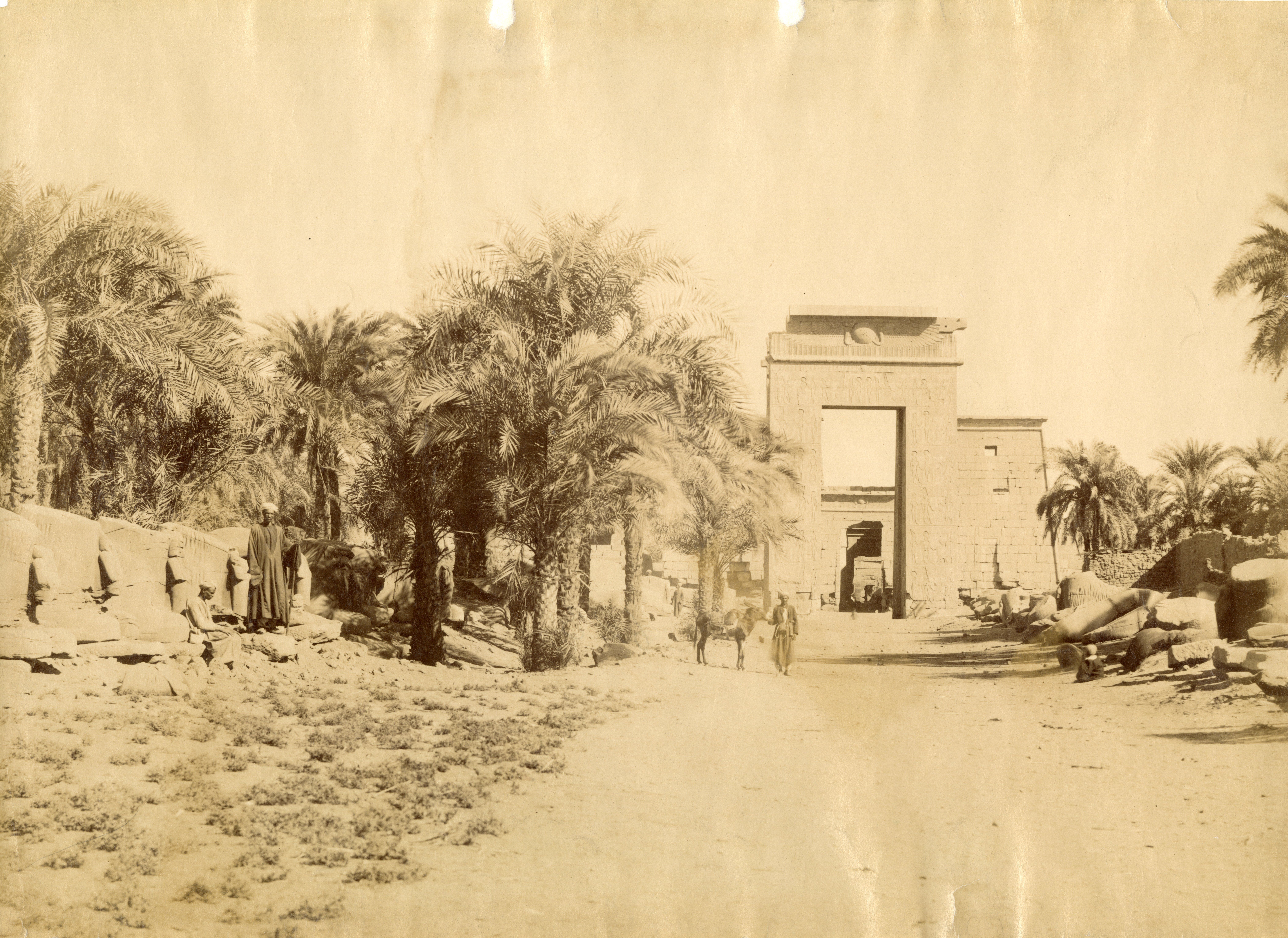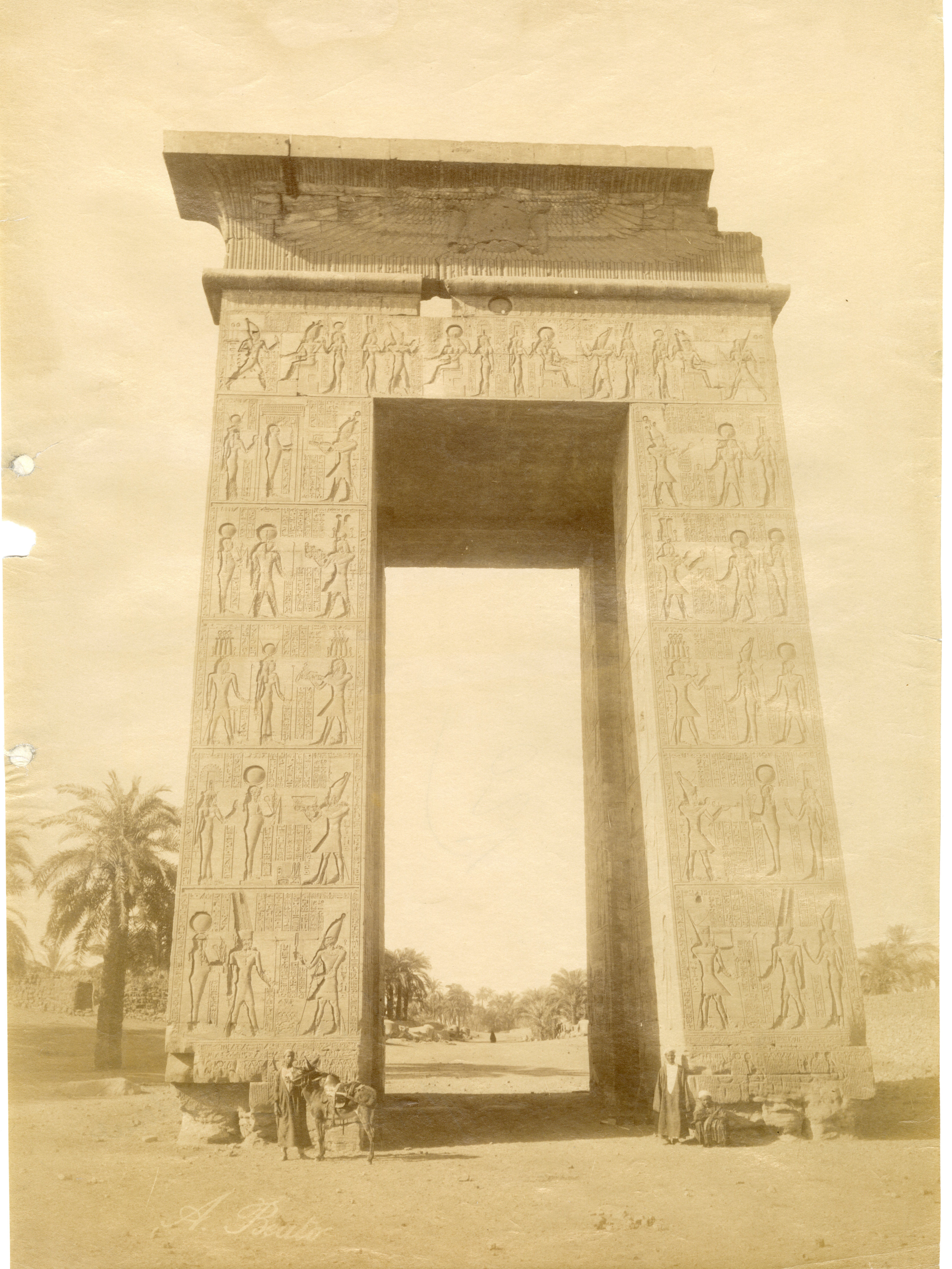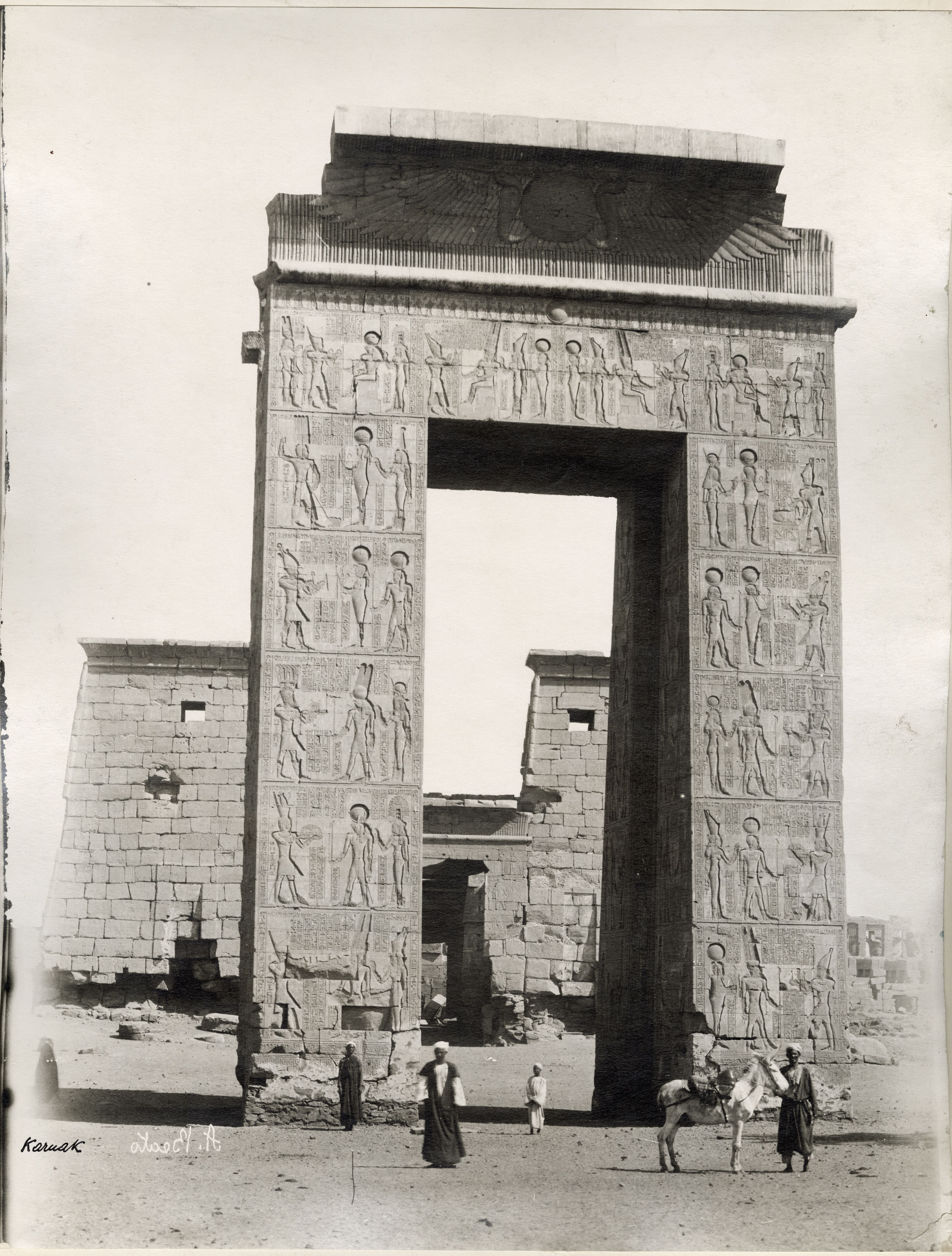 A photograph of the western gate to the Karnak Temple Complex, built by Pharaoh Ptolemy IV. Some Egyptians and a donkey are posing in front of it, giving an idea of the colossal proportions. The author's signature is visible at the bottom left.