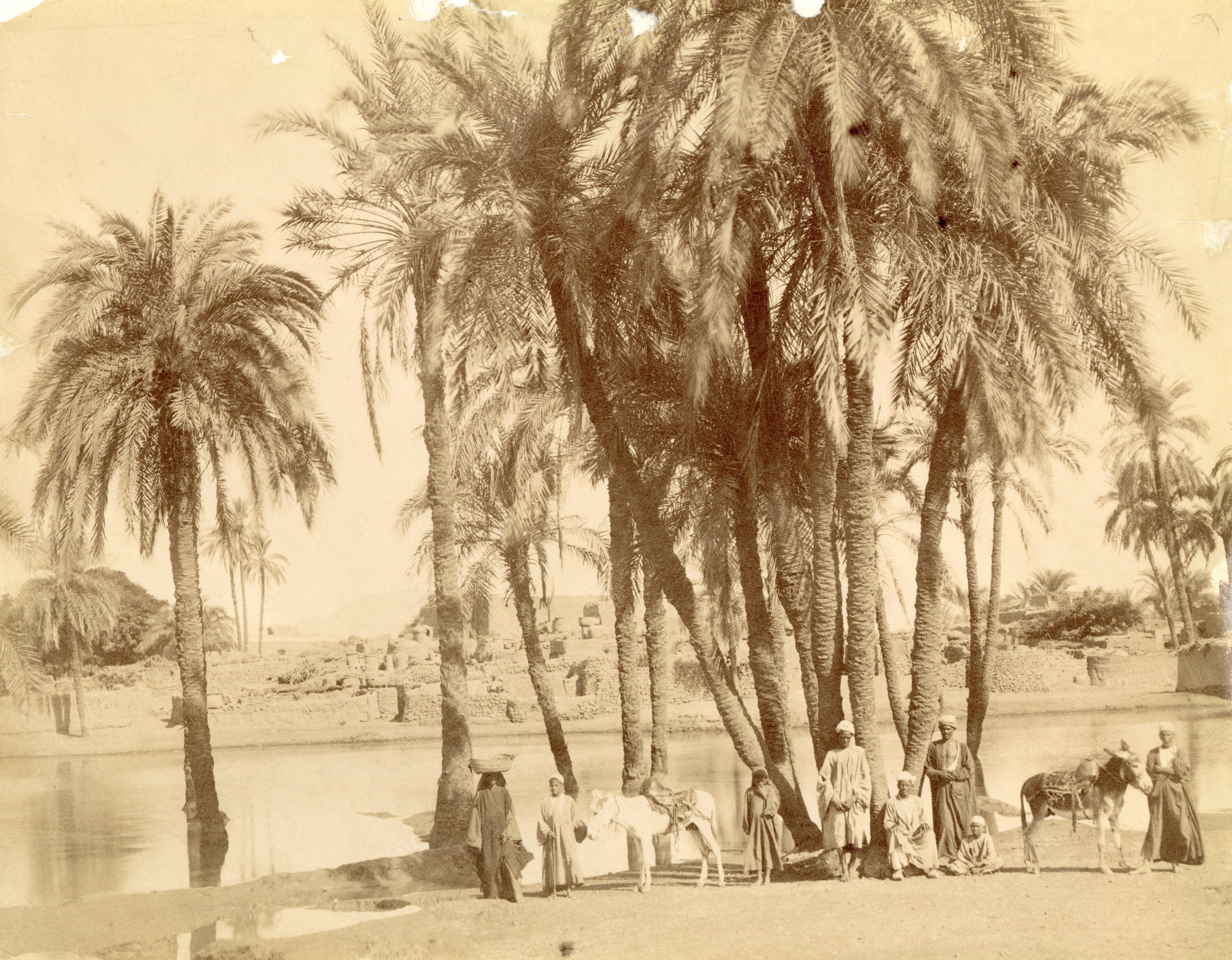 The photograph depicts a group of Egyptians in the shade of a palm grove on the banks of one of the Nile’s canals. As stated in the caption on the back of the photograph; the village of Karnak is evident in the background, where some remains of ancient columns can be seen.