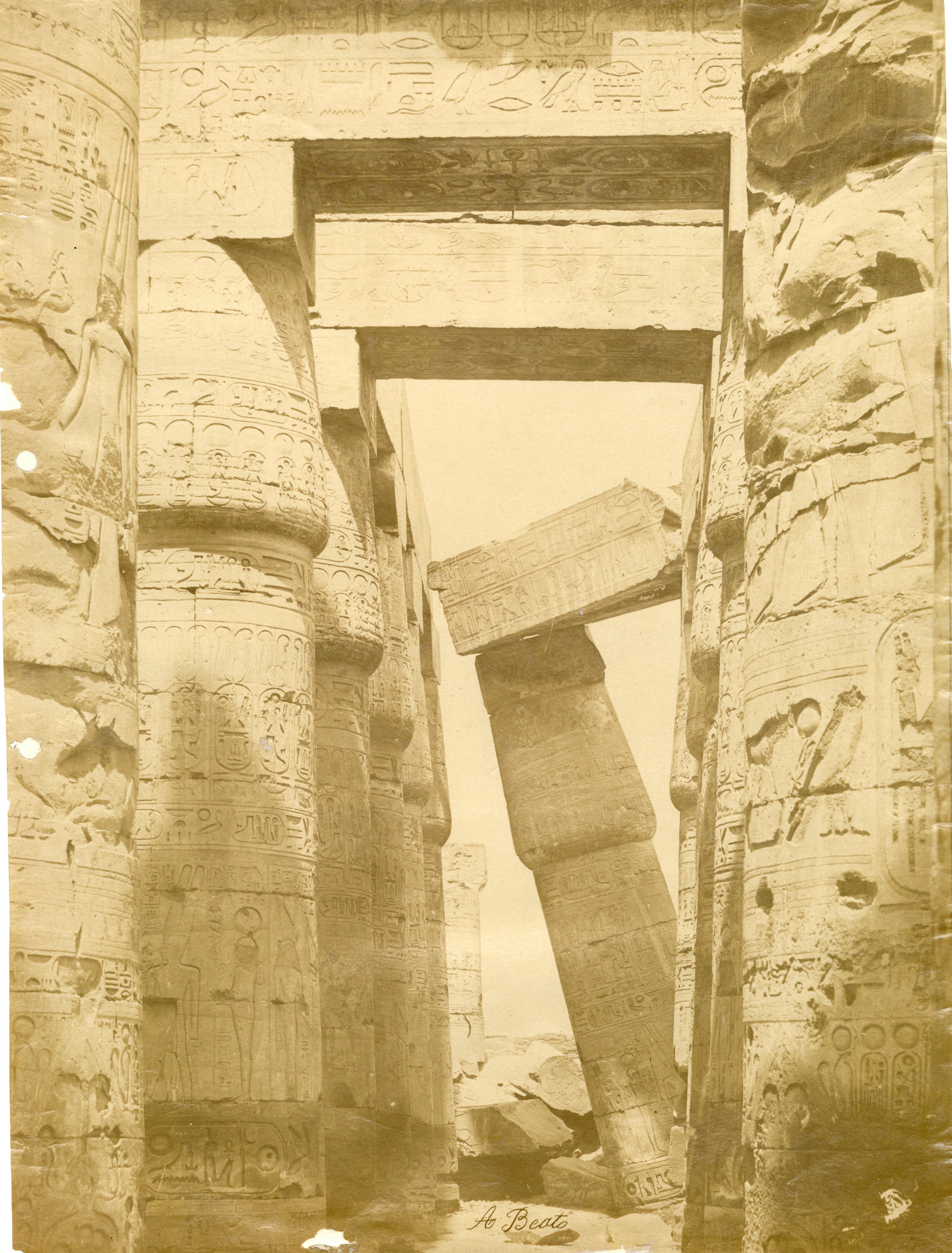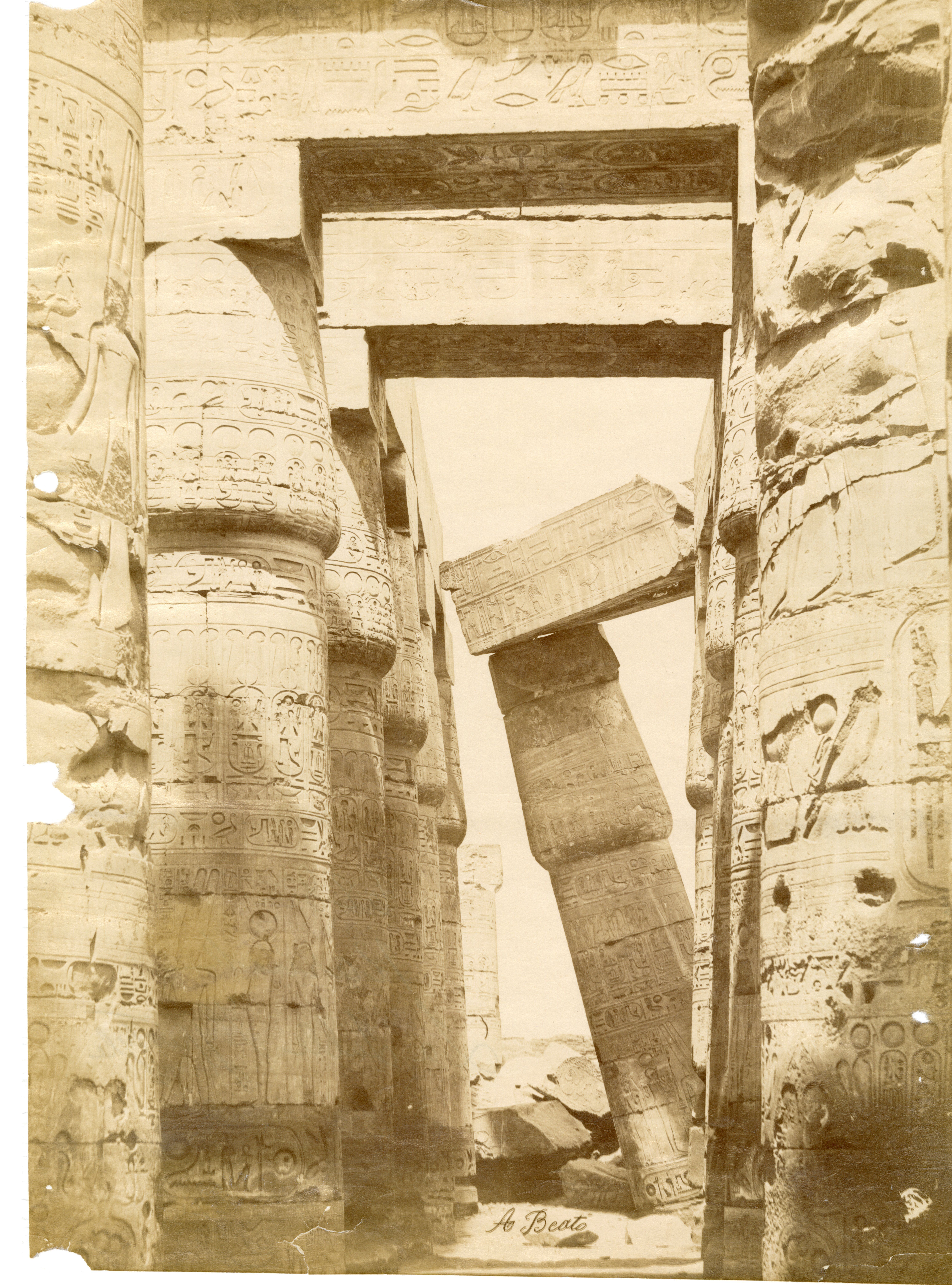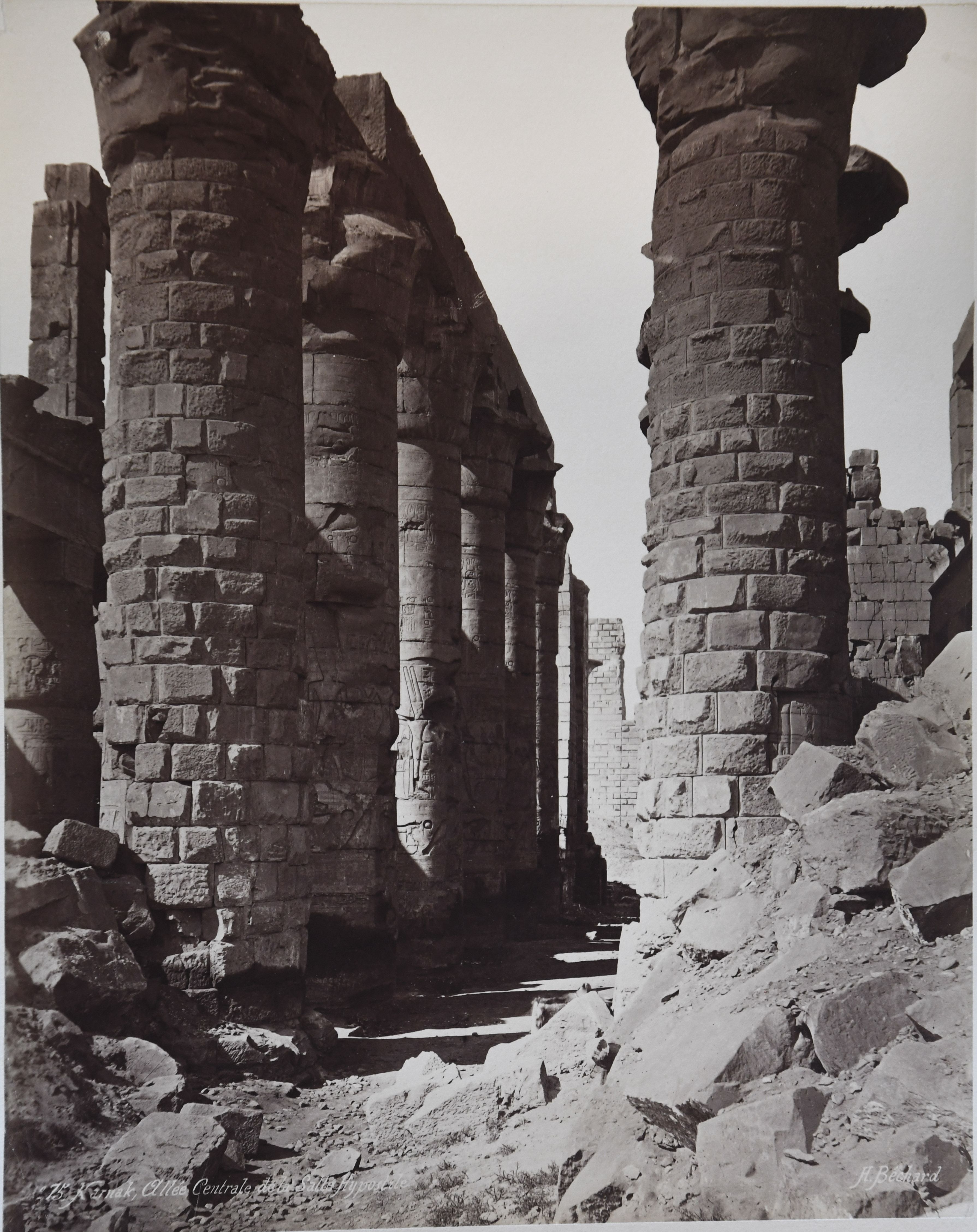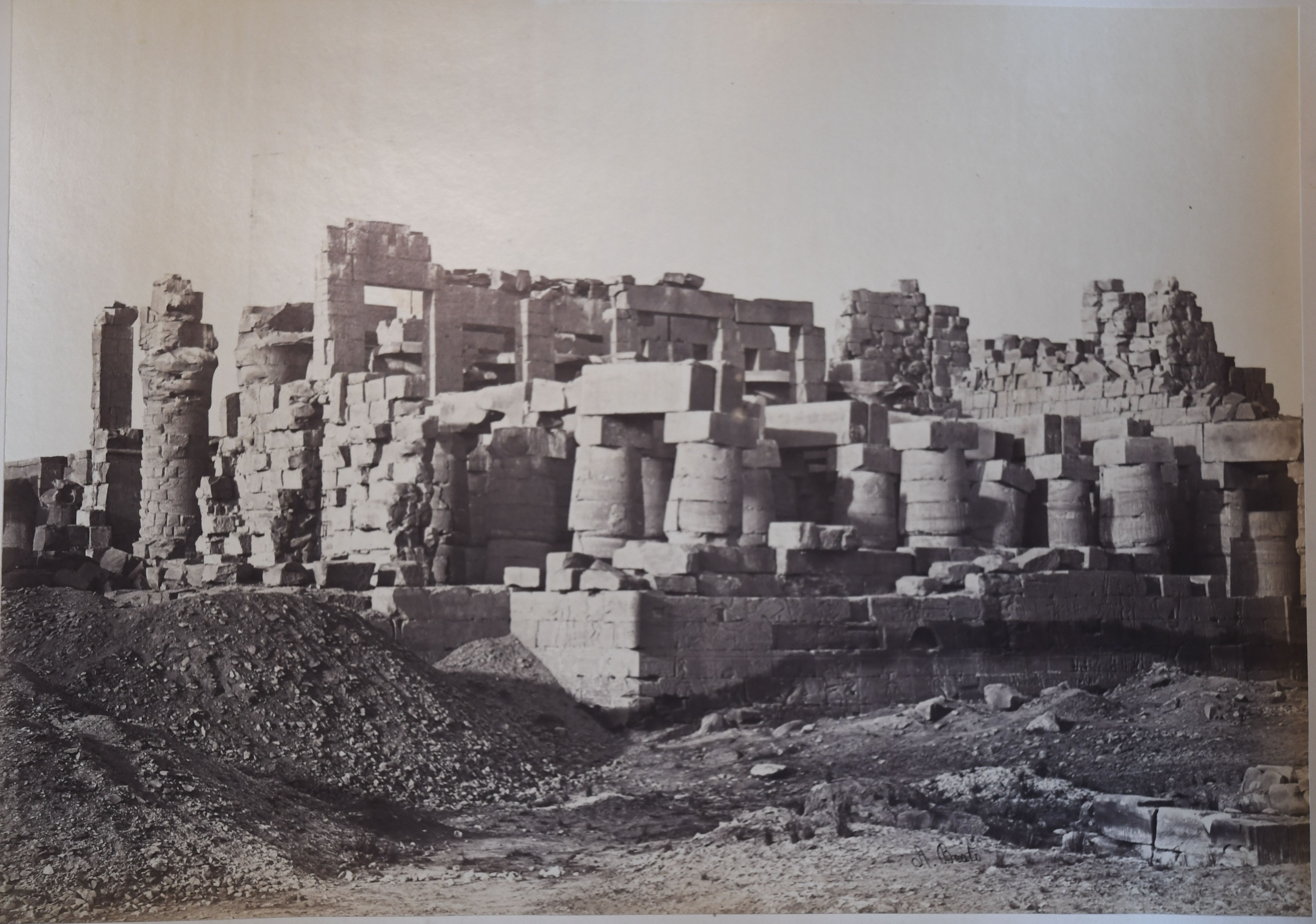 The photograph shows the longitudinal section of the Great Hypostyle Hall of the Karnak Temple Complex together with the ruins of some collapsed walls. The authors' signatures can be seen at the bottom right.