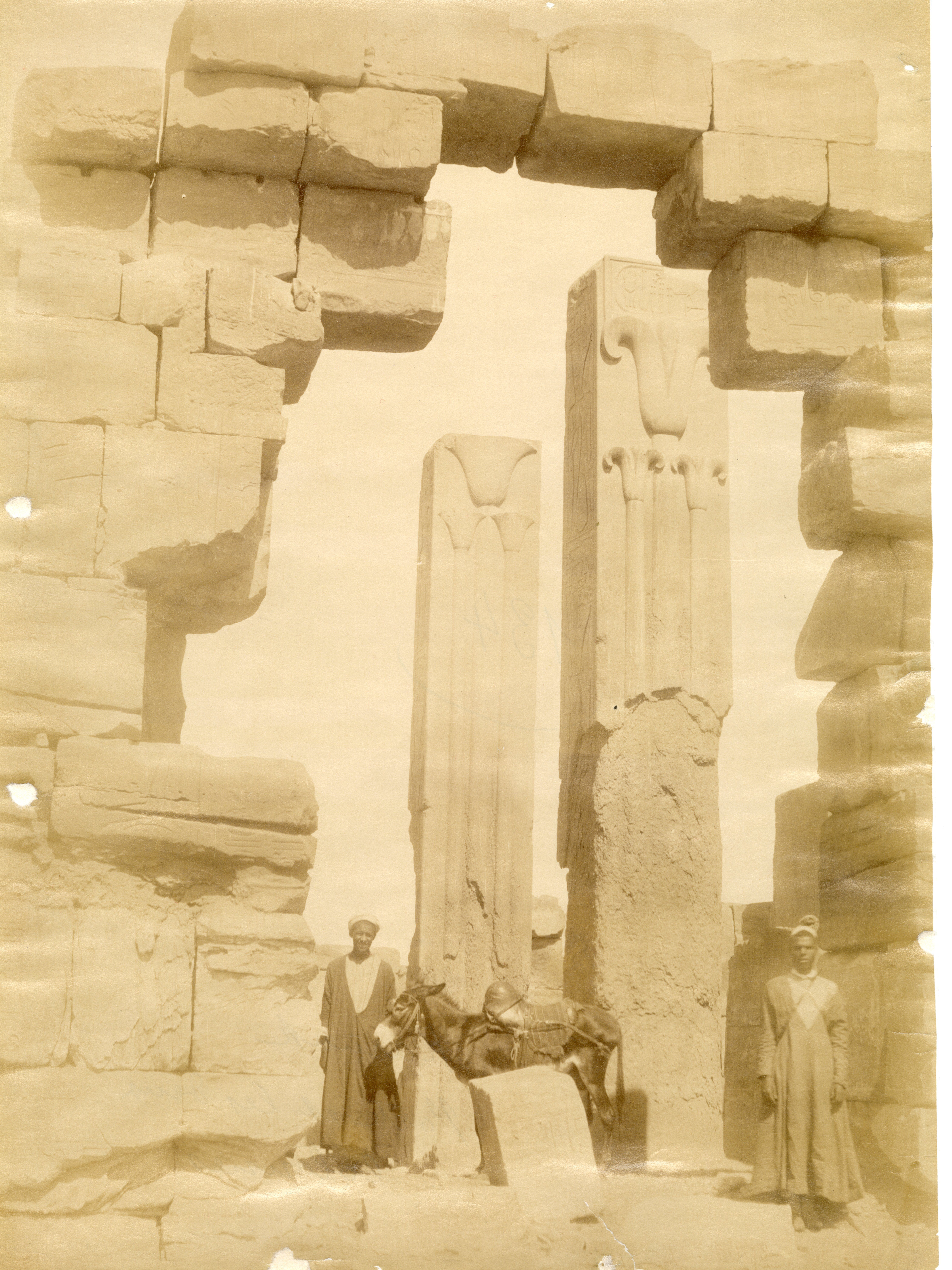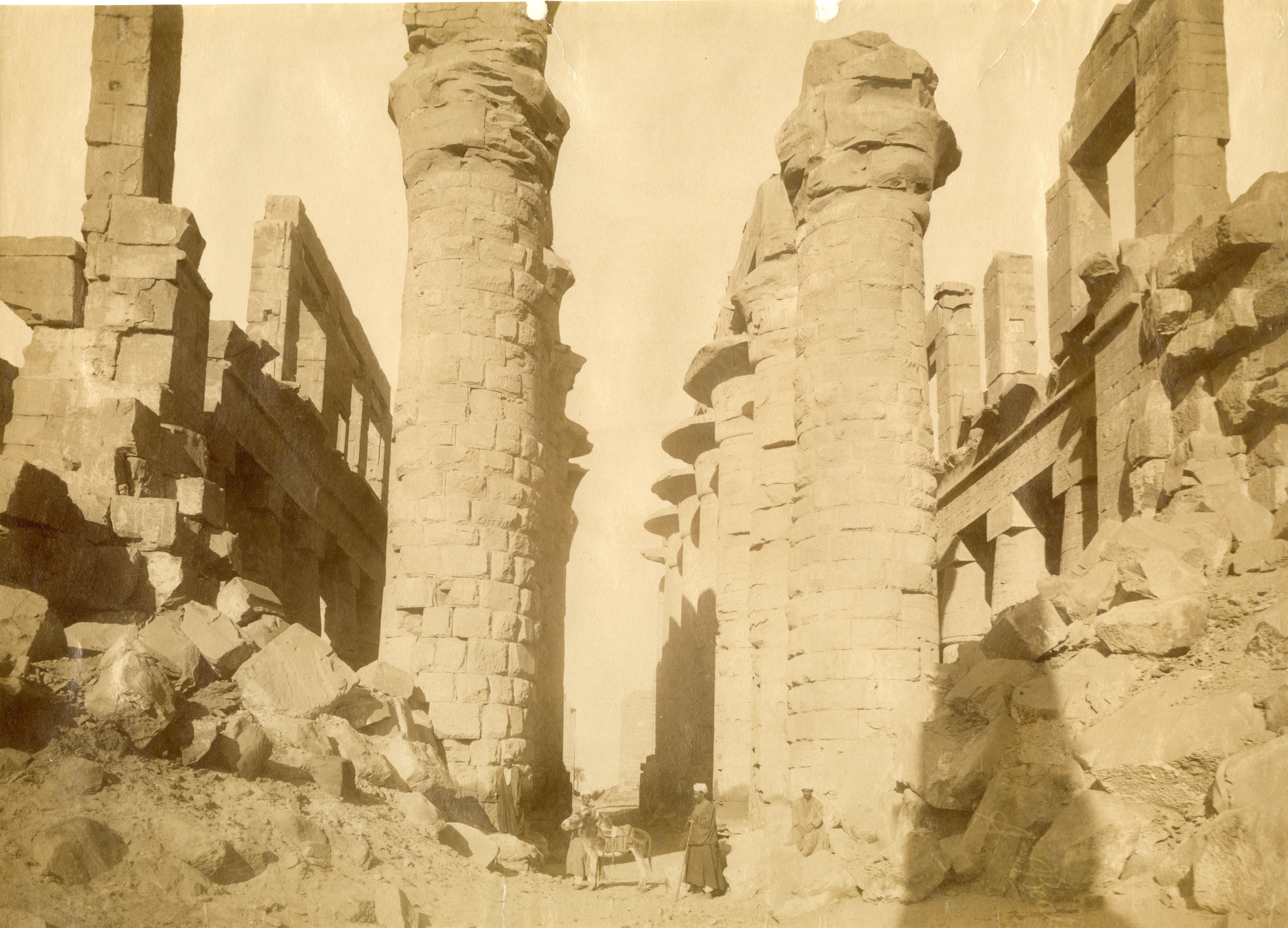 The photograph shows the central colonnade of the Great Hypostyle Hall in the Karnak Temple Complex, in the direction of the second and first pylons, with four egyptians and a donkey at the foot of the ruins. Note the accumulation of blocks on either side of the entrance. The author's signature can be found at the bottom right.