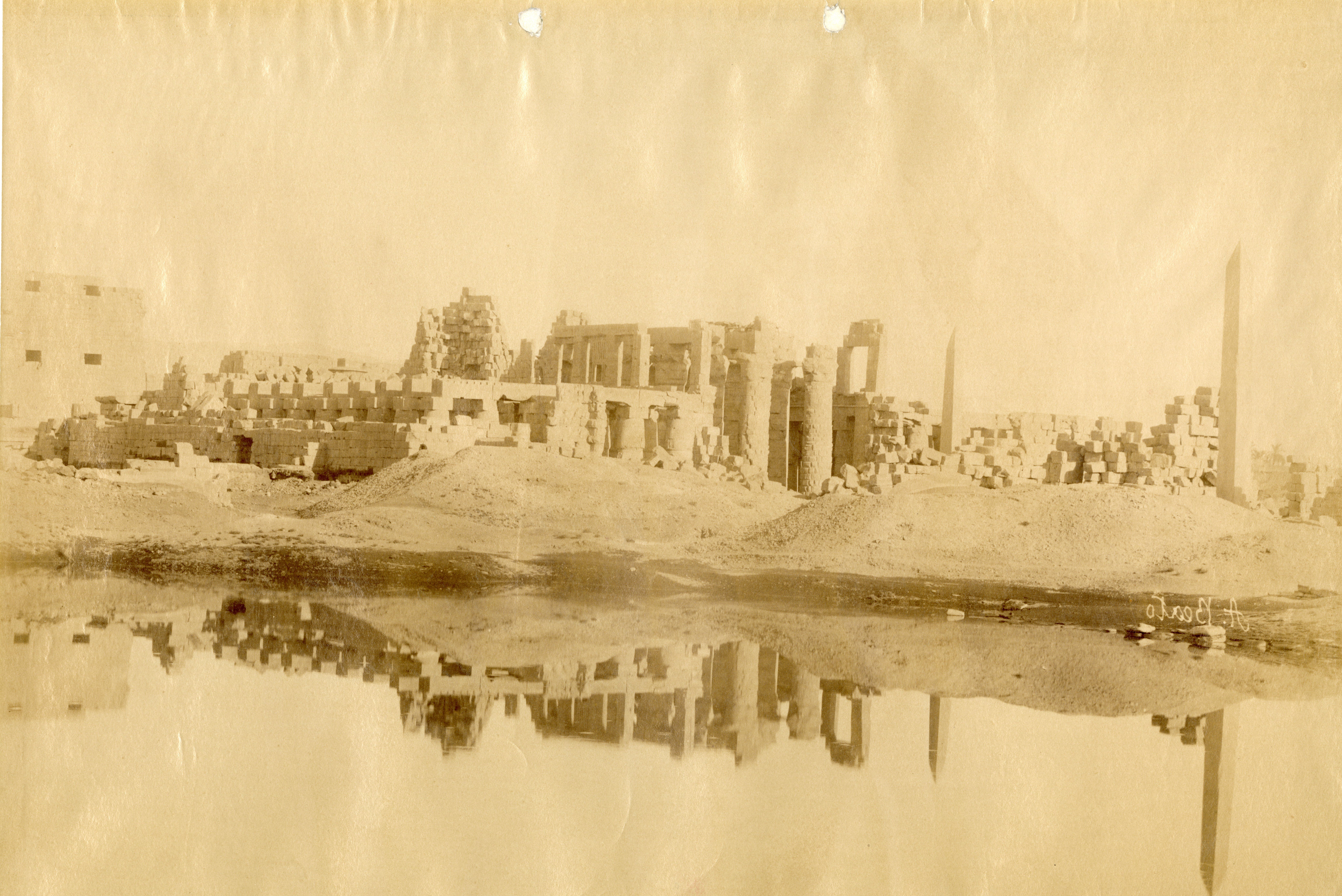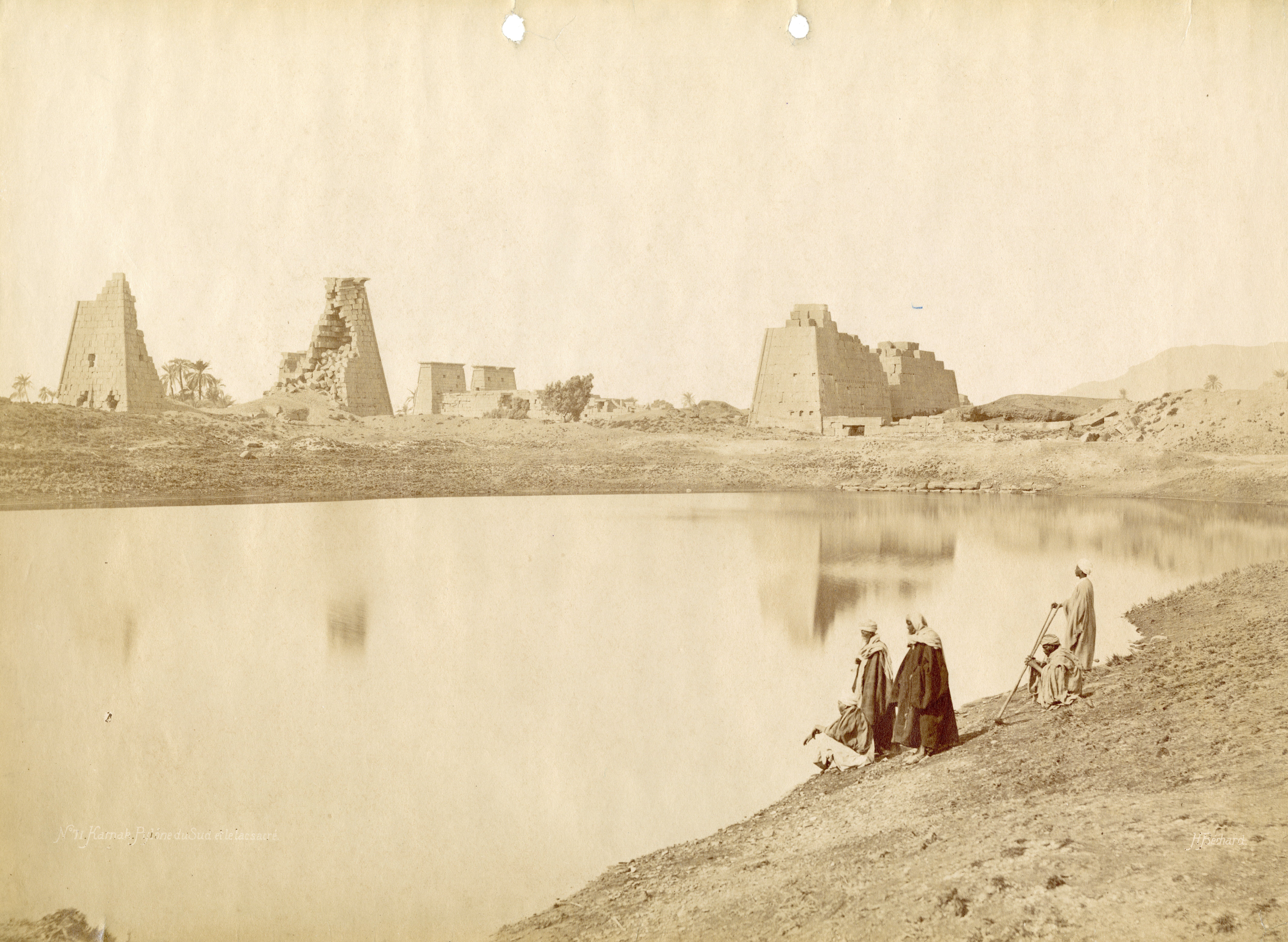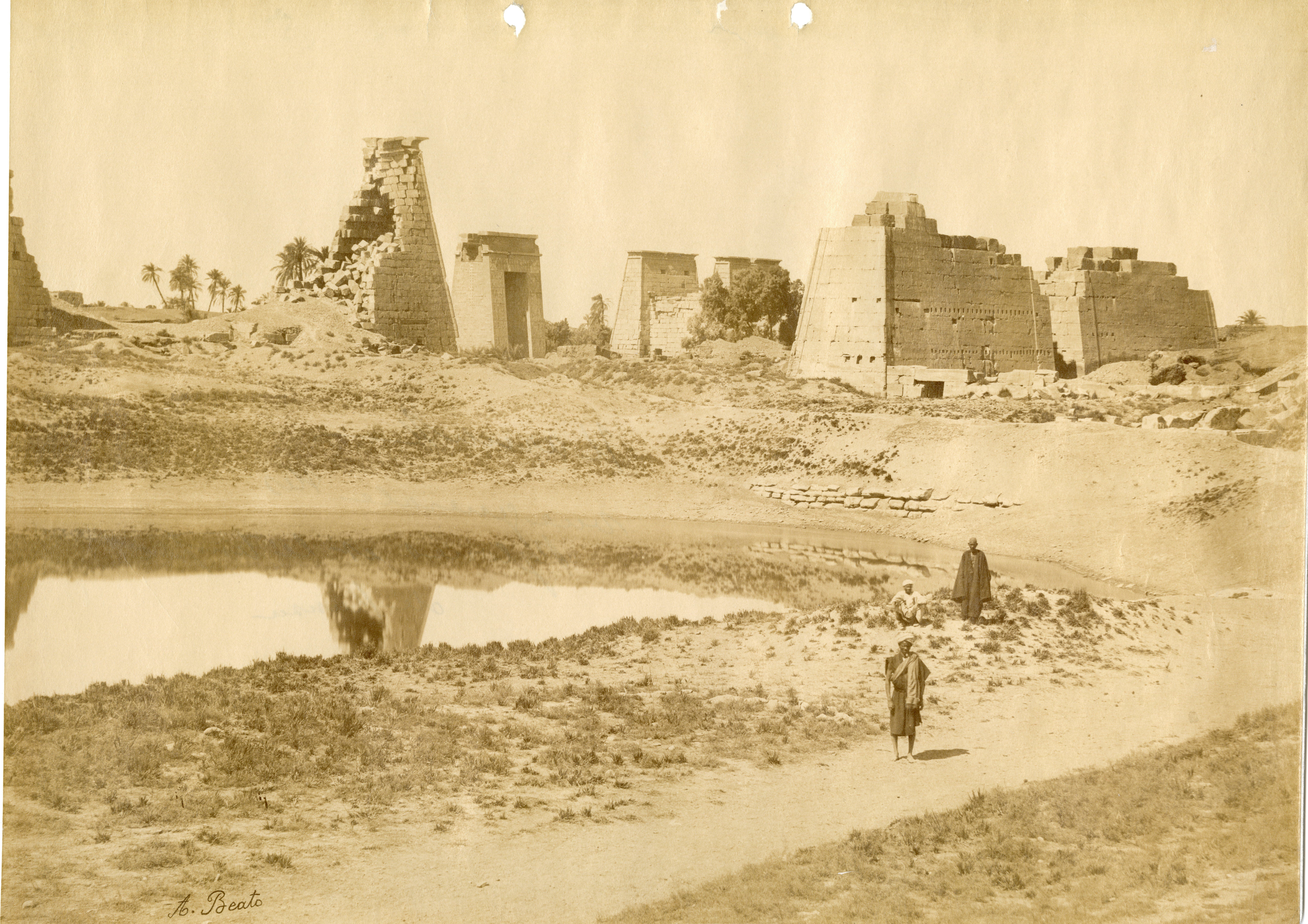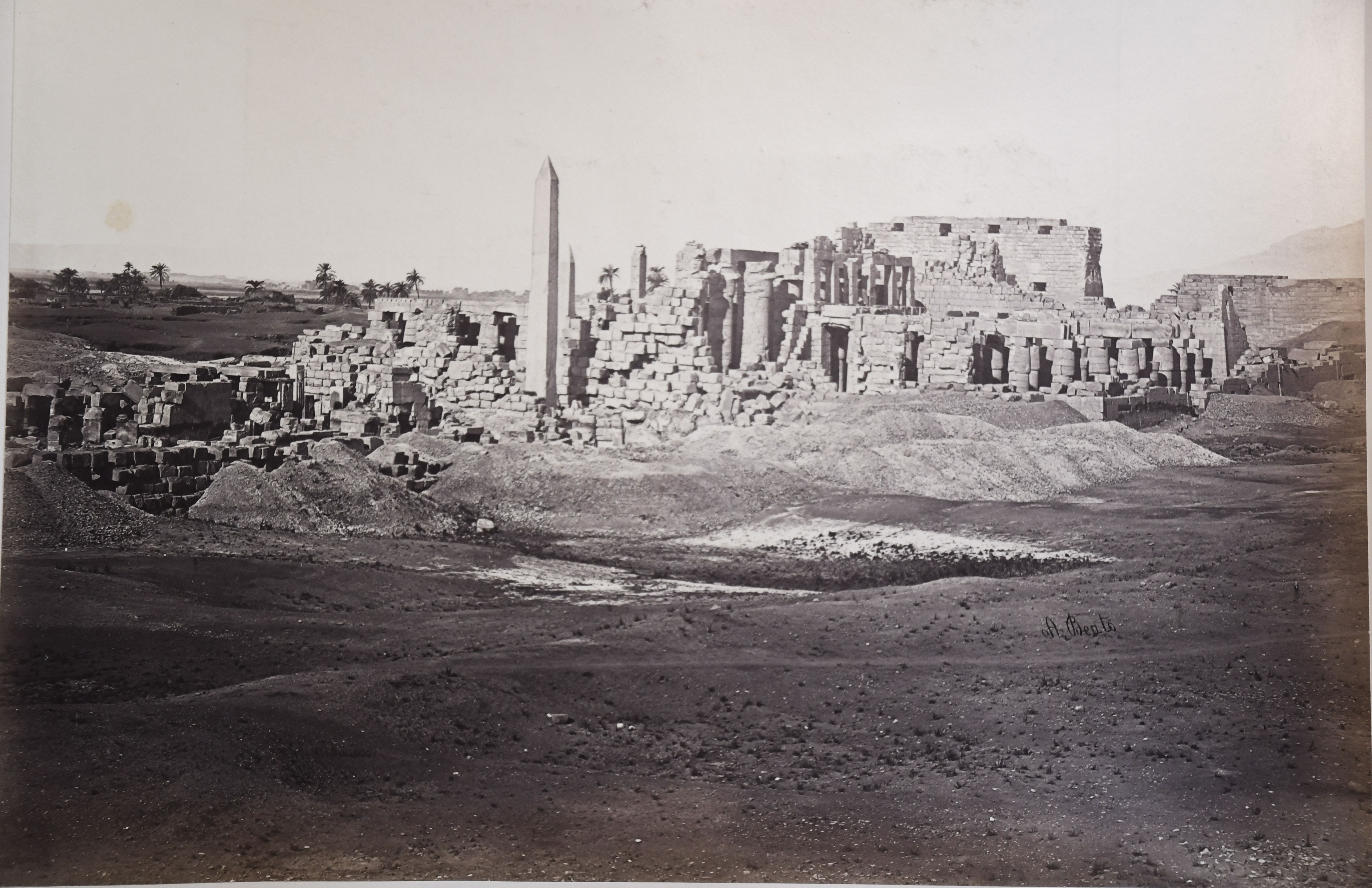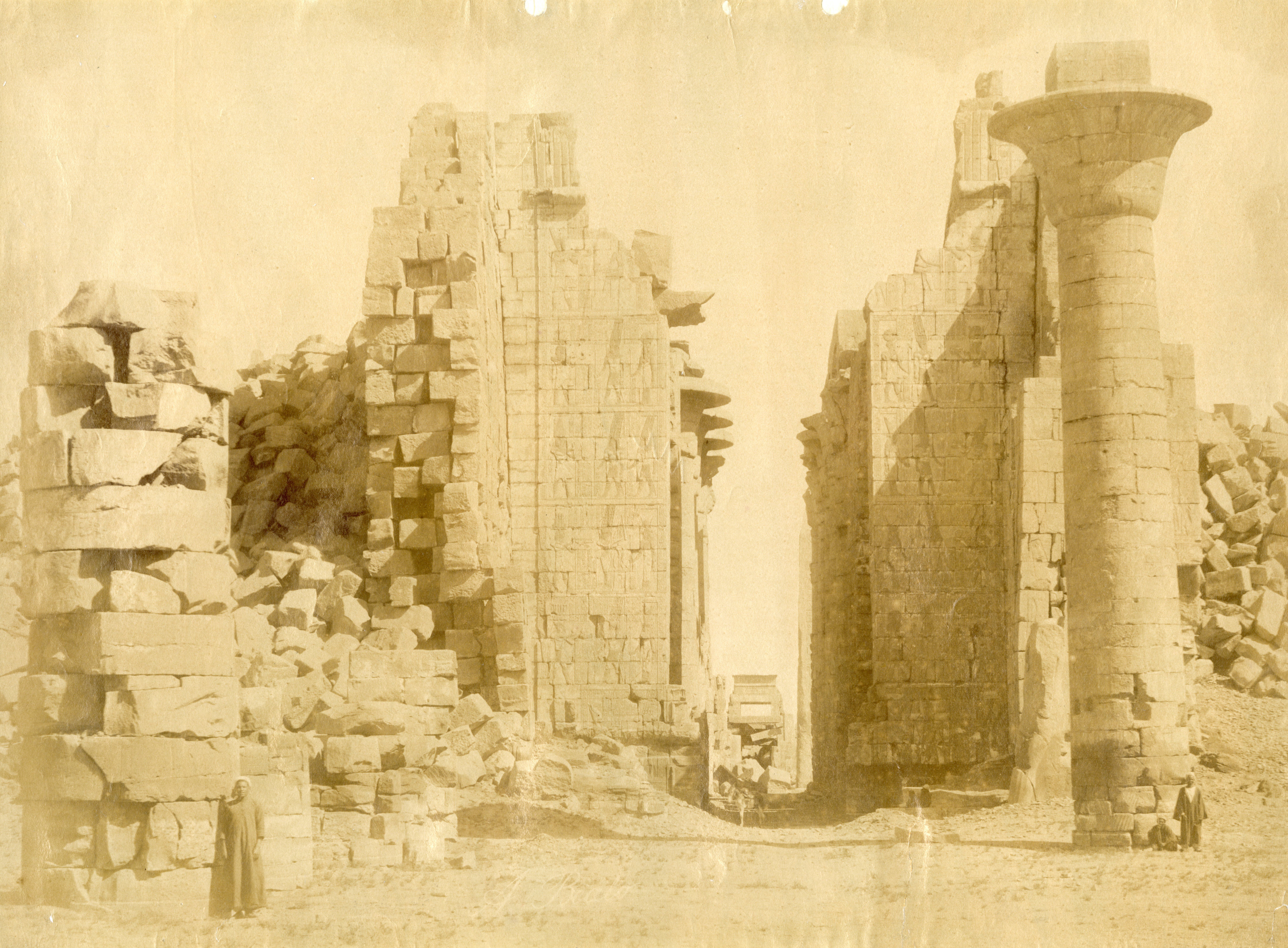 The photograph depicts the ruins of two pylons in the Karnak Temple Complex, seen from the Sacred Lake, specifically the ninth pylon (left, that of Pharaoh Horemheb) and the eighth pylon (right, that of Queen Hatshepsut). In the background, centre, the southern gate commissioned by Ptolemy III Euergetes to access to the Temple of Khonsu, from where the pylon is visible. The perspective however, is distorted but the two monuments are aligned. Three egyptians on the bank of the slightly drained Sacred Lake look towards the camera lens. The author's signature is visible at the bottom left.
