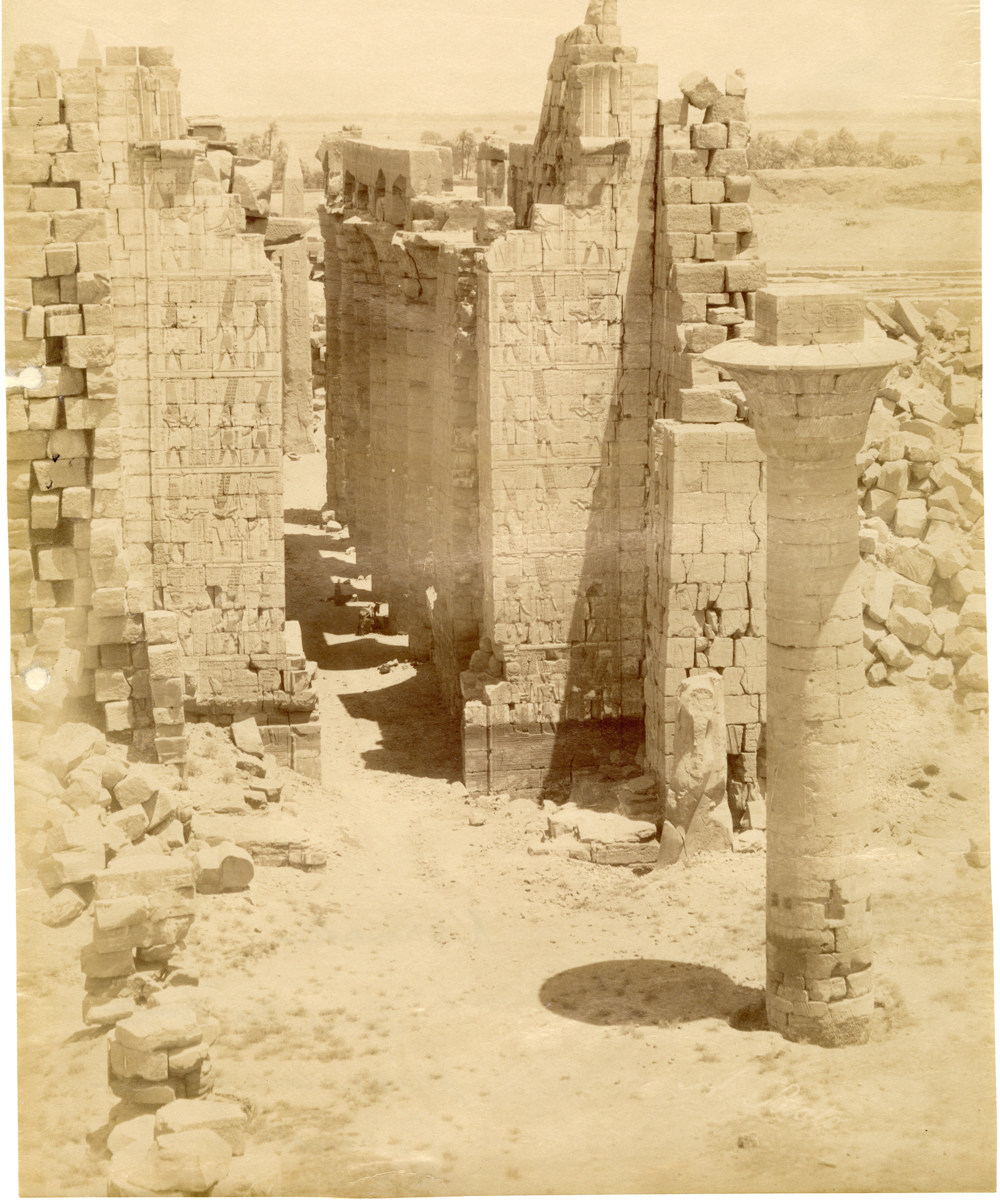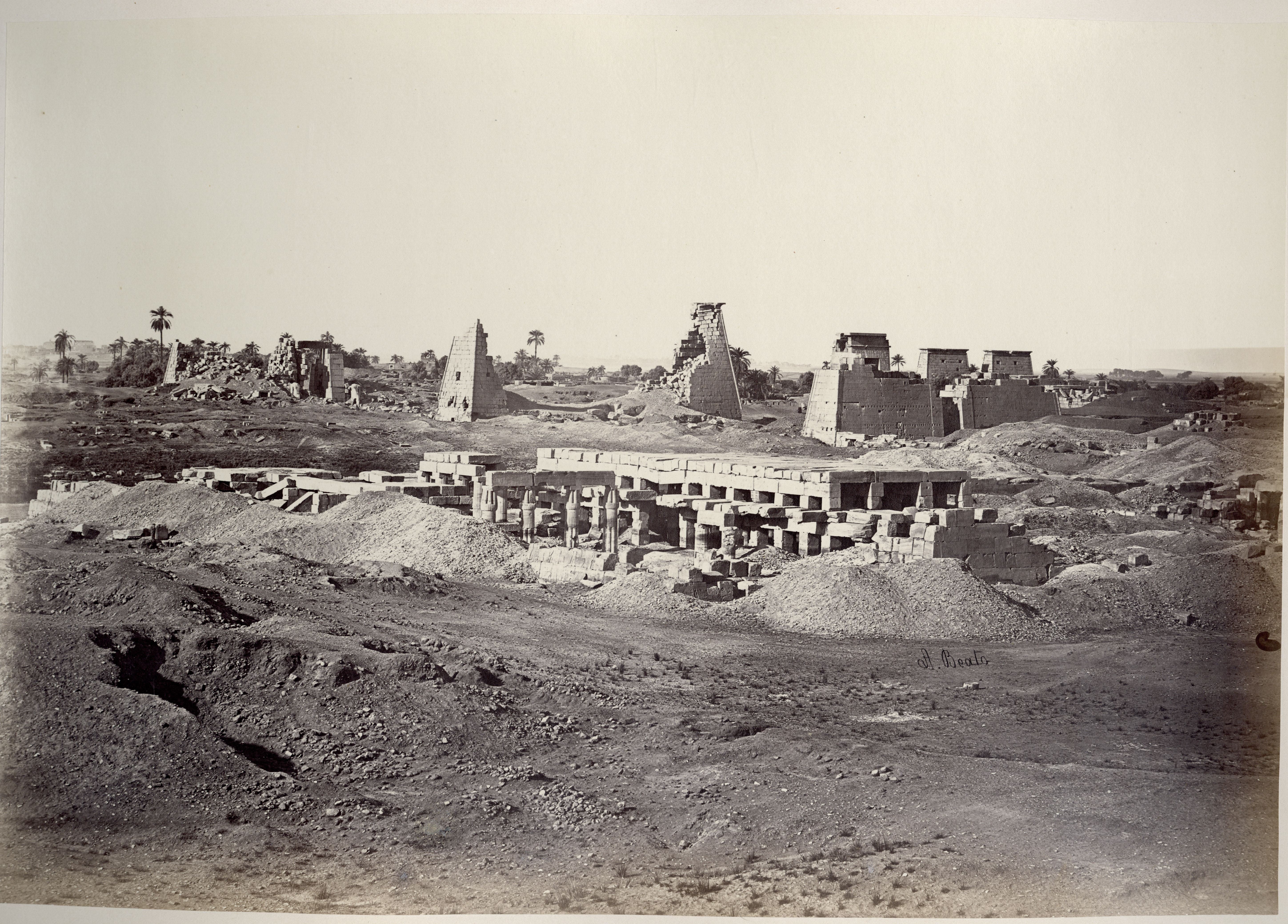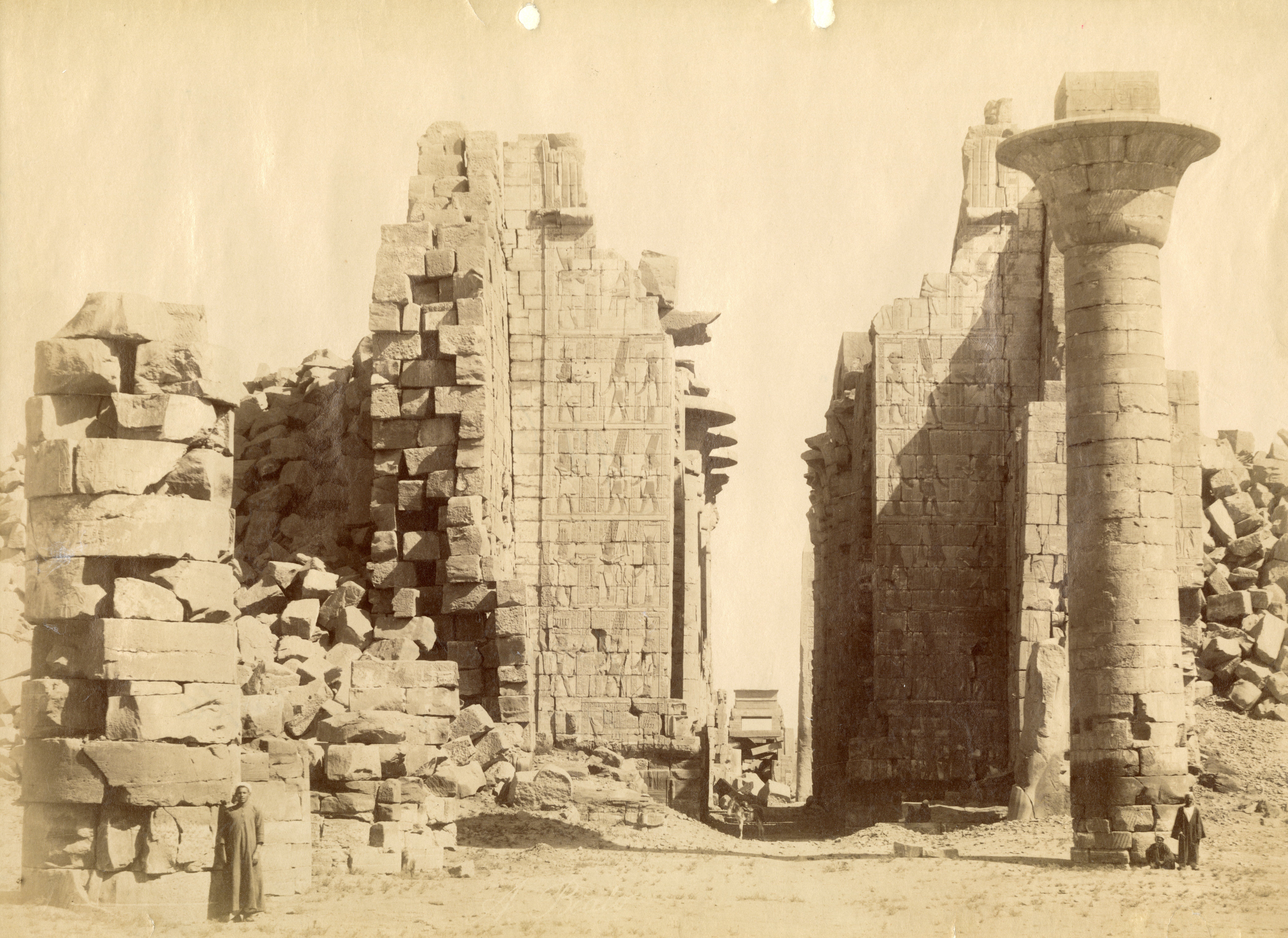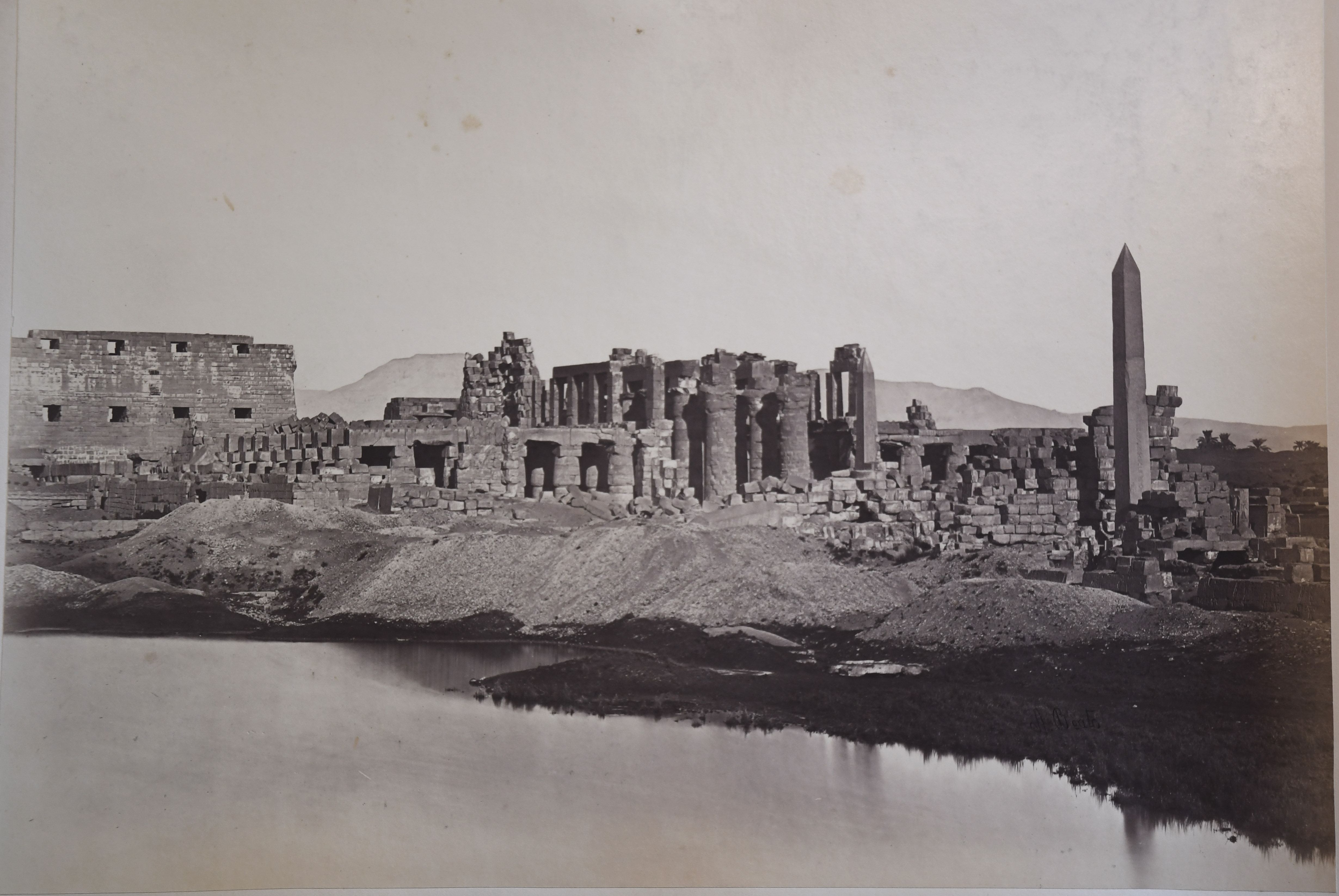 The photograph depicts the ruins of two pylons in the Karnak Temple Complex, seen from the Sacred Lake, specifically the ninth pylon (left, that of Pharaoh Horemheb) and the eighth pylon (right, that of Queen Hatshepsut). In the background, centre, the southern gate commissioned by Ptolemy III Euergetes to access to the Temple of Khonsu, from where the pylon is visible. The perspective however, is distorted but the two monuments are aligned. Three egyptians on the bank of the slightly drained Sacred Lake look towards the camera lens. The author's signature is visible at the bottom left.