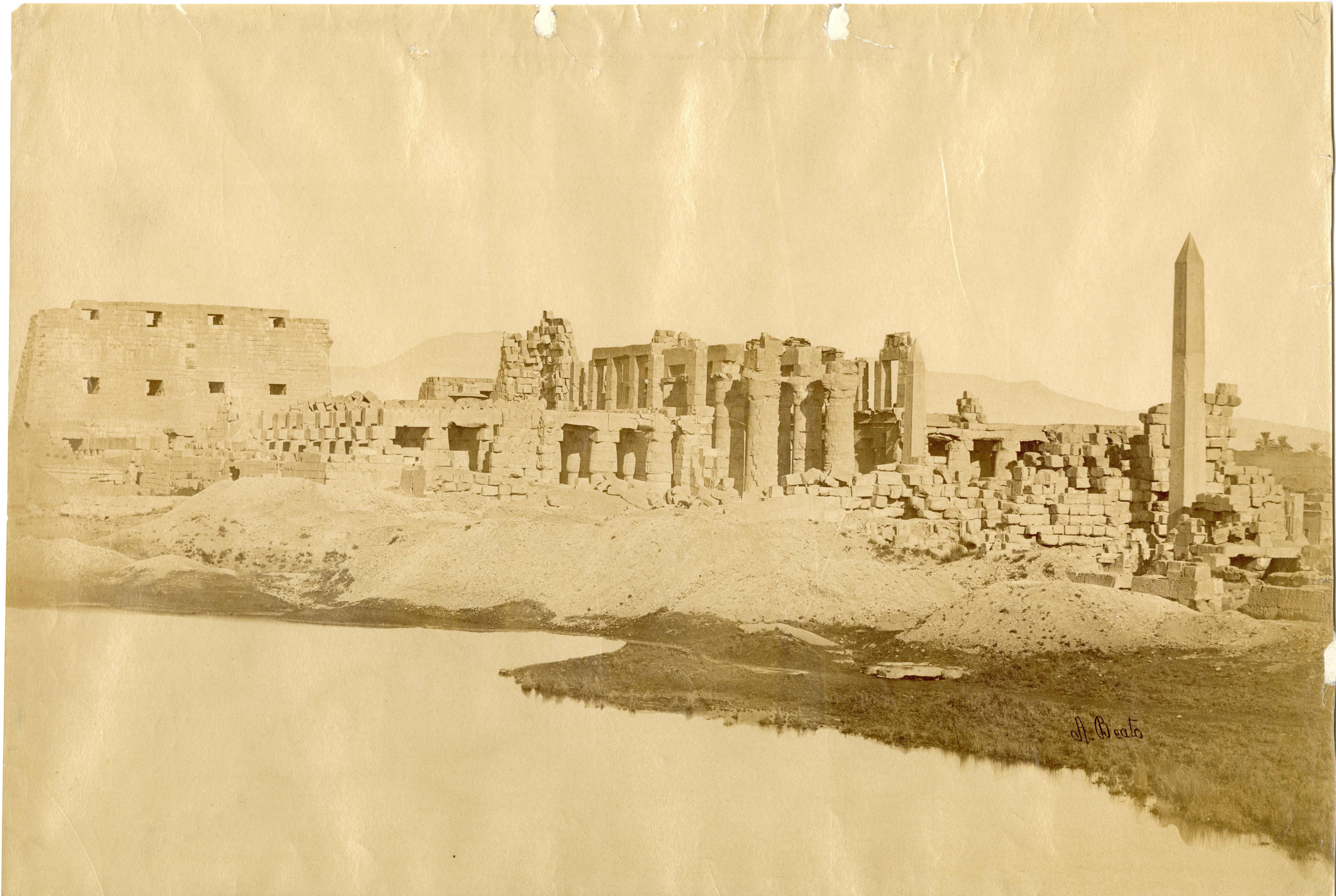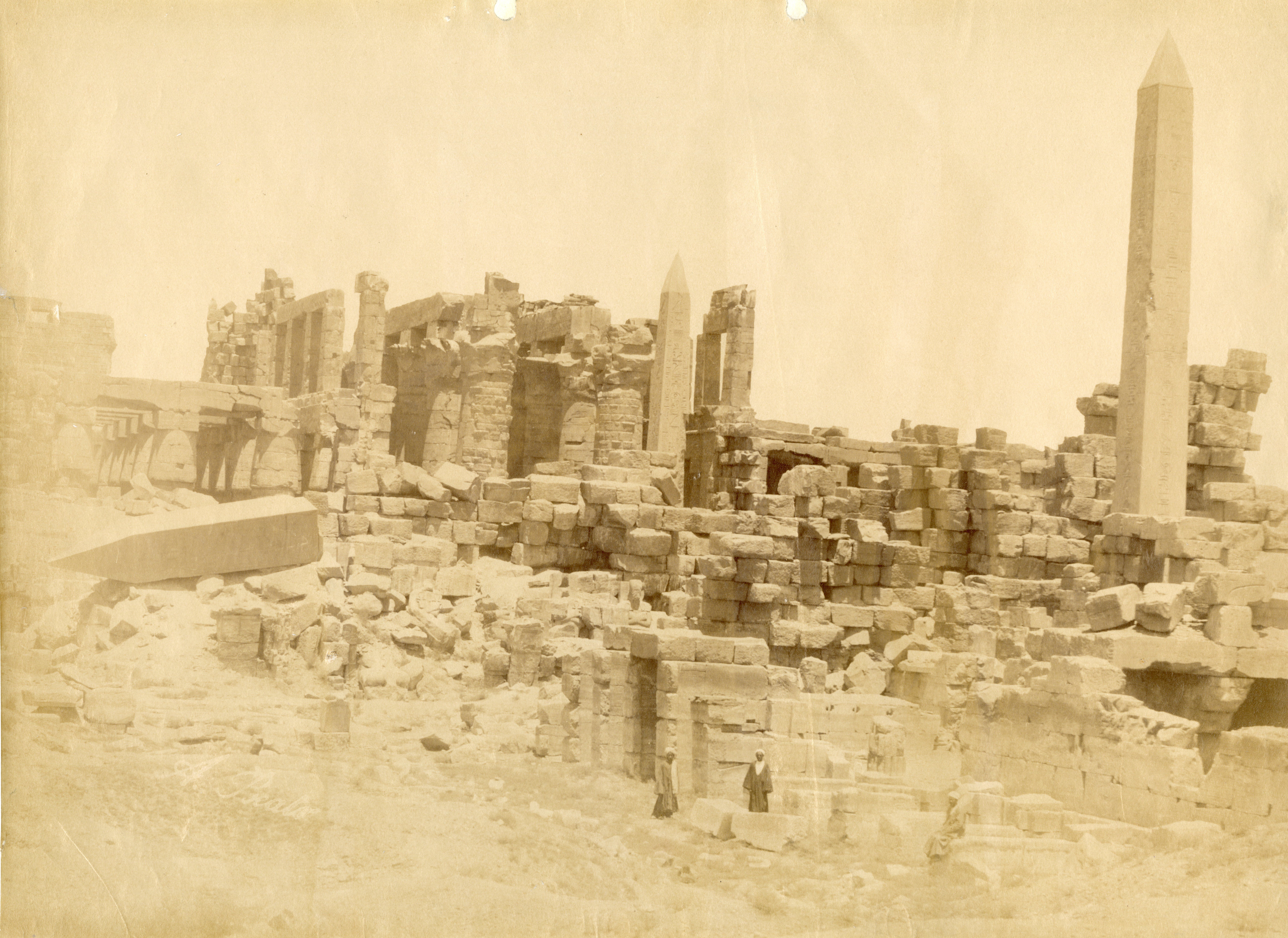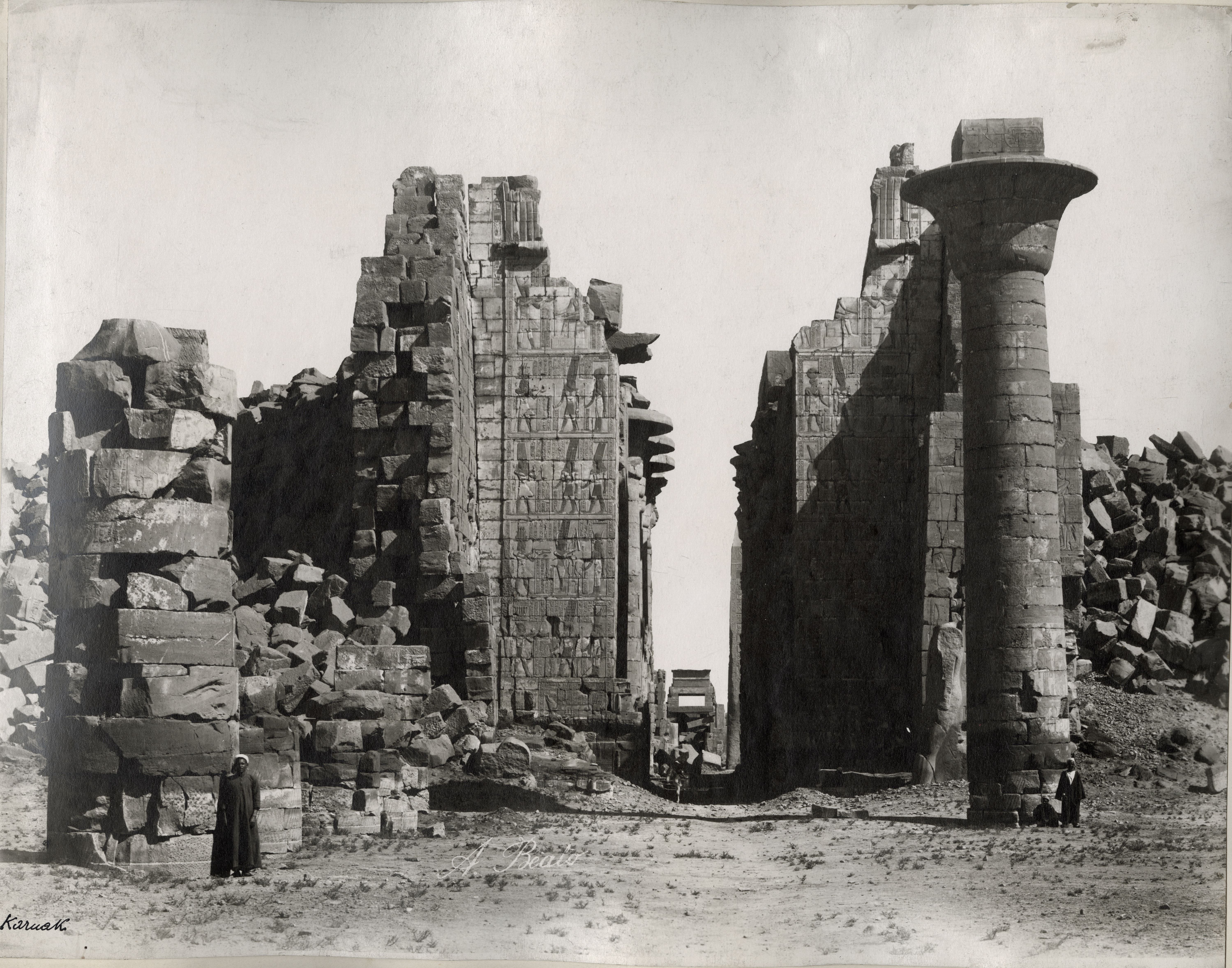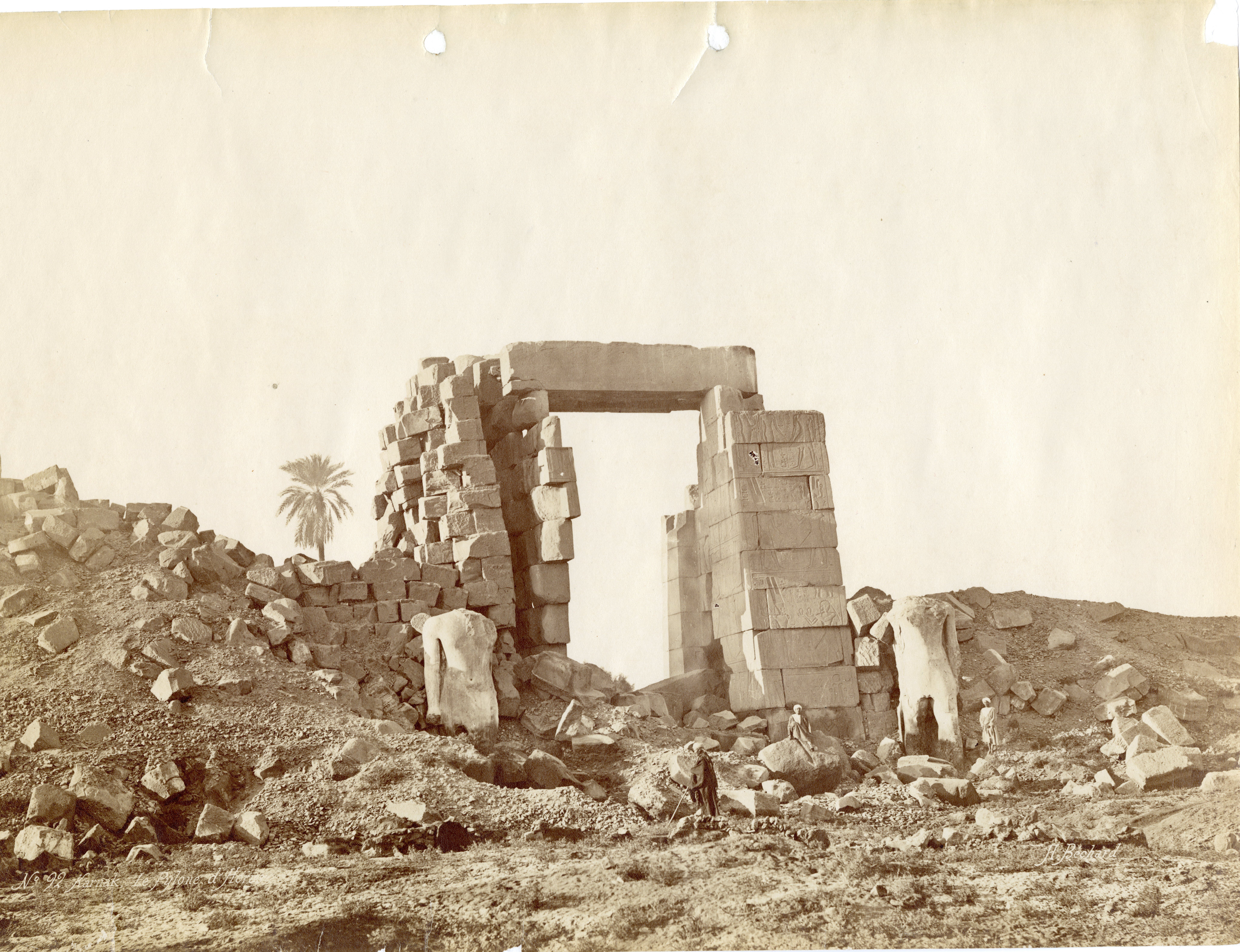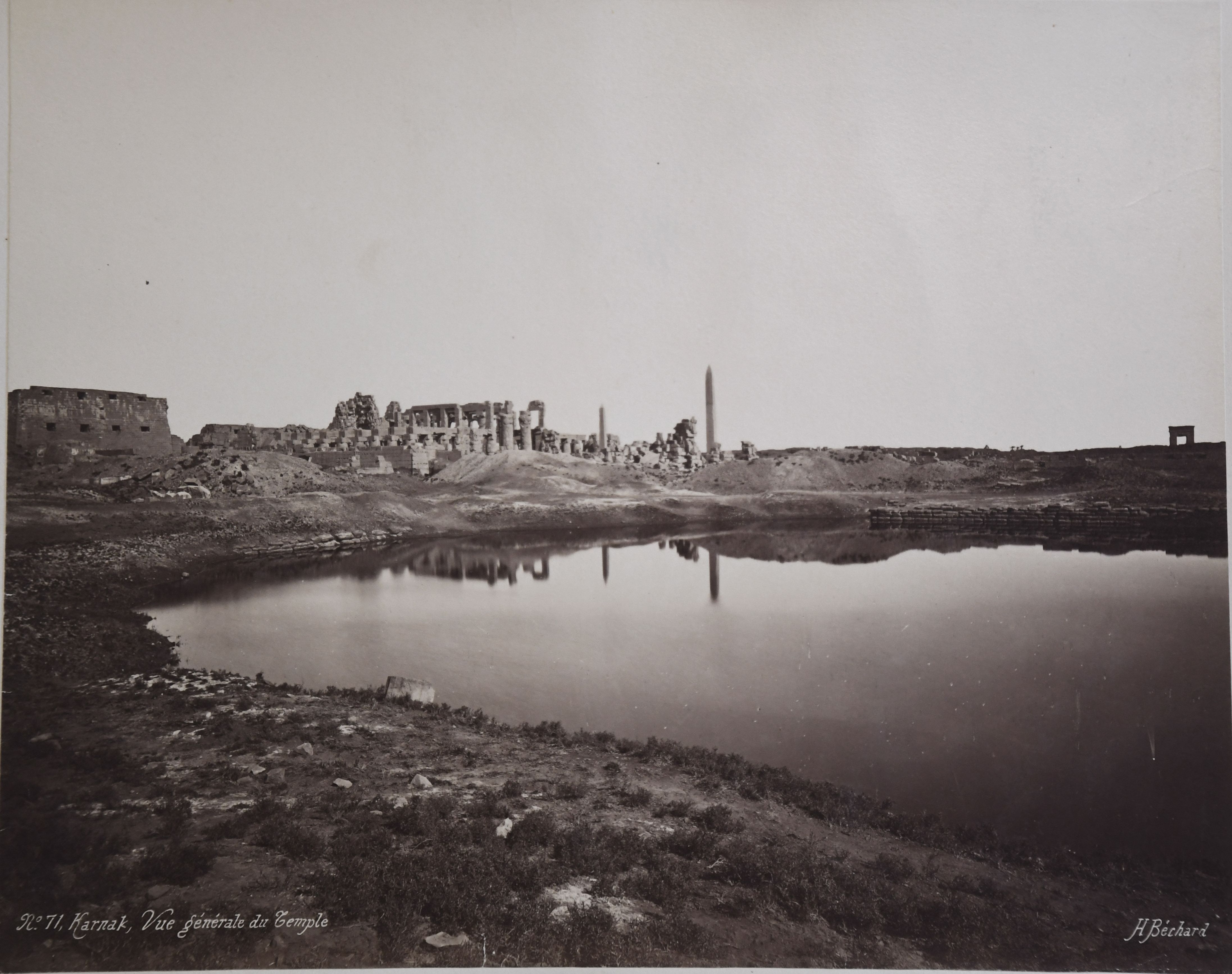 The photograph depicts the ruins of two pylons in the Karnak Temple Complex, seen from the Sacred Lake, specifically the ninth pylon (left, that of Pharaoh Horemheb) and the eighth pylon (right, that of Queen Hatshepsut). In the background, centre, the southern gate commissioned by Ptolemy III Euergetes to access to the Temple of Khonsu, from where the pylon is visible. The perspective however, is distorted but the two monuments are aligned. Three egyptians on the bank of the slightly drained Sacred Lake look towards the camera lens. The author's signature is visible at the bottom left.