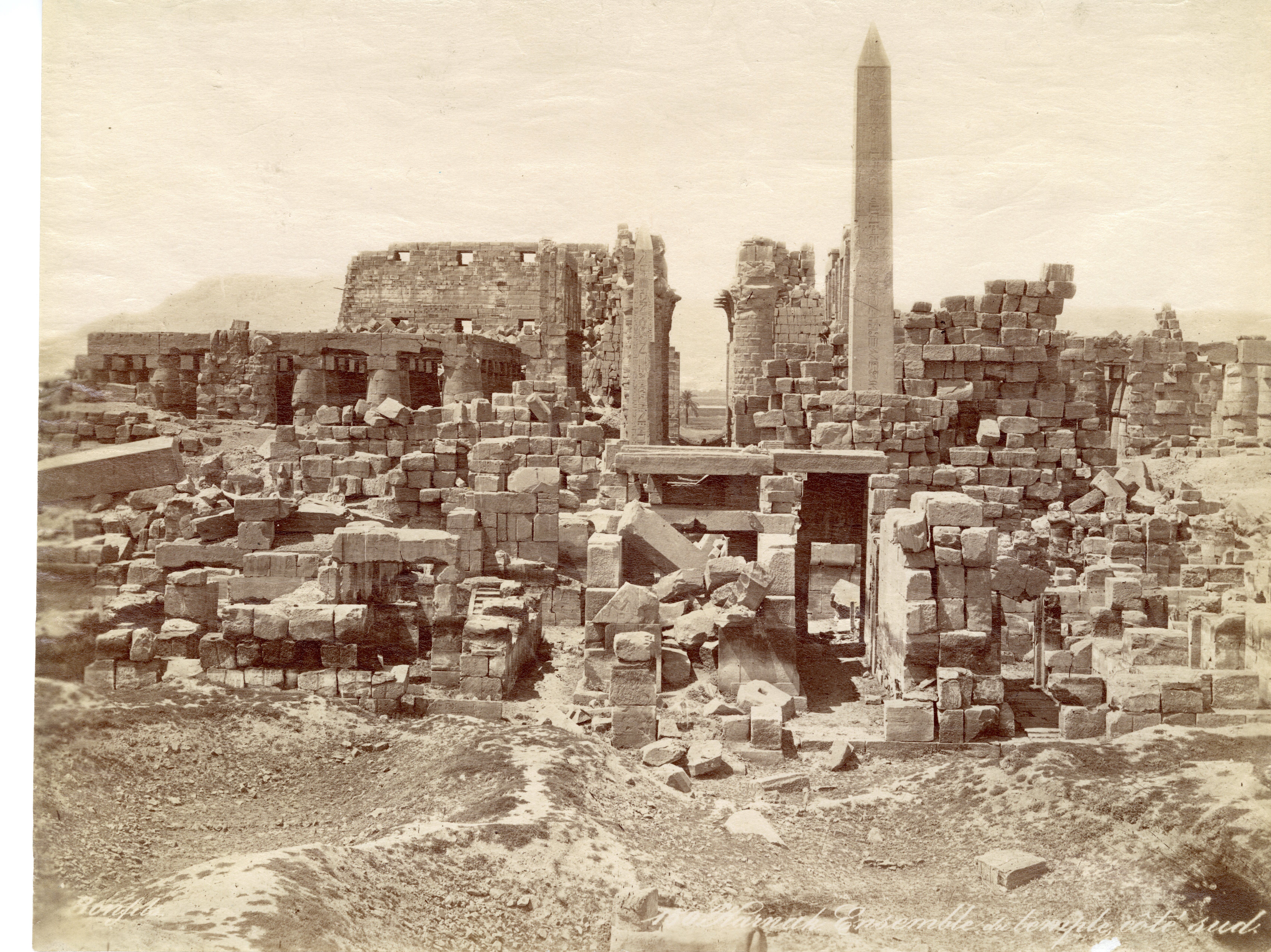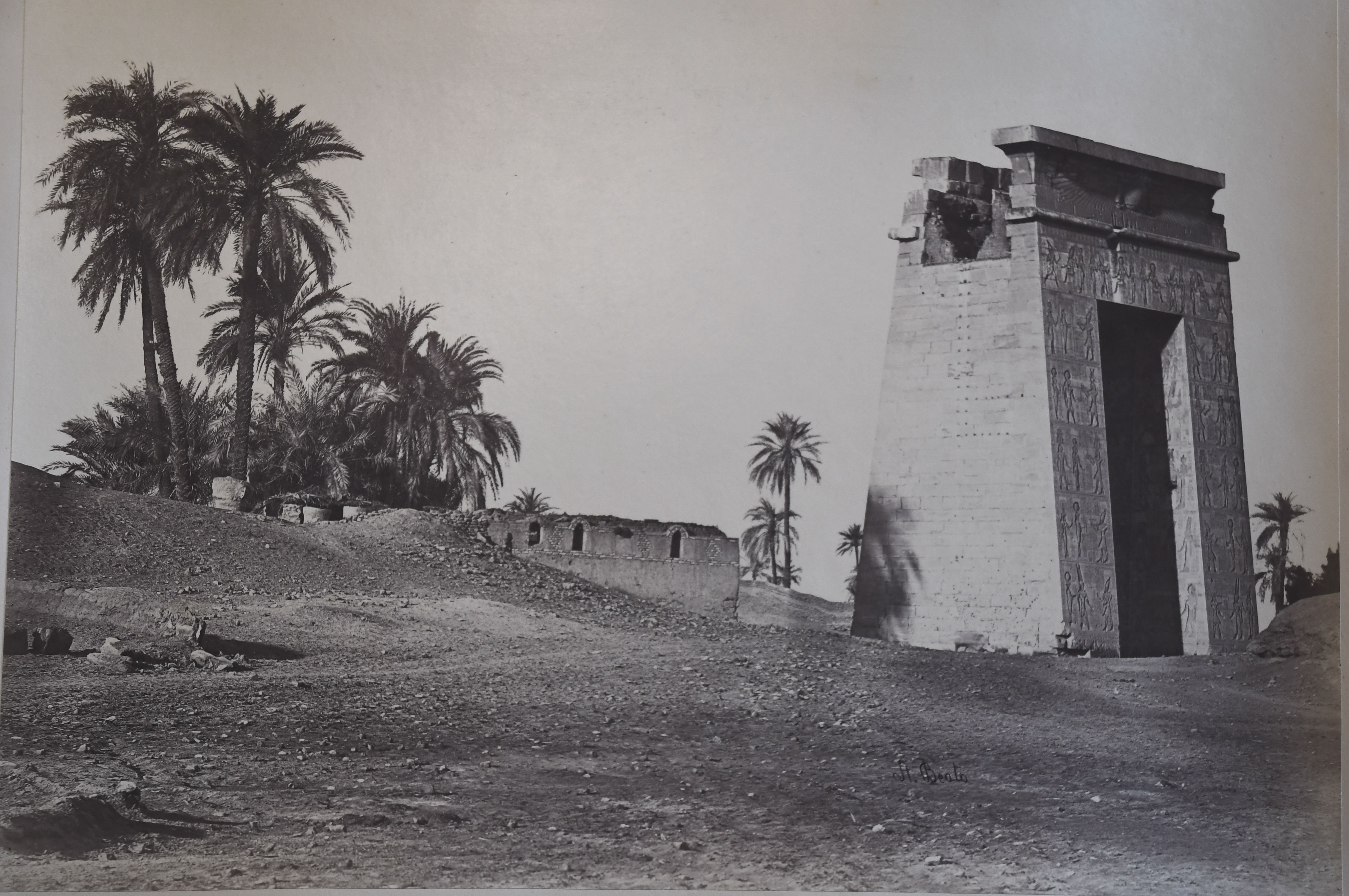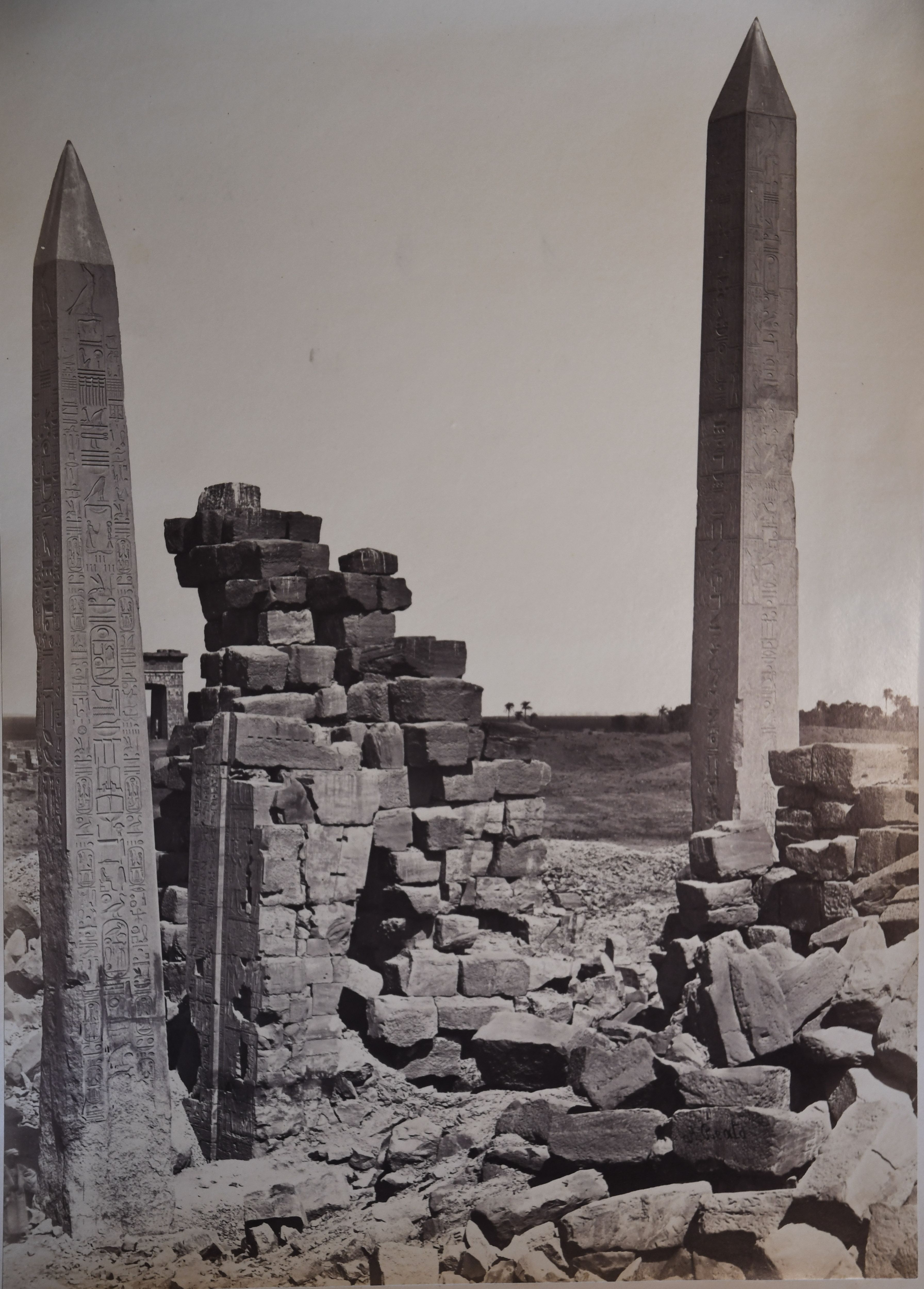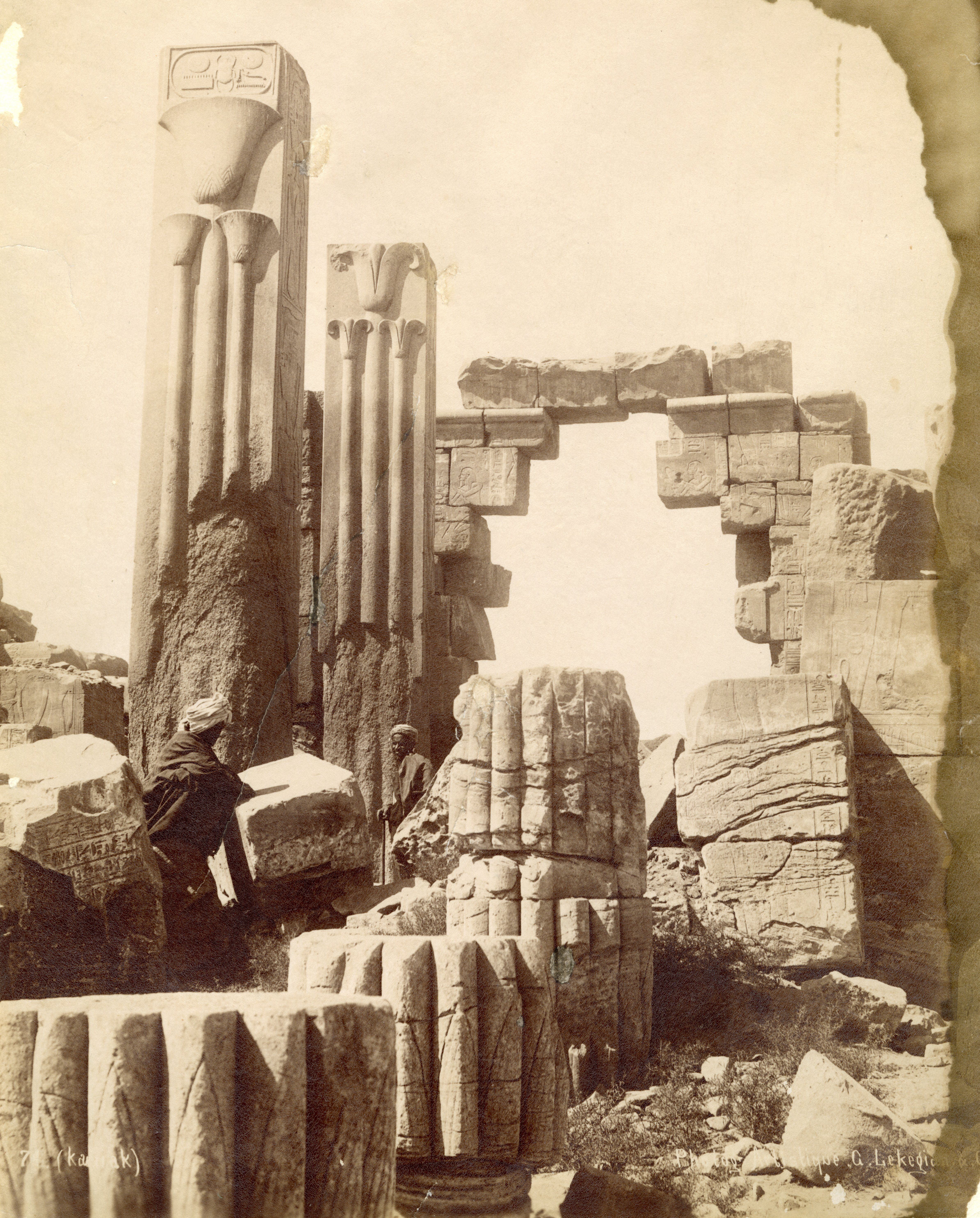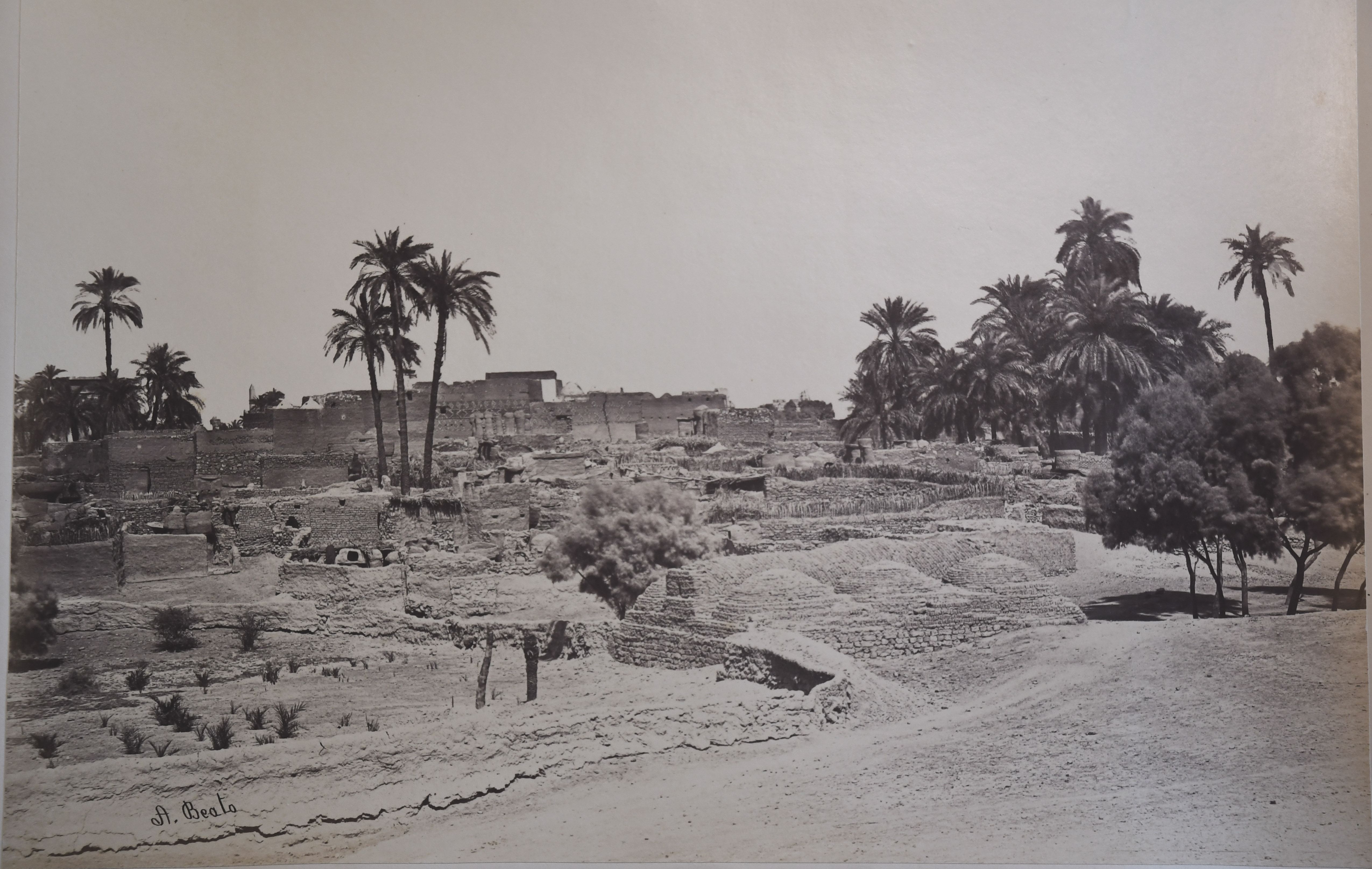 The photograph depicts the ruins of two pylons in the Karnak Temple Complex, seen from the Sacred Lake, specifically the ninth pylon (left, that of Pharaoh Horemheb) and the eighth pylon (right, that of Queen Hatshepsut). In the background, centre, the southern gate commissioned by Ptolemy III Euergetes to access to the Temple of Khonsu, from where the pylon is visible. The perspective however, is distorted but the two monuments are aligned. Three egyptians on the bank of the slightly drained Sacred Lake look towards the camera lens. The author's signature is visible at the bottom left.
