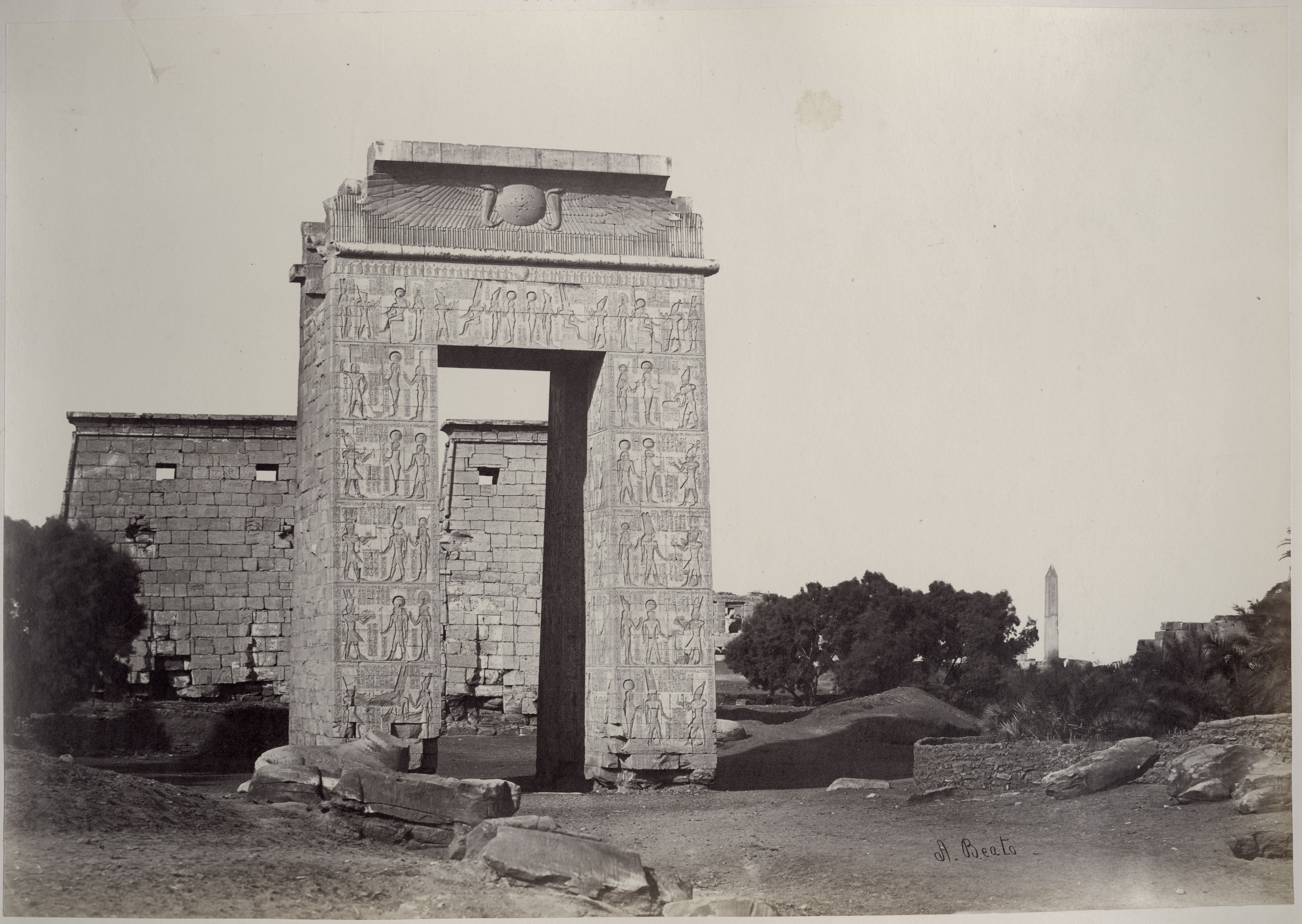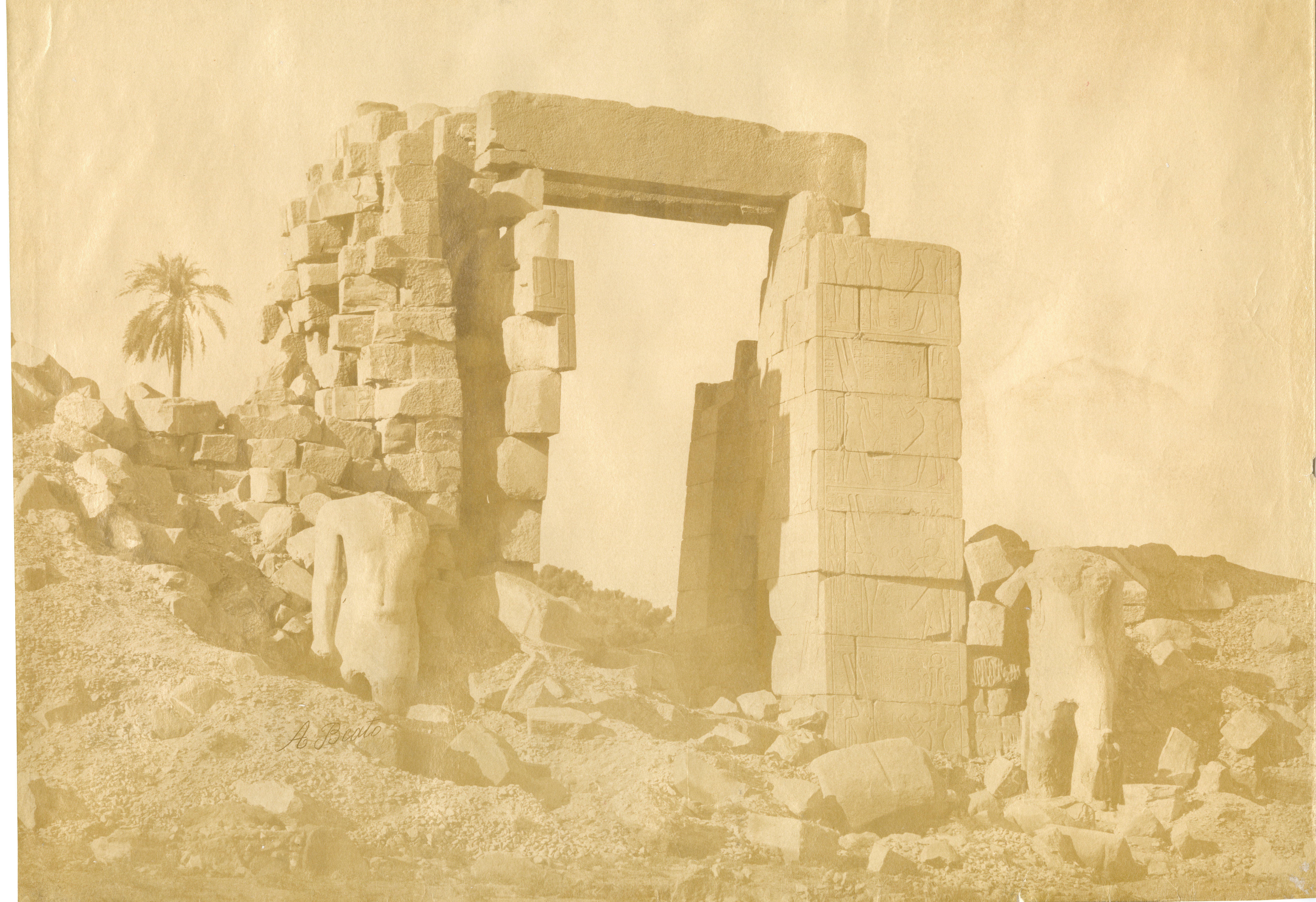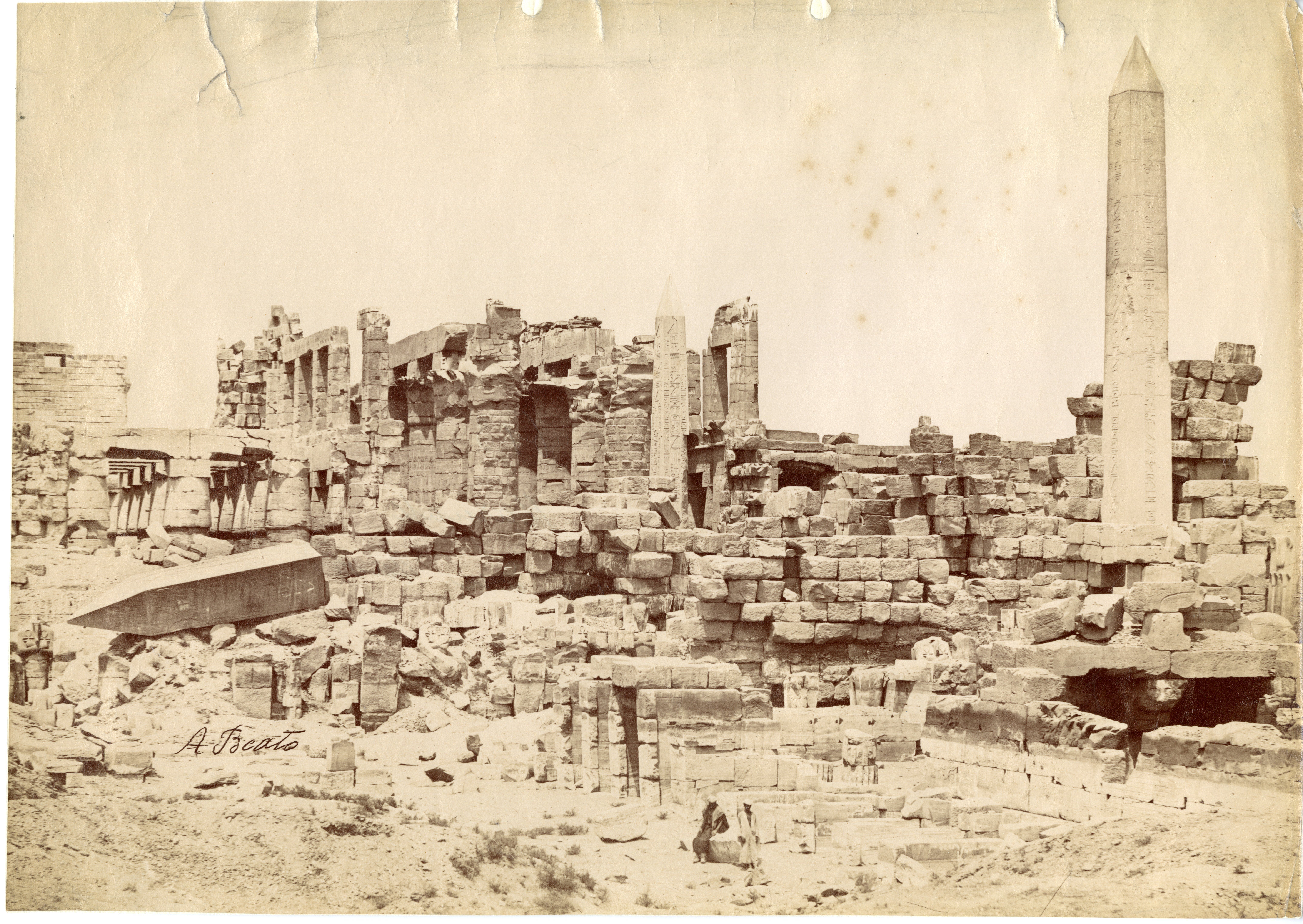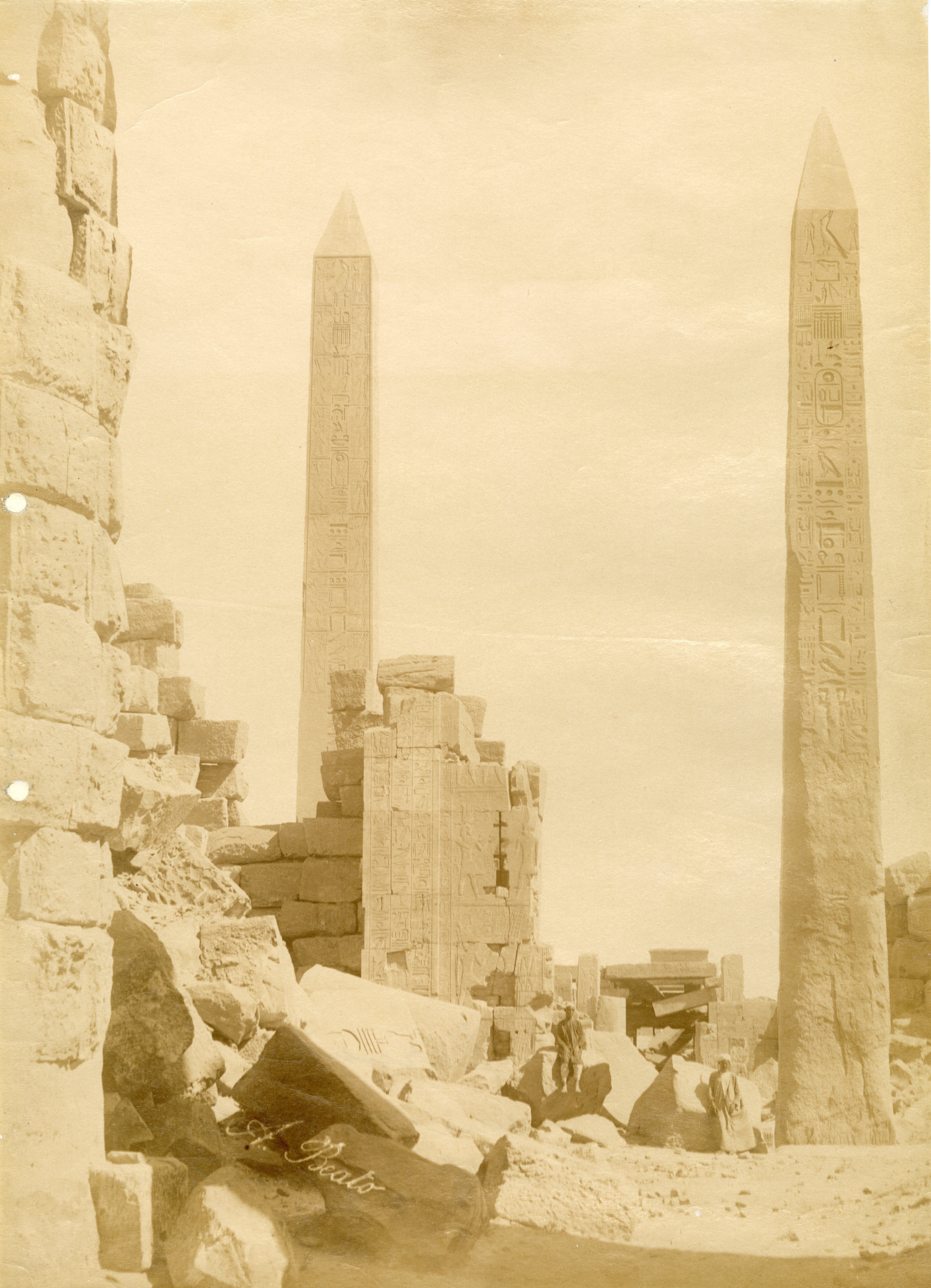 The photograph depicts the ruins of two pylons in the Karnak Temple Complex, seen from the Sacred Lake, specifically the ninth pylon (left, that of Pharaoh Horemheb) and the eighth pylon (right, that of Queen Hatshepsut). In the background, centre, the southern gate commissioned by Ptolemy III Euergetes to access to the Temple of Khonsu, from where the pylon is visible. The perspective however, is distorted but the two monuments are aligned. Three egyptians on the bank of the slightly drained Sacred Lake look towards the camera lens. The author's signature is visible at the bottom left.