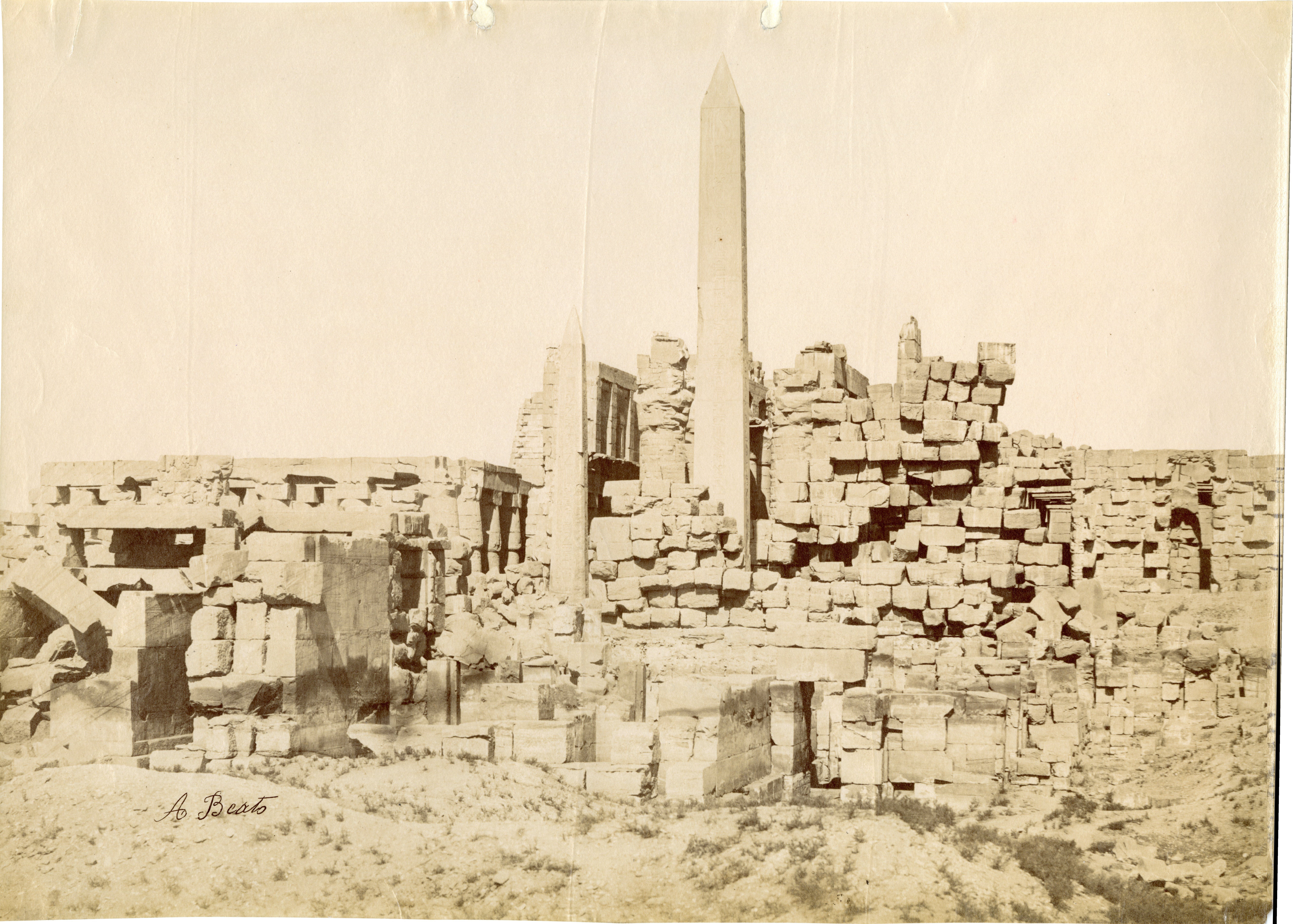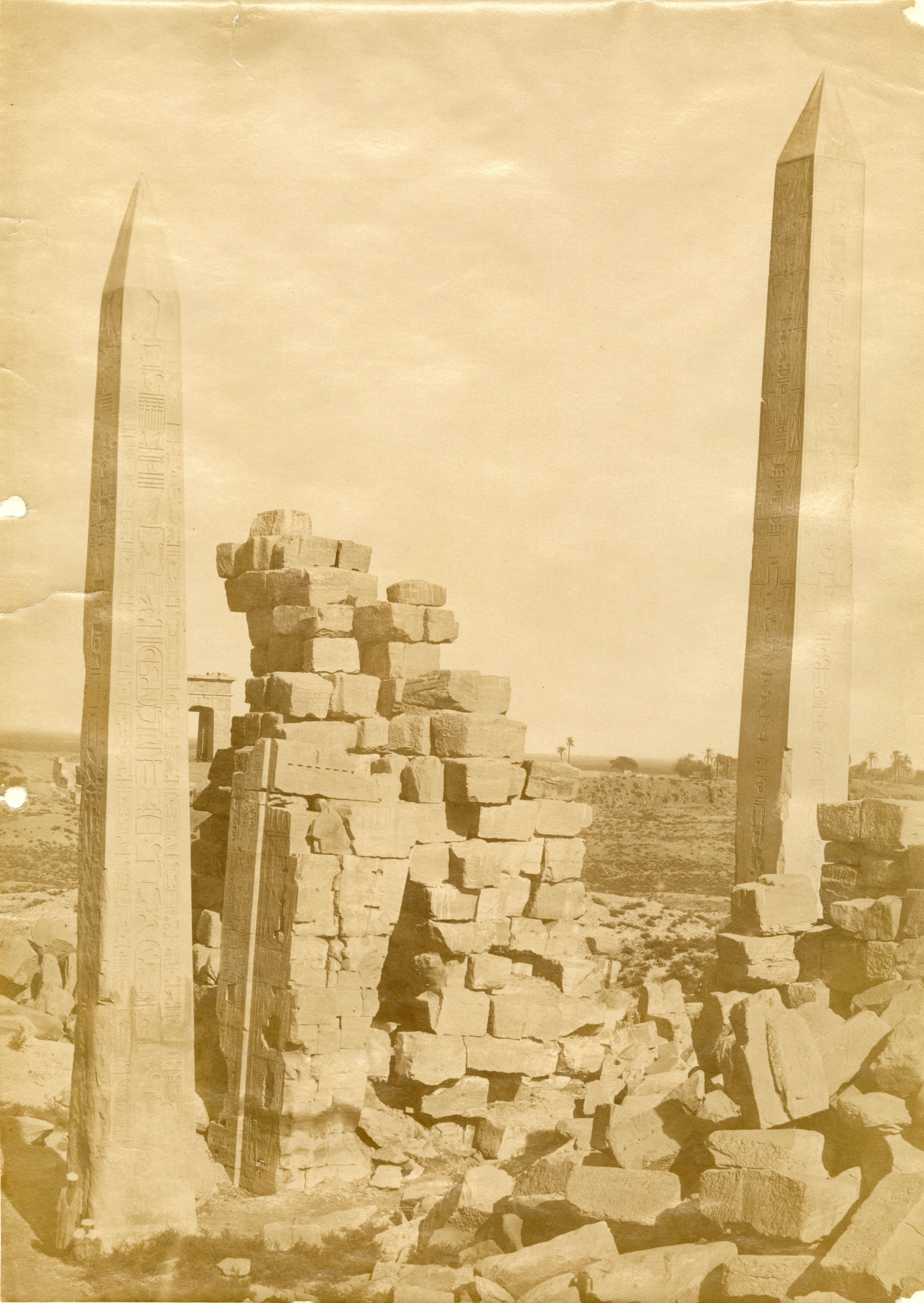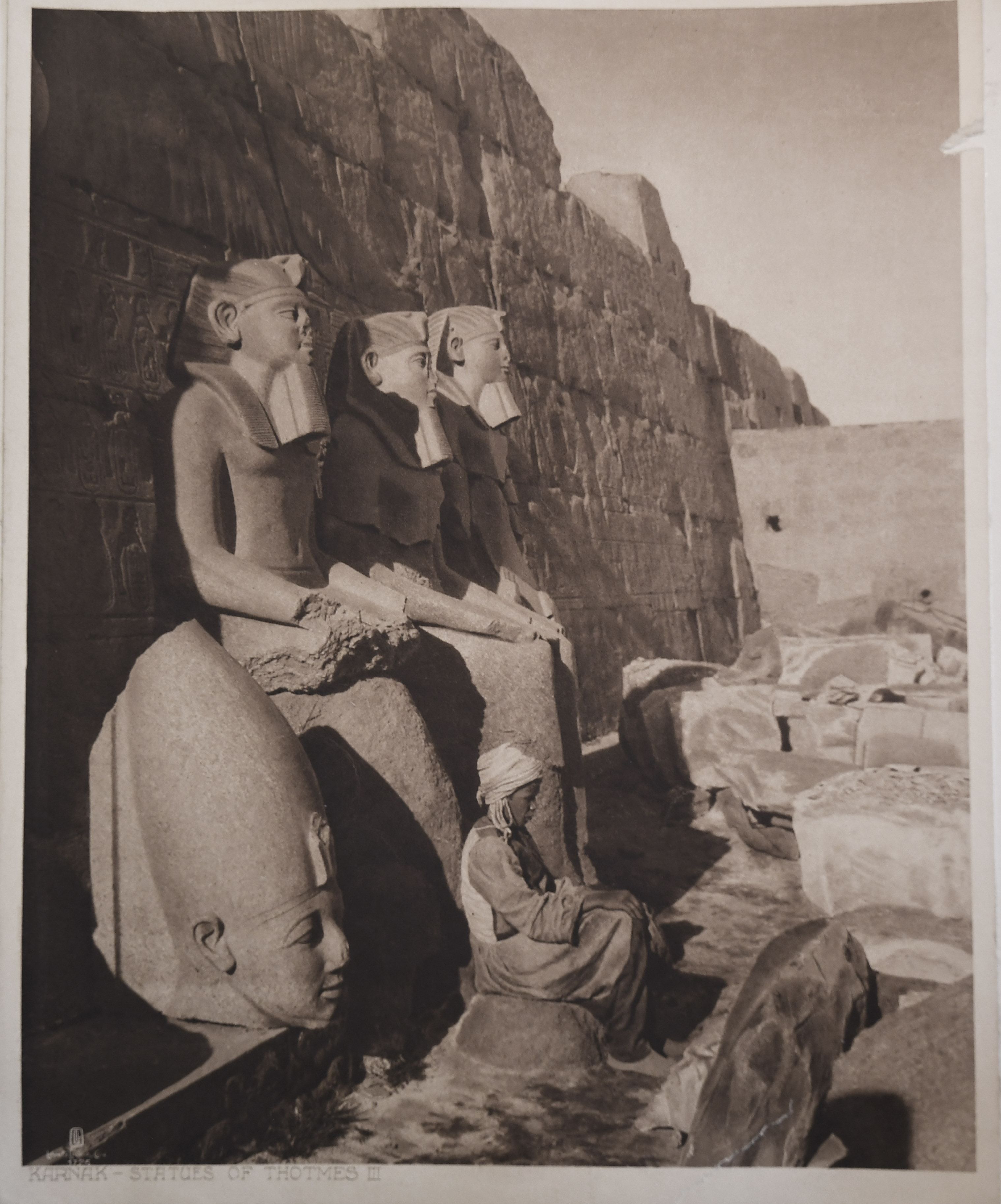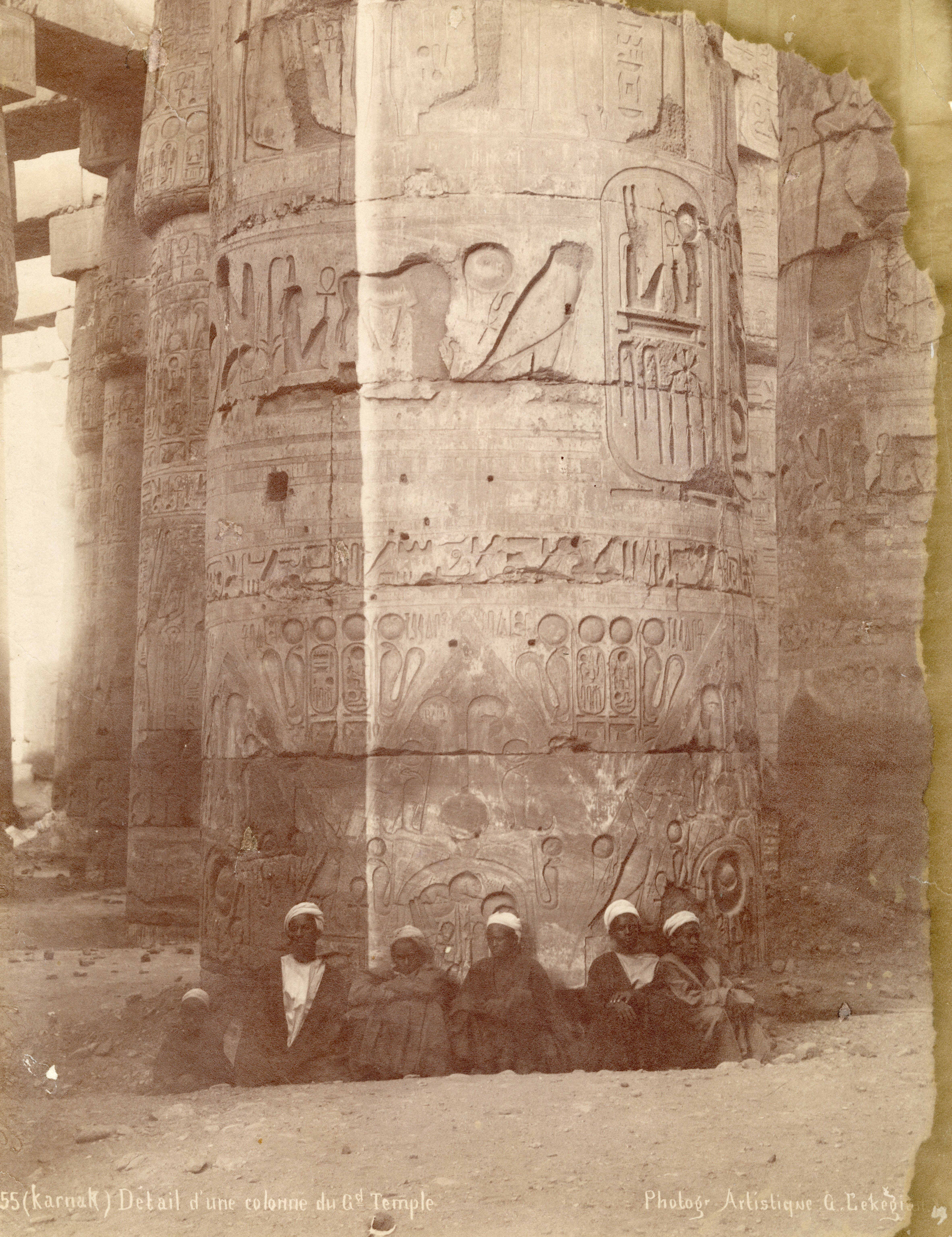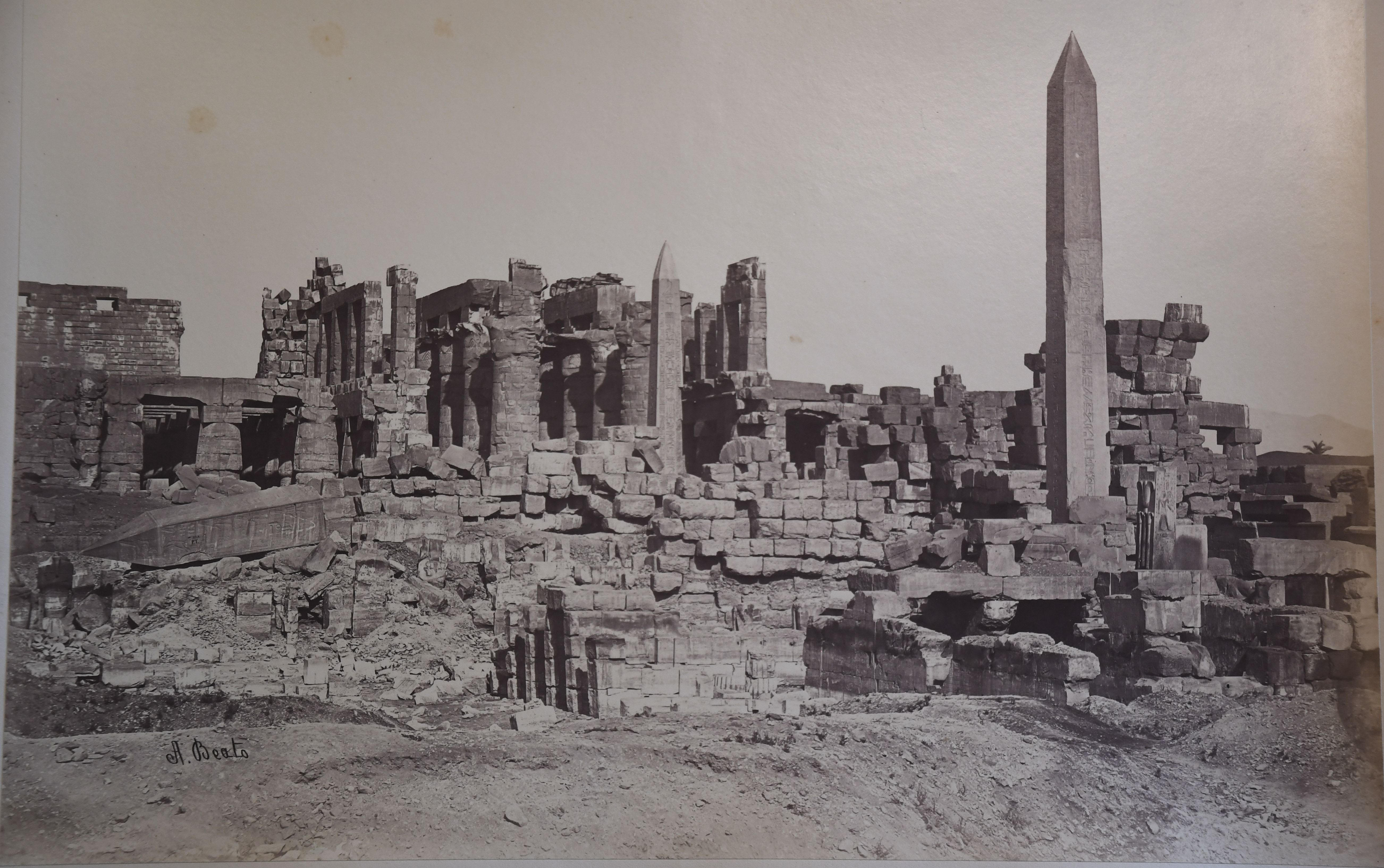 The photograph depicts the ruins of two pylons in the Karnak Temple Complex, seen from the Sacred Lake, specifically the ninth pylon (left, that of Pharaoh Horemheb) and the eighth pylon (right, that of Queen Hatshepsut). In the background, centre, the southern gate commissioned by Ptolemy III Euergetes to access to the Temple of Khonsu, from where the pylon is visible. The perspective however, is distorted but the two monuments are aligned. Three egyptians on the bank of the slightly drained Sacred Lake look towards the camera lens. The author's signature is visible at the bottom left.