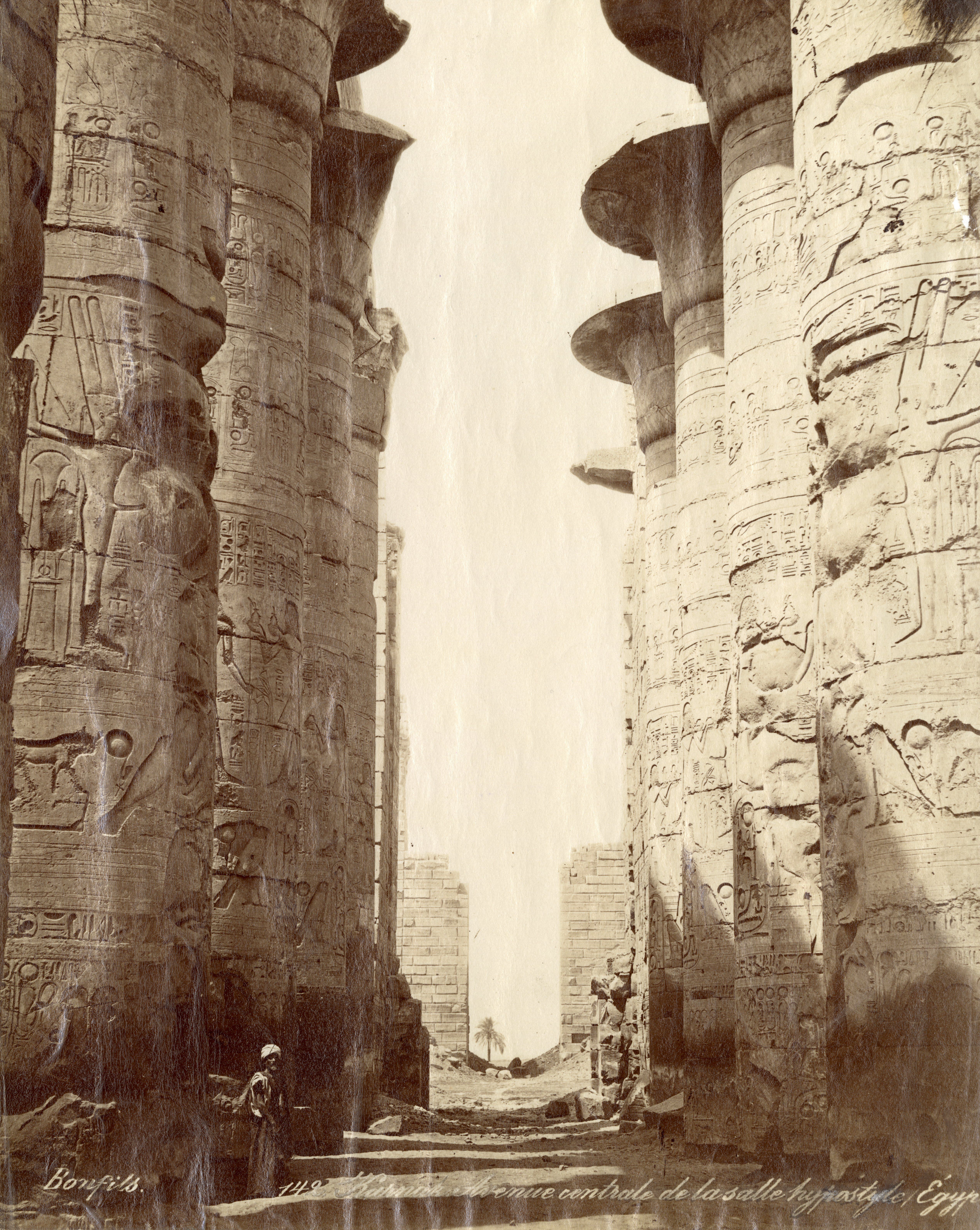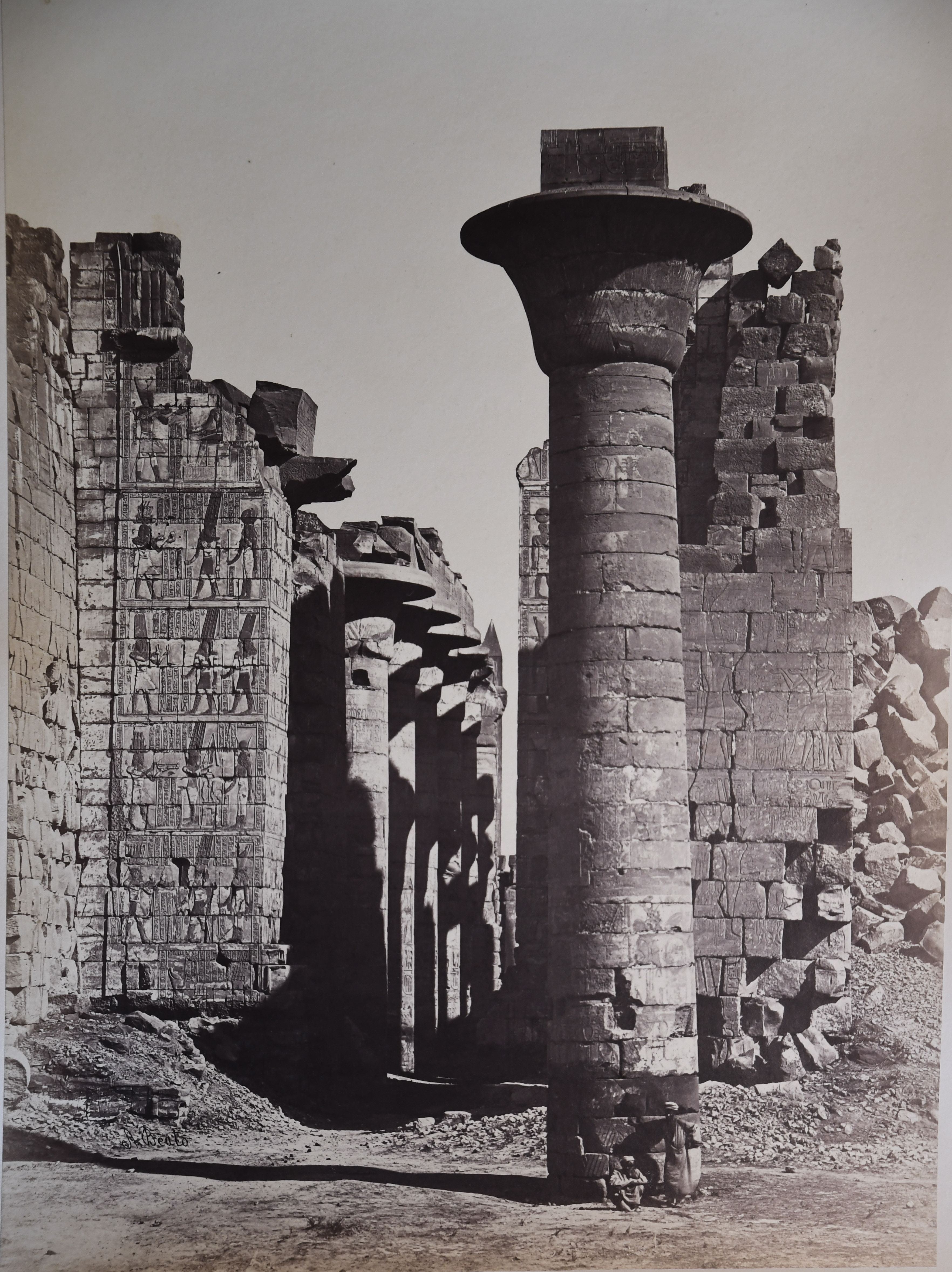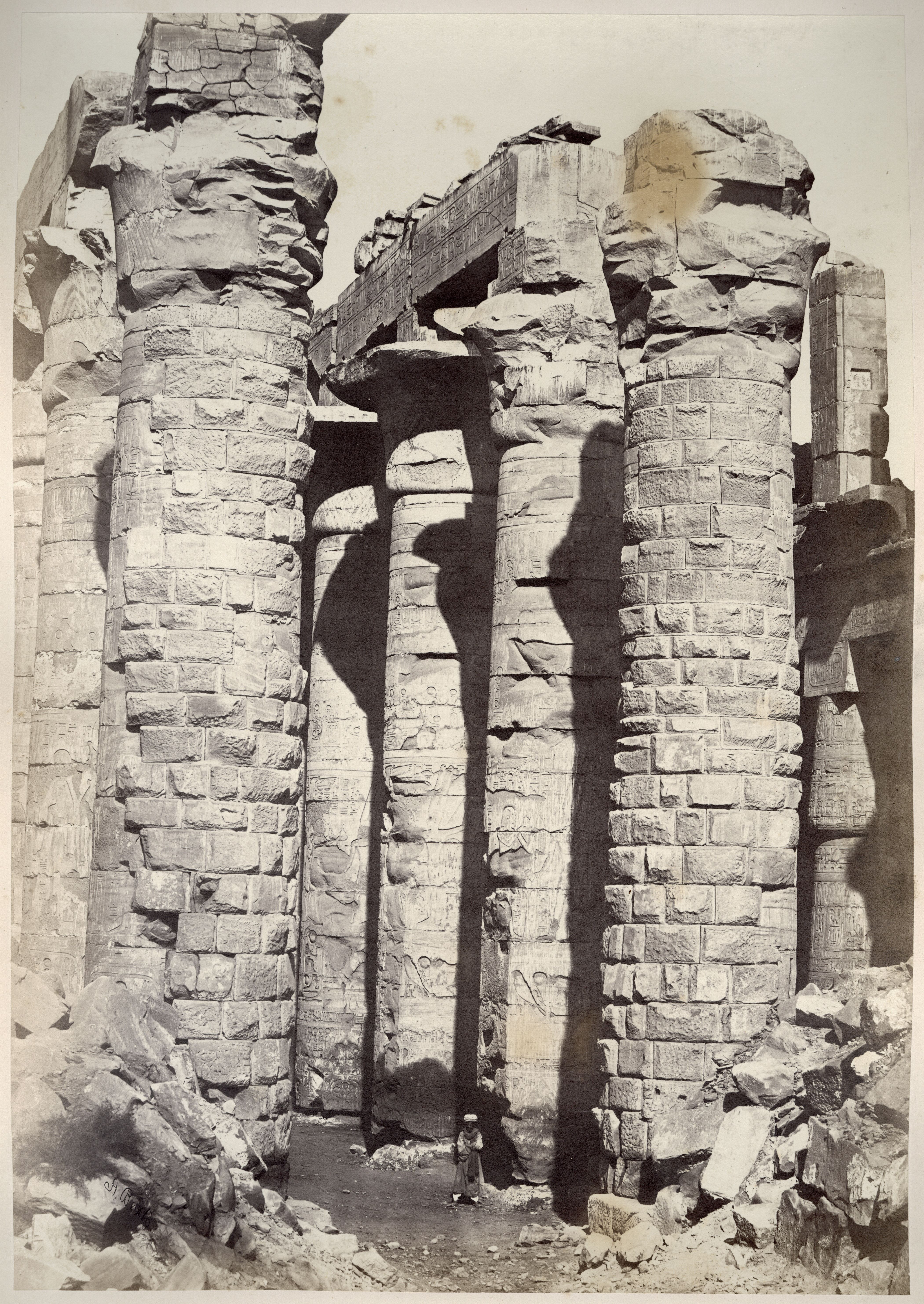 View of the colonnade of the Great Hypostyle Hall of the Karnak Temple Complex, where a local inhabitant poses in its shadow. Note that the ground level still covers the columns’ bases. The author's signature can be found at the bottom centre.