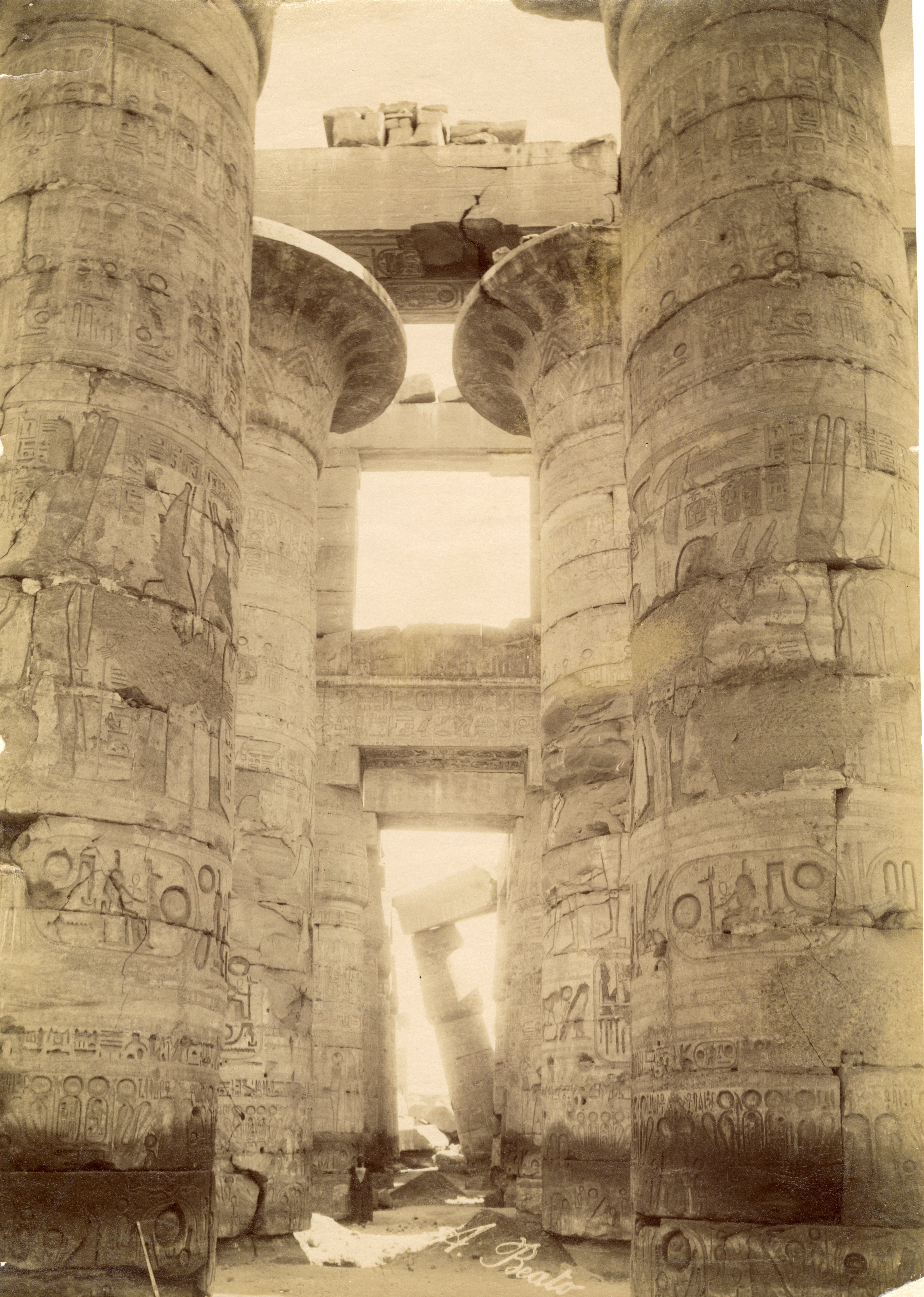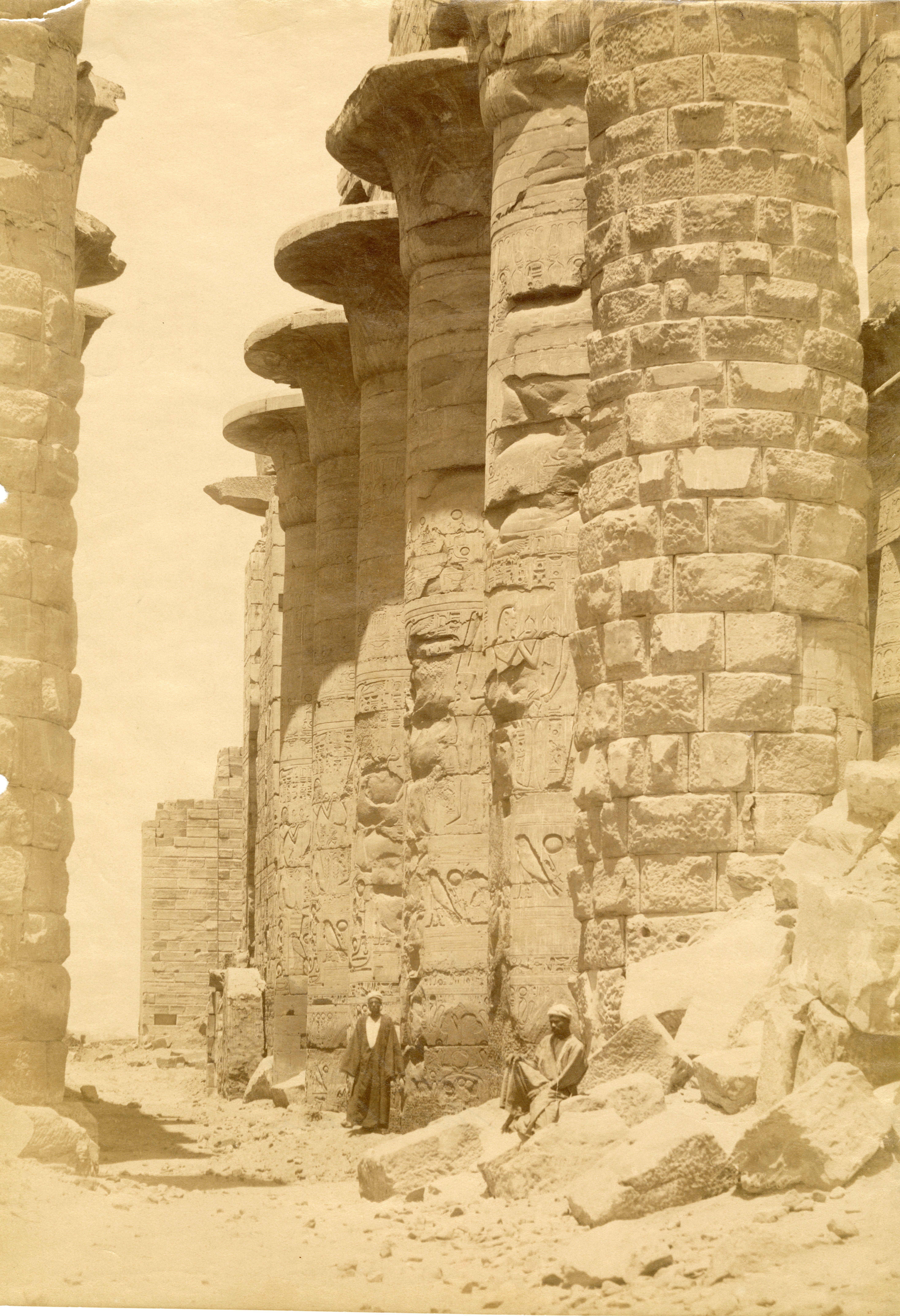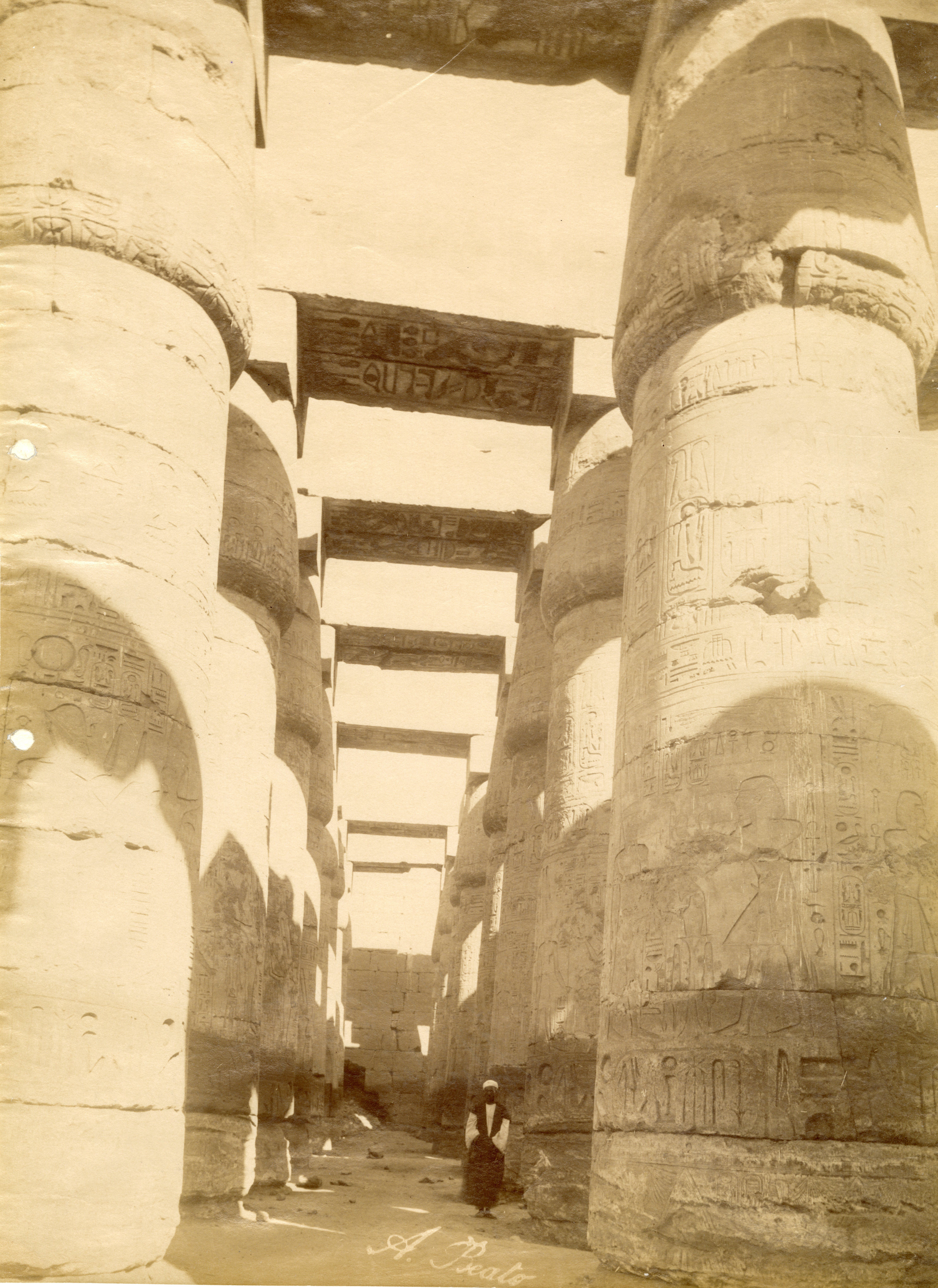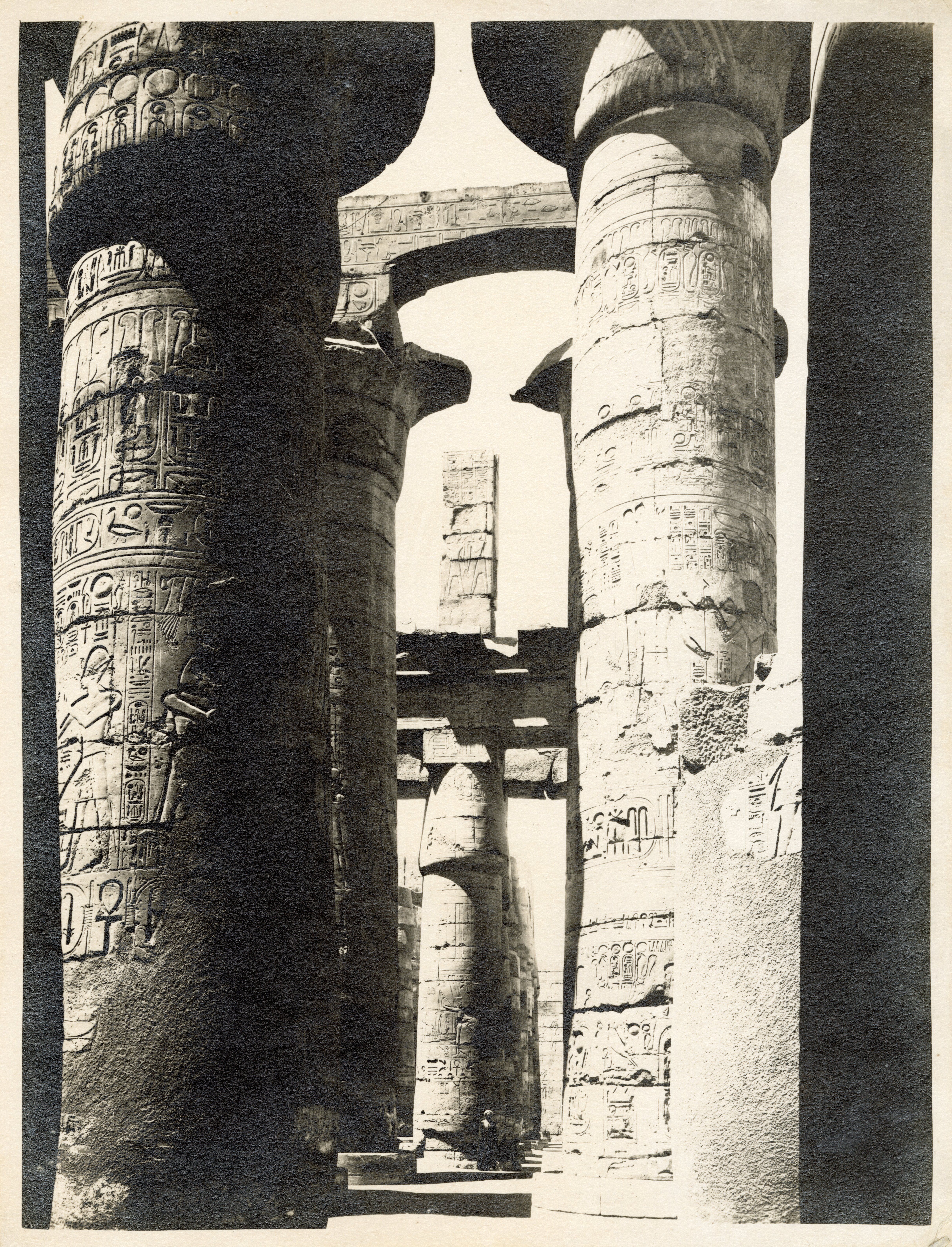 View of the colonnade of the Great Hypostyle Hall of the Karnak Temple Complex, where a local inhabitant poses in its shadow. Note that the ground level still covers the columns’ bases. The author's signature can be found at the bottom centre.