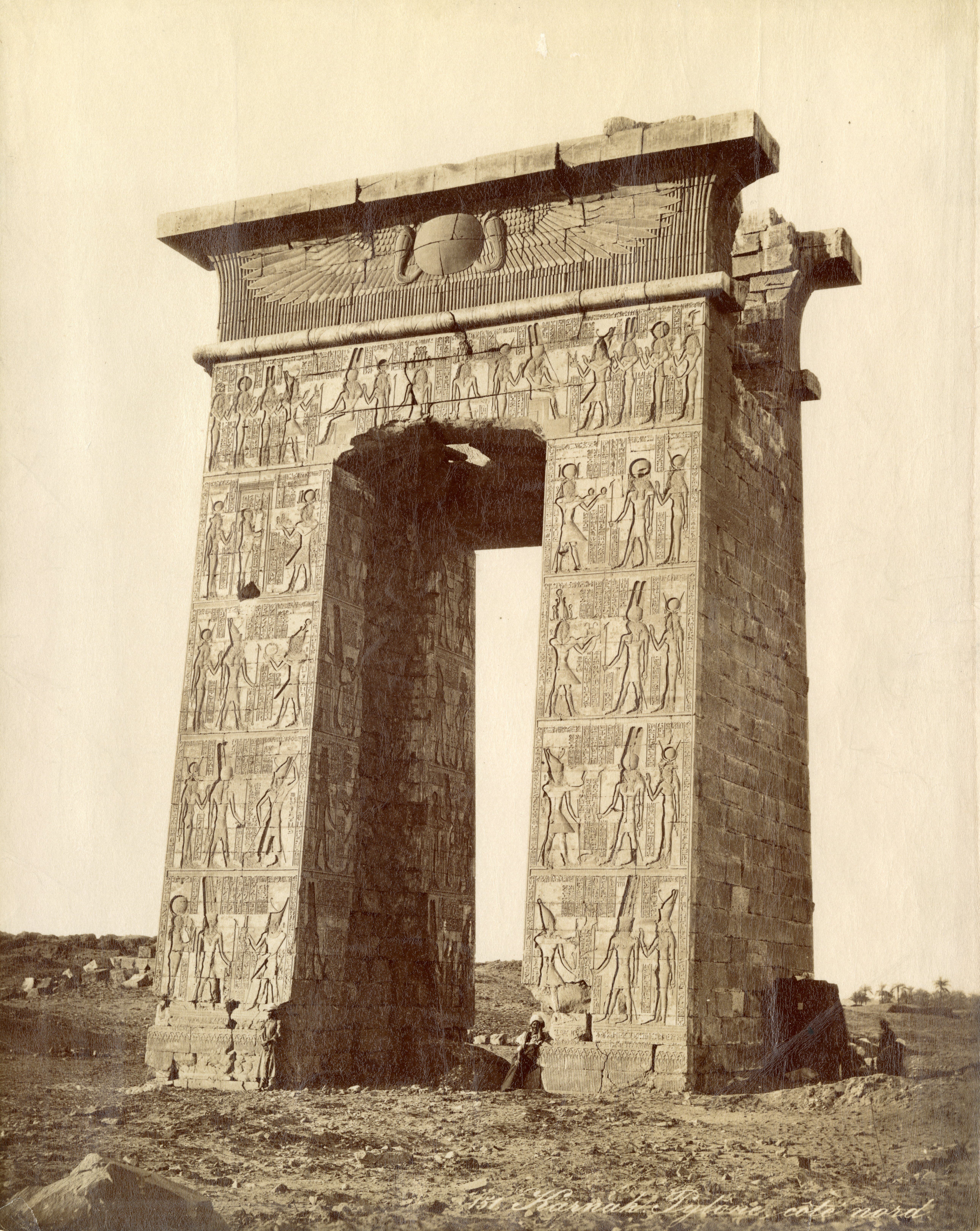 The photograph shows the entrance gate, on the southern side, built by Ptolemy III Euergetes in the Karnak Temple Complex. Some egyptians are photographed next to the darkroom, the black curtain visible next to the gate was perhaps used for developing film. Based on the style of the handwriting, the work can be attributed to F. Bonfils.