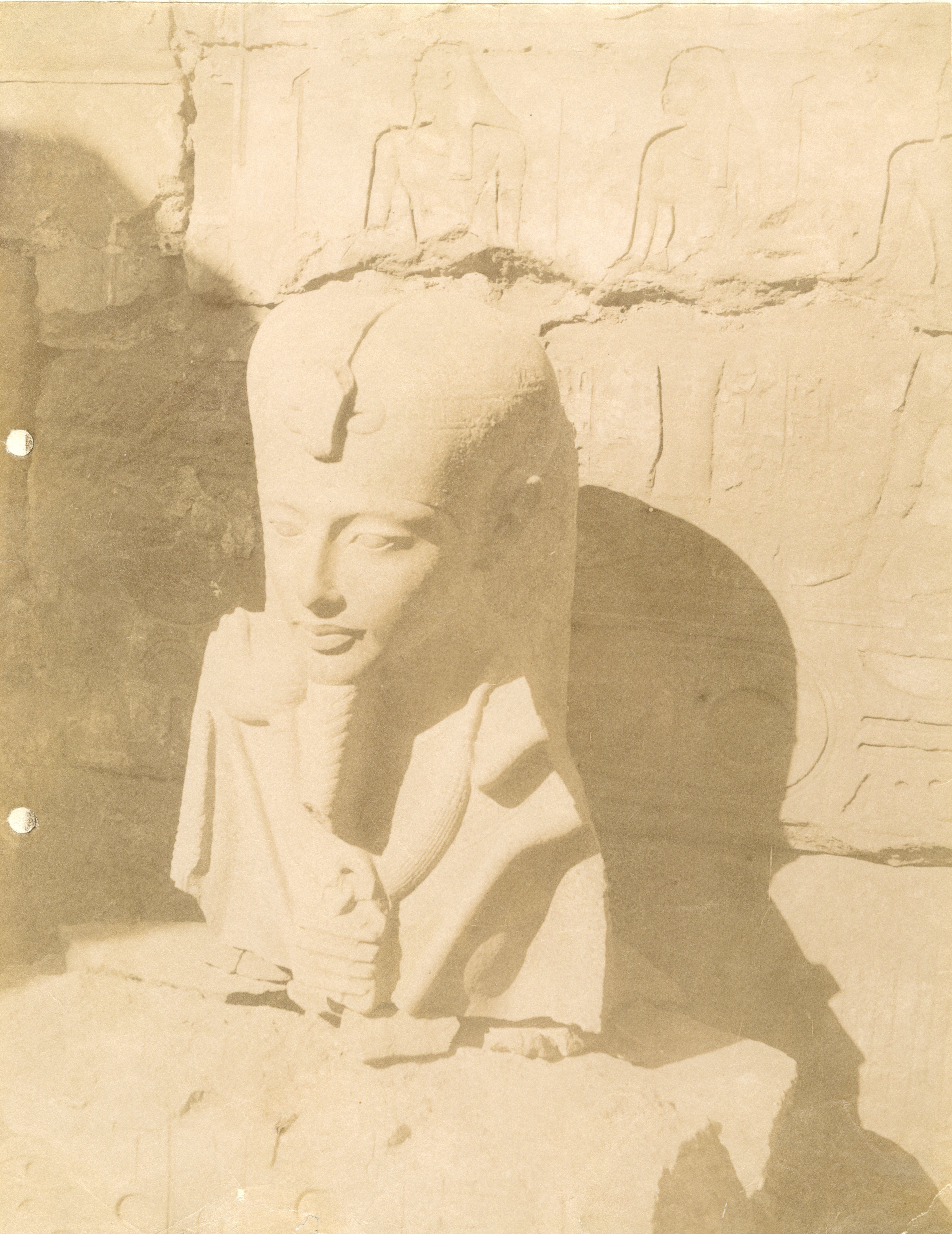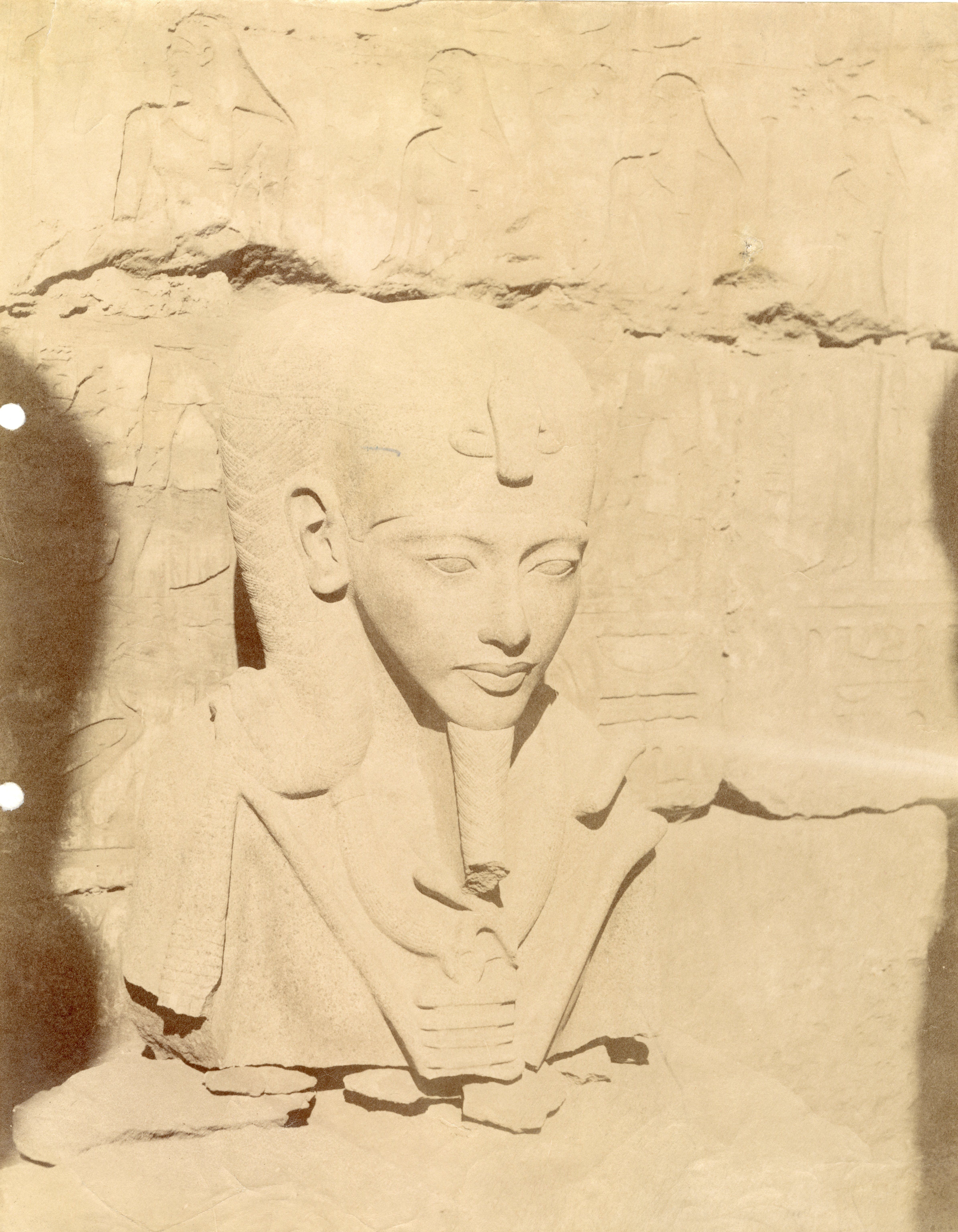 The photograph shows the fragmentary bust of a statue of the god Khonsu depicted in the likeness of Tutankhamun, found in the Karnak Temple Complex. Thanks to the discovery of additional fragments in the 1904 Legrain excavations, the sculpture was later re-assembled and is now in the Egyptian Museum in Cairo (Cairo CG 39488).