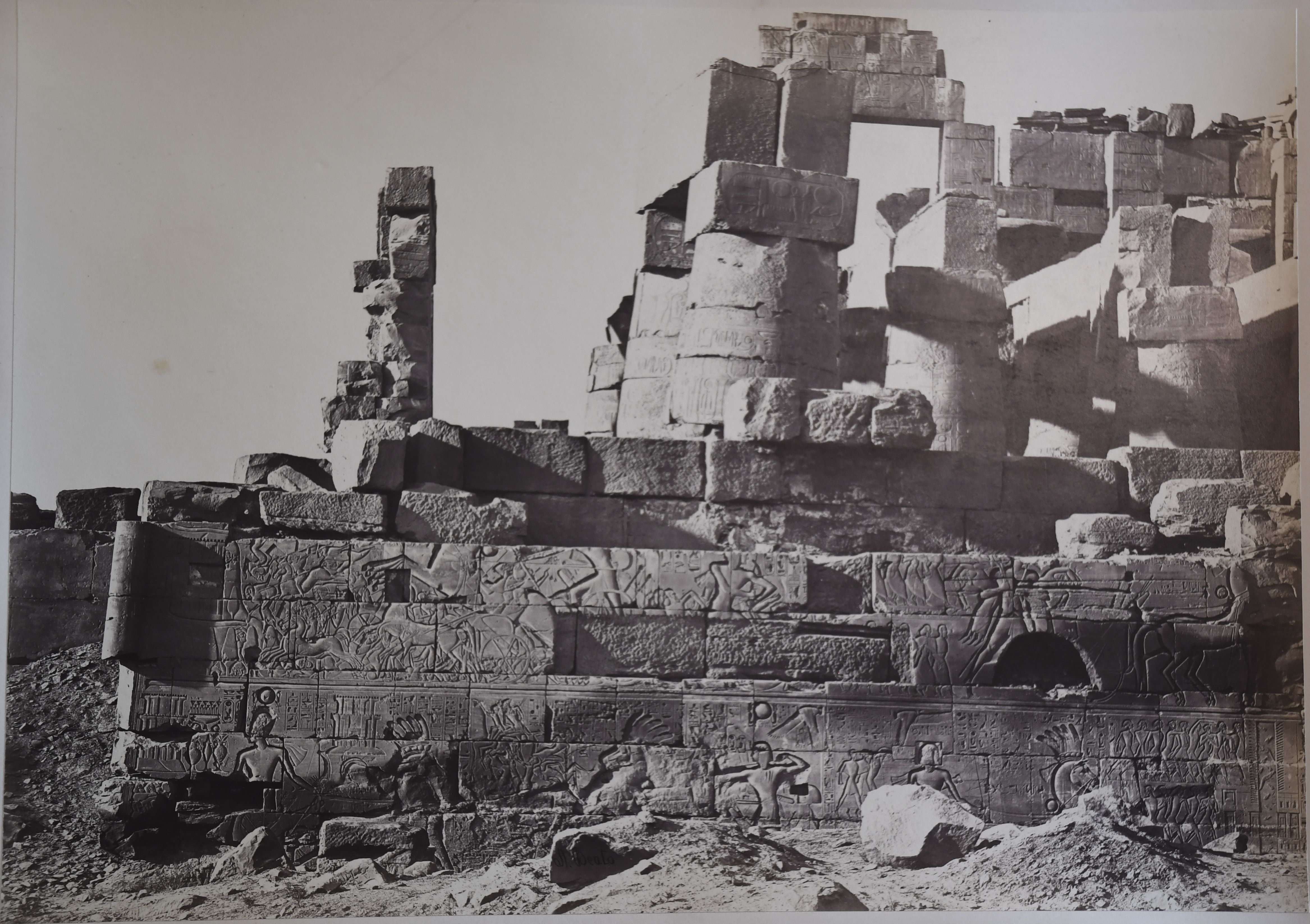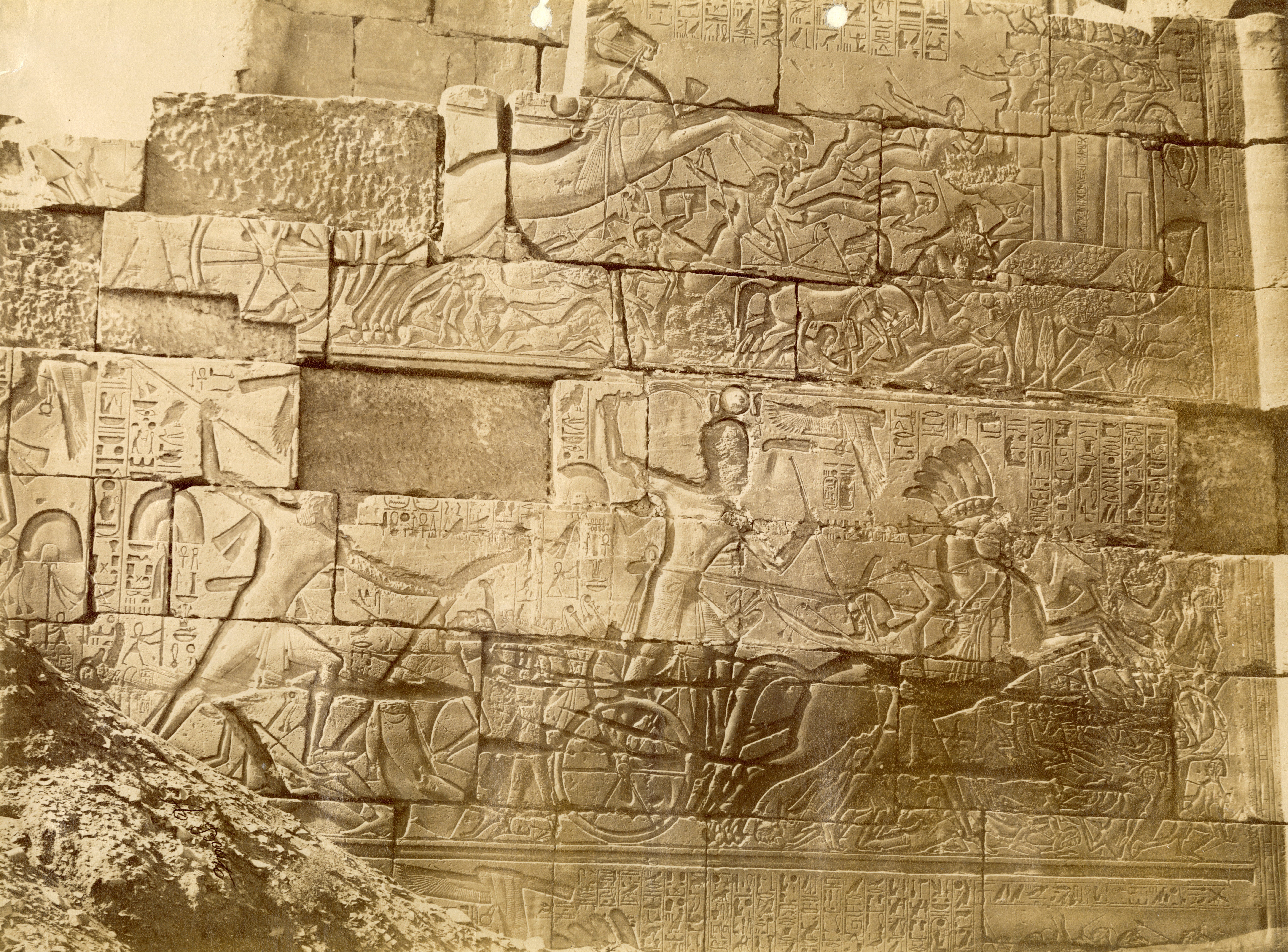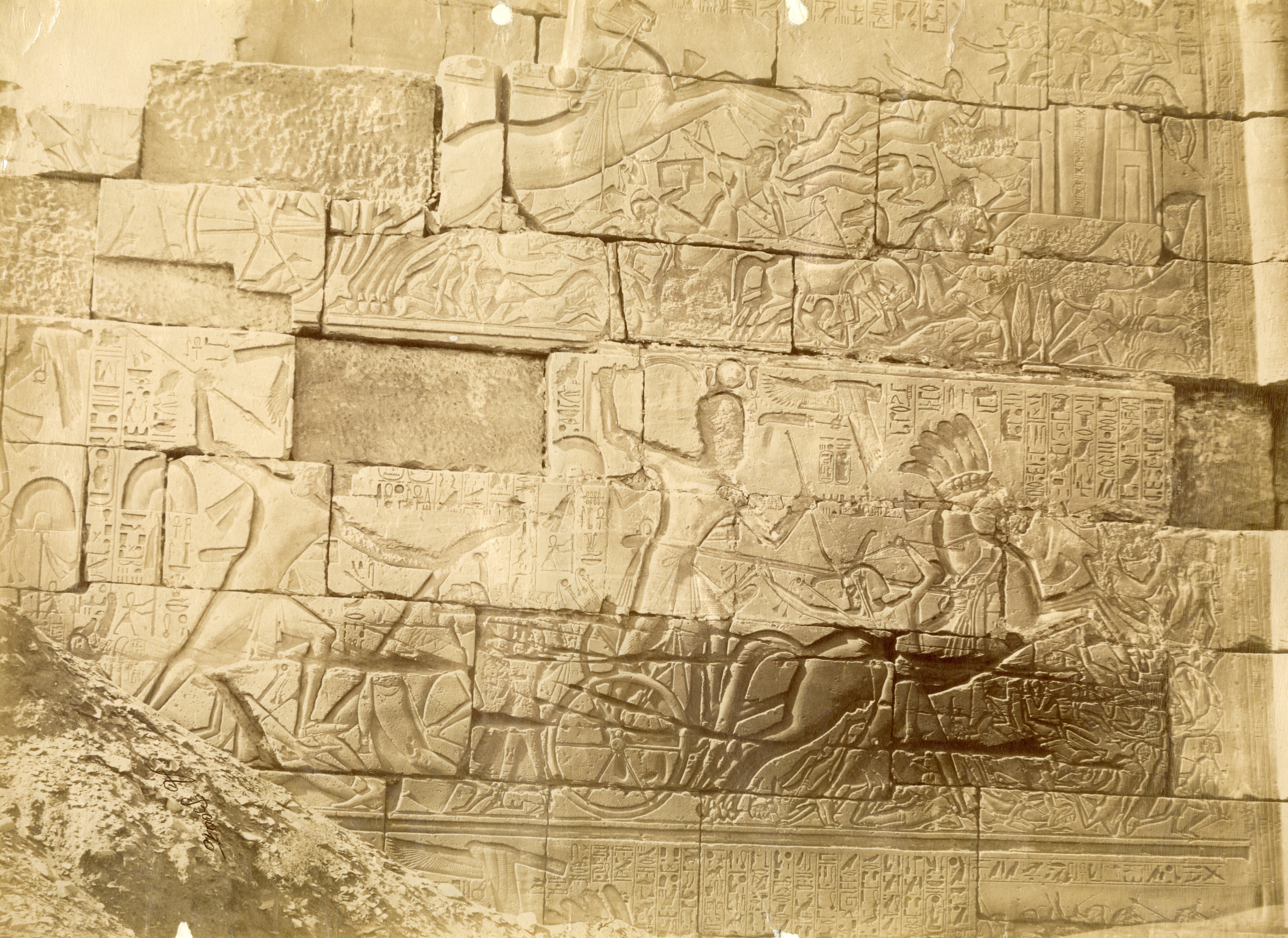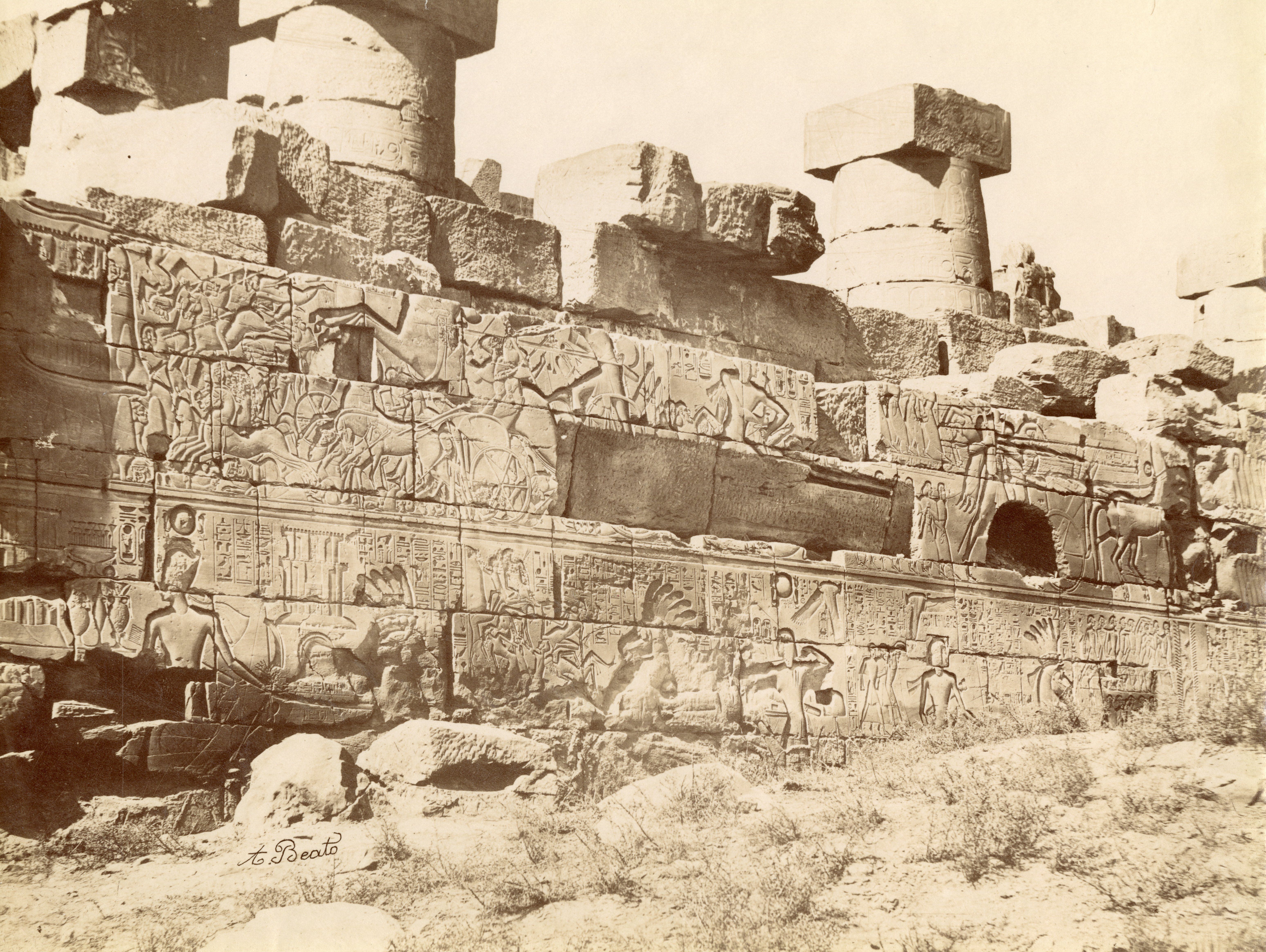 The photograph shows the bas-reliefs on the outer wall (north side, east section) of the Great Hypostyle Hall in the Karnak Temple Complex. Showing battle scenes of Pharaoh Seti I against the Yenoam (first register from the top) and Shasu populations (second register from the top), who were slaughtered with the pharaoh's war chariot during his Syrio-Palestine campaigns. The photograph documents the ground level in the second half of the 19th century, which was a few metres higher than the original level. Part of the wall is in fact, still underground. At the bottom, the author's signature is visible.