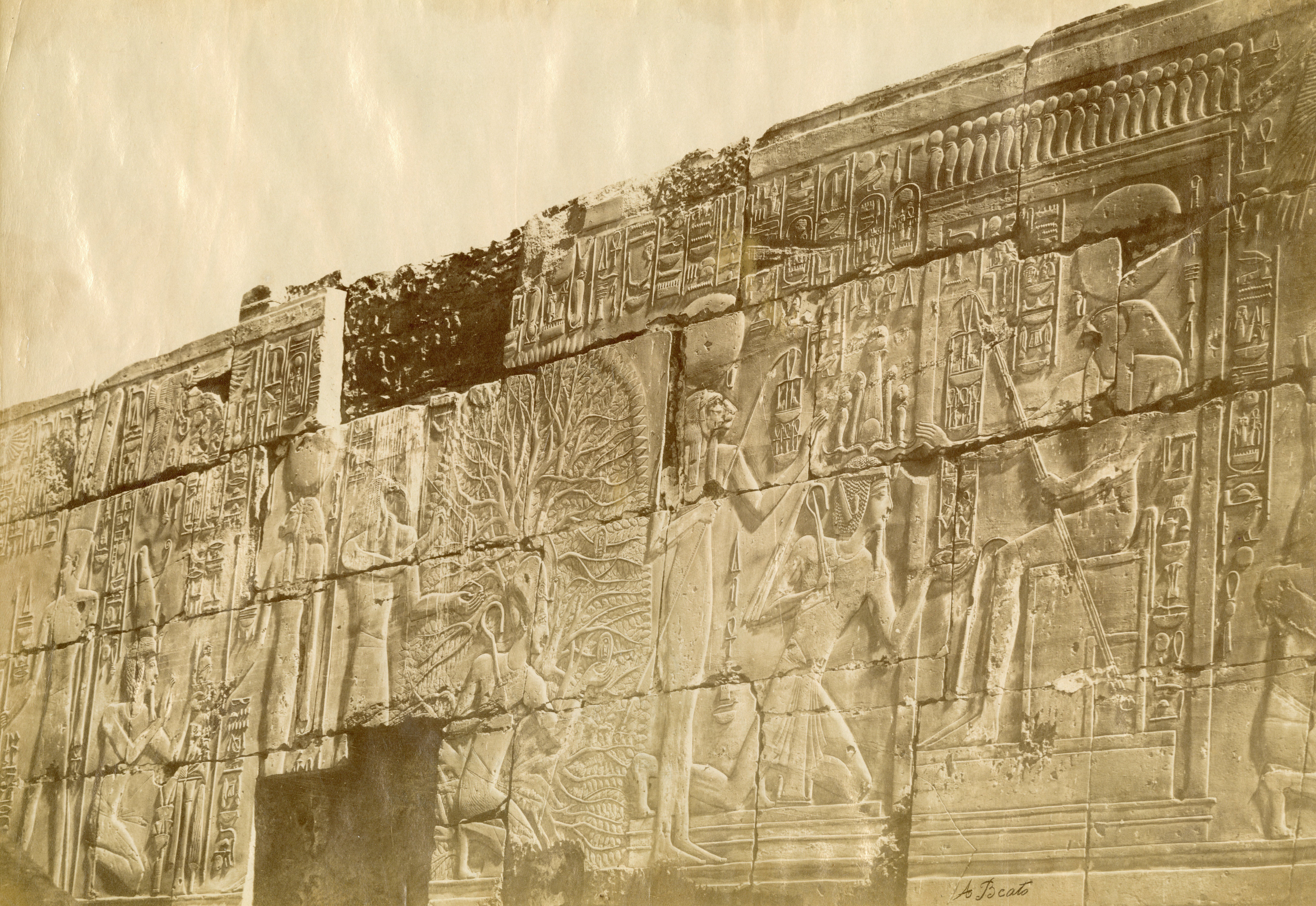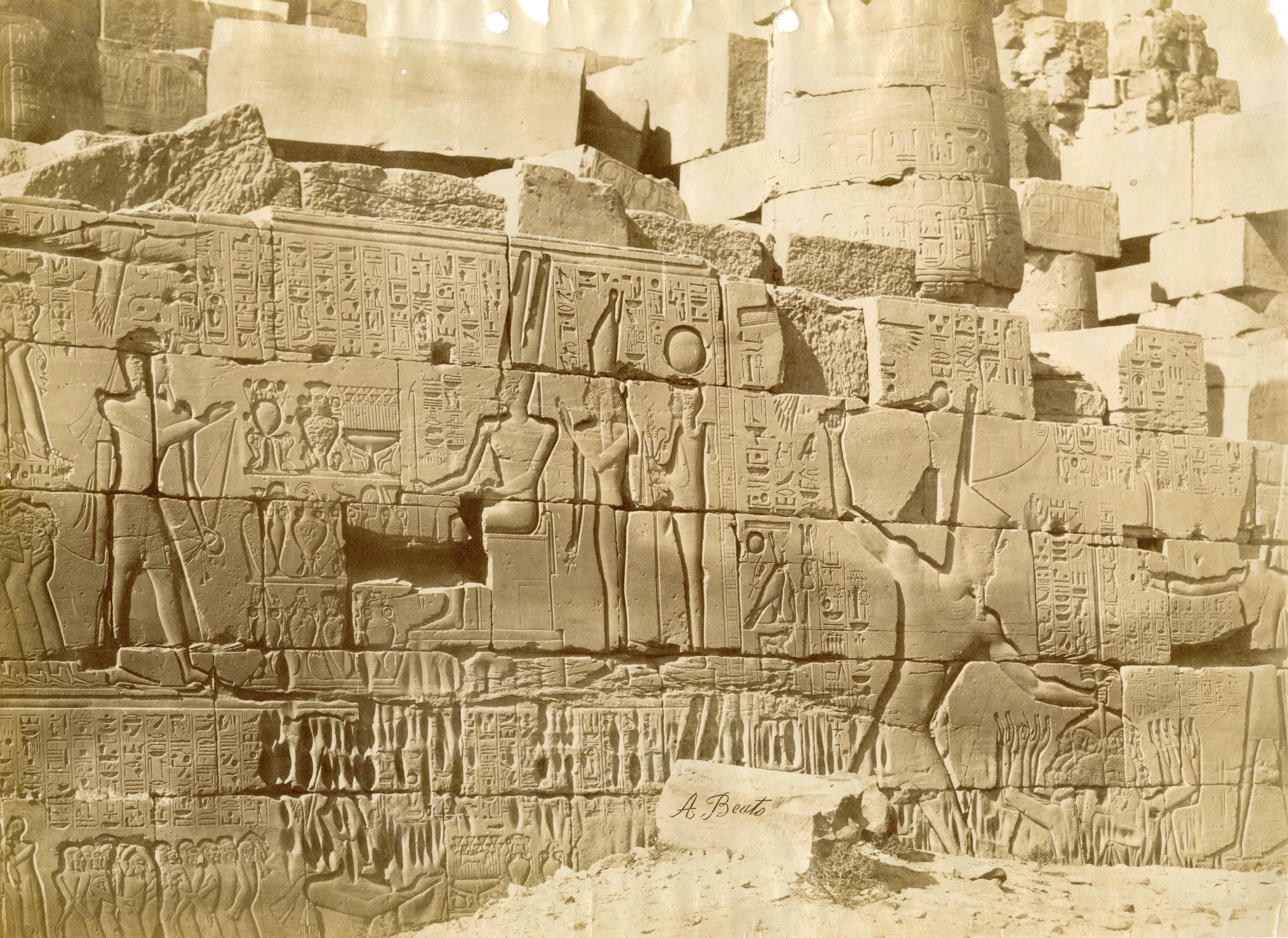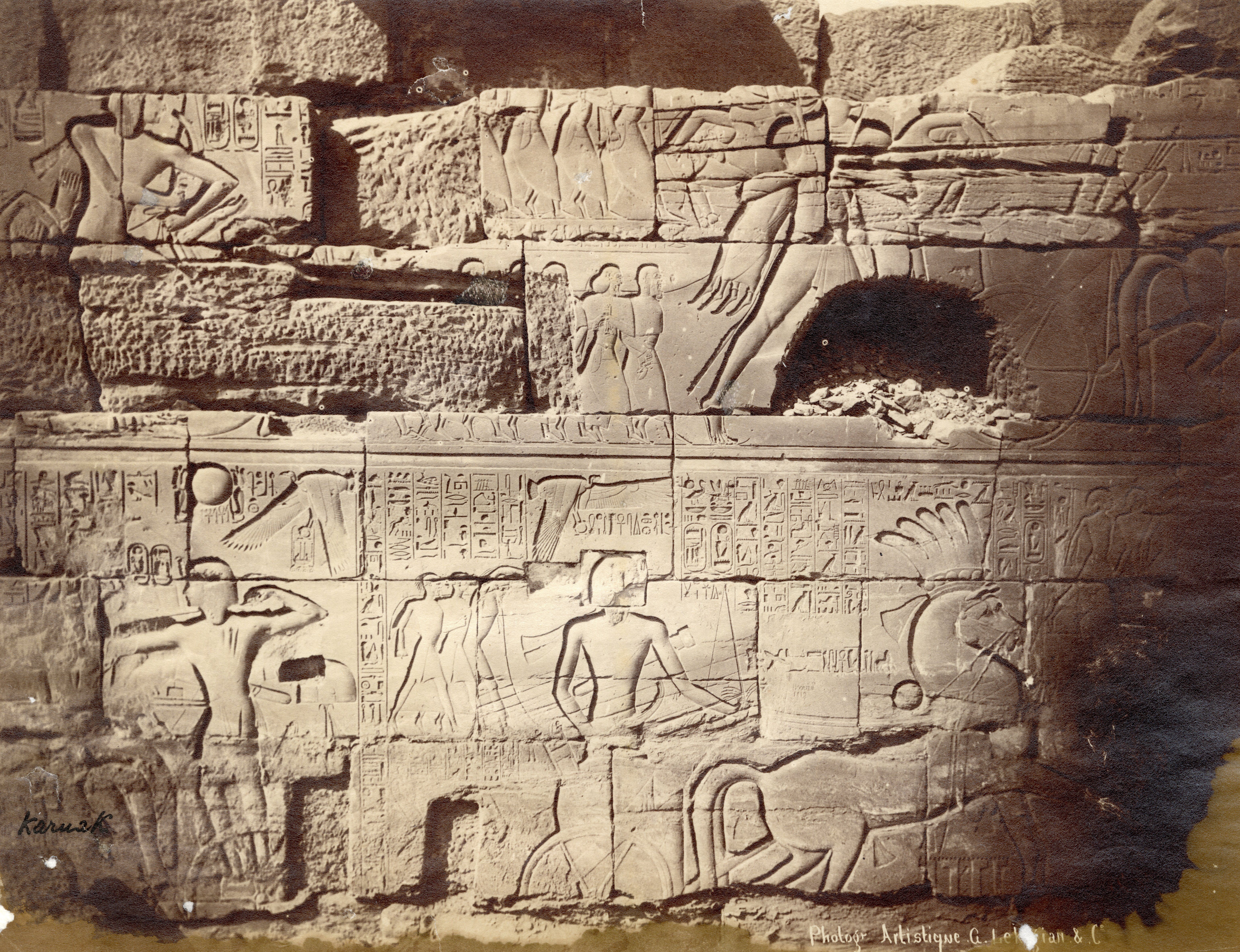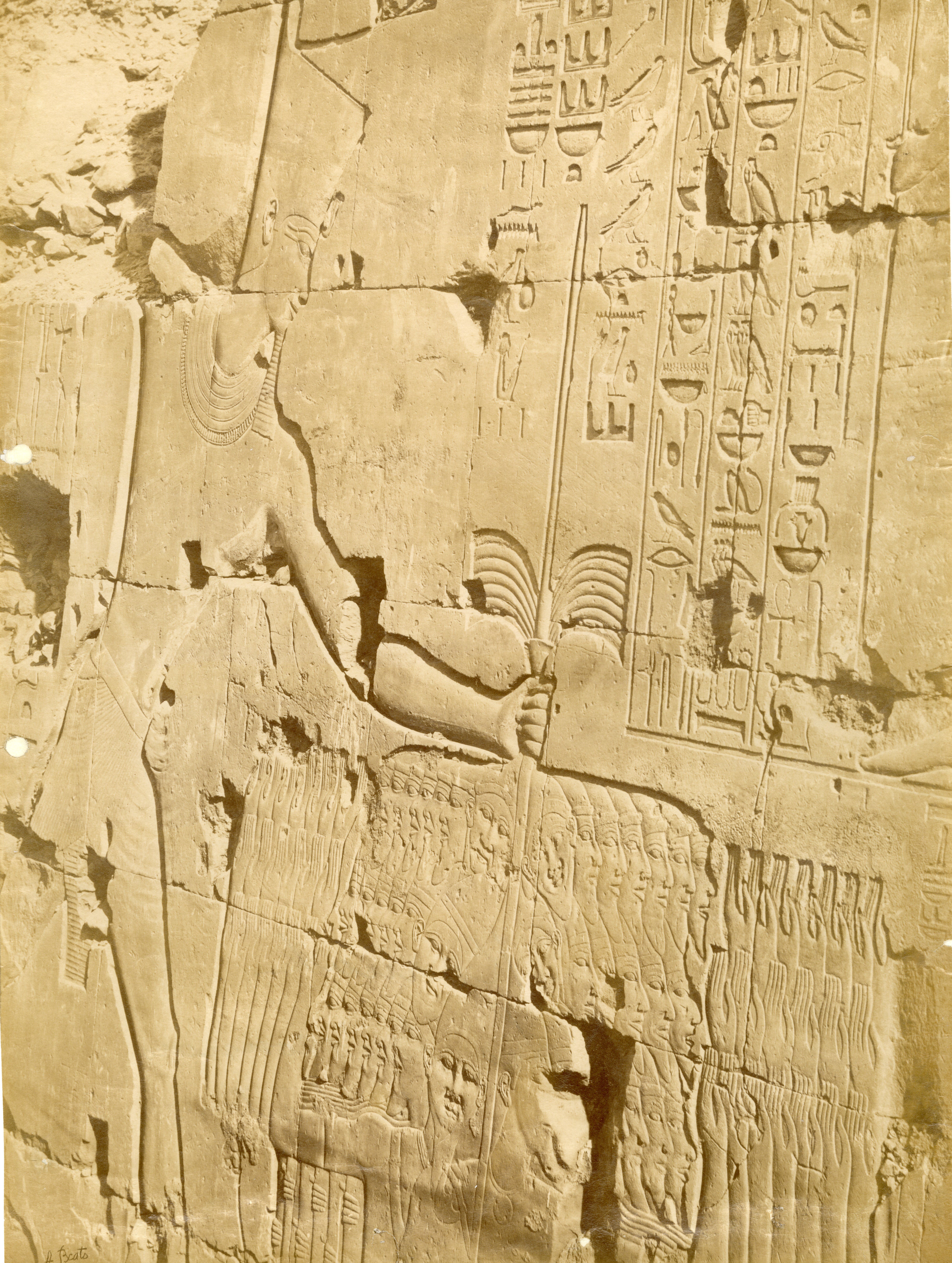 The photograph shows the bas-reliefs on the outer wall (north side, east section) of the Great Hypostyle Hall in the Karnak Temple Complex. Showing battle scenes of Pharaoh Seti I against the Yenoam (first register from the top) and Shasu populations (second register from the top), who were slaughtered with the pharaoh's war chariot during his Syrio-Palestine campaigns. The photograph documents the ground level in the second half of the 19th century, which was a few metres higher than the original level. Part of the wall is in fact, still underground. At the bottom, the author's signature is visible.
