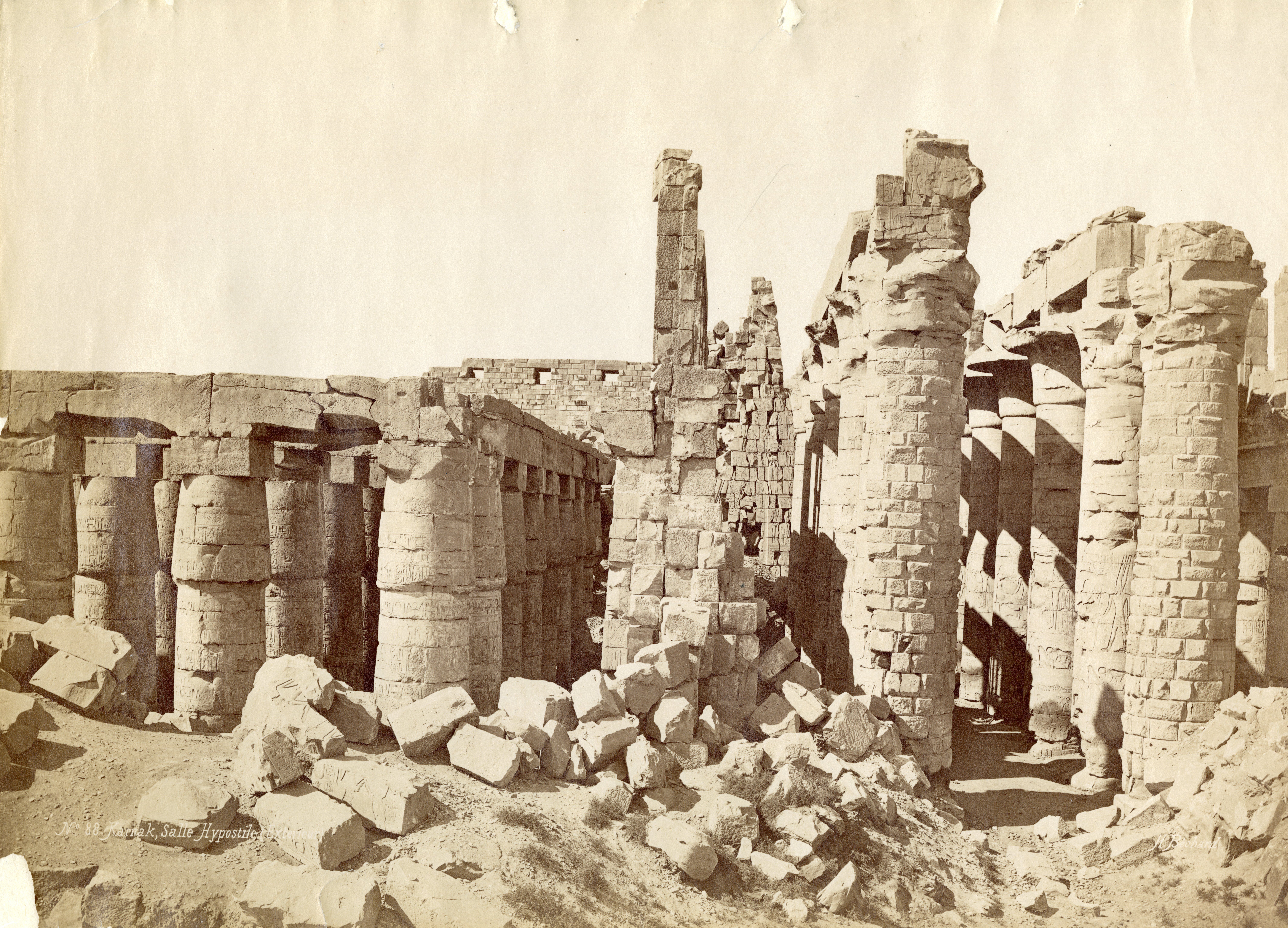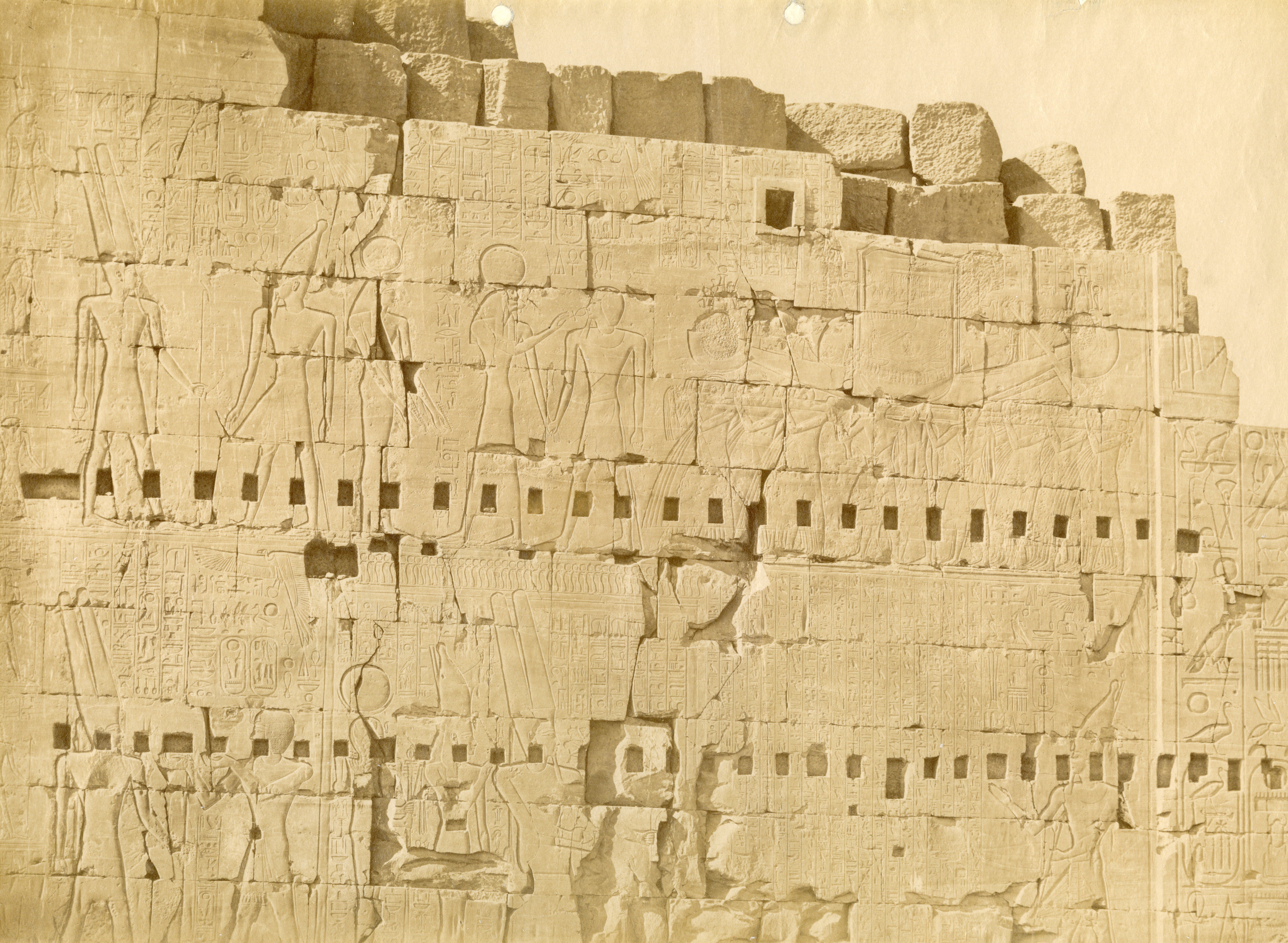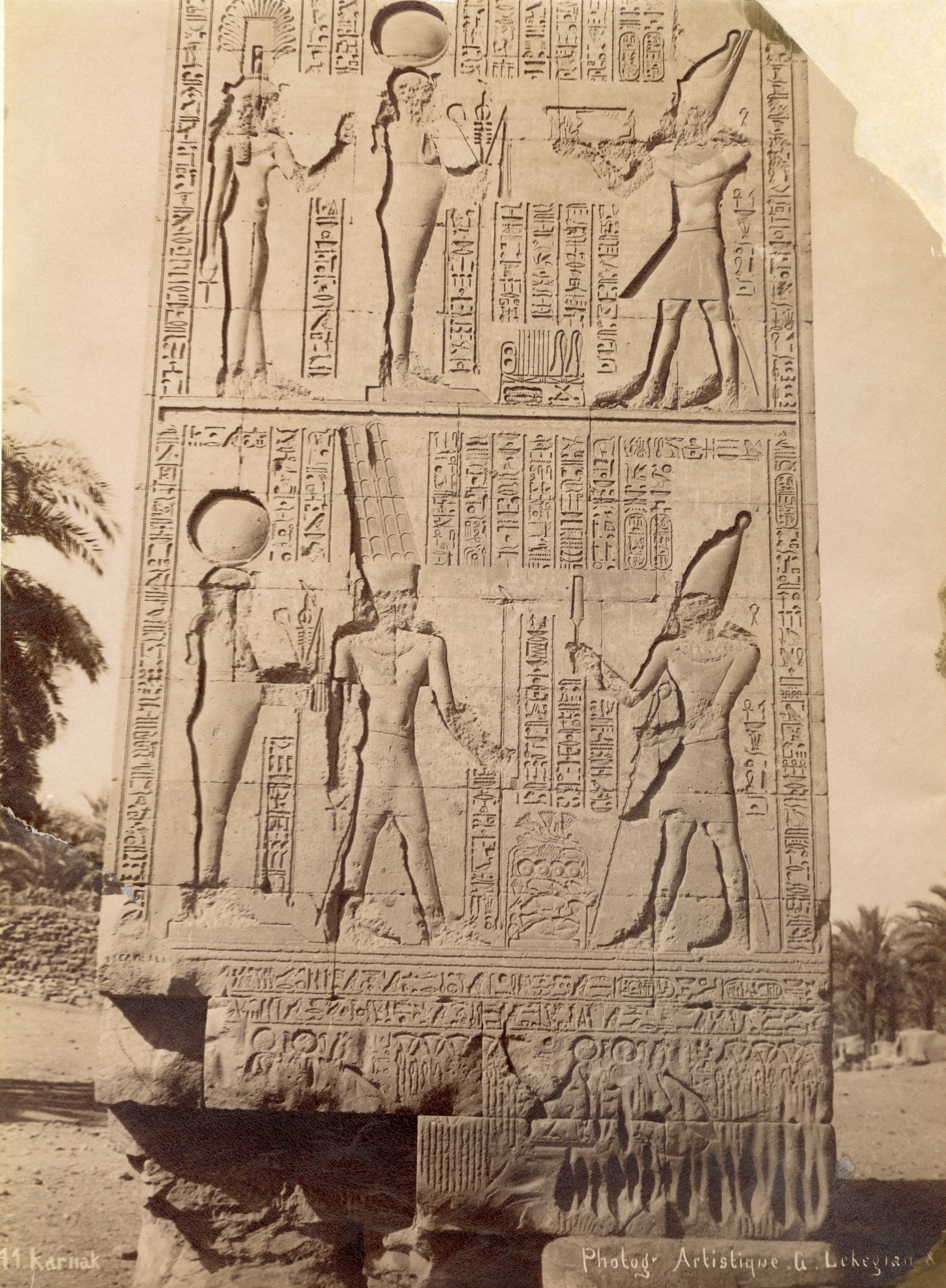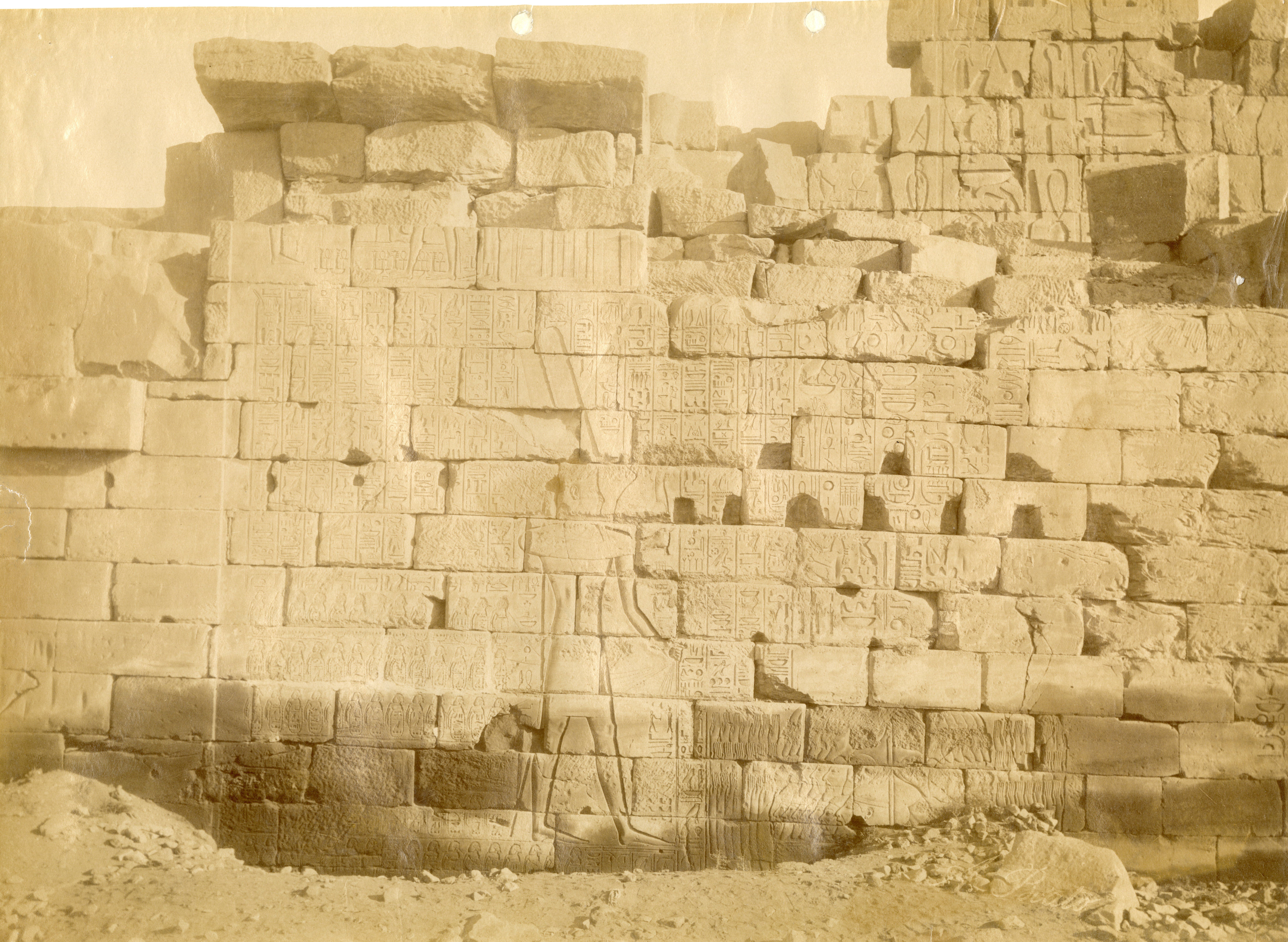 The photograph shows the bas-reliefs on the outer wall (north side, east section) of the Great Hypostyle Hall in the Karnak Temple Complex. Showing battle scenes of Pharaoh Seti I against the Yenoam (first register from the top) and Shasu populations (second register from the top), who were slaughtered with the pharaoh's war chariot during his Syrio-Palestine campaigns. The photograph documents the ground level in the second half of the 19th century, which was a few metres higher than the original level. Part of the wall is in fact, still underground. At the bottom, the author's signature is visible.