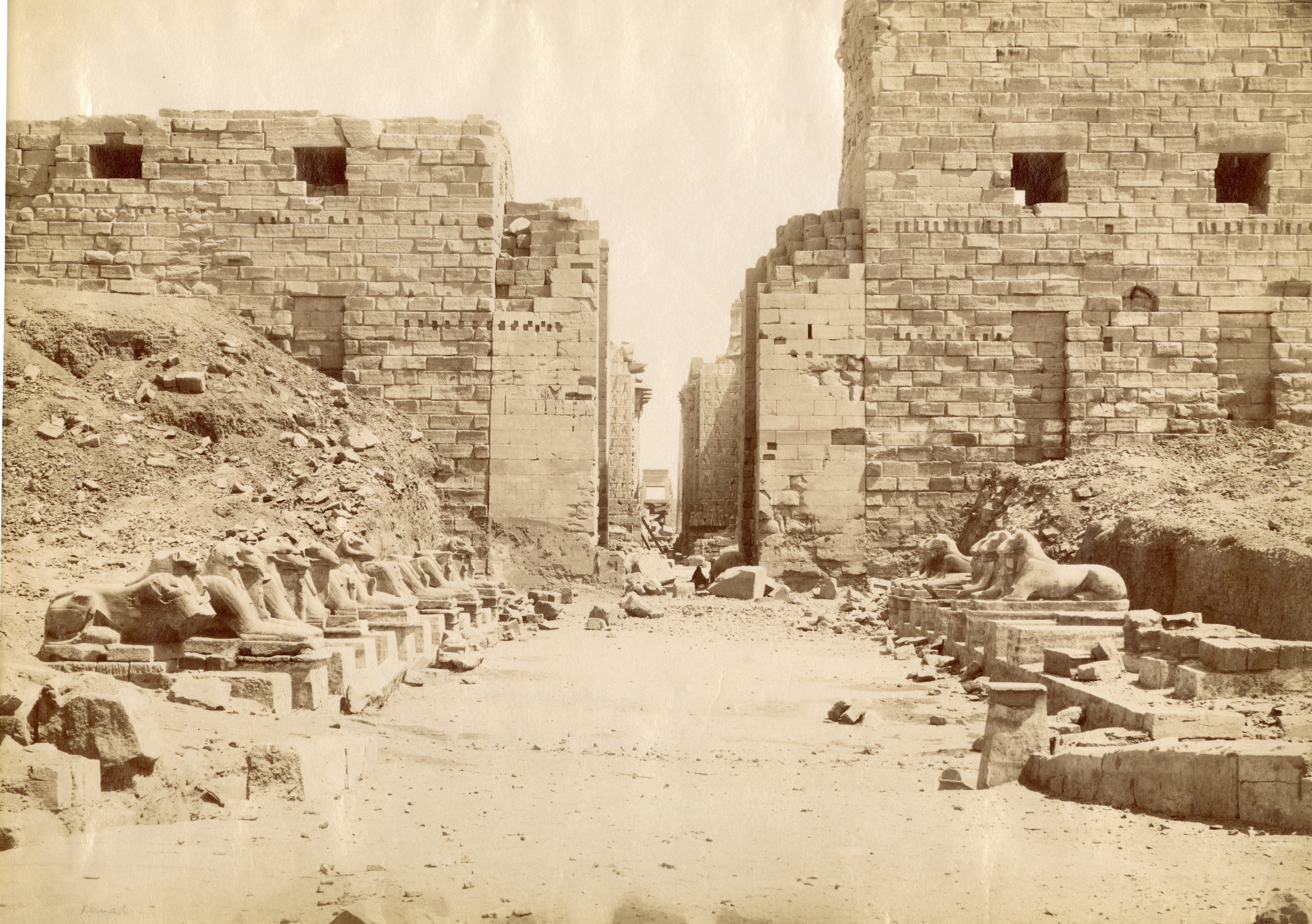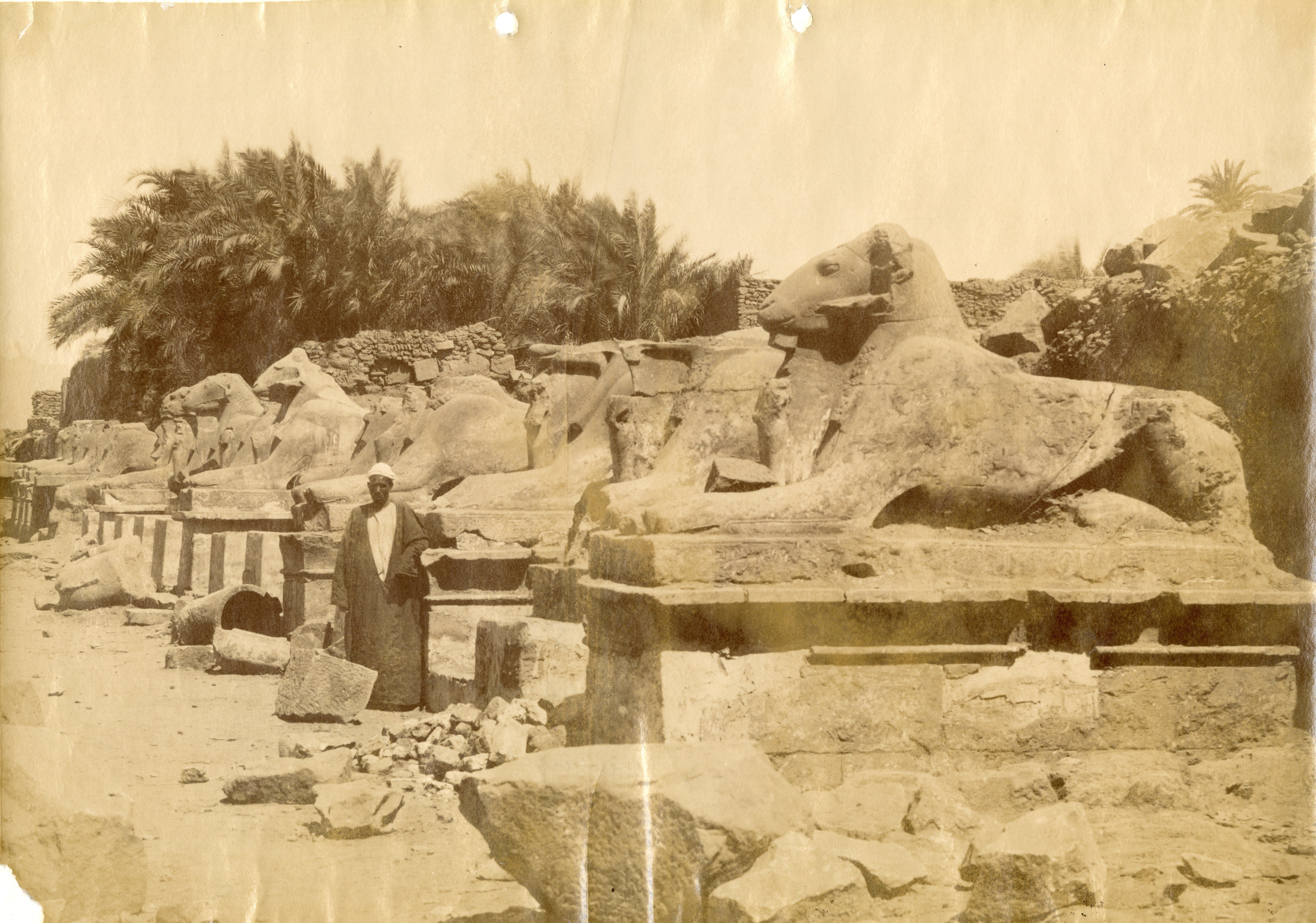 The photograph shows the northern side of the Avenue of (ram-headed) Sphinxes at Karnak, in front of the entrance to the Karnak Temple Complex. A local inhabitant poses in front of the camera. The photograph could most probably be attributed to Antonio Beato.