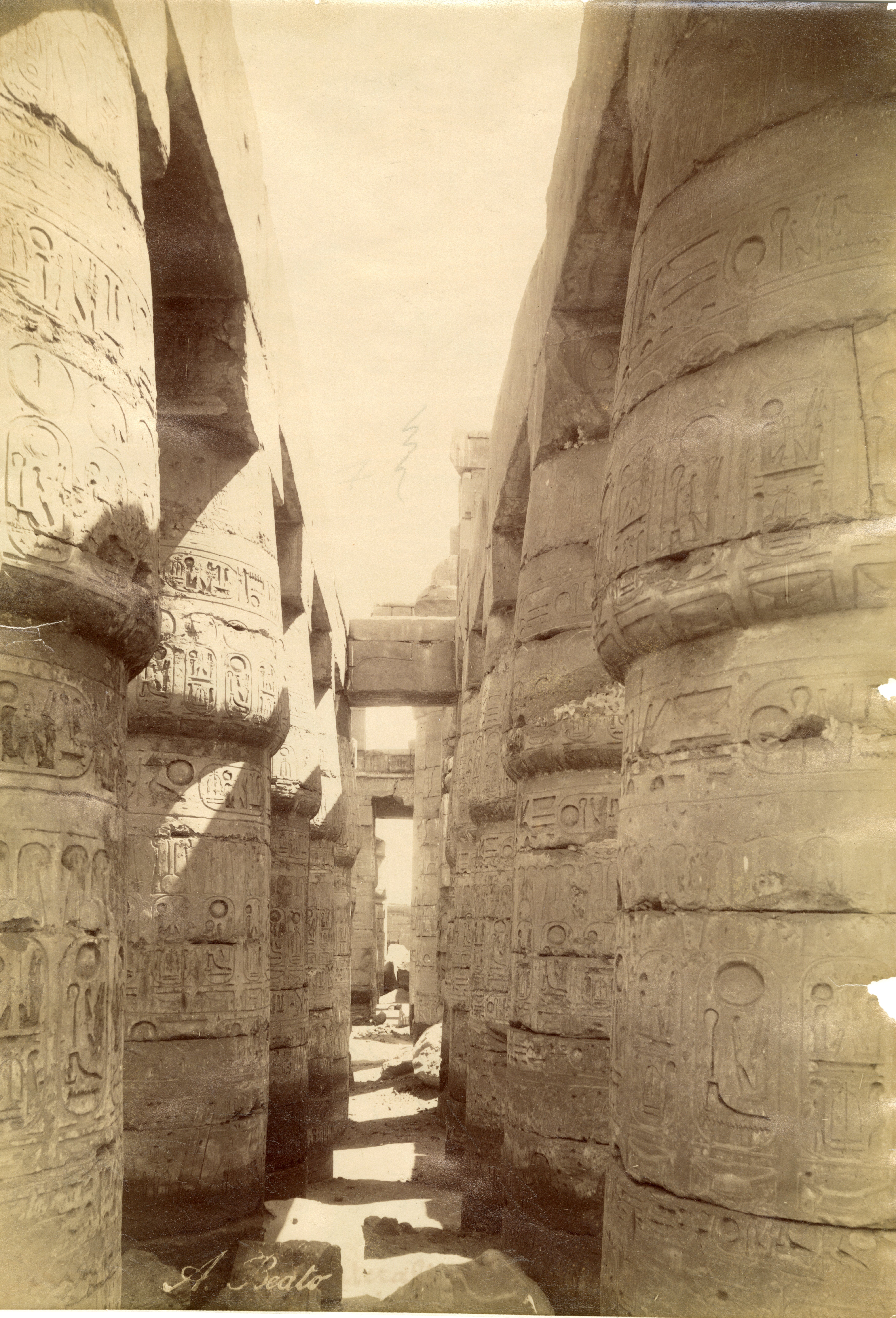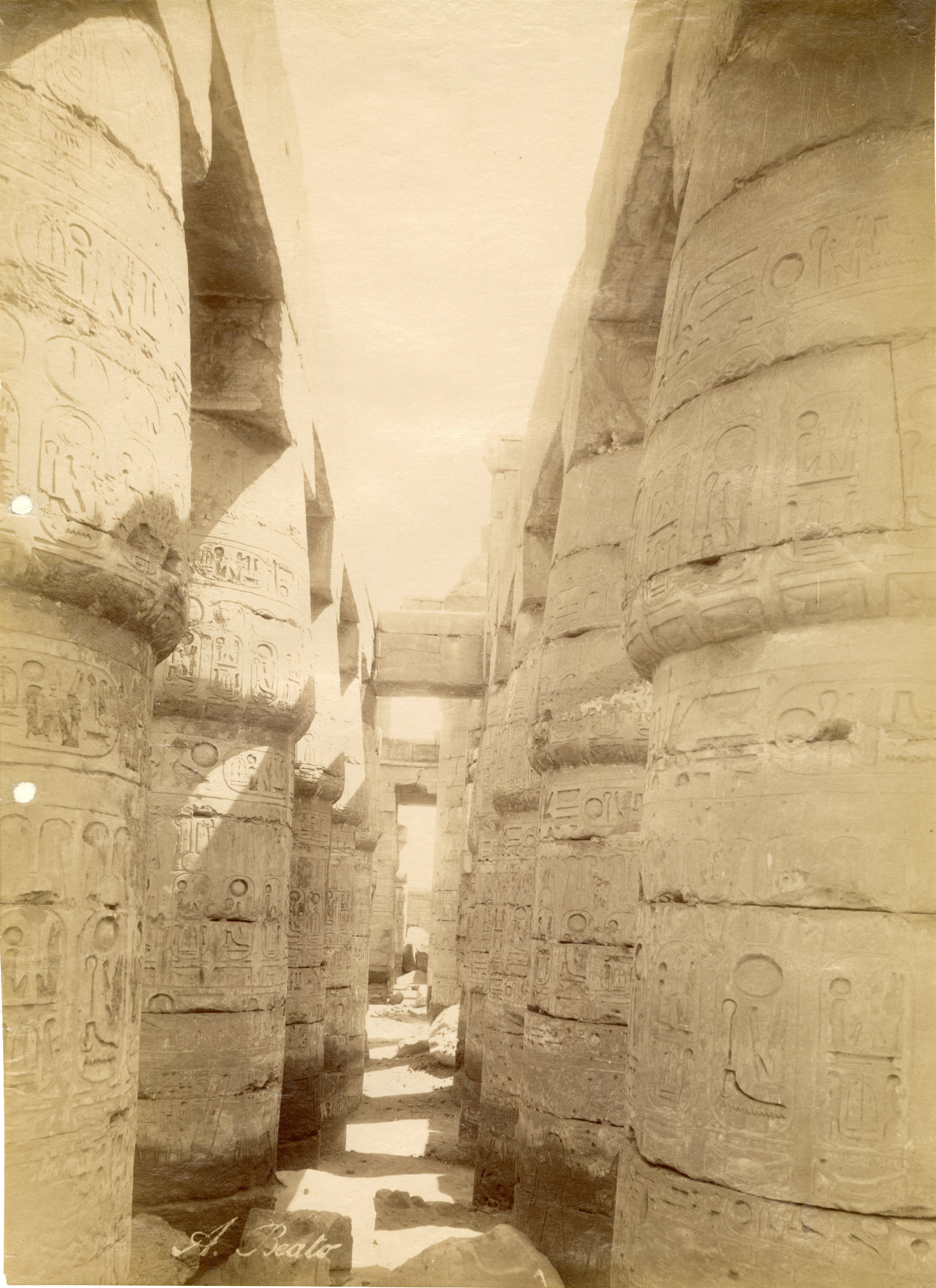 The picture shows a view of the central corridor of the Great Hypostyle Hall commissioned by Pharaoh Seti I in the Karnak Temple Complex, ending with the third pylon. In the forecourt between the third and fourth pylons, the surviving obelisk of Pharaoh Tuthmosis I is visible. The photo can be attributed to Beato.