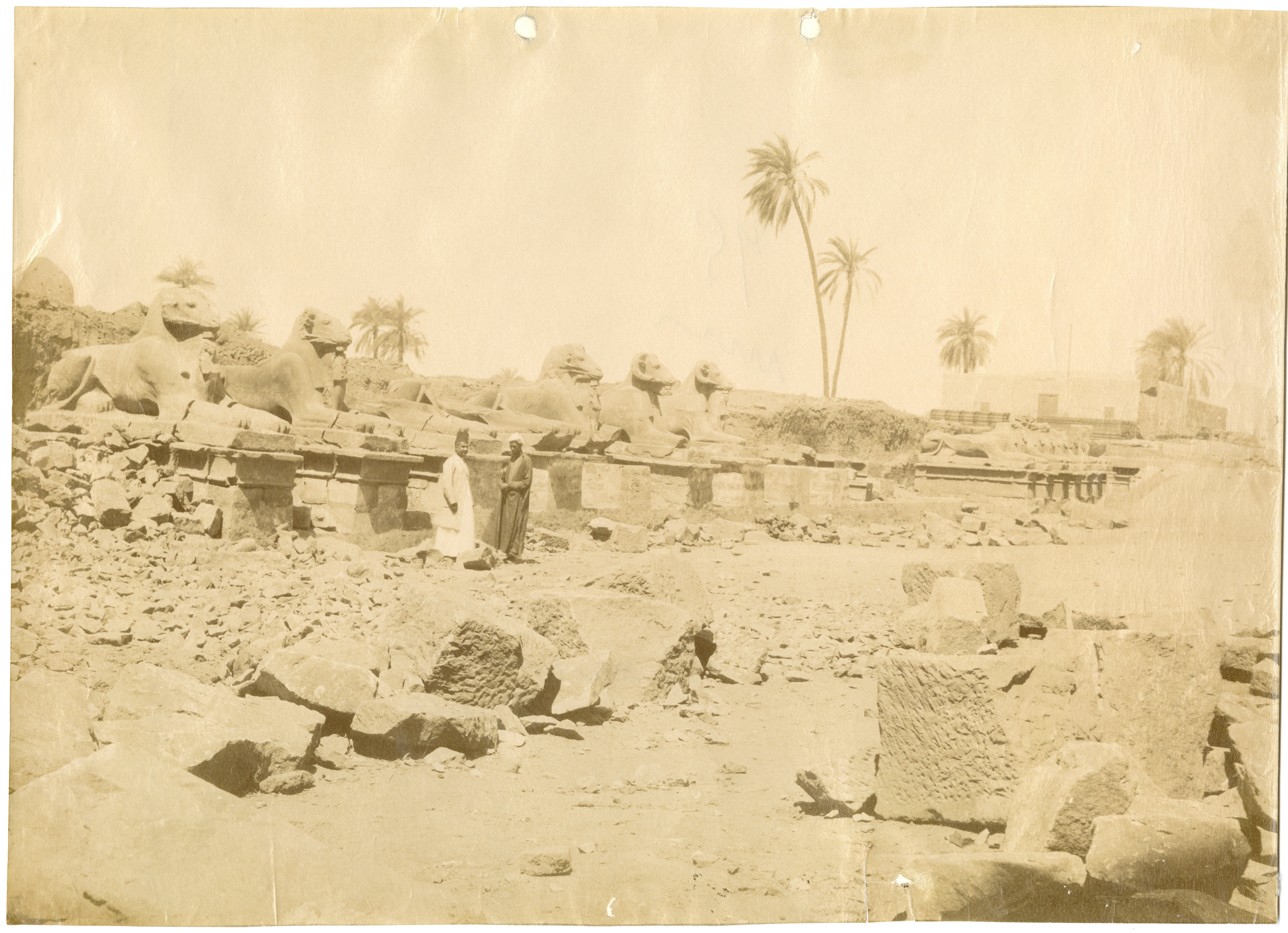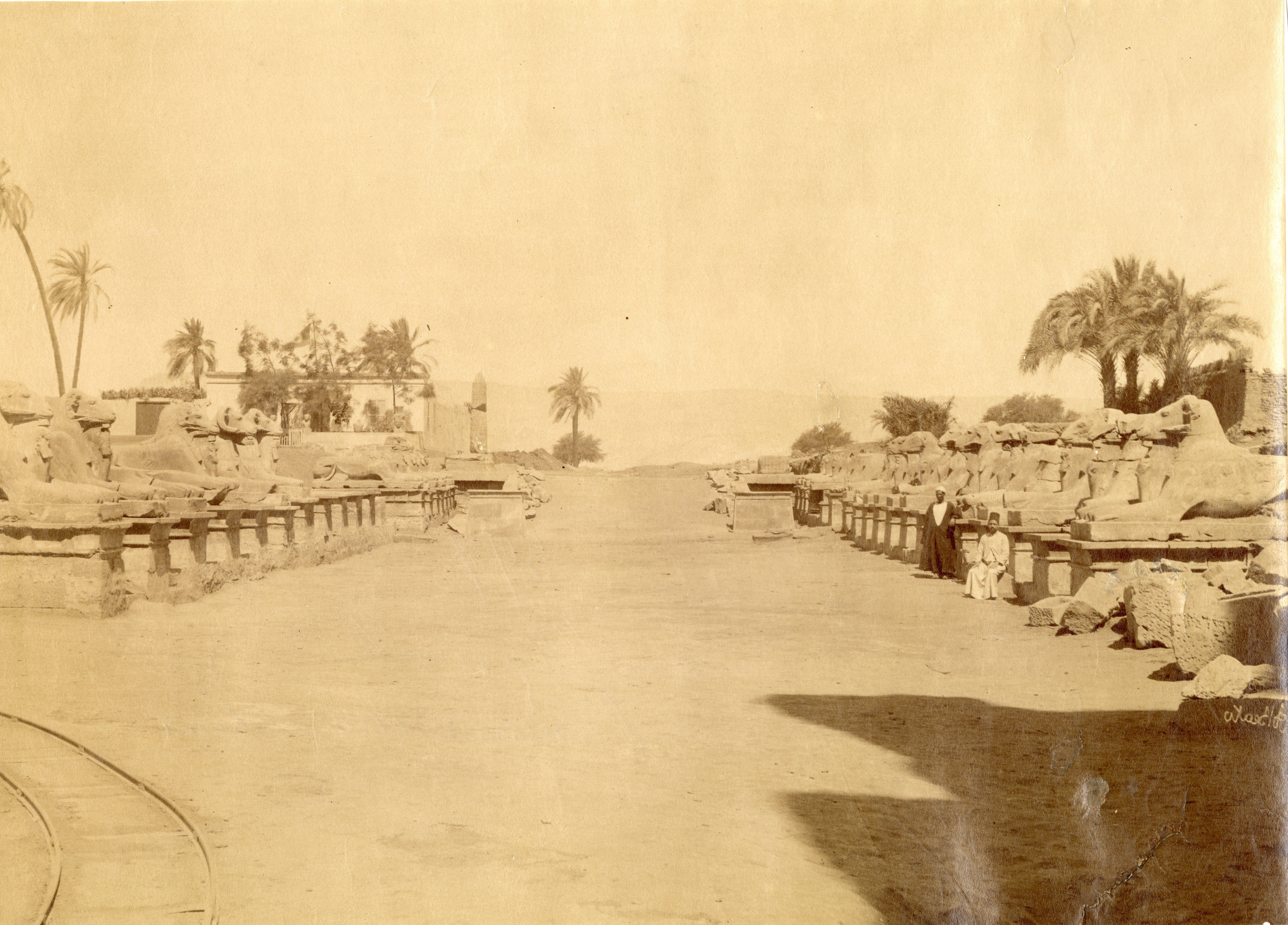 The photo shows a view of the Avenue of the Sphinxes with ram's head at the Karnak Temple Complex, with two egyptians posing for the camera. In the foreground on the left, the rails that were used to clear the excavation area of debris are visible; a sign that work on the site had already begun. The author's signature which is mirrored, can be found at the bottom right.