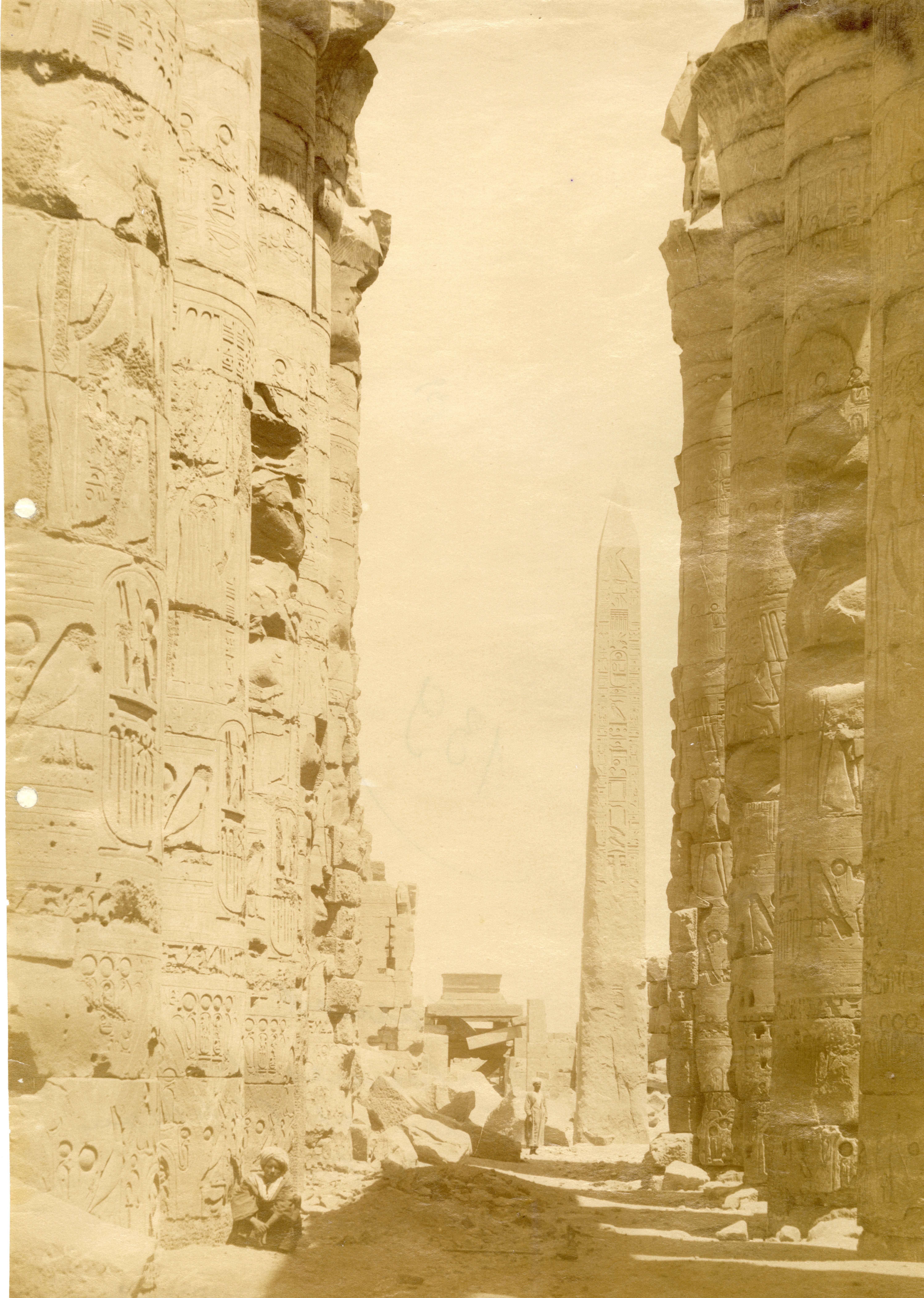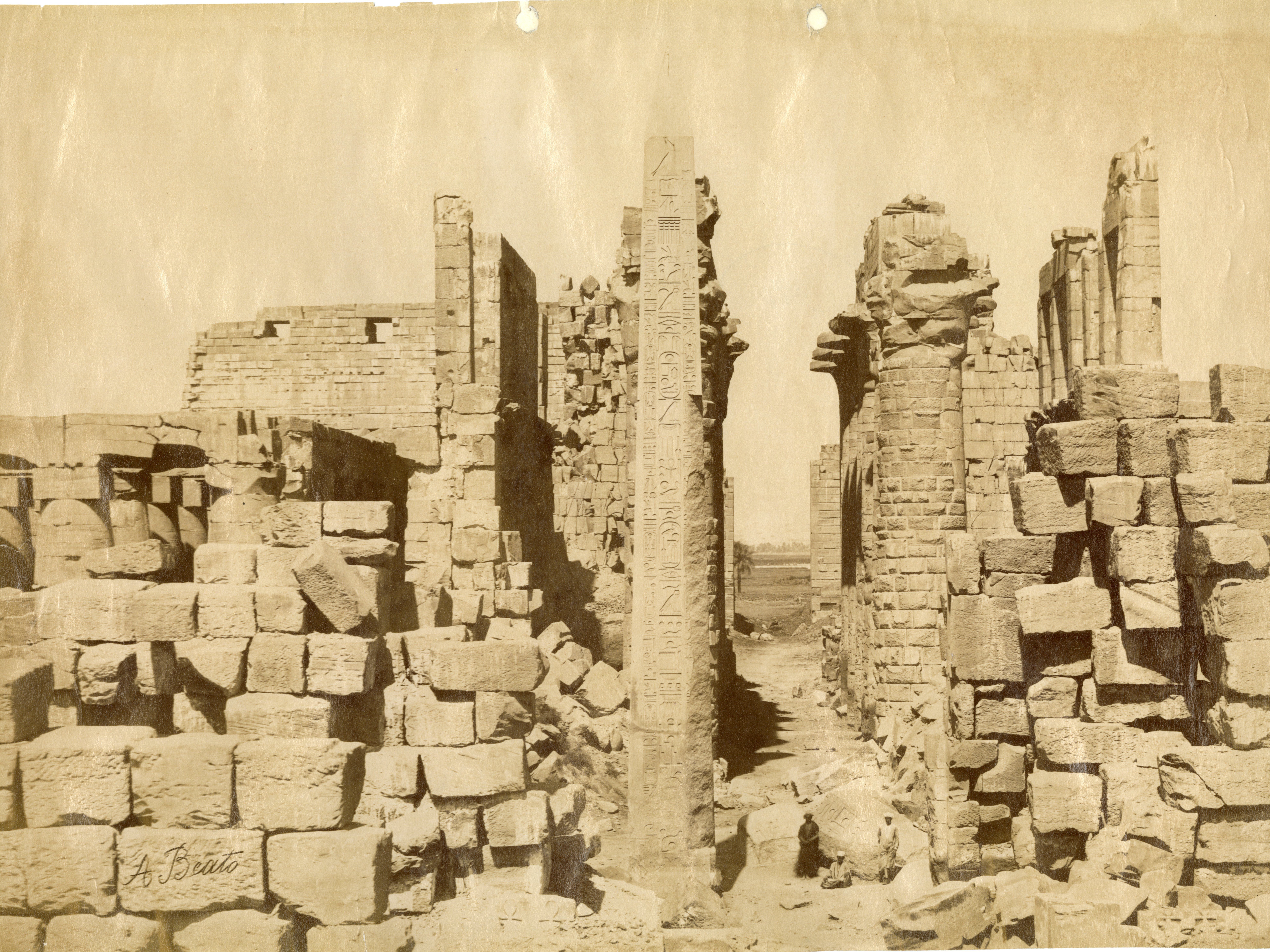The photograph shows an eastern view of the colonnaded Wadjet Hall built by Pharaoh Tuthmosis I in the Karnak Temple Complex. The still standing obelisks of Hatshepsut (north, on the right), the tip of he collapsed one (south, on the left) and that of Tuthmosis I (centre) are also visible. In the background, the western ruins of the Great Hypostyle Hall of Seti I can be seen. Two egyptians seated on a boulder in front of the temple, pose for the photographer, whose signature is legible on the left.