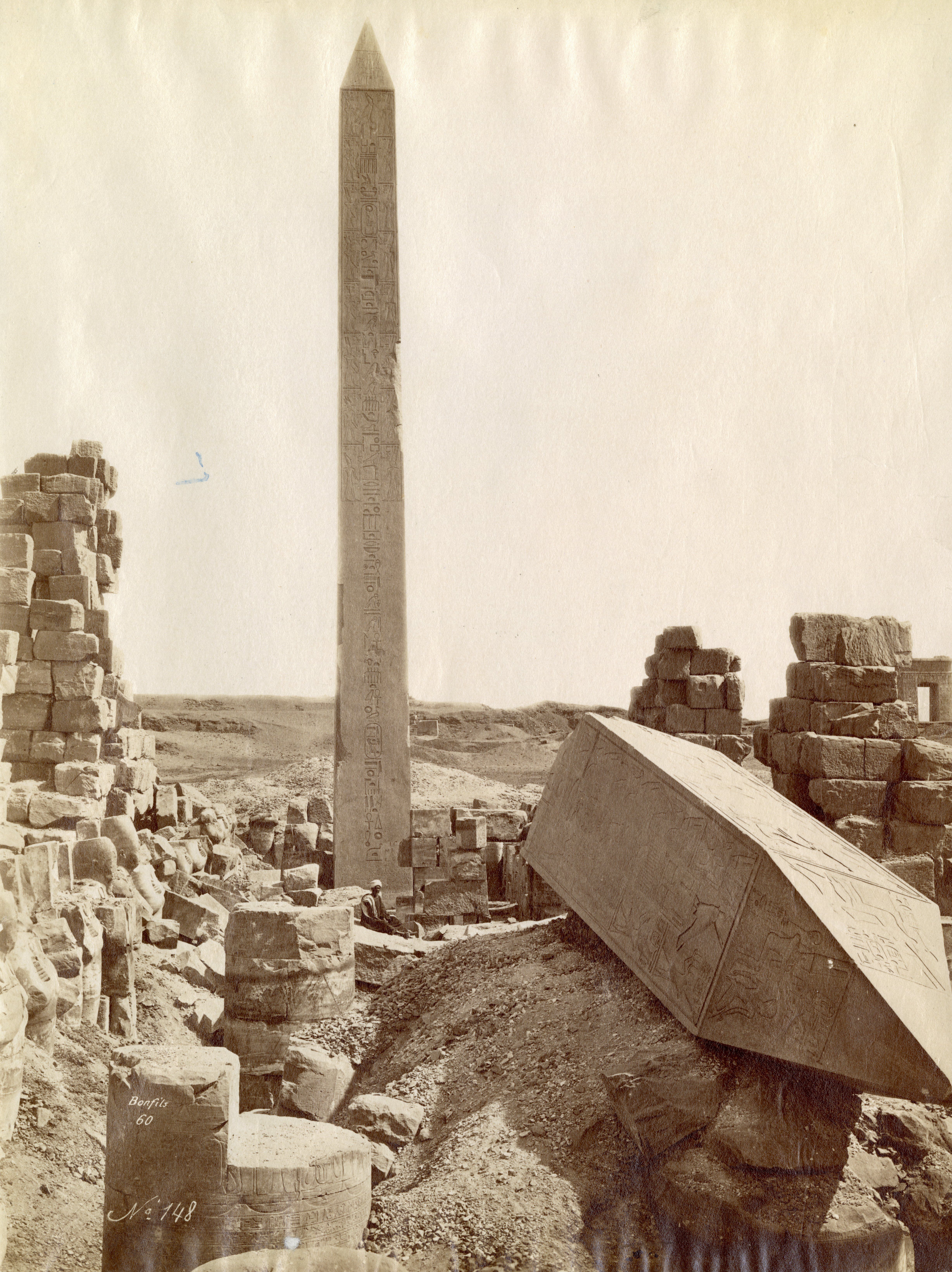 The picture captures the two obelisks of Hatshepsut near the Wadjet Hall of Pharaoh Tuthmosis I in the Temple of Amun at Karnak, one obelisk is still intact, whilst the other (in the foreground) has its tip on the ground. An egyptian sits at the base of the monument in the background. A signature and presumably a date are visible at the lower left.