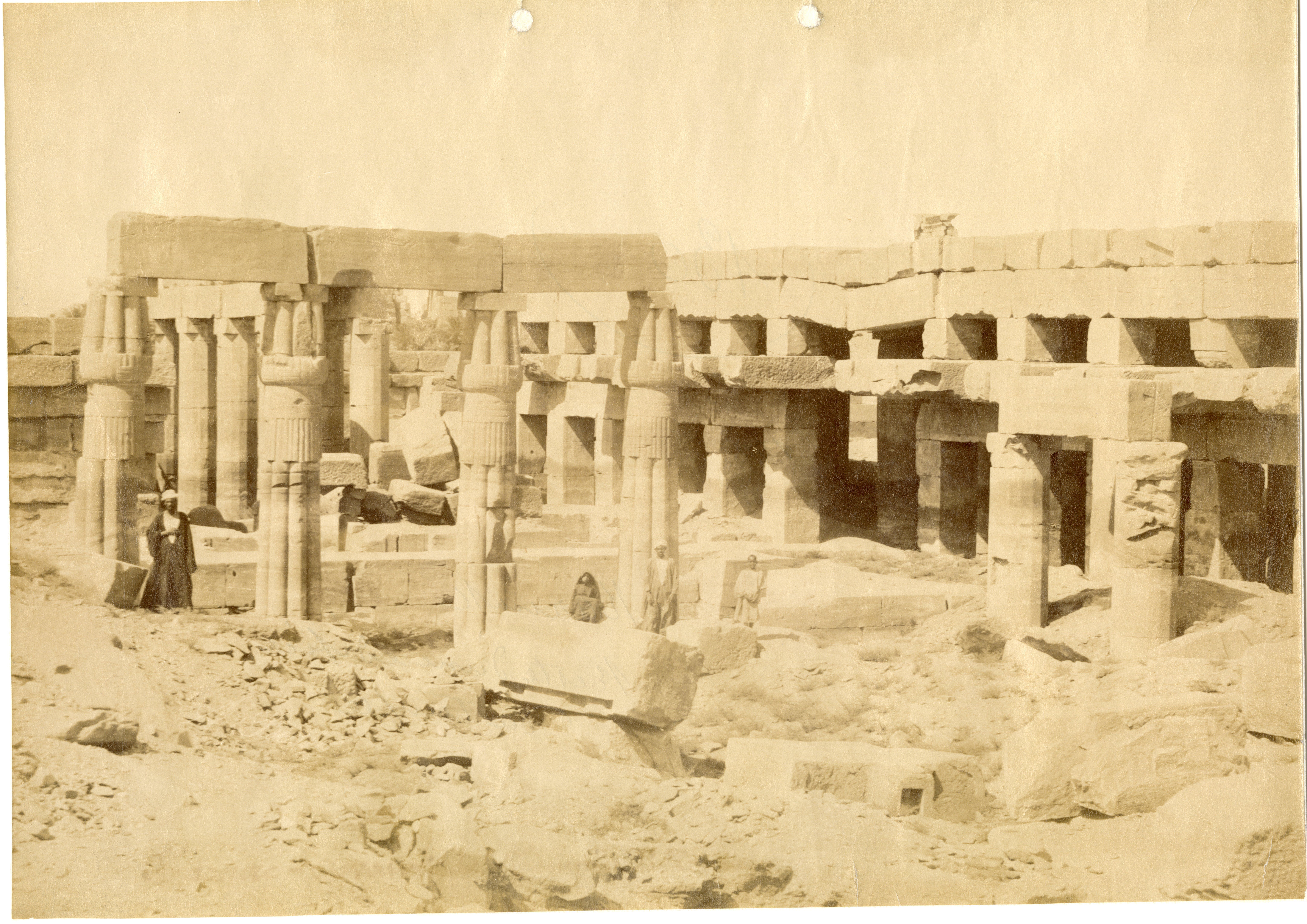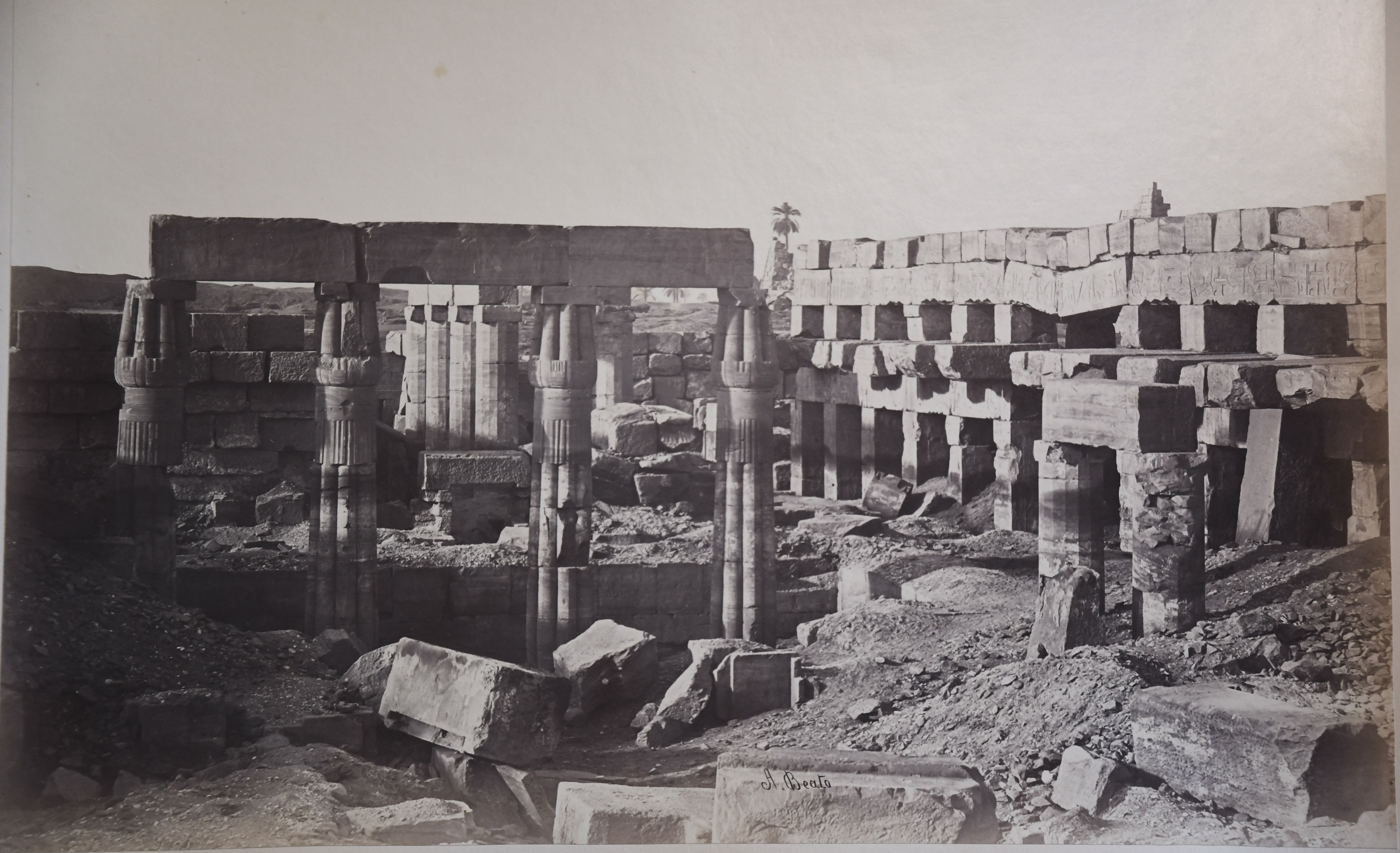In the image there are some Egyptians among the ruins of the Akhmenu (“Festival Hall”), the temple built by ruler Tuthmosis III within the Karnak Temple Complex. Among the ruins, four papyrus columns are still standing. The photograph can be attributed to Antonio Beato.