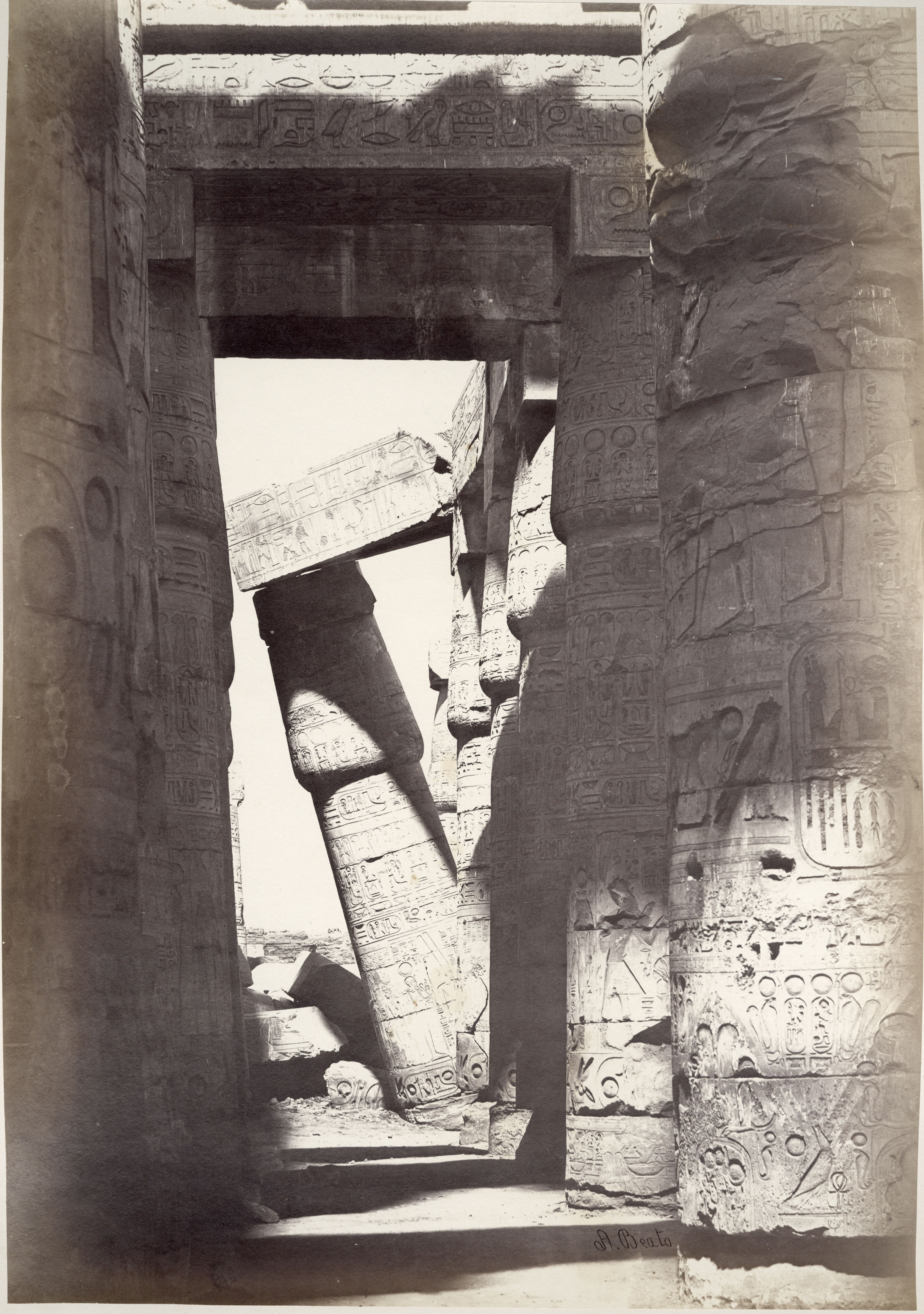 The photograph depicts the entrance to the Great Hypostyle Hall, built by Pharaoh Seti I, dof the Karnak Temple complex, viewed from the courtyard in front. The remaining column from the south-eastern corner of the kiosk of Taharqa (ruler of the 25th dynasty) stands out. Some locals (seated and standing) and a donkey give an idea of the colossal size of the complex. The author's signature is visible at the bottom centre.