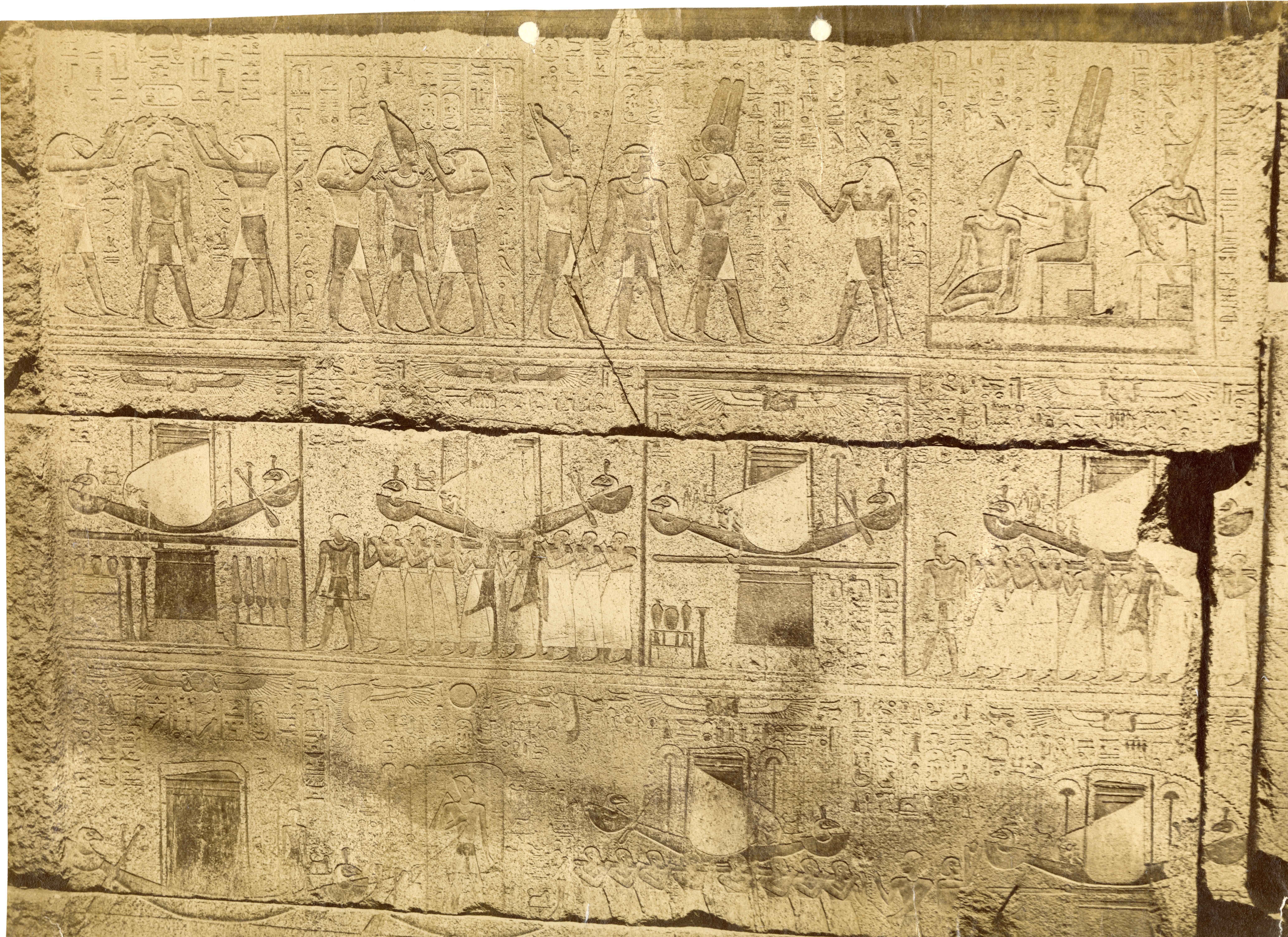 The photograph shows a detail of the wall decoration from the Karnak Temple Complex, in the “Sanctuary of the sacred boat” of Philip Arrhidaeus, depicting ceremonial scenes of presenting the King to Amun and the transport of the sacred boat. Based on the style, the photograph can be attributed to Antonio Beato.