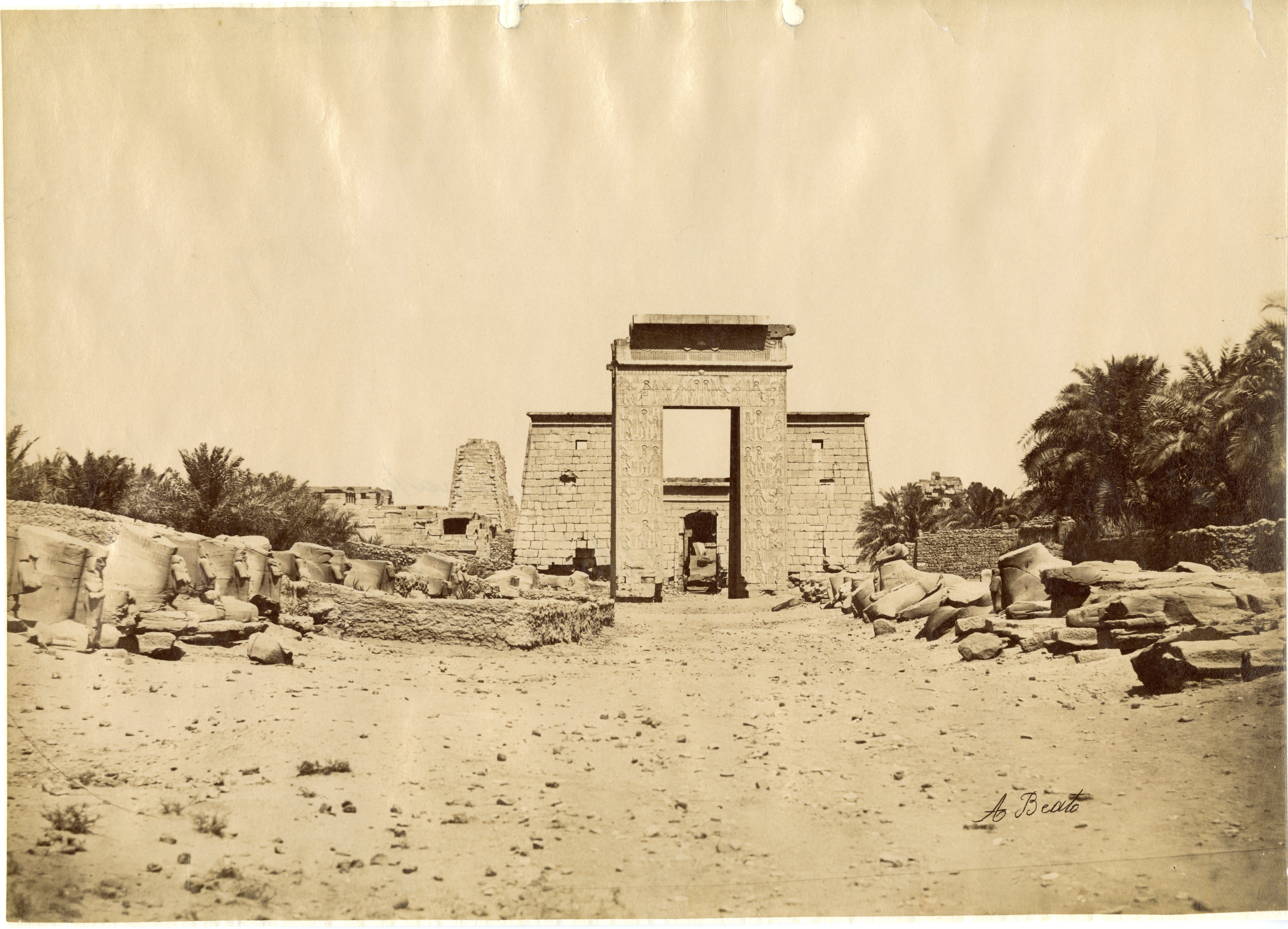 The photograph shows the main entrance to the Karnak Temple Complex (first pylon) from the Avenue of the Sphinxes with ram's head. This striking shot shows the ruins of the temple complex submerged in water during one of the Nile's floods. The photo can be attributed to Antonio Beato.
