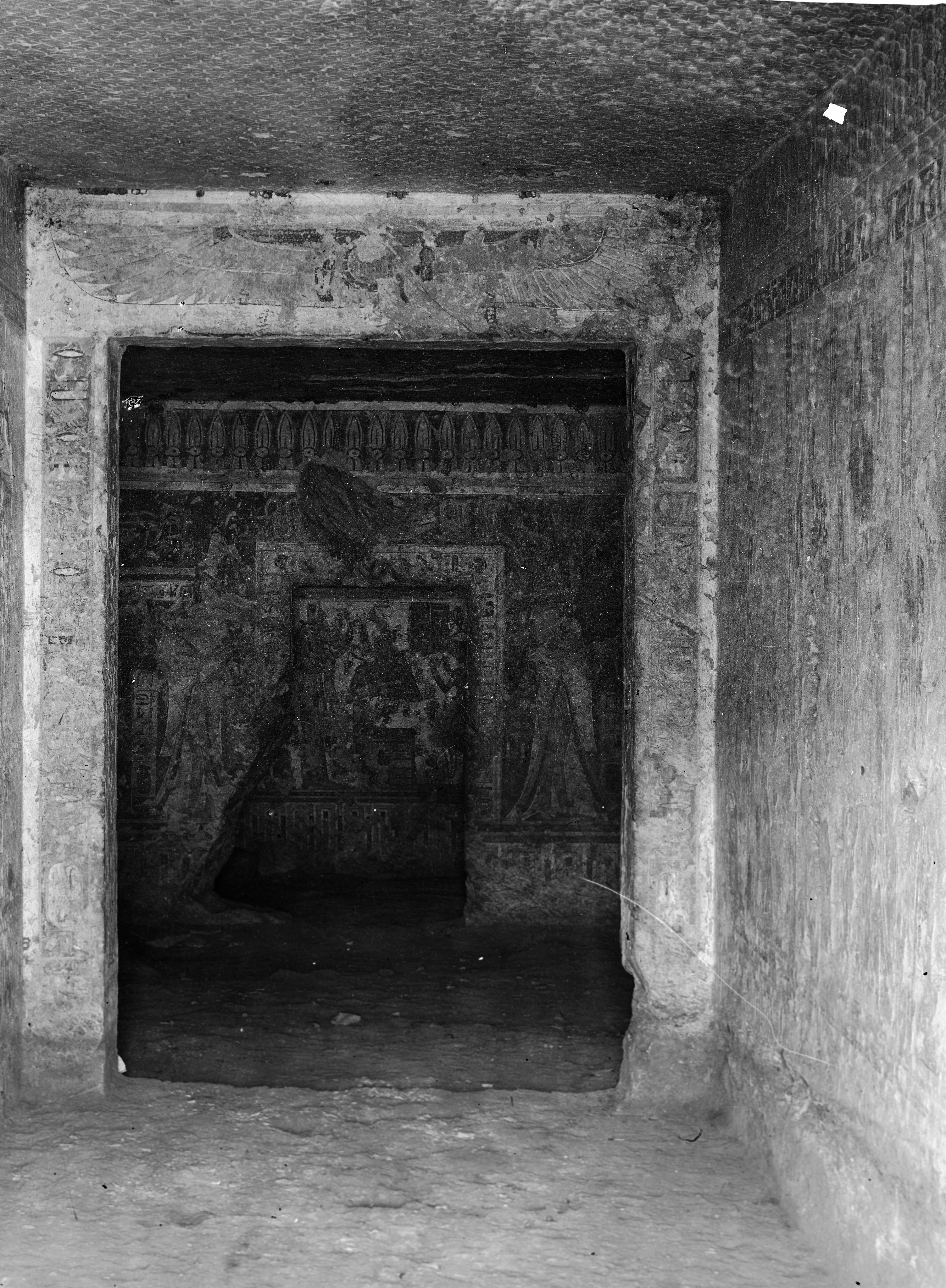 Interior of the tomb of Queen Tyti (QV52). Photograph taken from the vestibule, in the direction of the burial chamber. In the background, the decoration on the back wall of the rear annex can be seen.