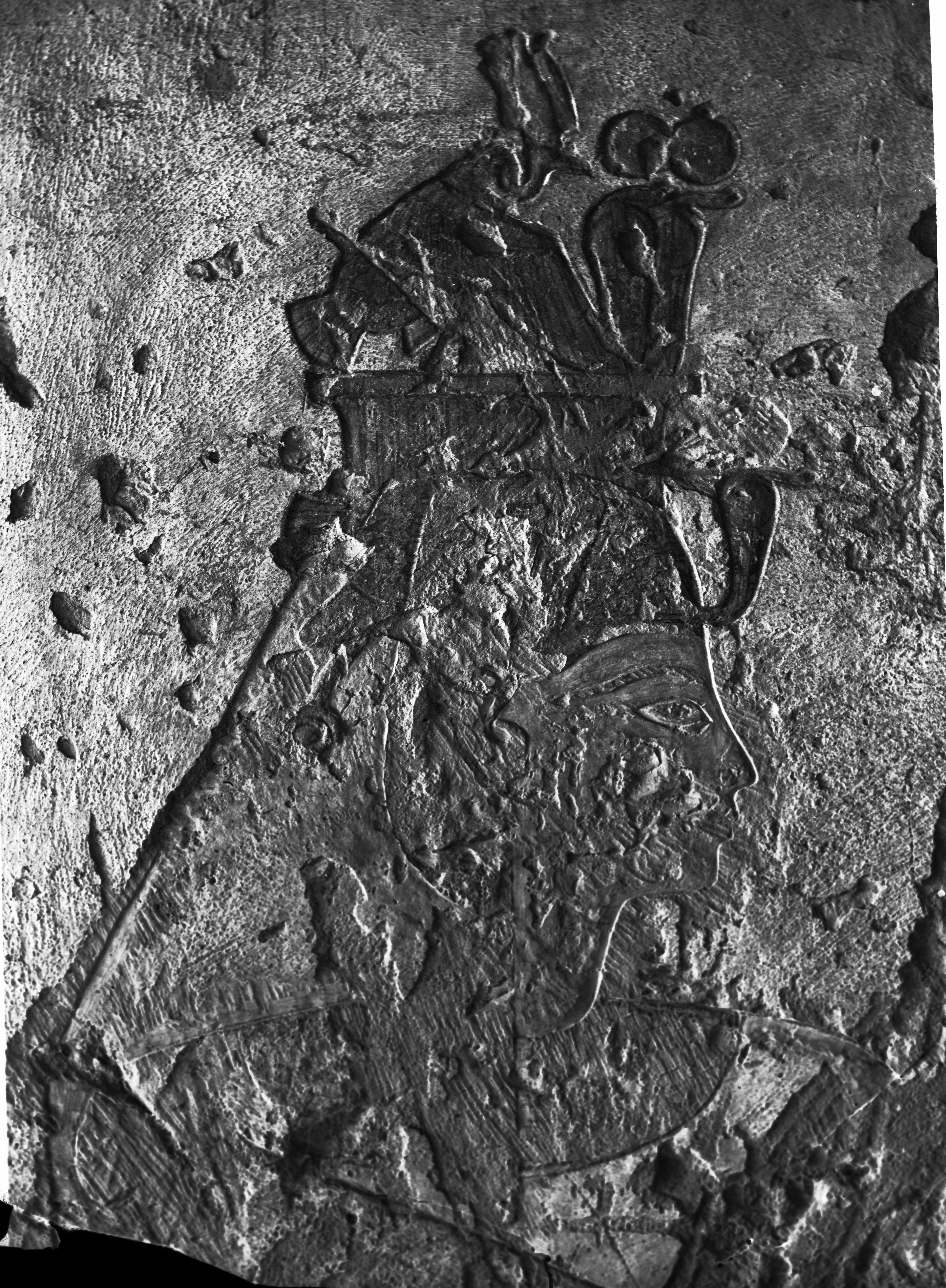 Fragmentary representation of Queen Tyti in the internal corridor of her tomb (QV52), worshipping the gods Imseti and Duamutef and the goddess Isis - the gods are not visible in this photograph. Schiaparelli excavations. (Original label: painted bas-relief from the tomb of Queen Tyti (previously known)).