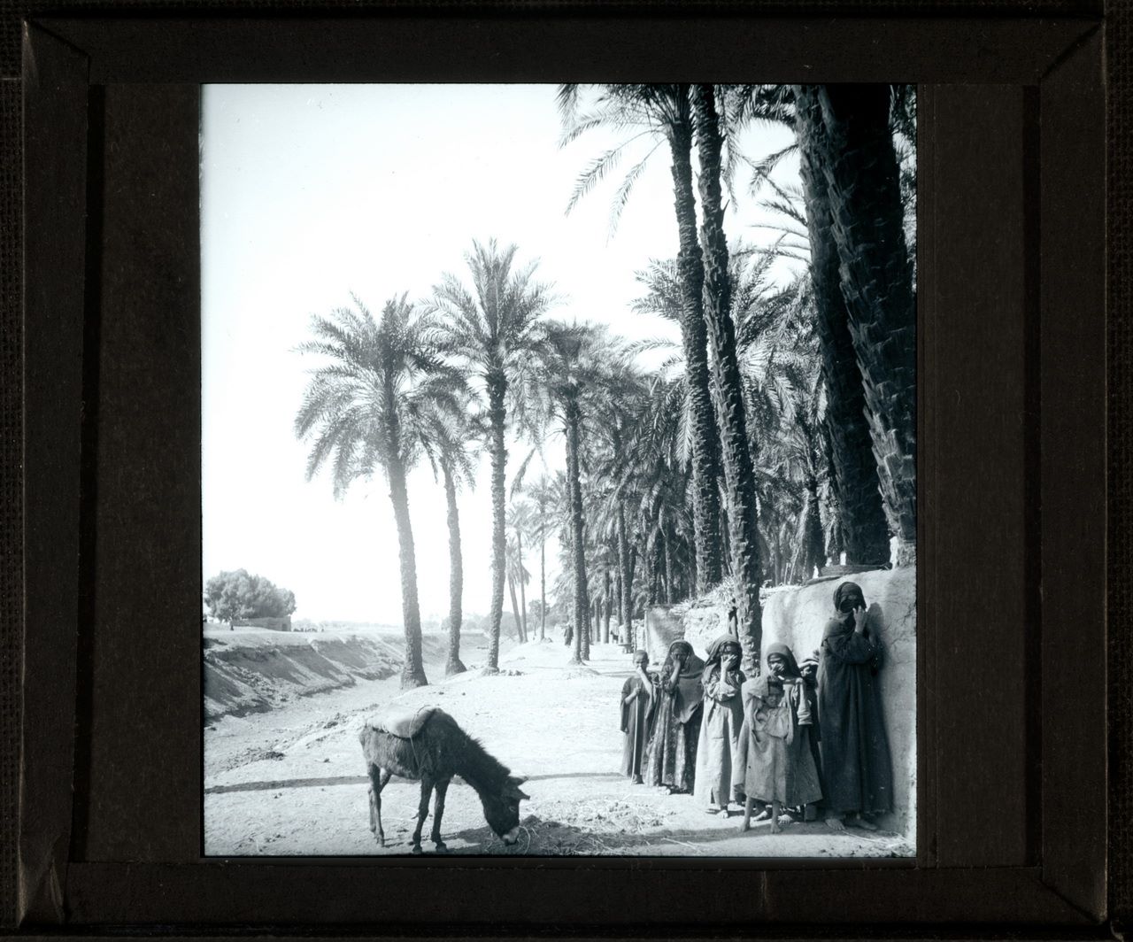 La fotografia ha immortalato un gruppo di egiziani presso l'Oasi di el-Fayoum: una donna con alcuni bambini e un asino su una strada fiancheggiata da palme.