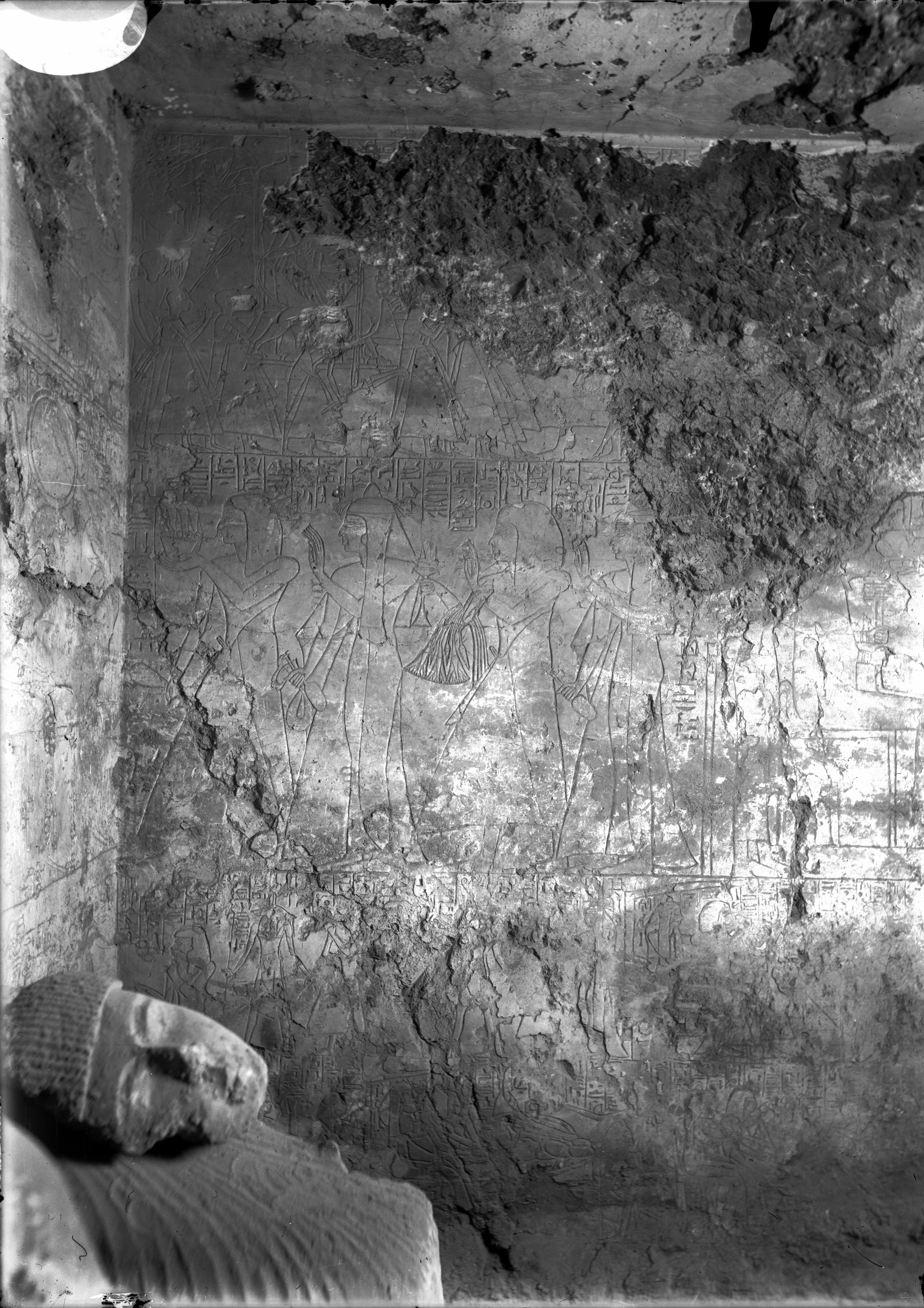 Parete laterale dell’anticamera della tomba di Khabekhnet (TT2). A sinistra, in primo piano, si intravede la statua della coppia, sullo sfondo una scena di processione. Sono visibili quattro registri, di carattere votivo e cultuale.