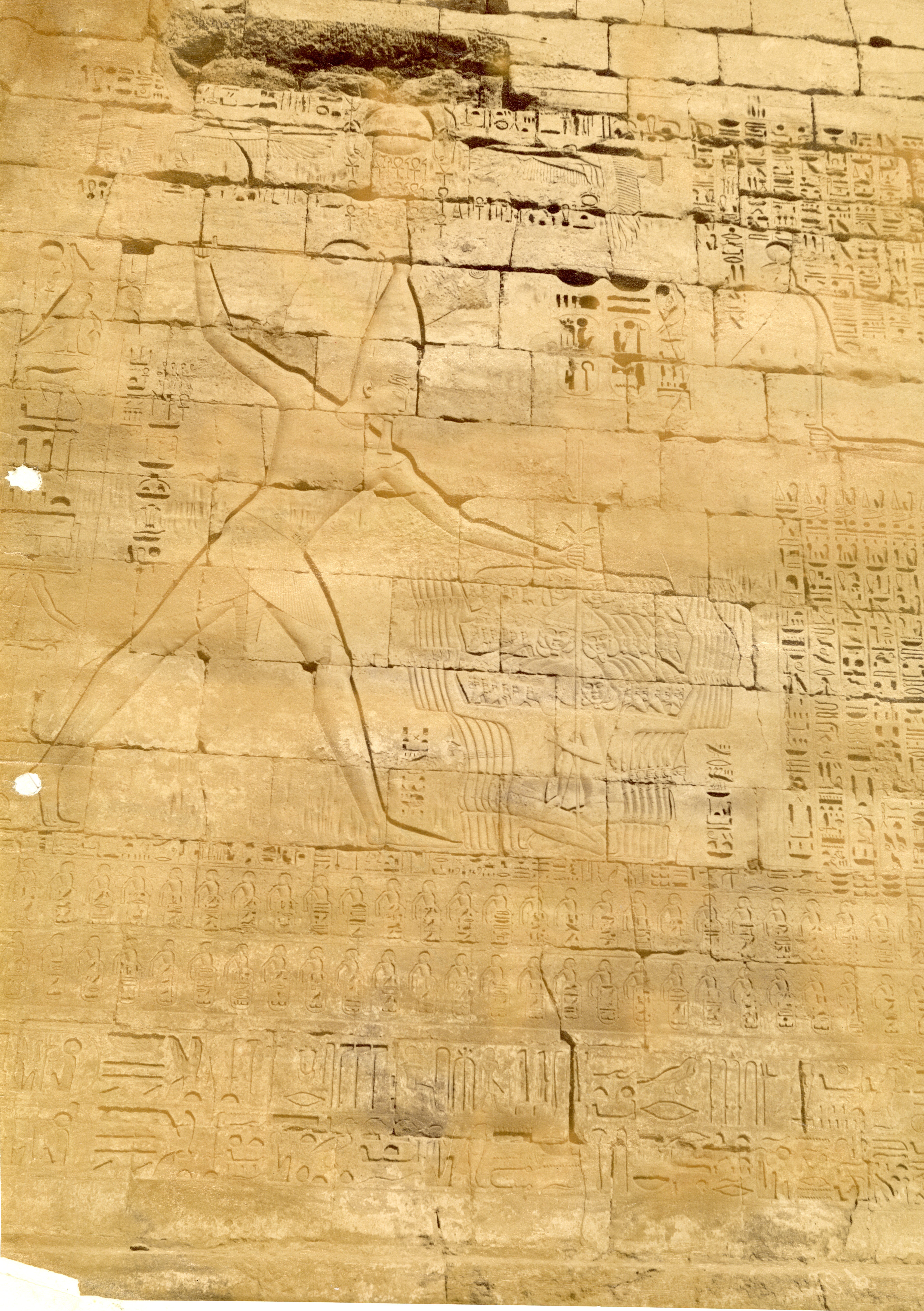 Lo scatto mostra un dettaglio della decorazione del lato sinistro del pilone d'accesso al tempio di Medinet Habu, costruito dal faraone Ramesse III. Il re brandisce la mazza per abbattere i nemici e con la sinistra li tiene per i capelli. Il tema è tipico dei programmi decorativi all'esterno dei templi. La firma dell’autore si trova con grafia speculare in basso a destra, ed è quasi illeggibile.