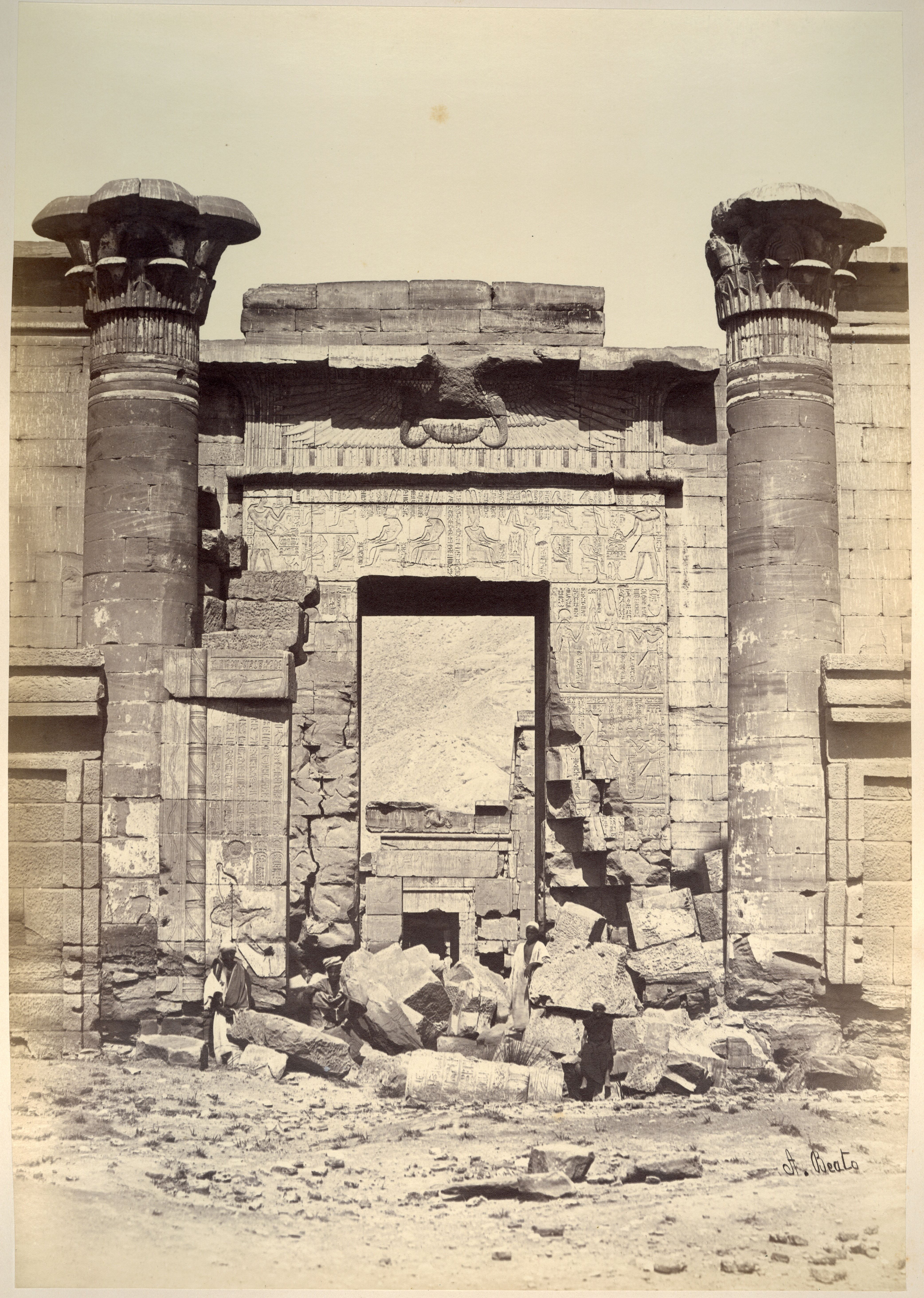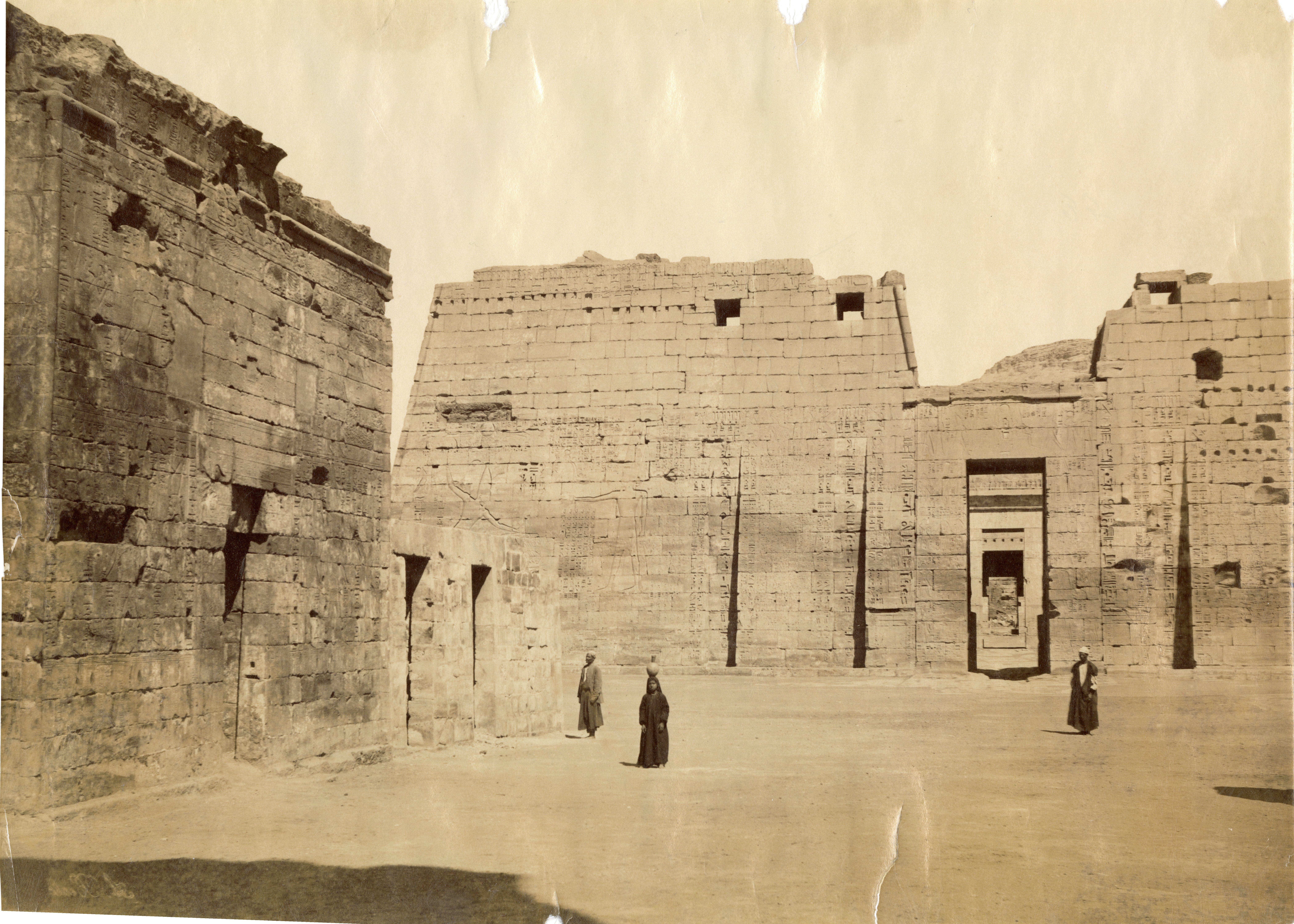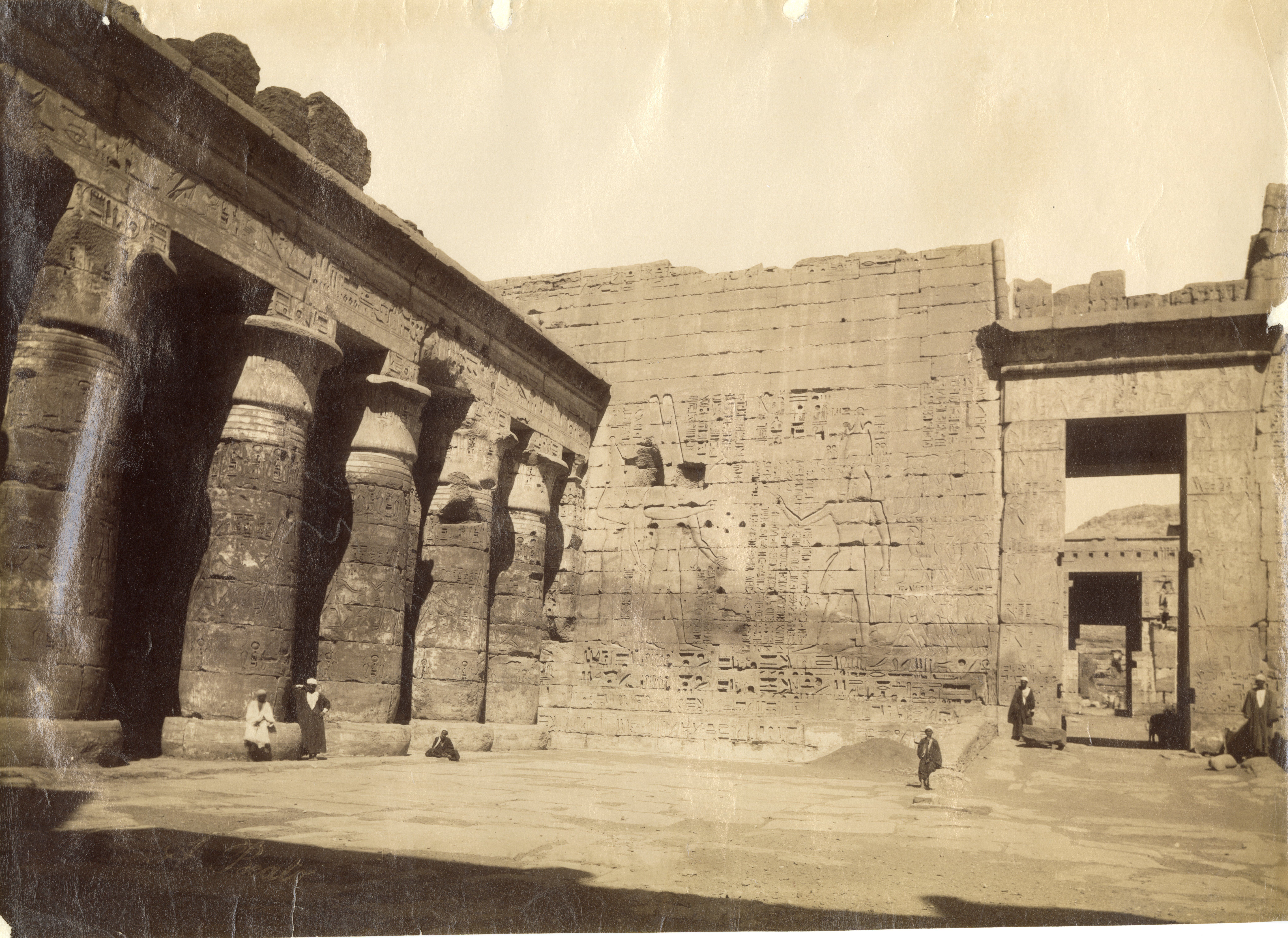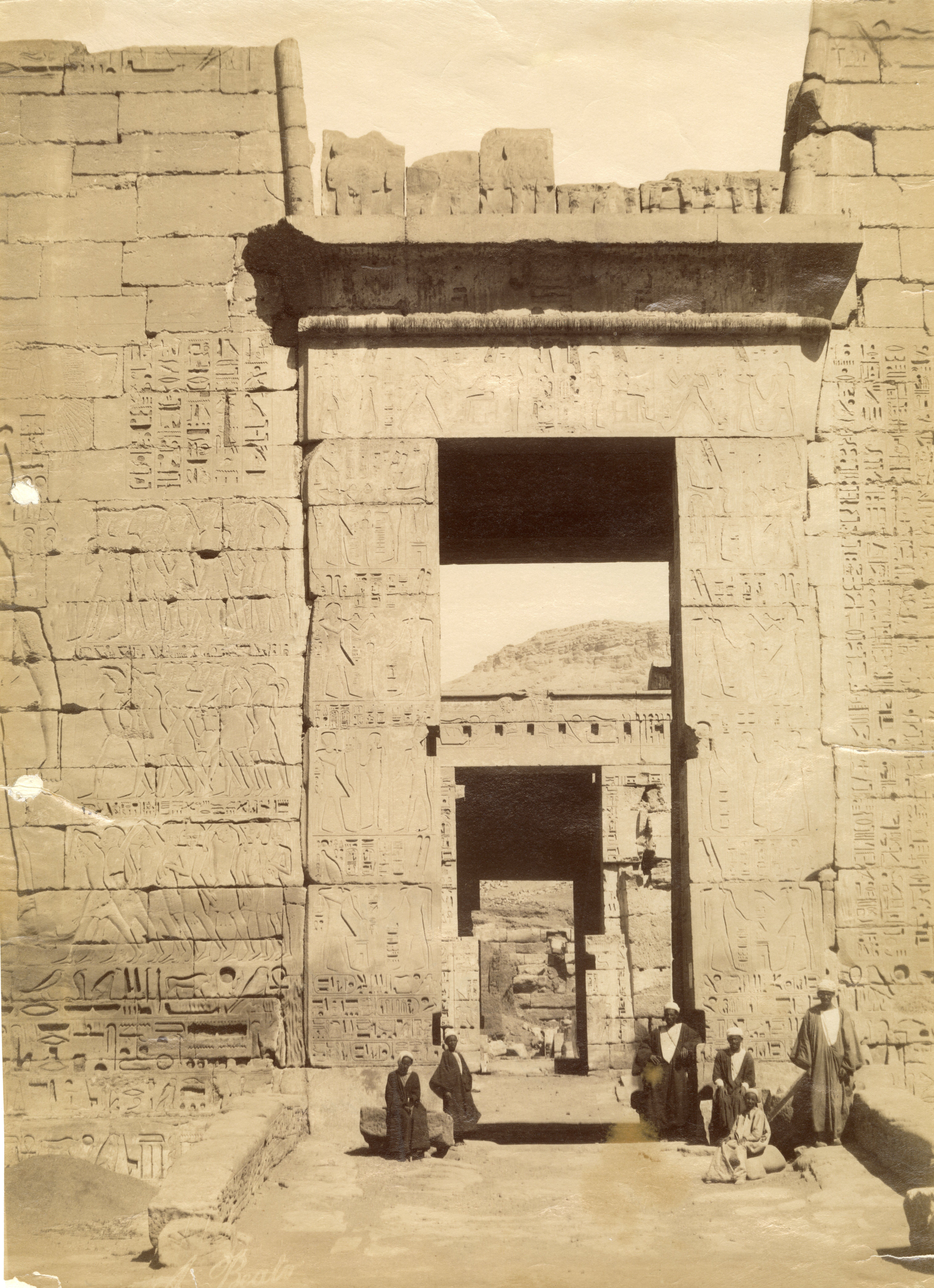 La fotografia mostra tre abitanti del luogo che sostano davanti all’ingresso del cosiddetto Tempio minore, della XVIII dinastia, all’interno del recinto del tempio di Medinet Habu, a Tebe Ovest, costruito dal faraone Ramesse III, della XX dinastia. I portali dell’ingresso, tuttavia, furono costruiti in Epoca tarda e in Età tolemaica. Fotografia scattata dopo la pulizia e restauro del portale. La firma dell'autore è posta in basso a sinistra, a specchio.