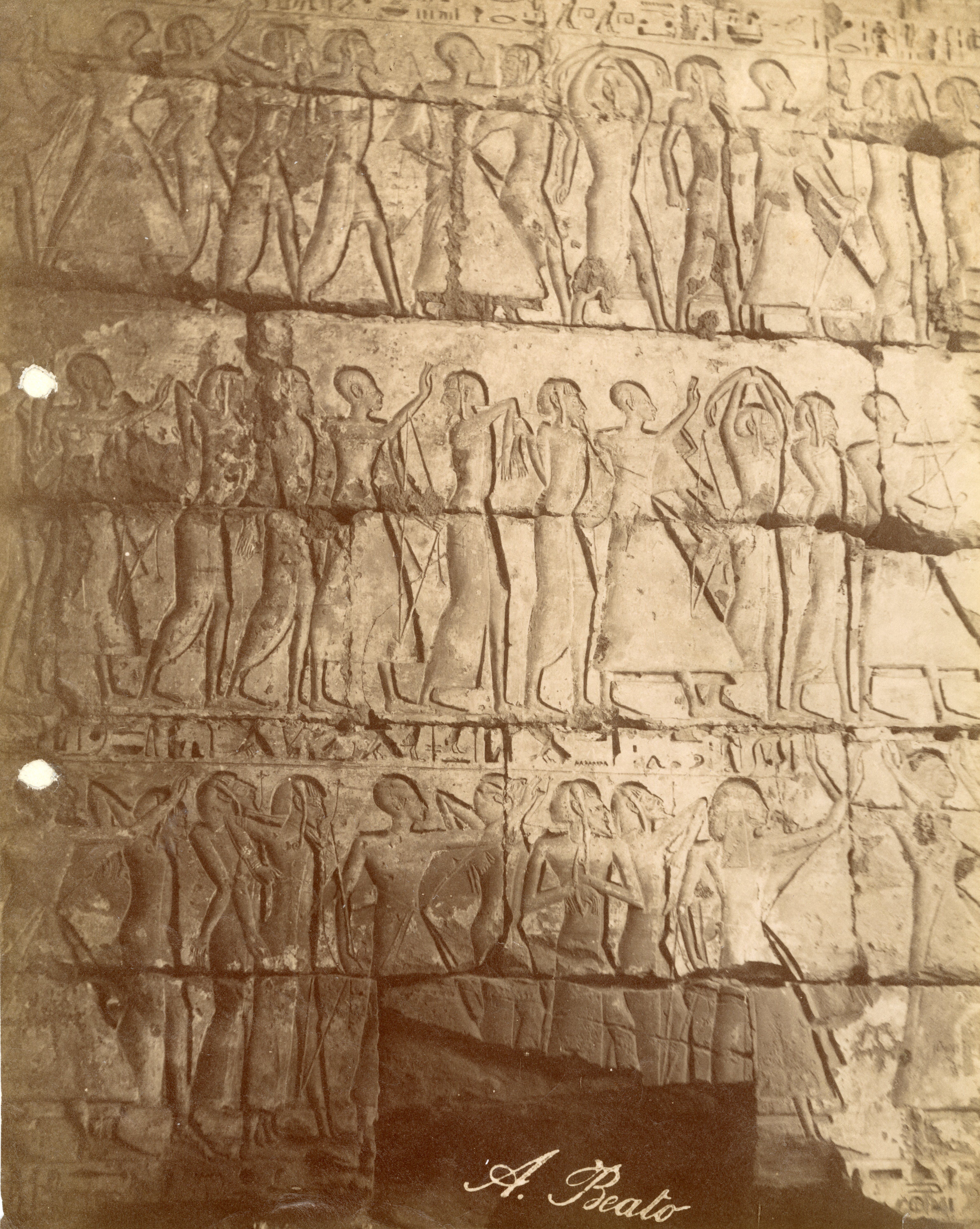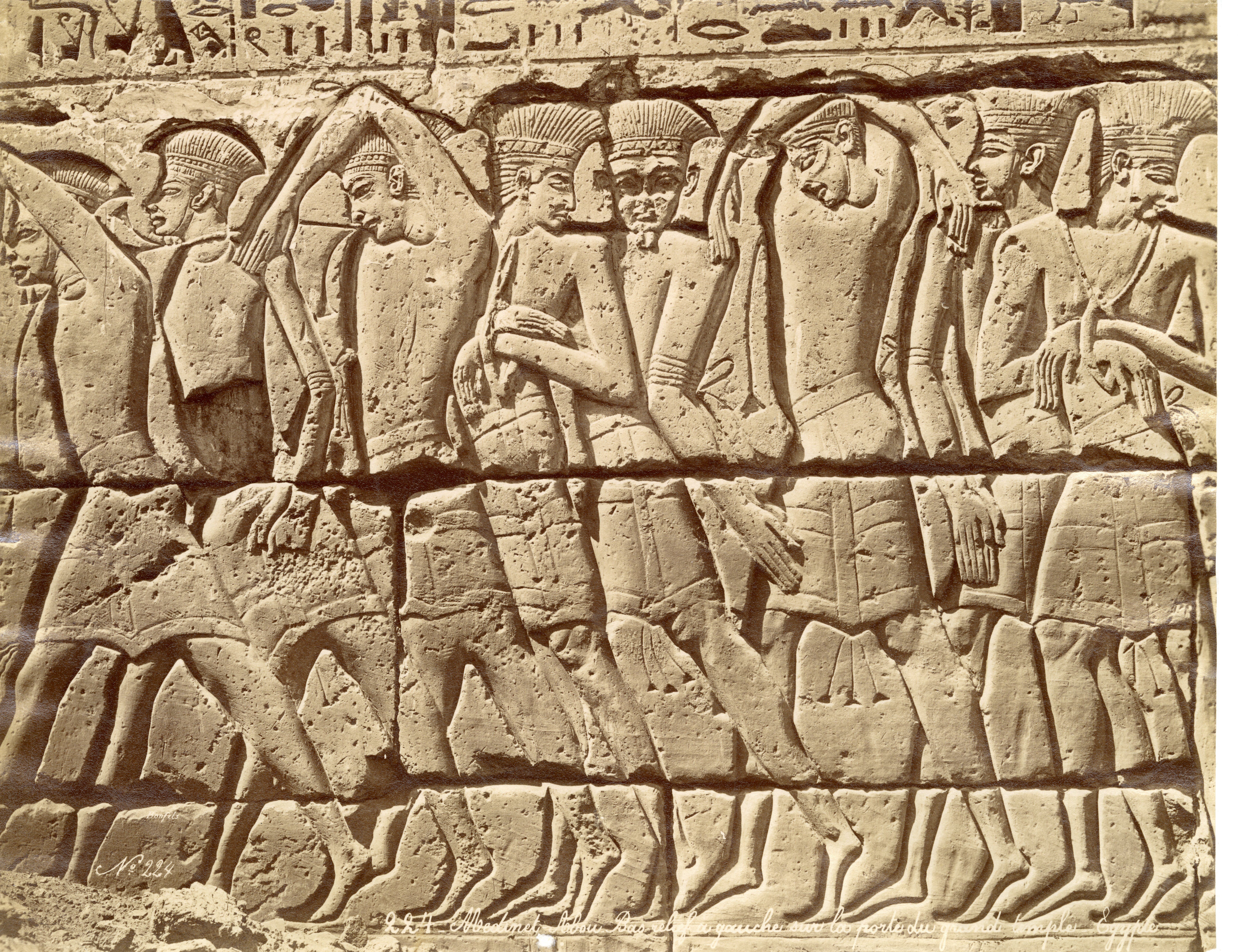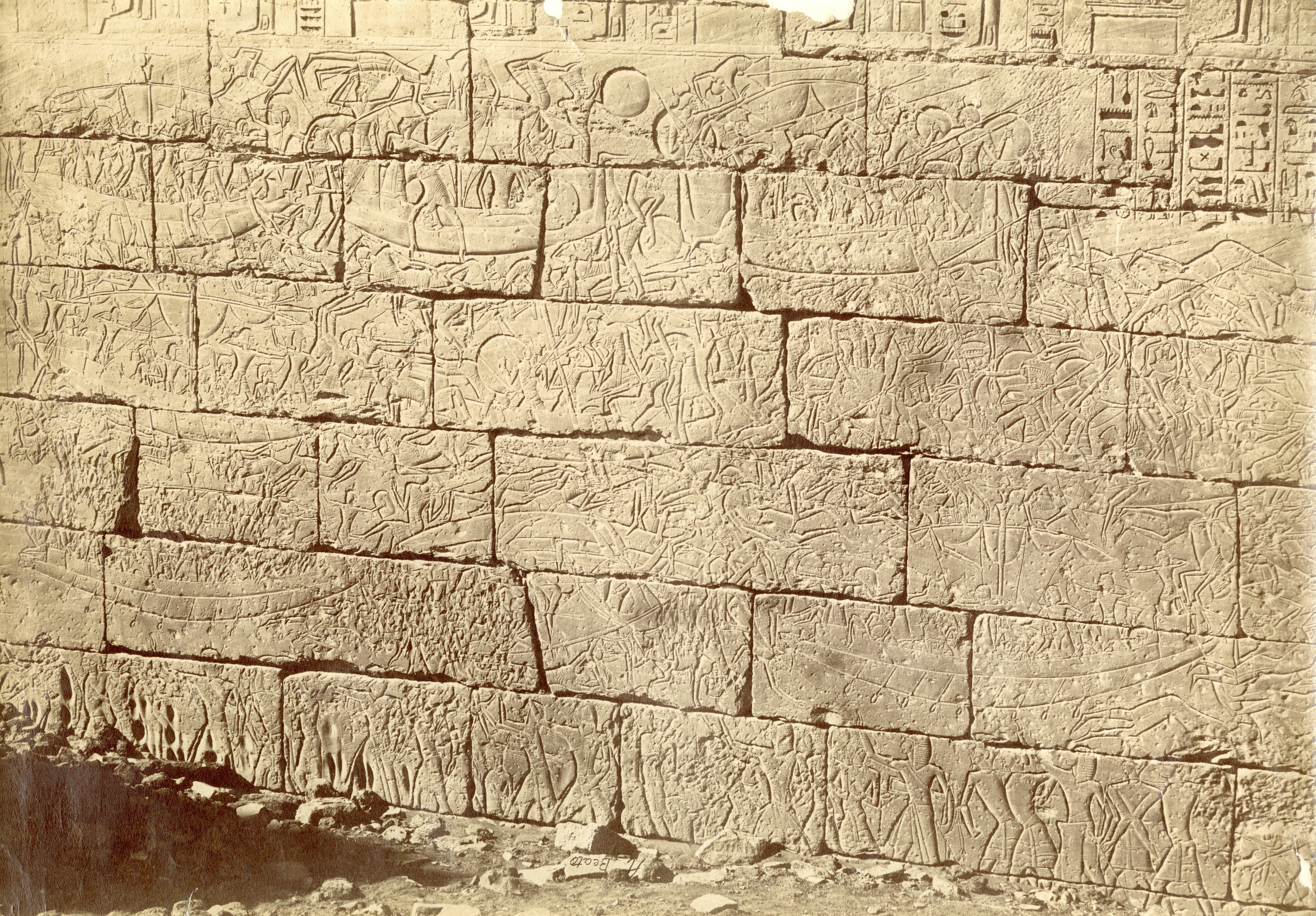 La fotografia ritrae alcune scene di guerra sulle pareti esterne del tempio funerario di Ramesse III a Medinet Habu, contro I Libici (esterno I pilone, torre nord, lato ovest). In basso a destra si legge la firma dell'autore, a specchio.