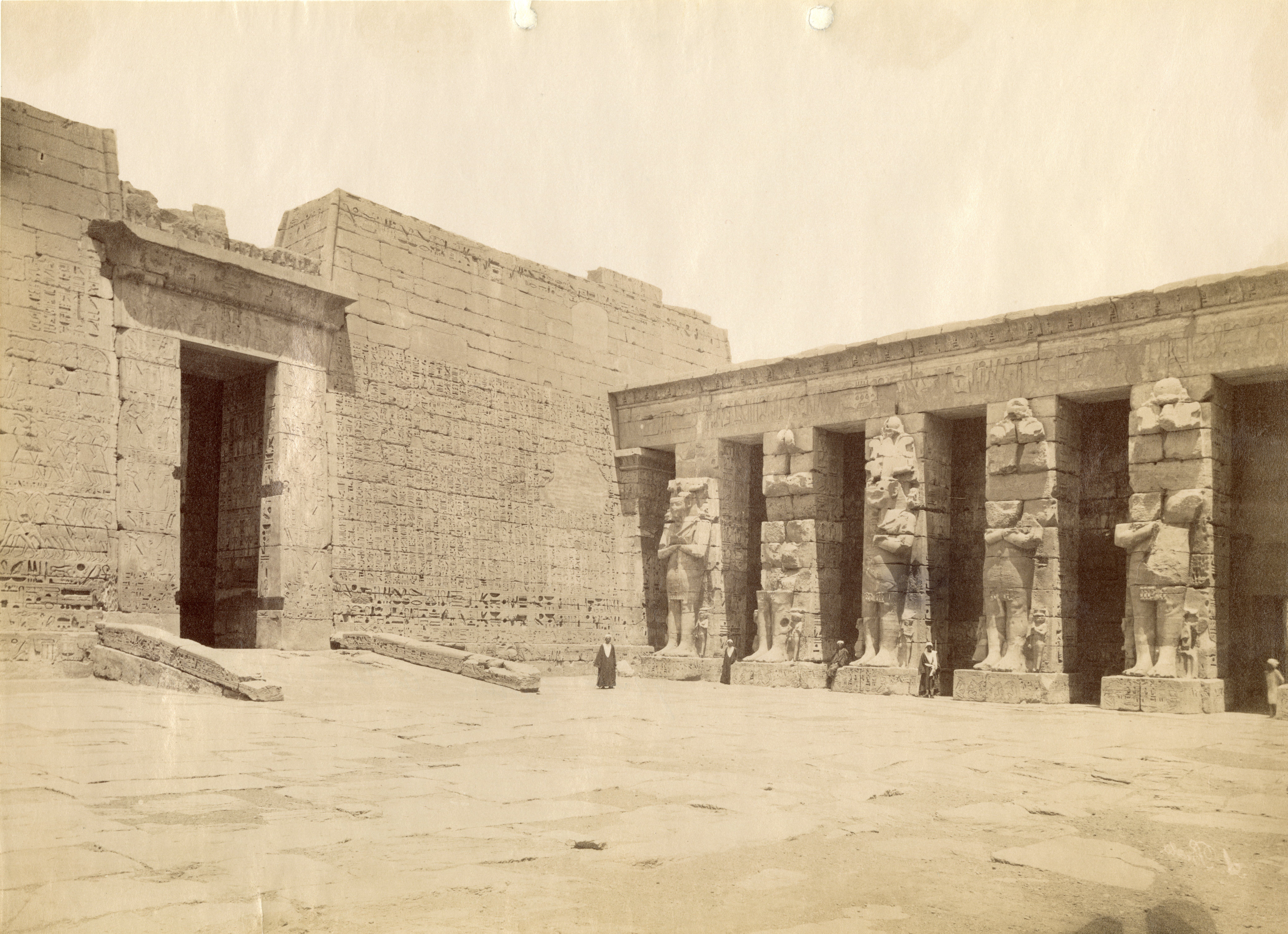 Nella fotografia è rappresentato il lato nord-orientale del primo cortile del complesso templare di Medinet Habu a Tebe Ovest, costruito da Ramesse III, in cui spiccano le statue addossate ai pilastri del faraone Ramesse III. Due abitanti locali posano per mostrare le dimensioni colossali delle statue. Verso la parte di sinistra la fotografia risulta leggermente sfocata.
