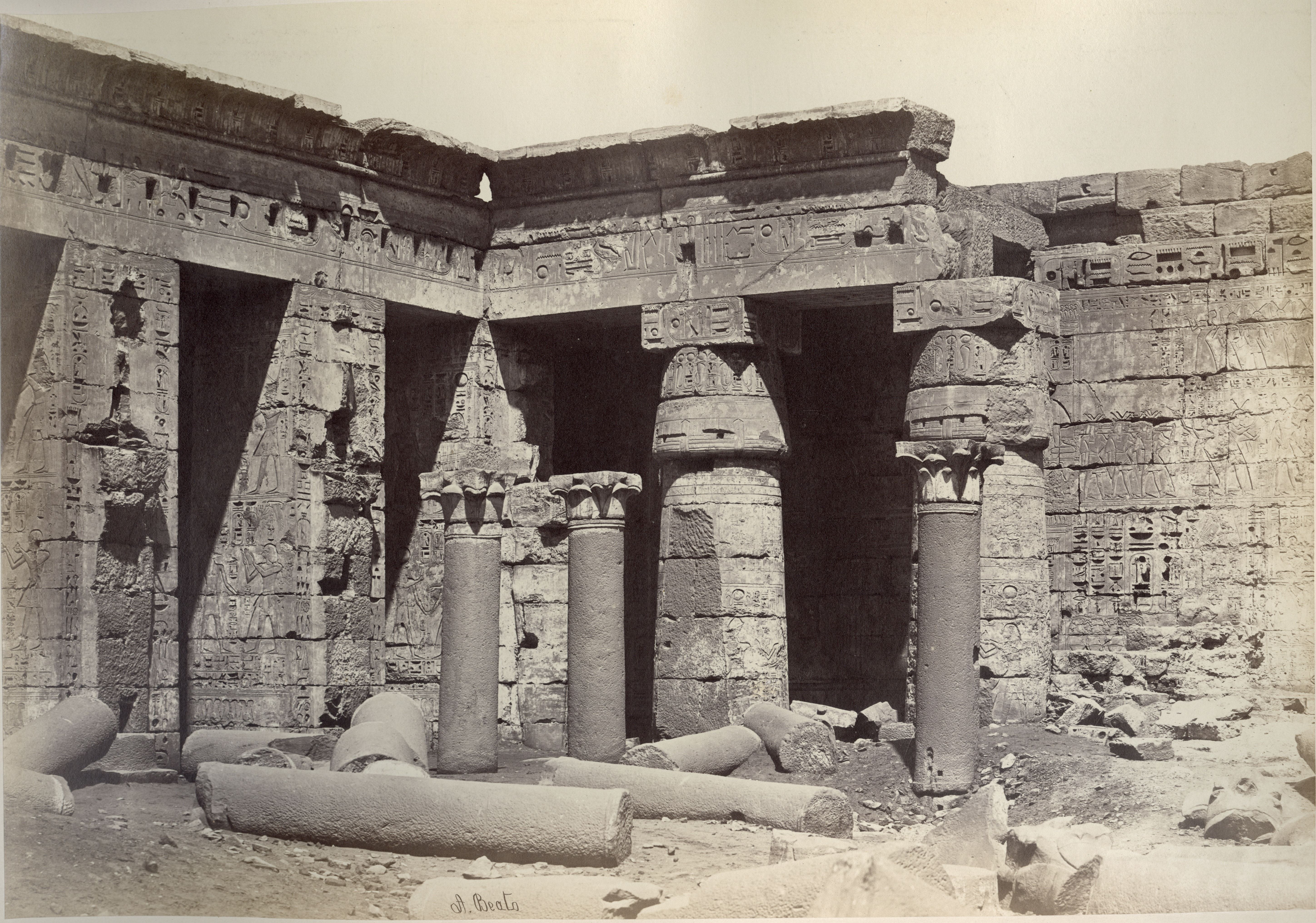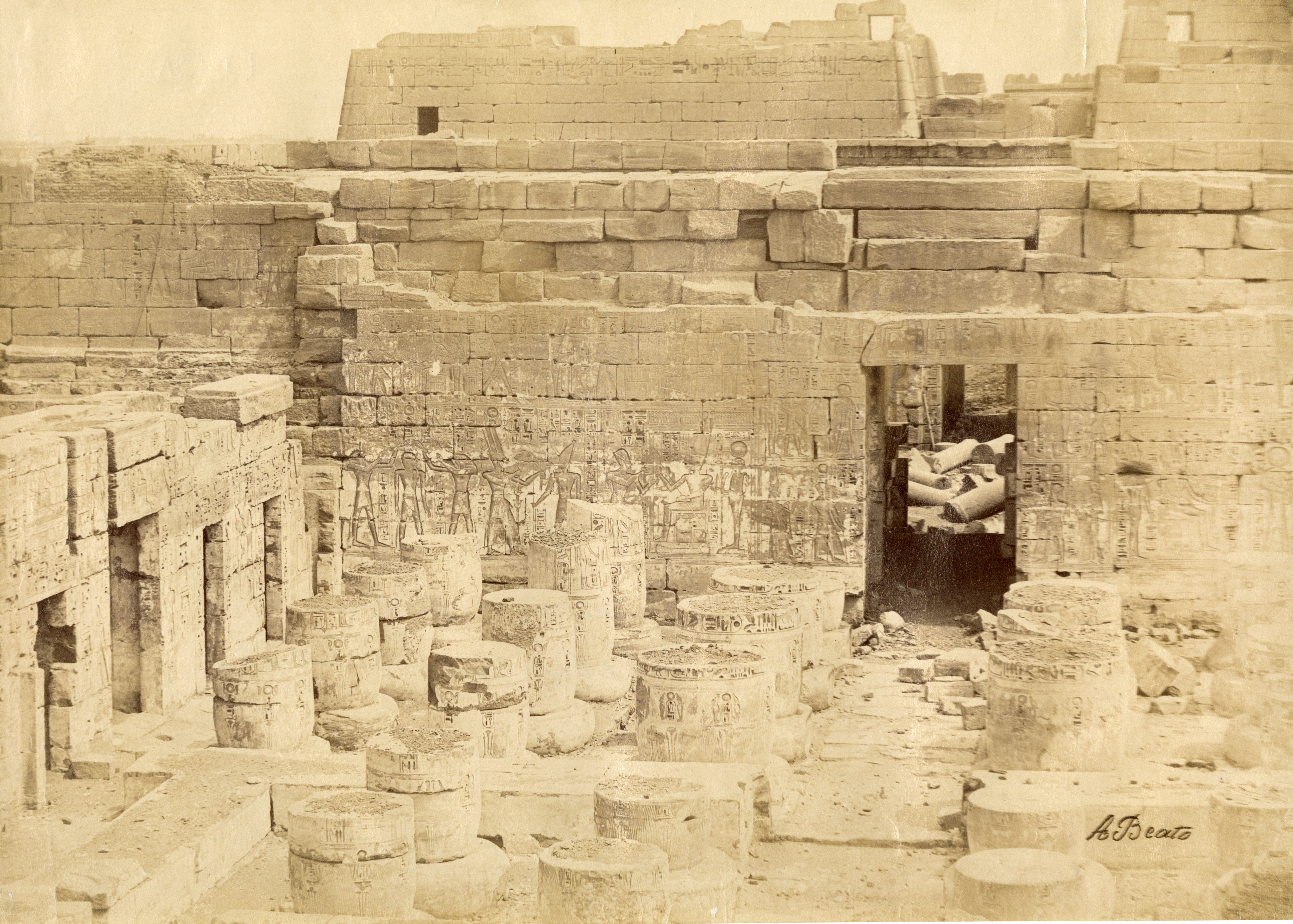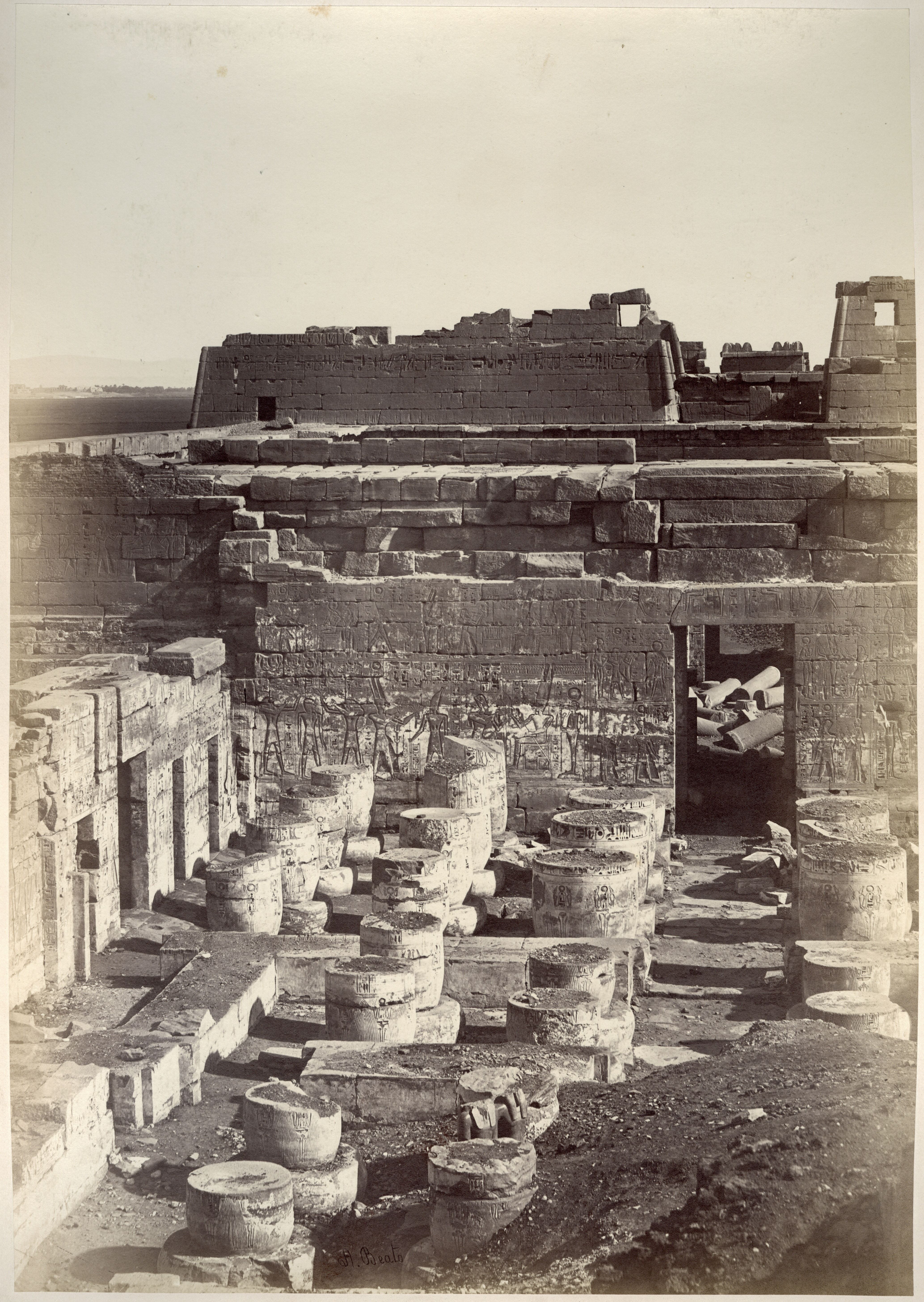 Veduta della seconda corte del tempio di Medinet Habu, costruito dal faraone Ramesse III sulla riva ovest del Nilo, a Tebe. Si notano ancora numerose colonne a terra, e le colonne papiriformi stanti ancora parzialmente interrate, indizi che dimostrano la data dello scatto, prima dei lavori di pulizia e restauro del sito. In basso a sinistra si trova la firma dell’autore.