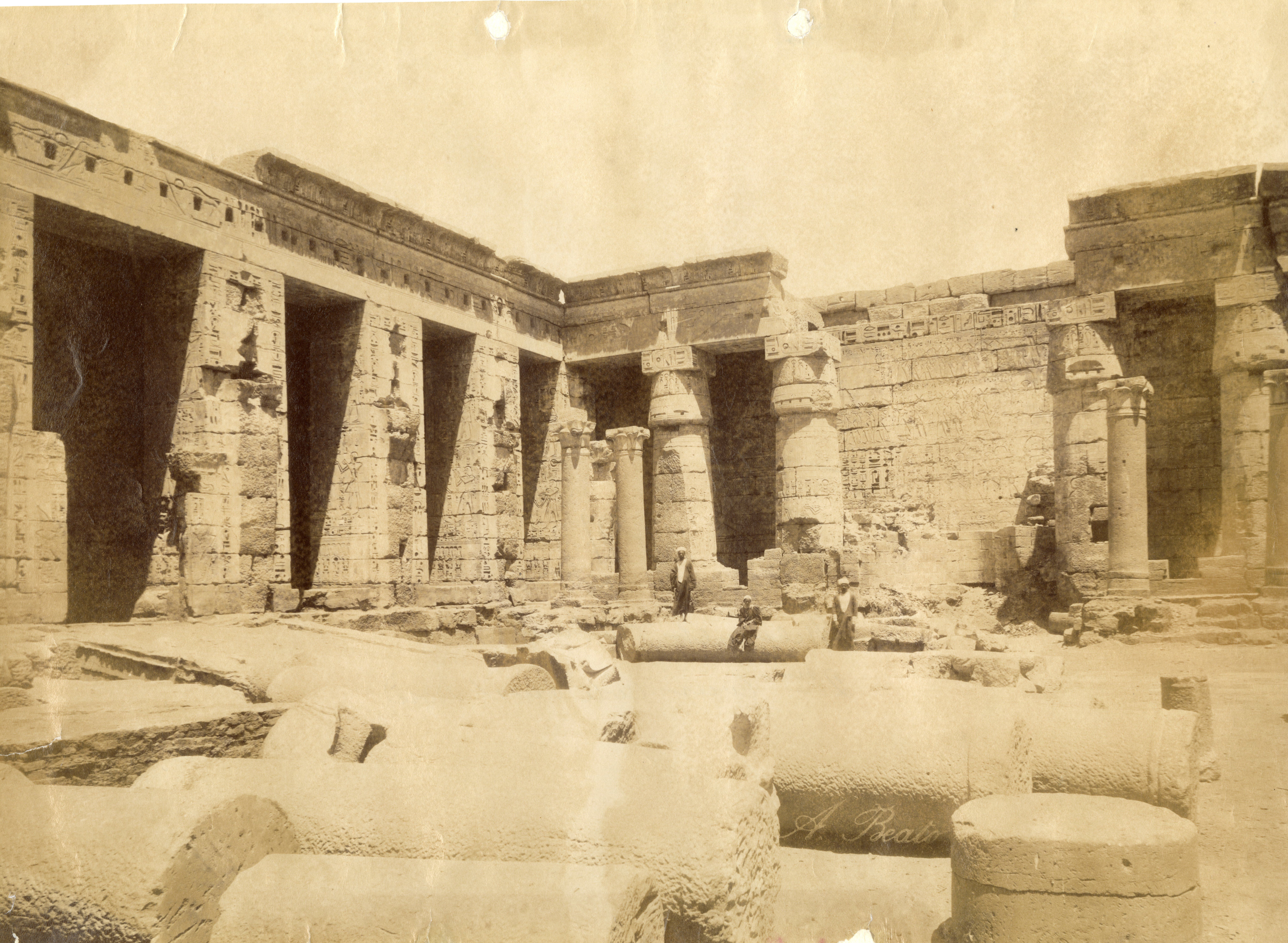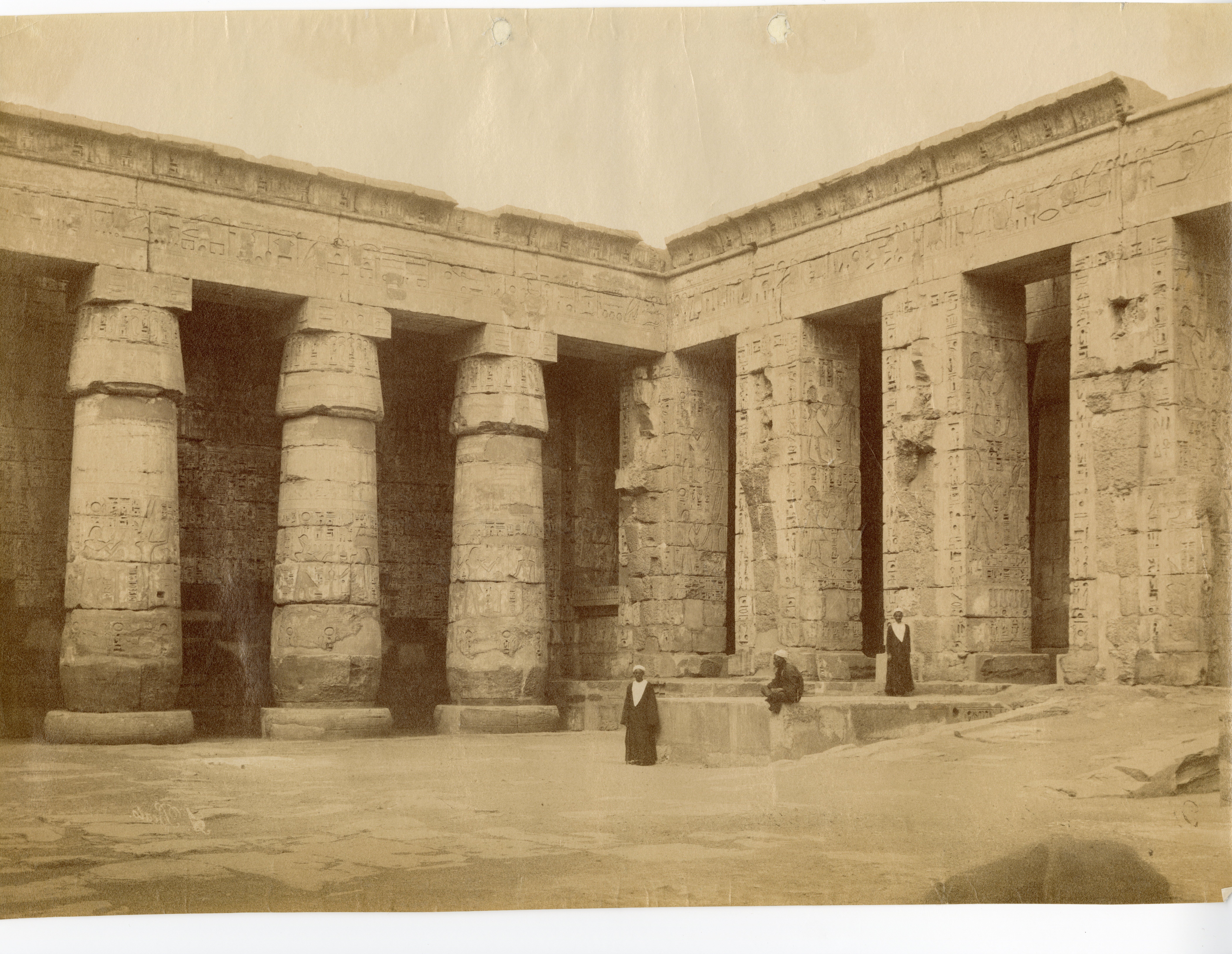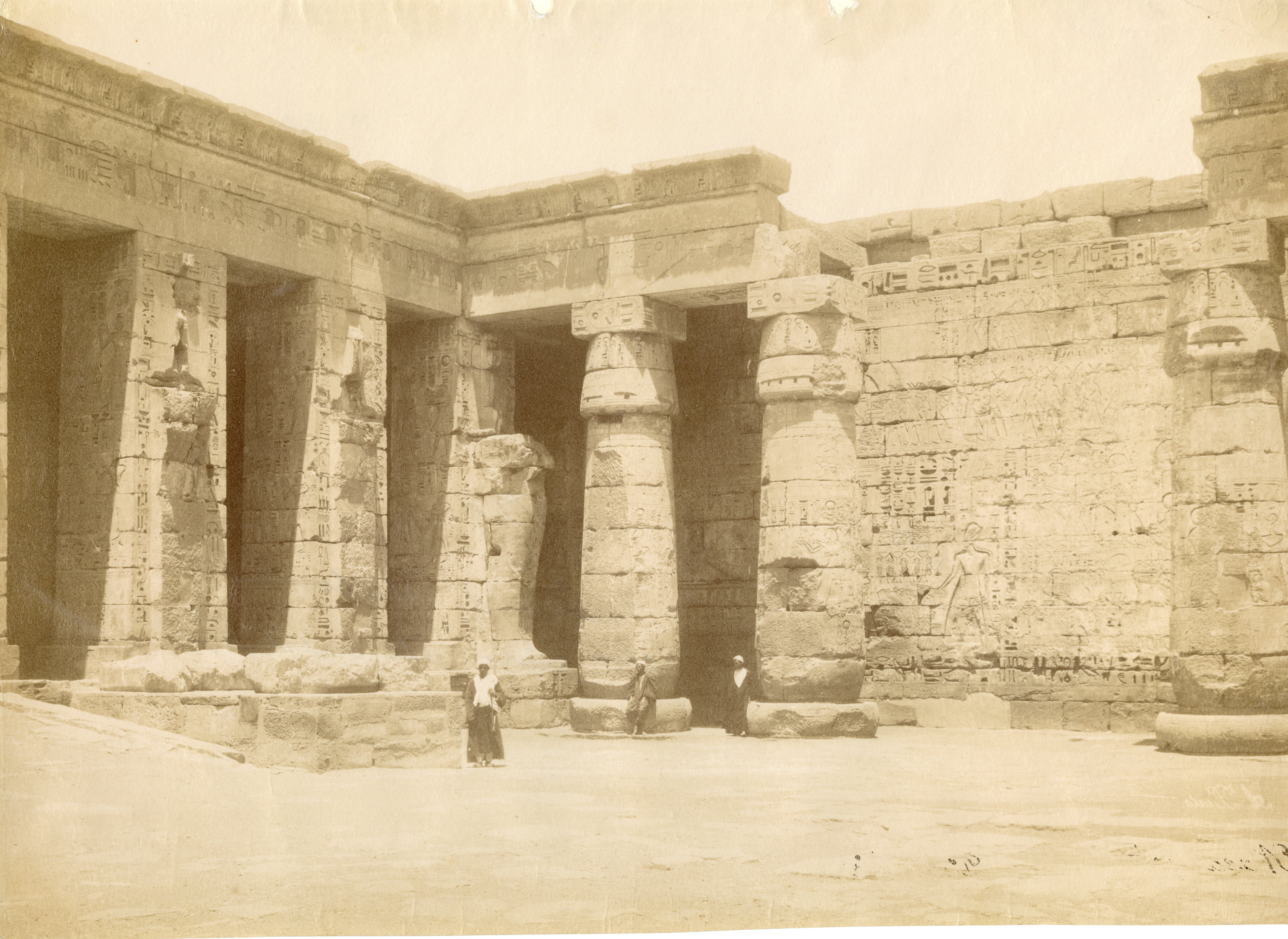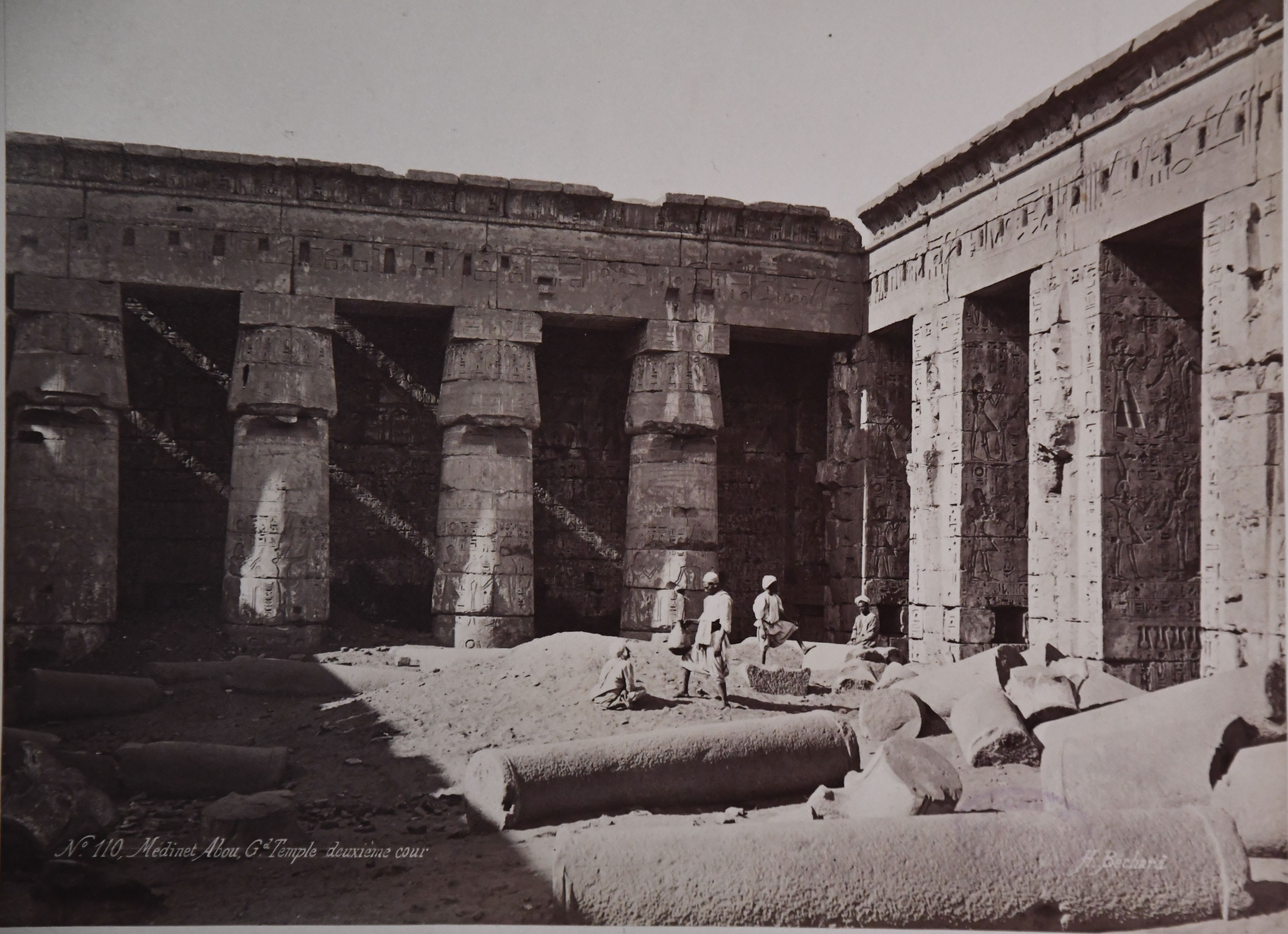 Nella fotografia si scorge una veduta dell'angolo nord-orientale del secondo cortile del tempio di Medinet Habu a Tebe Ovest, costruito da Ramesse III, con tre abitanti del luogo in posa tra le colonne, tagliate e ancora a terra in mezzo al cortile, prima che venisse ripulito. La firma dell'autore è posta in basso a destra.