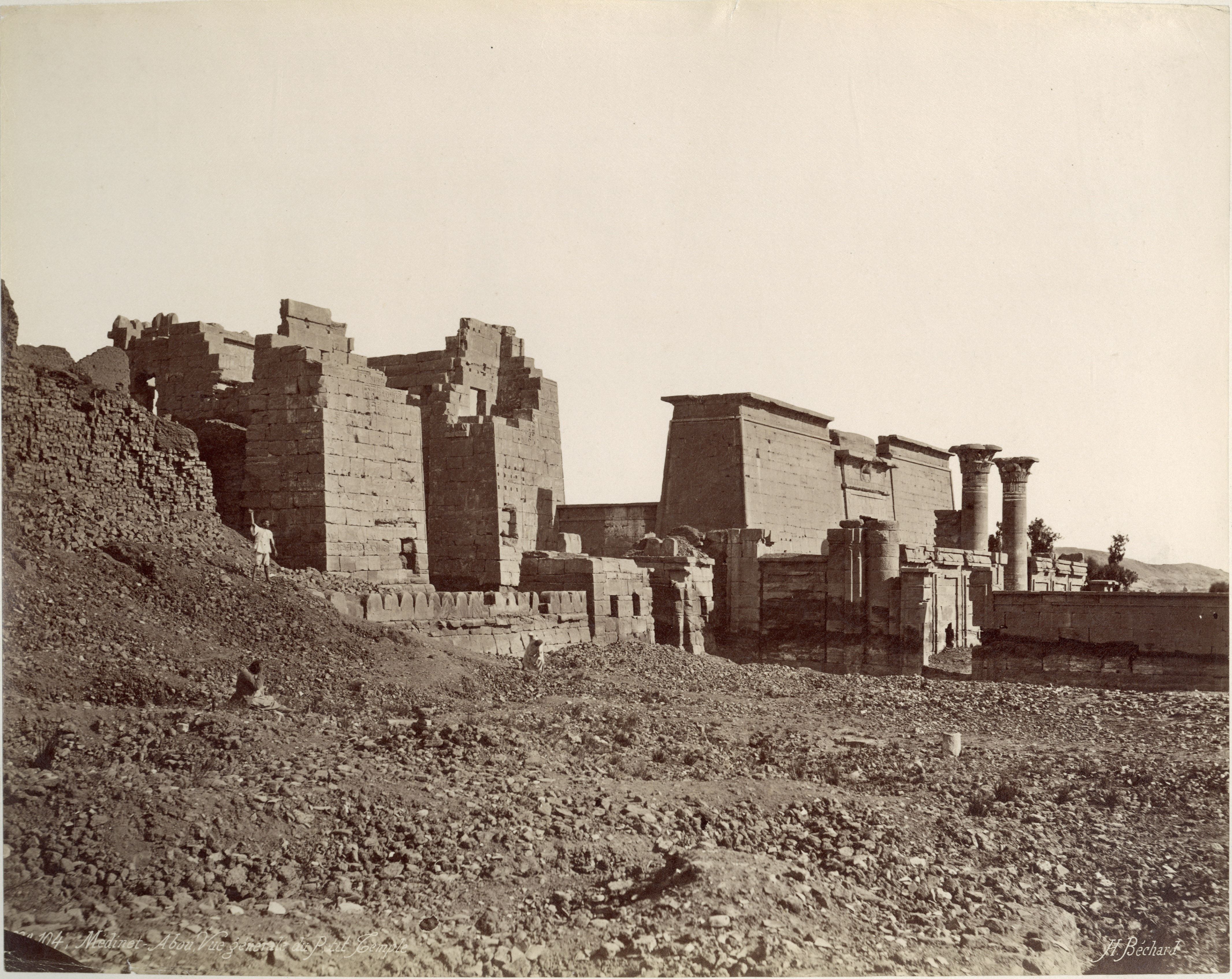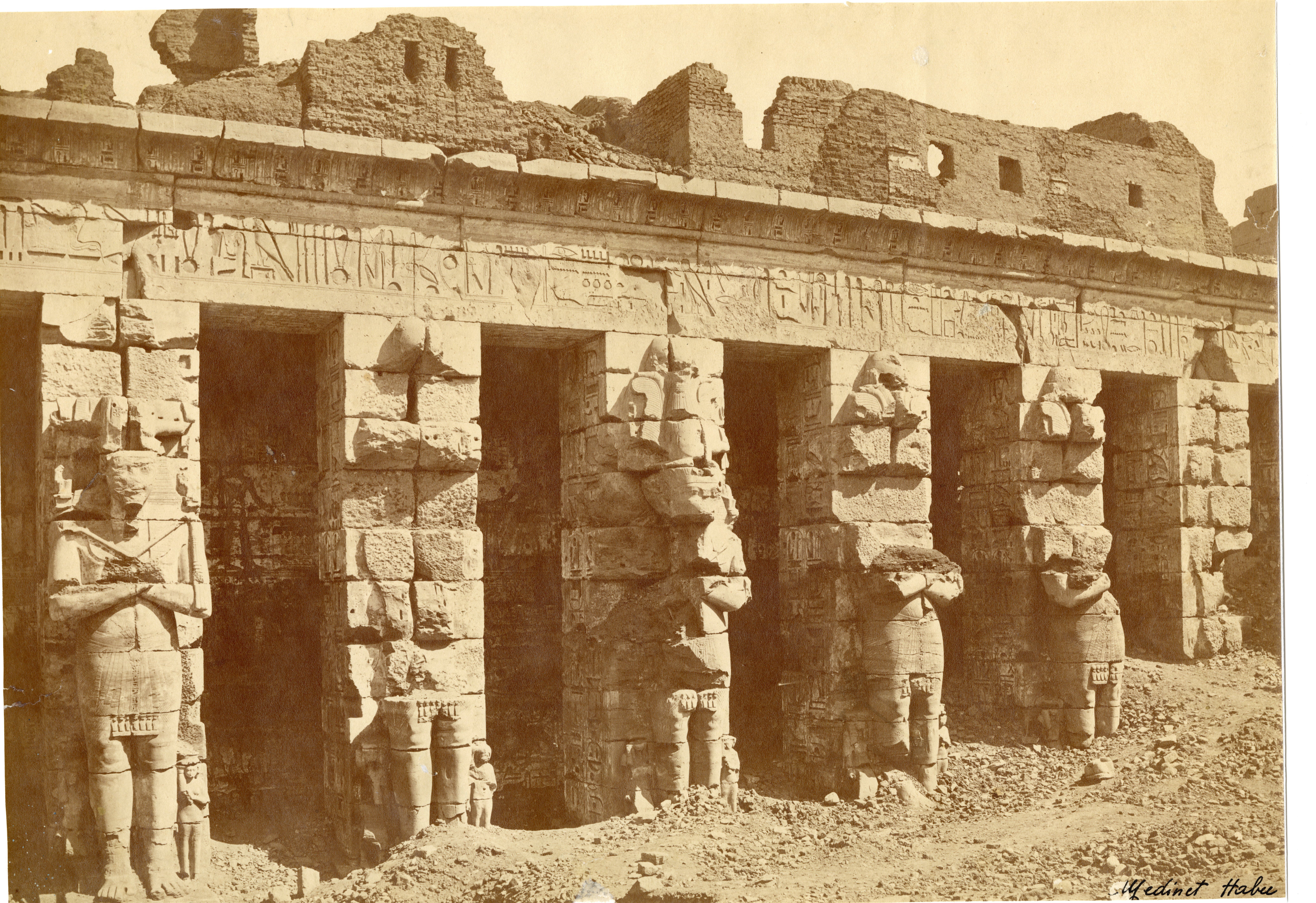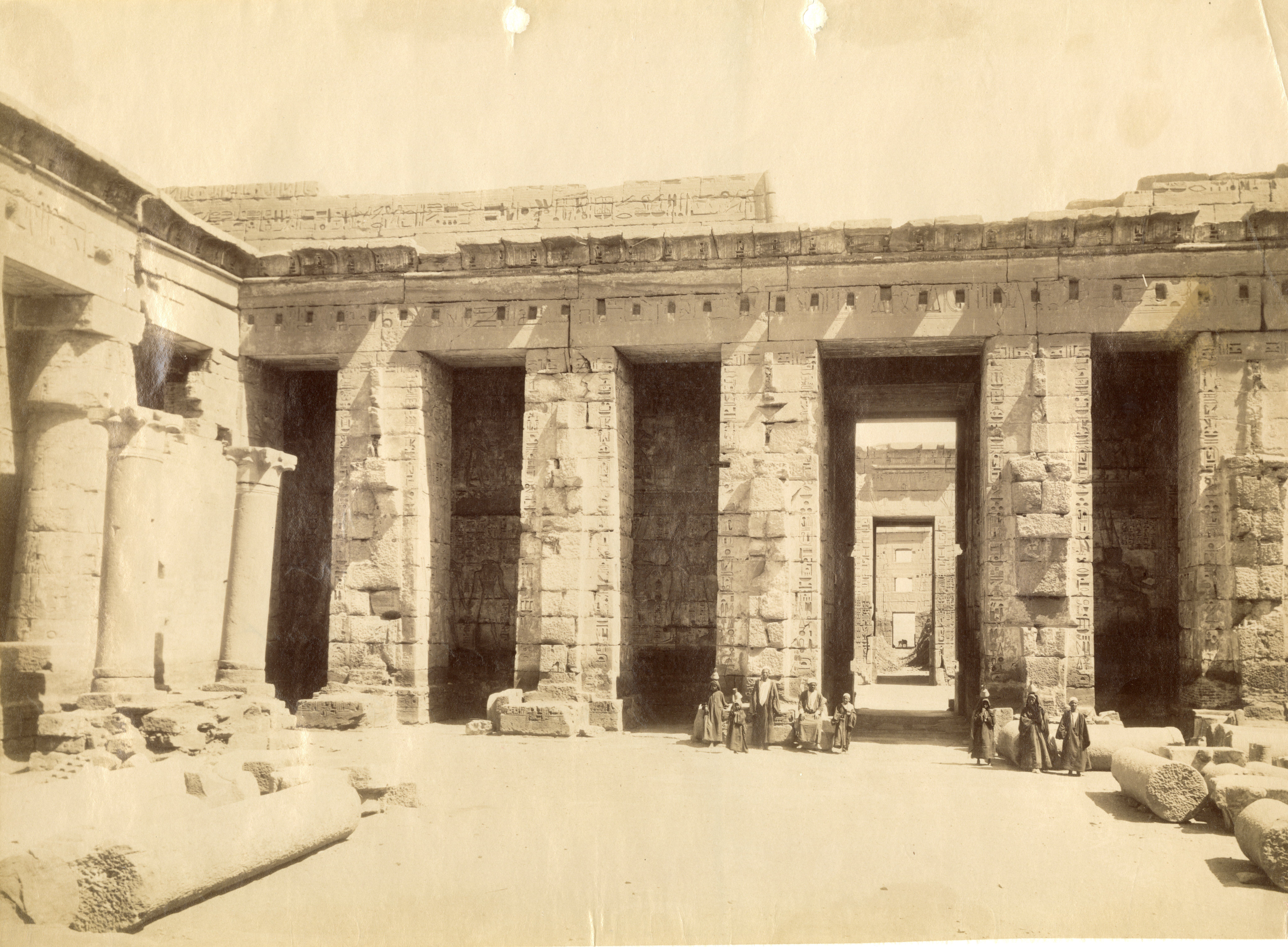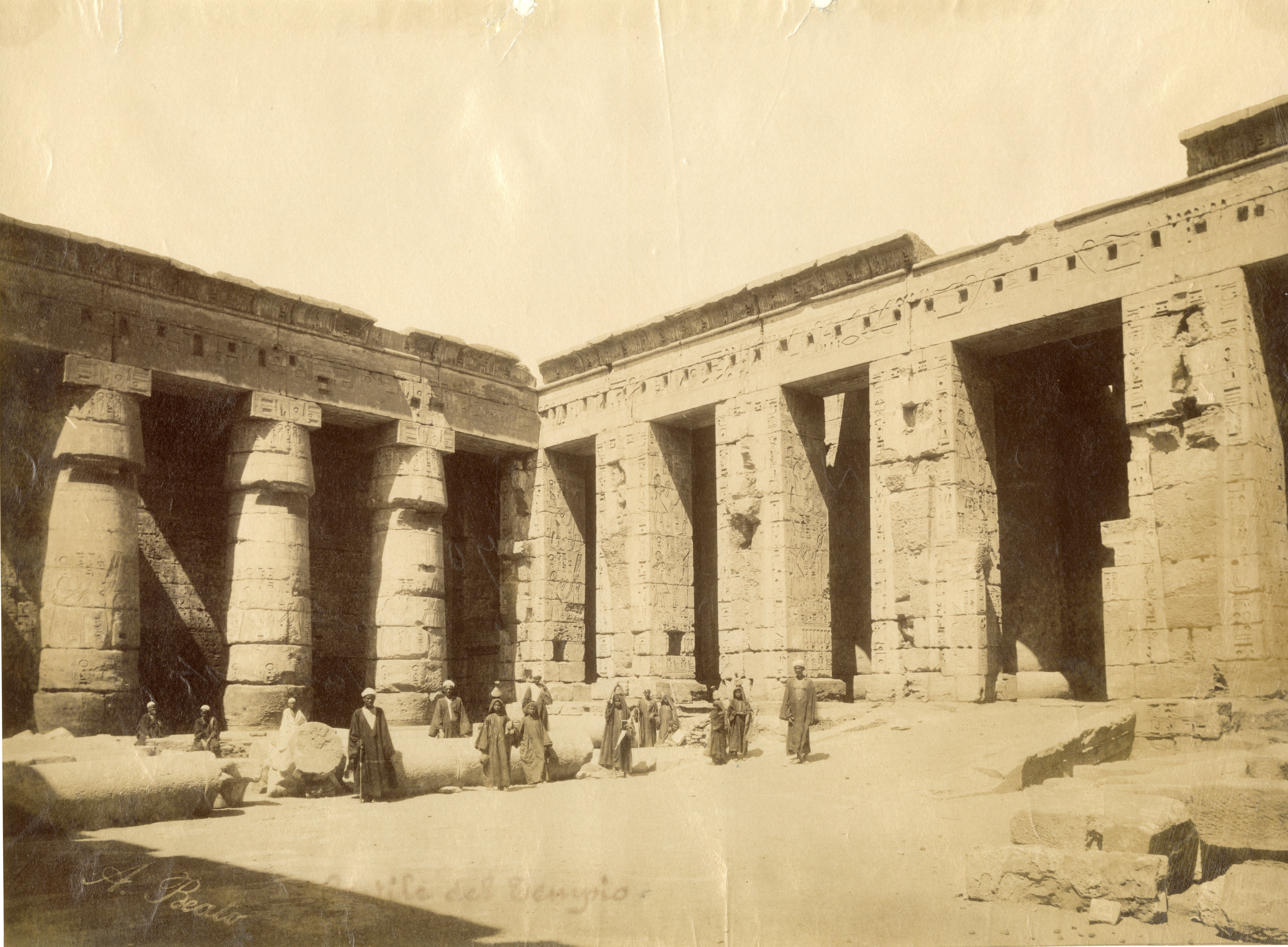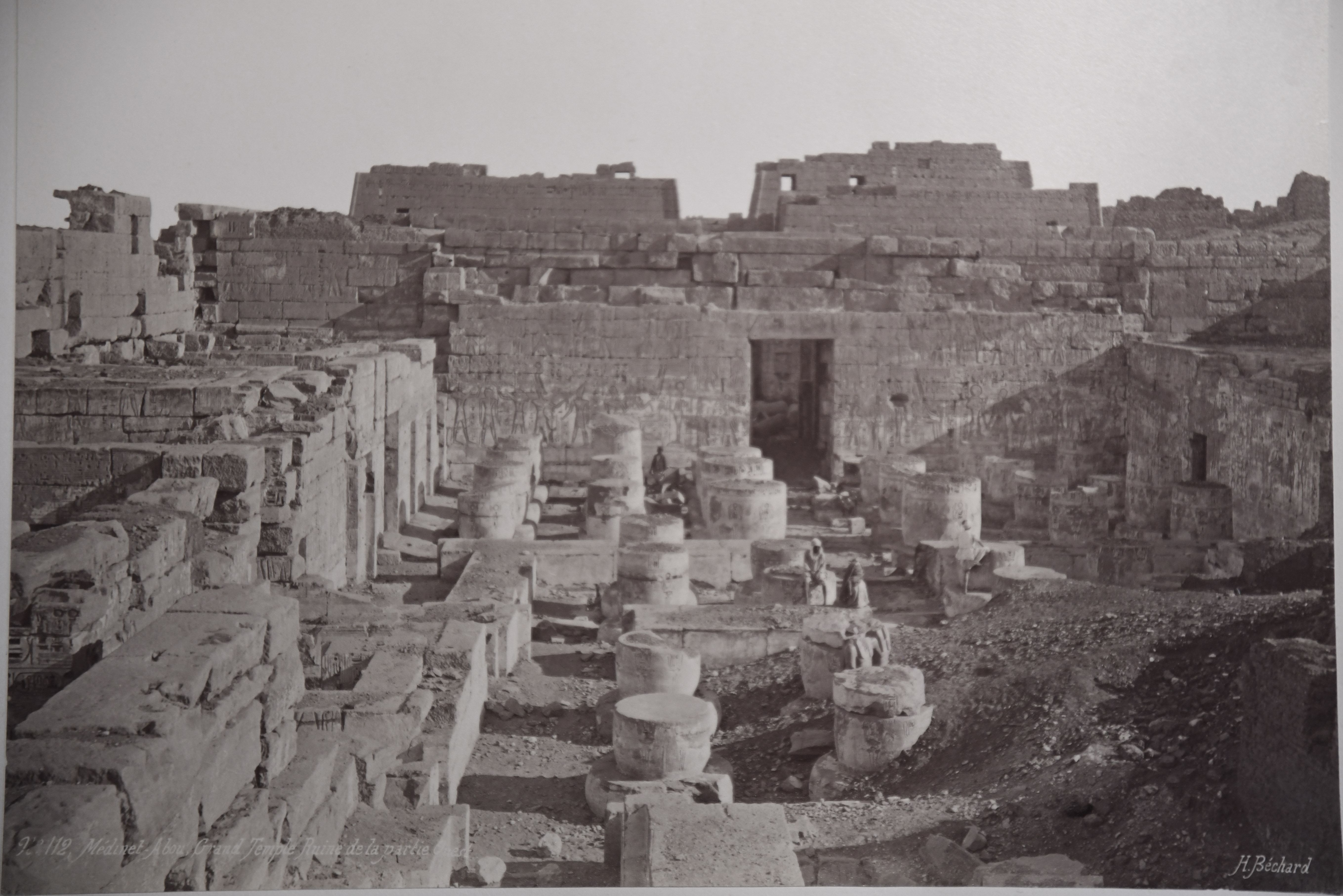 Nella fotografia si scorge una veduta dell'angolo nord-orientale del secondo cortile del tempio di Medinet Habu a Tebe Ovest, costruito da Ramesse III, con tre abitanti del luogo in posa tra le colonne, tagliate e ancora a terra in mezzo al cortile, prima che venisse ripulito. La firma dell'autore è posta in basso a destra.