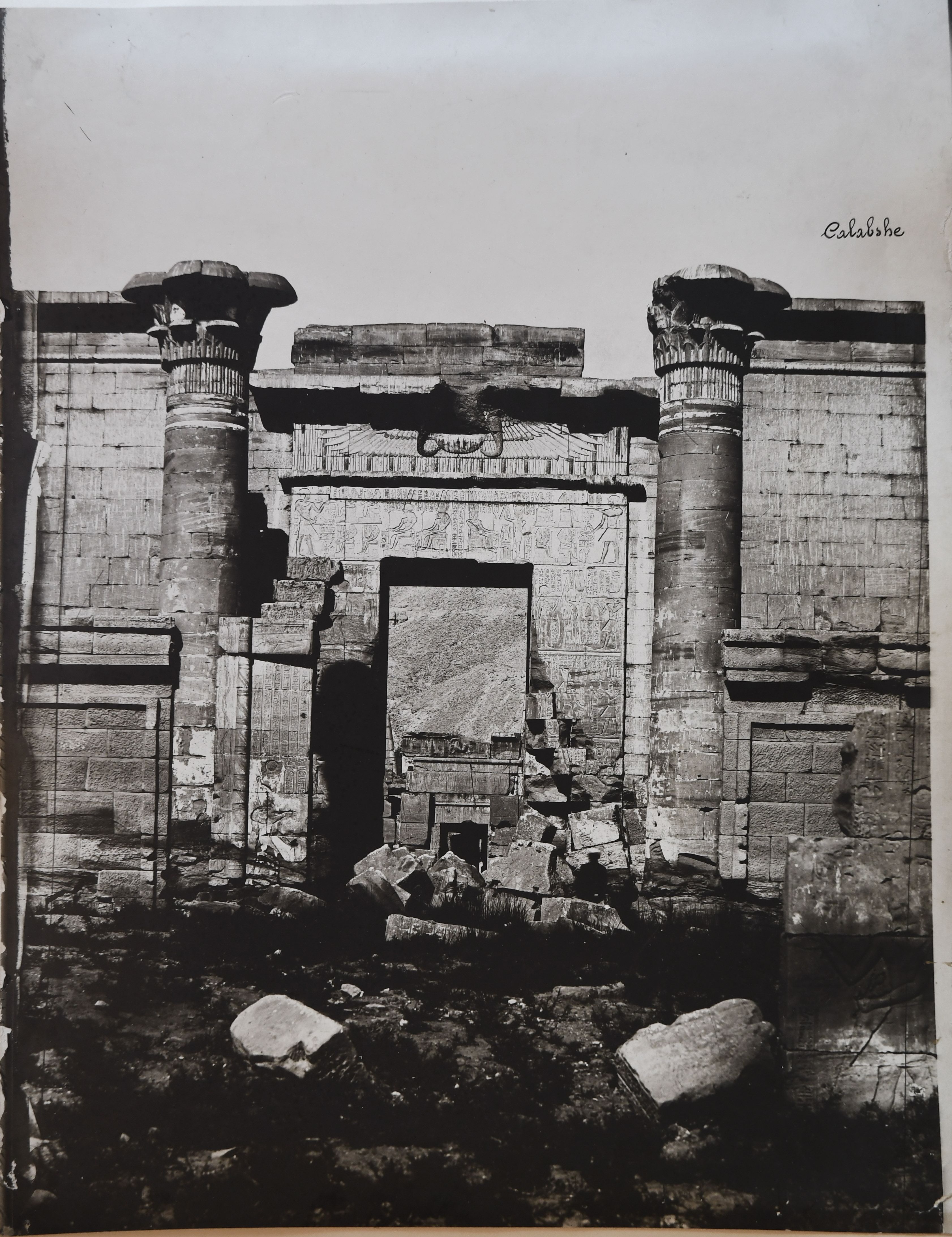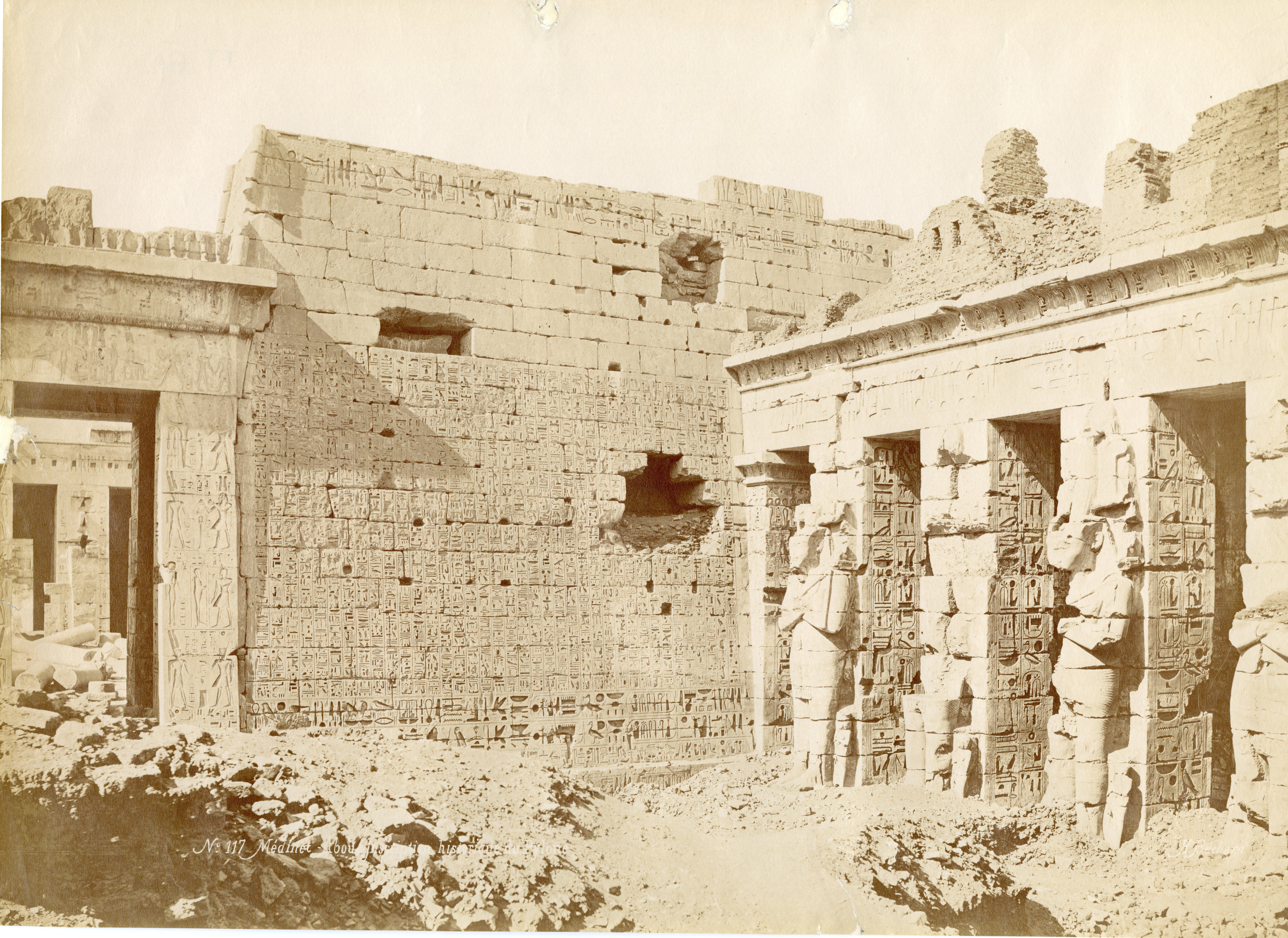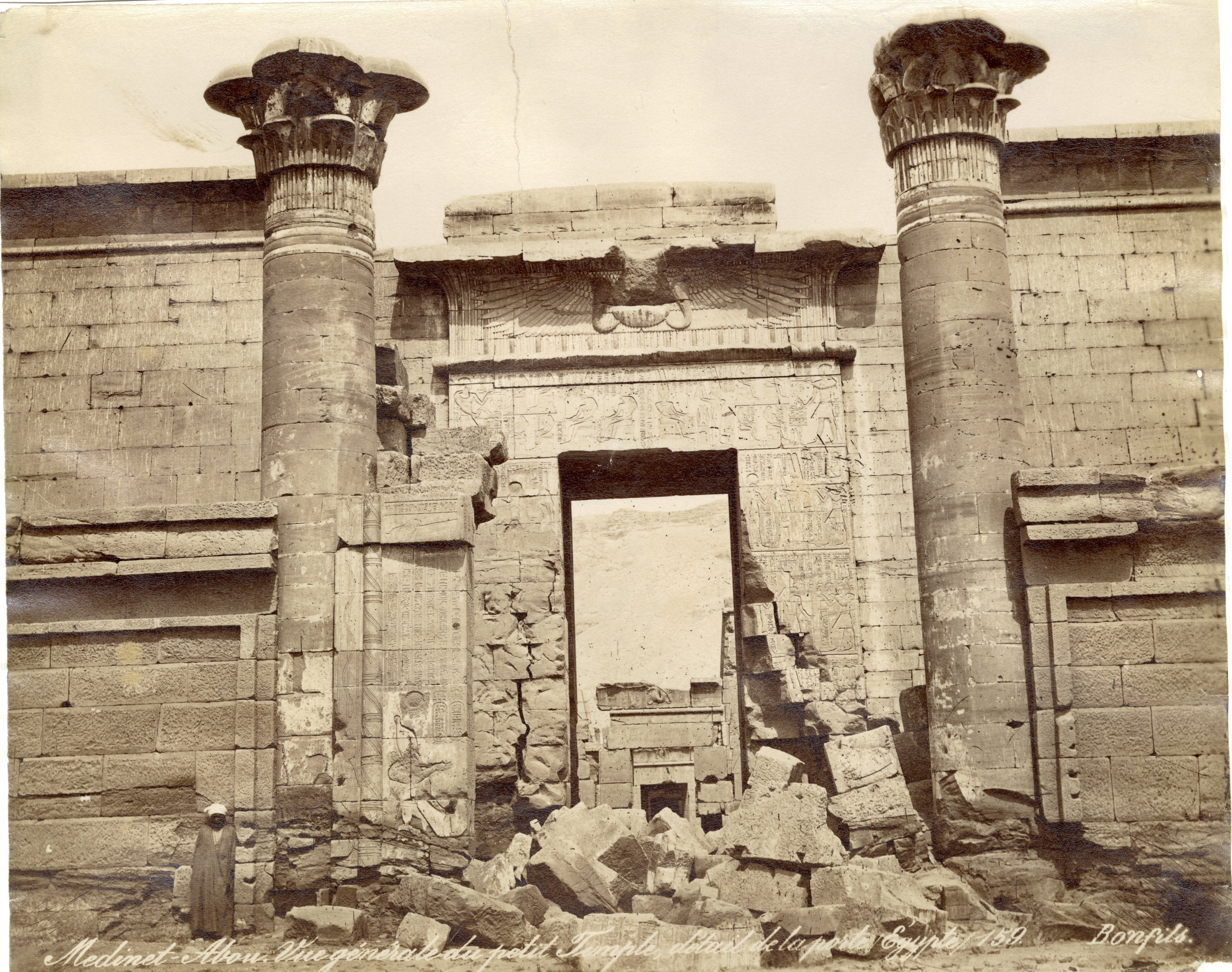 Nella fotografia è rappresentato l’ingresso nel primo cortile del cosiddetto Tempio minore, della XVIII dinastia, all’interno del recinto del tempio di Medinet Habu, sulla riva occidentale del Nilo, a Tebe Ovest, costruito dal faraone Ramesse III, della XX dinastia. Fotografia scattata prima dei lavori di pulizia e restauro. In basso a destra la firma dell’autore.
