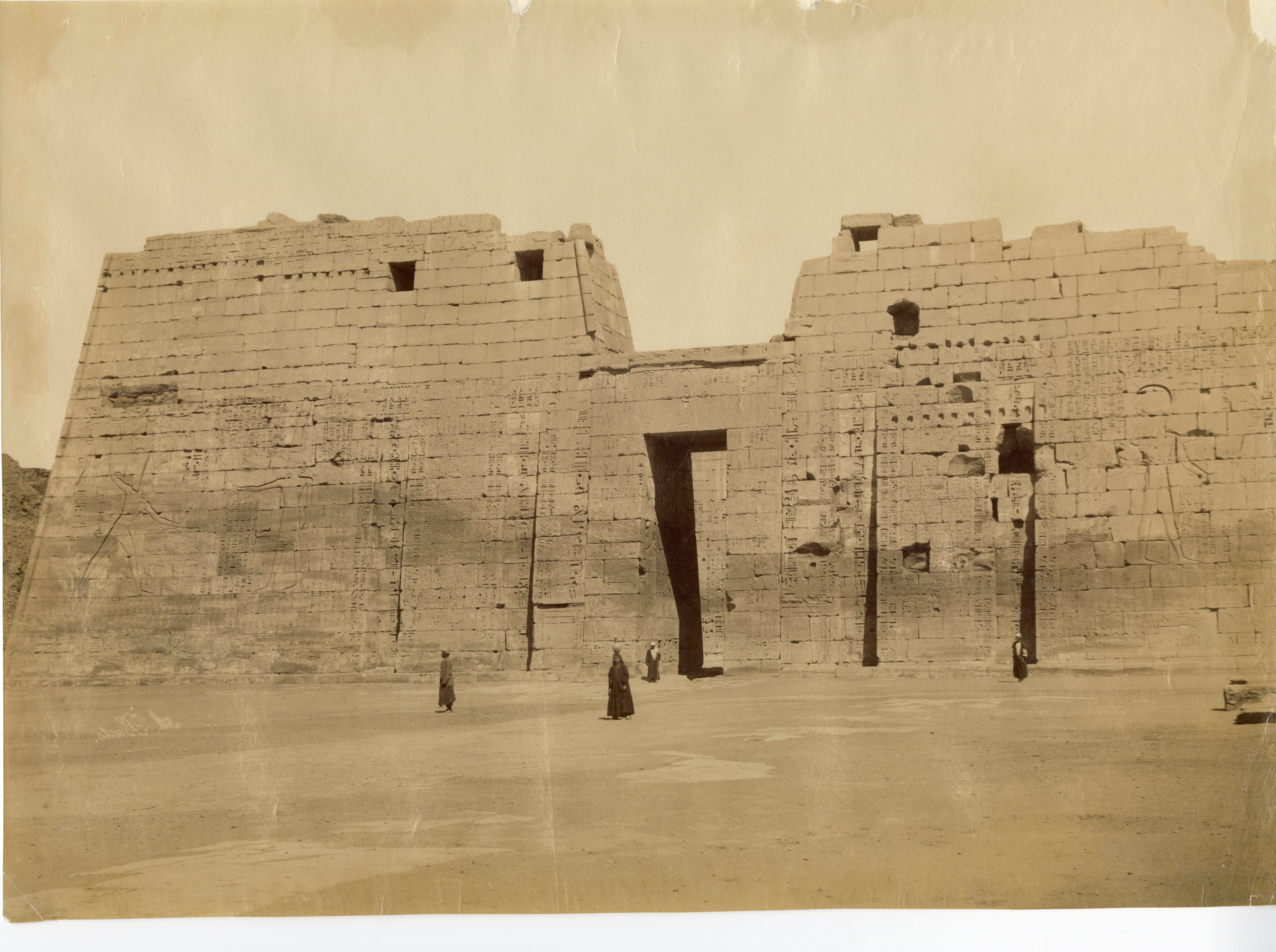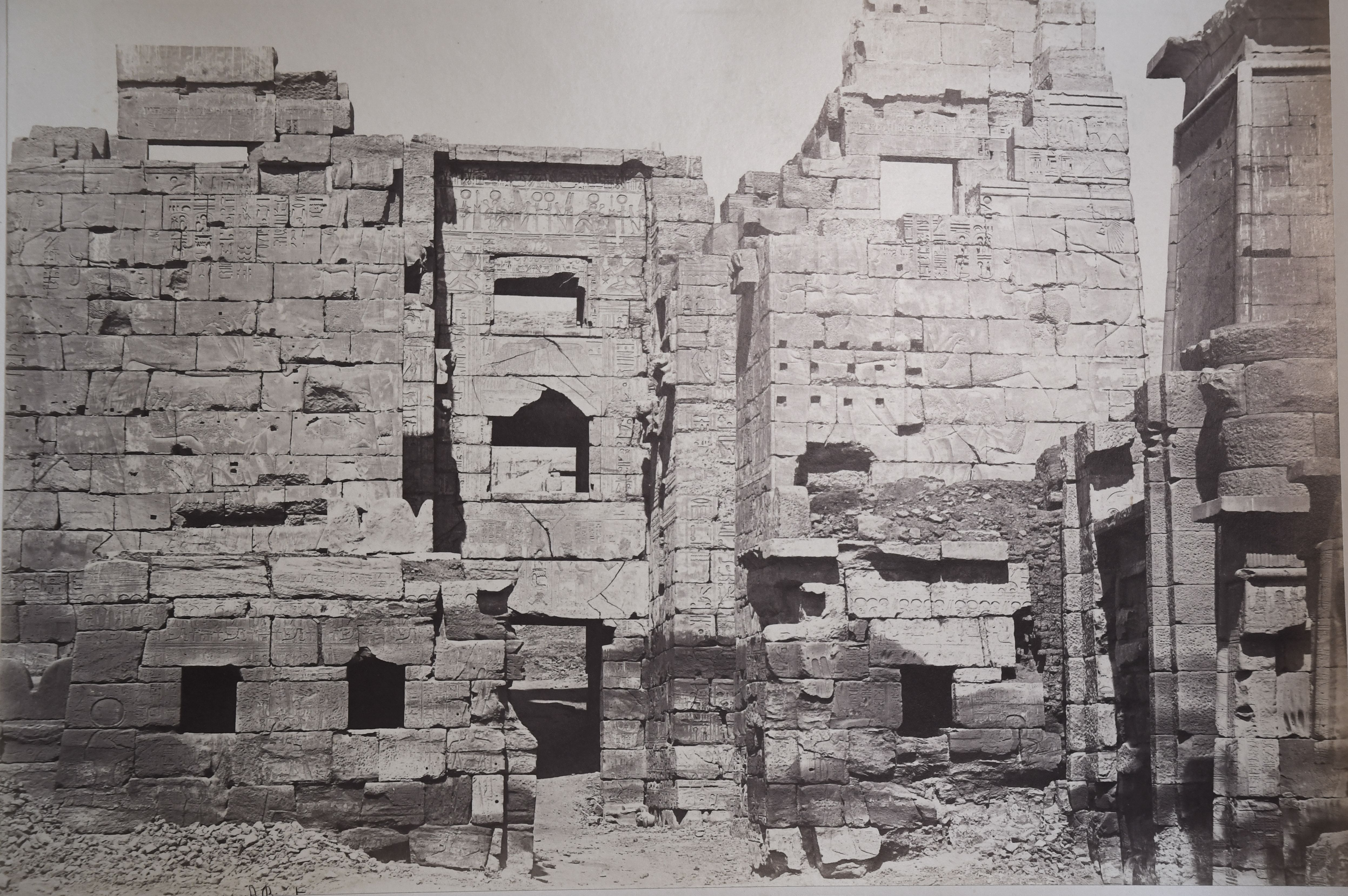 Fotografia del portale di ingresso del tempio di Medinet Habu, il migdol, il portale-torre fortificato di ispirazione vicino-orientale. La firma dell’autore si trova, tagliata, in basso a sinistra.