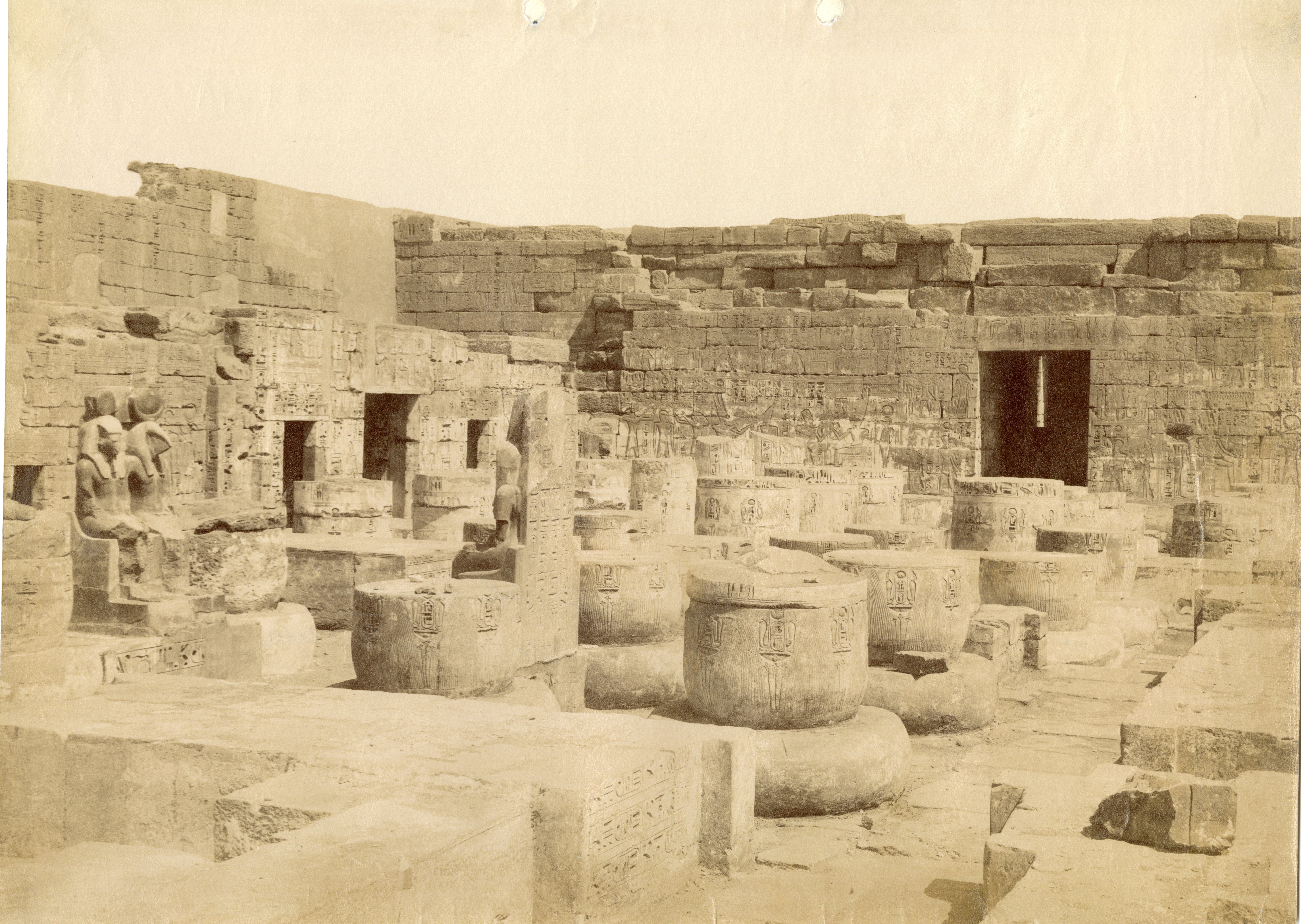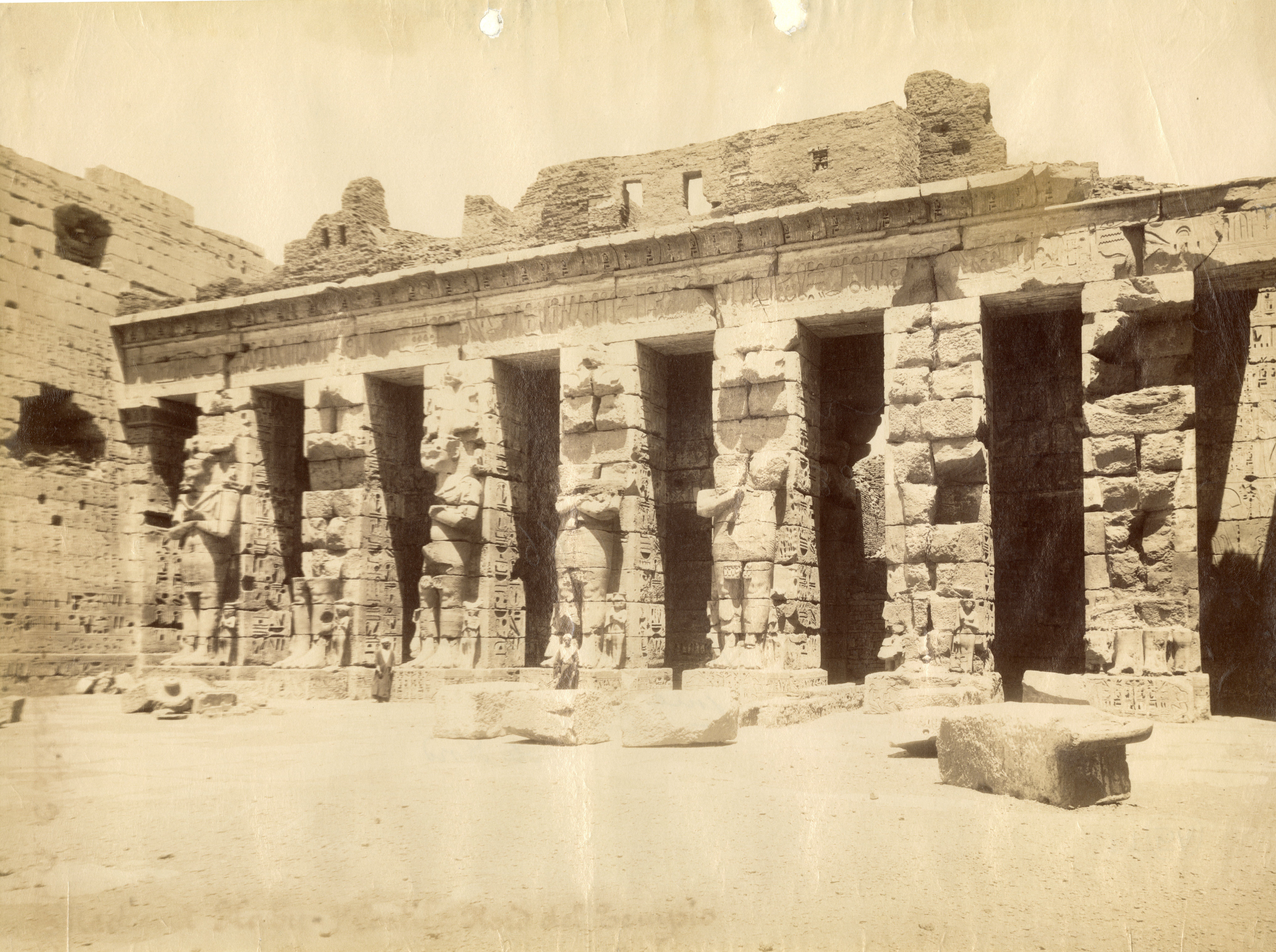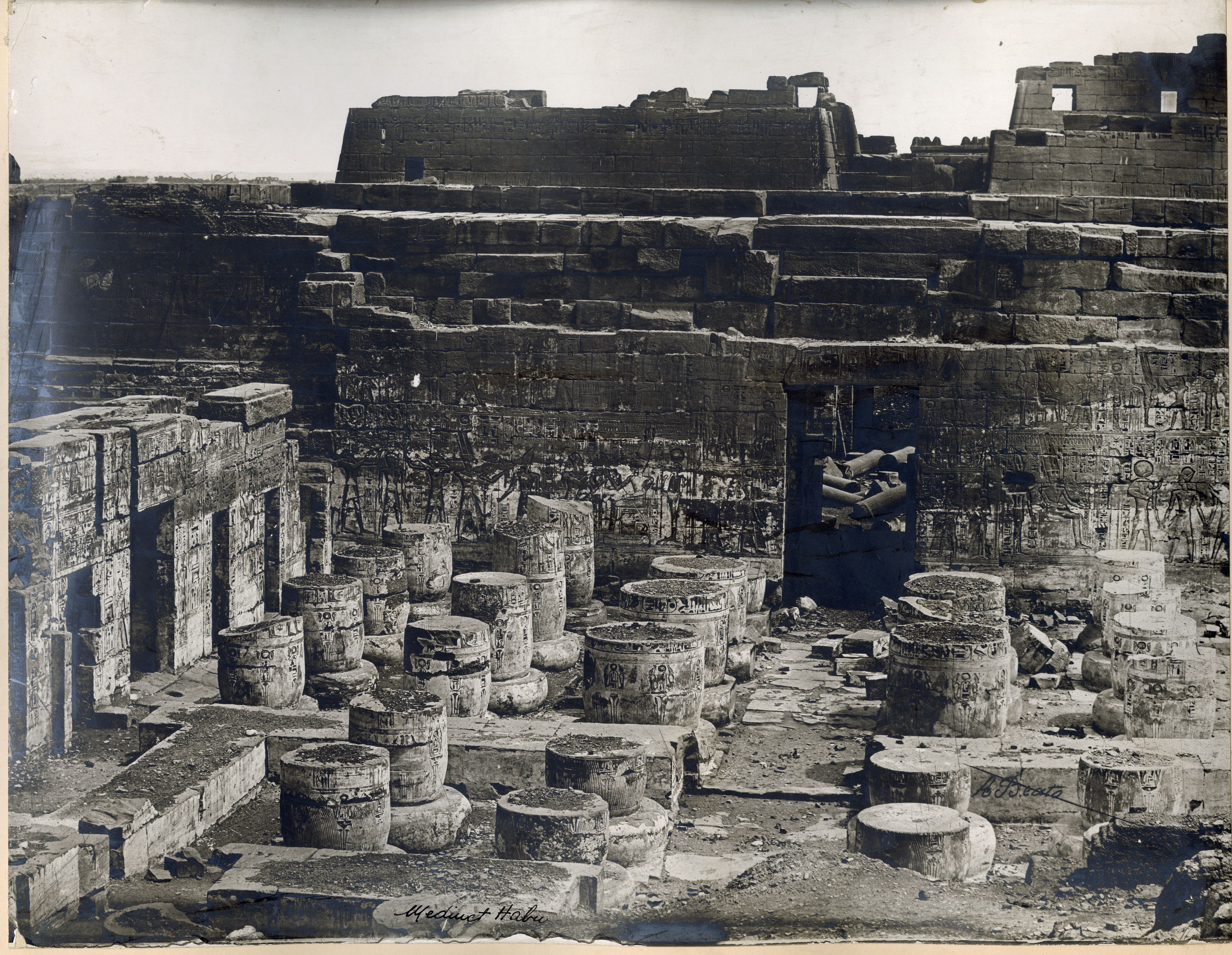Veduta della seconda corte del tempio di Medinet Habu, costruito dal faraone Ramesse III sulla riva ovest del Nilo, a Tebe. Si notano ancora numerose colonne a terra, indizio che la fotografia è stata scattata prima dei lavori di pulizia e restauro del sito. In basso, la firma dell’autore.